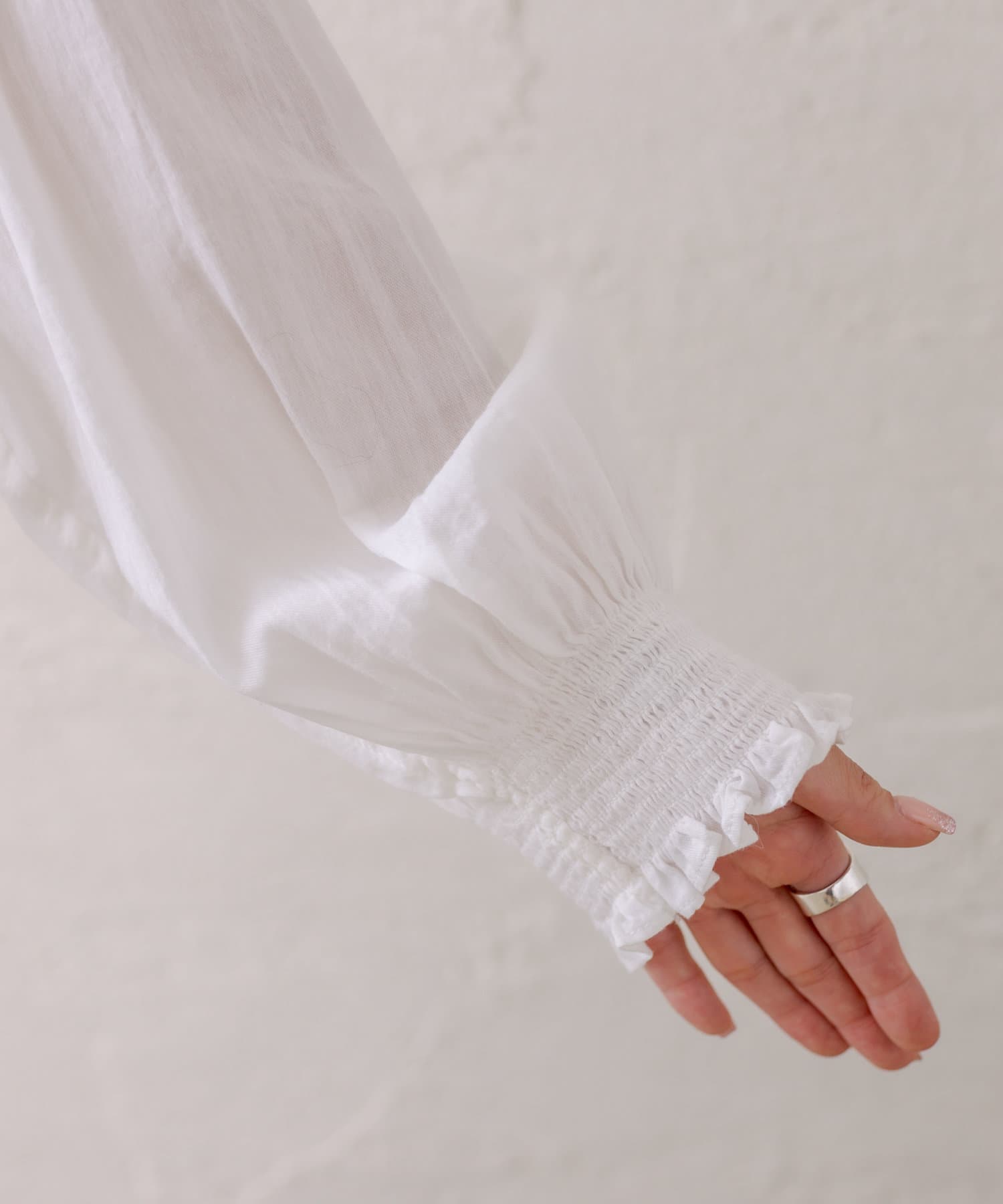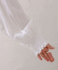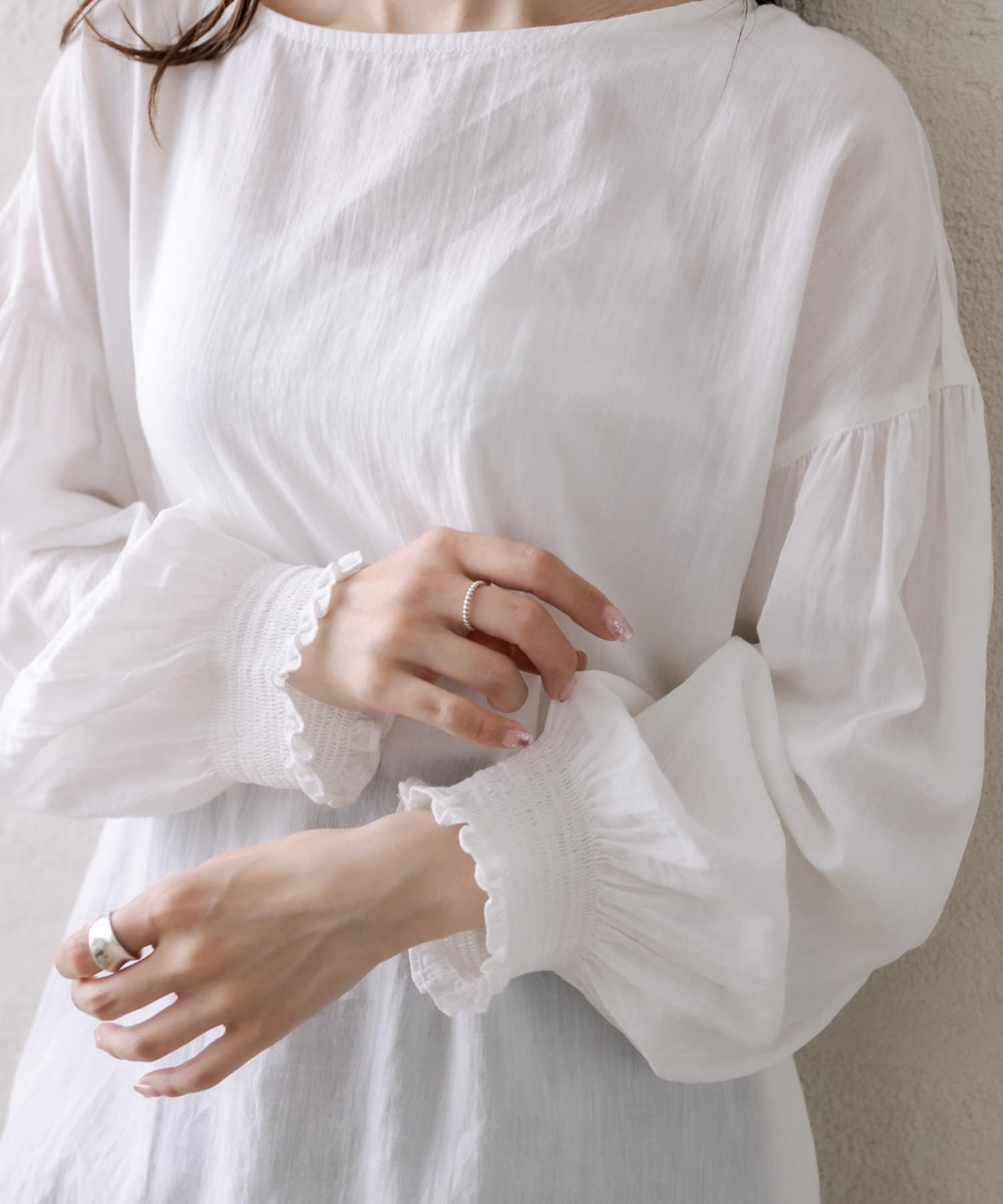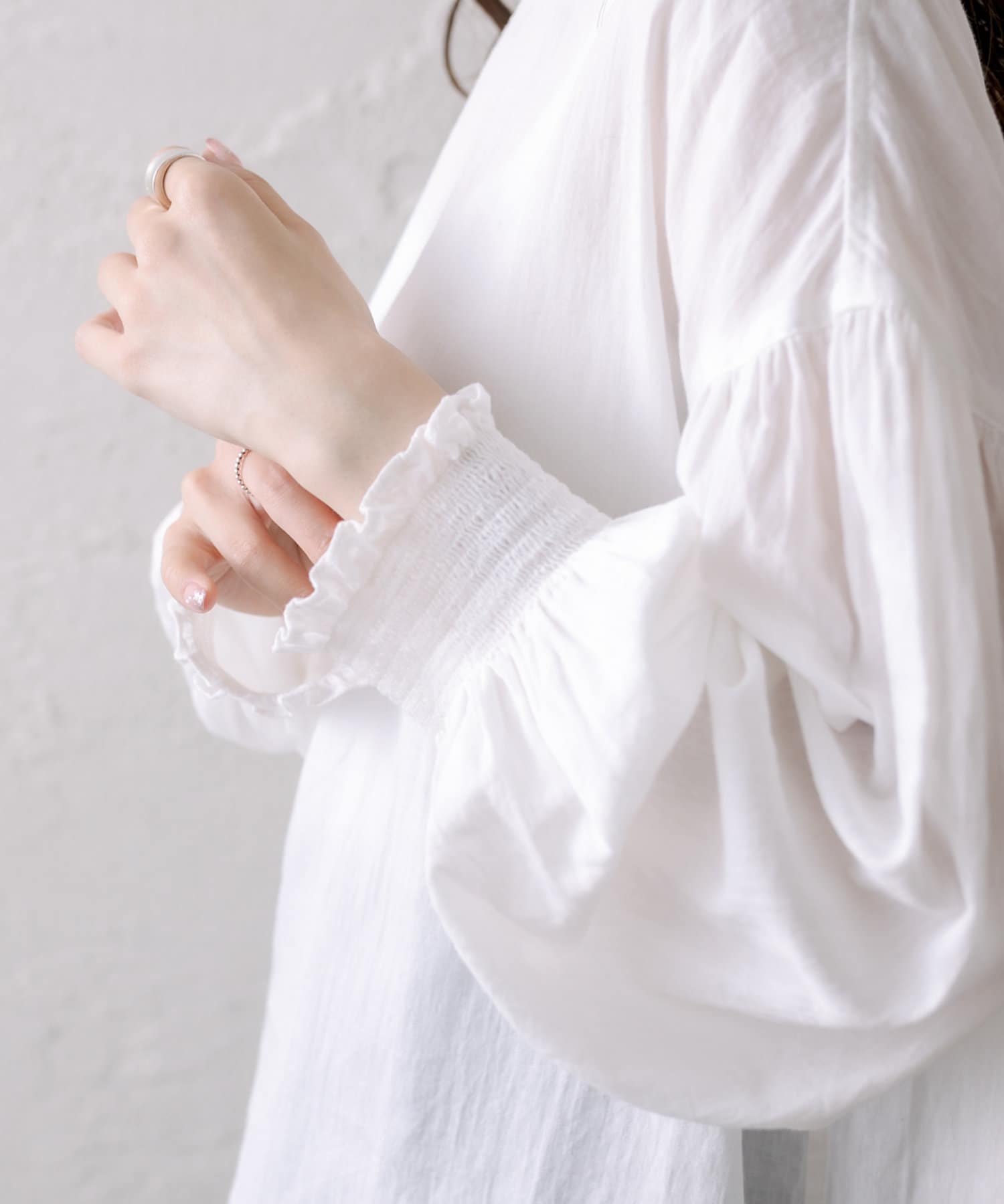 ギャザーが施されたふんわりボリューム袖がフェミニンな印象ですが