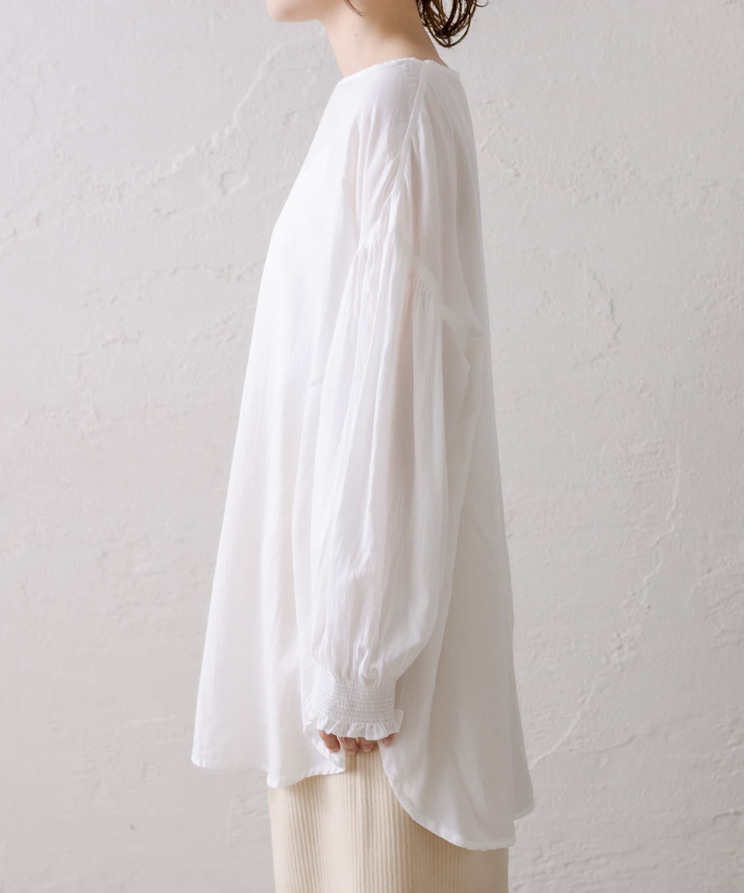袖にはシャーリングを施しているので袖口を上げて着ると