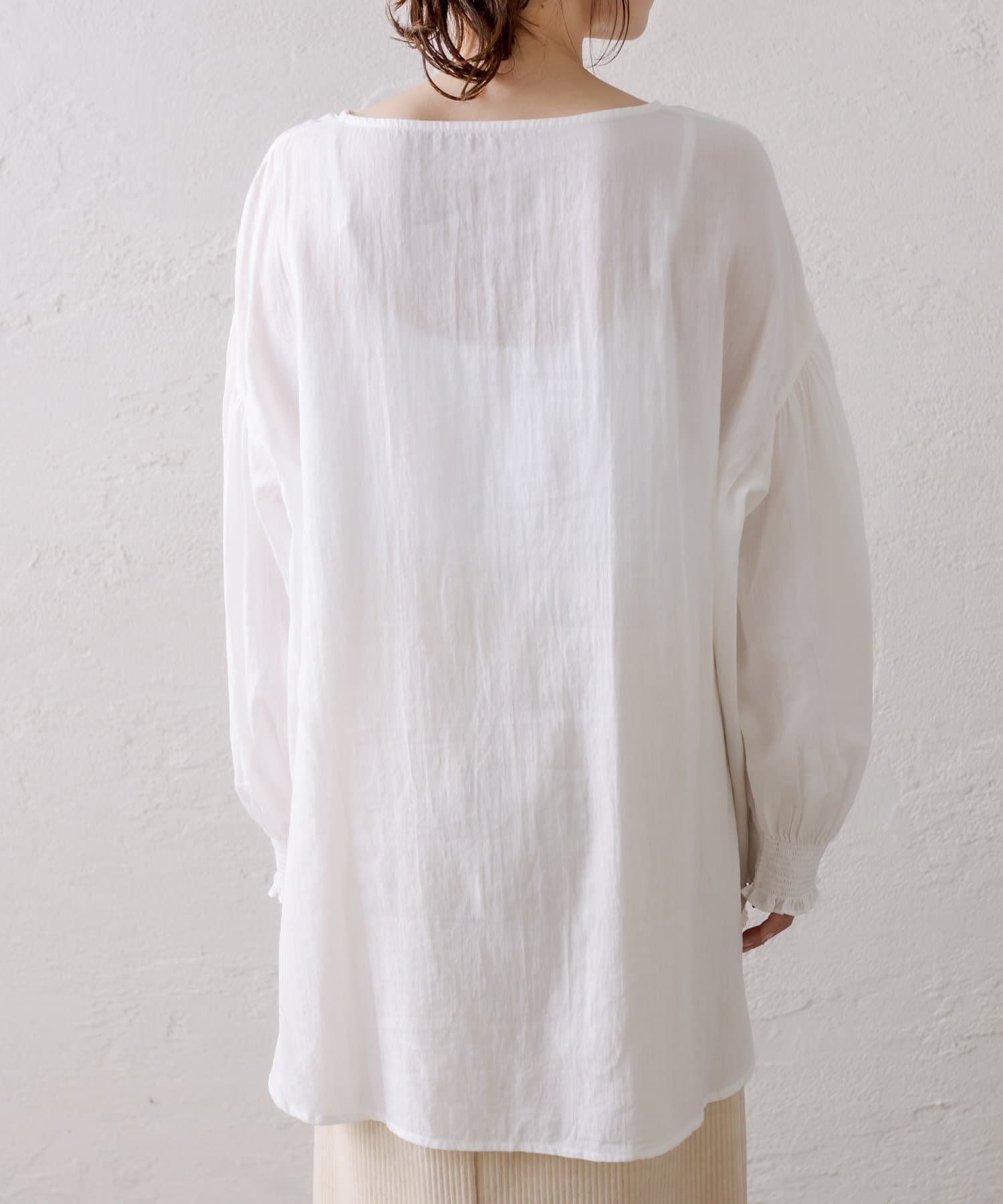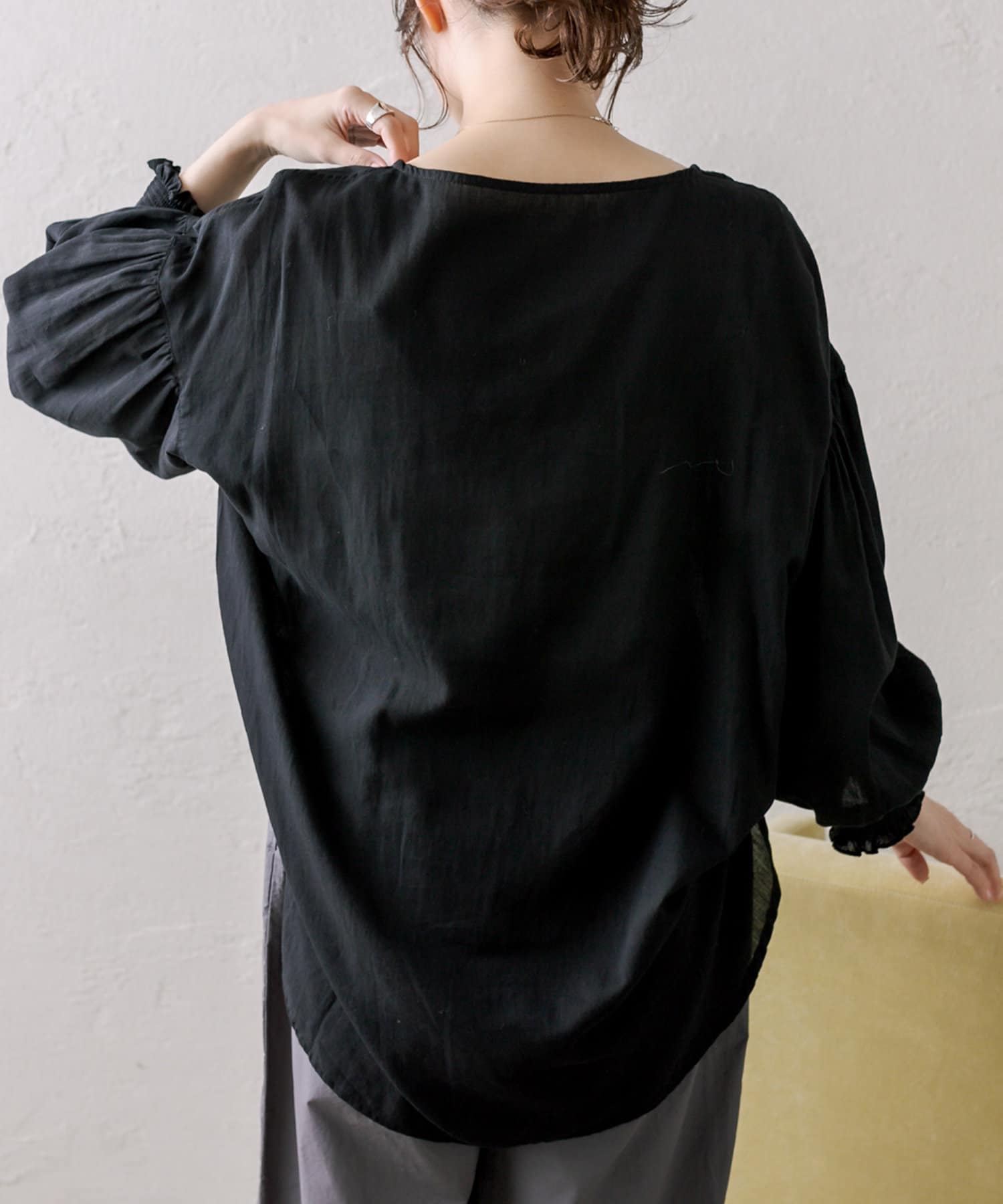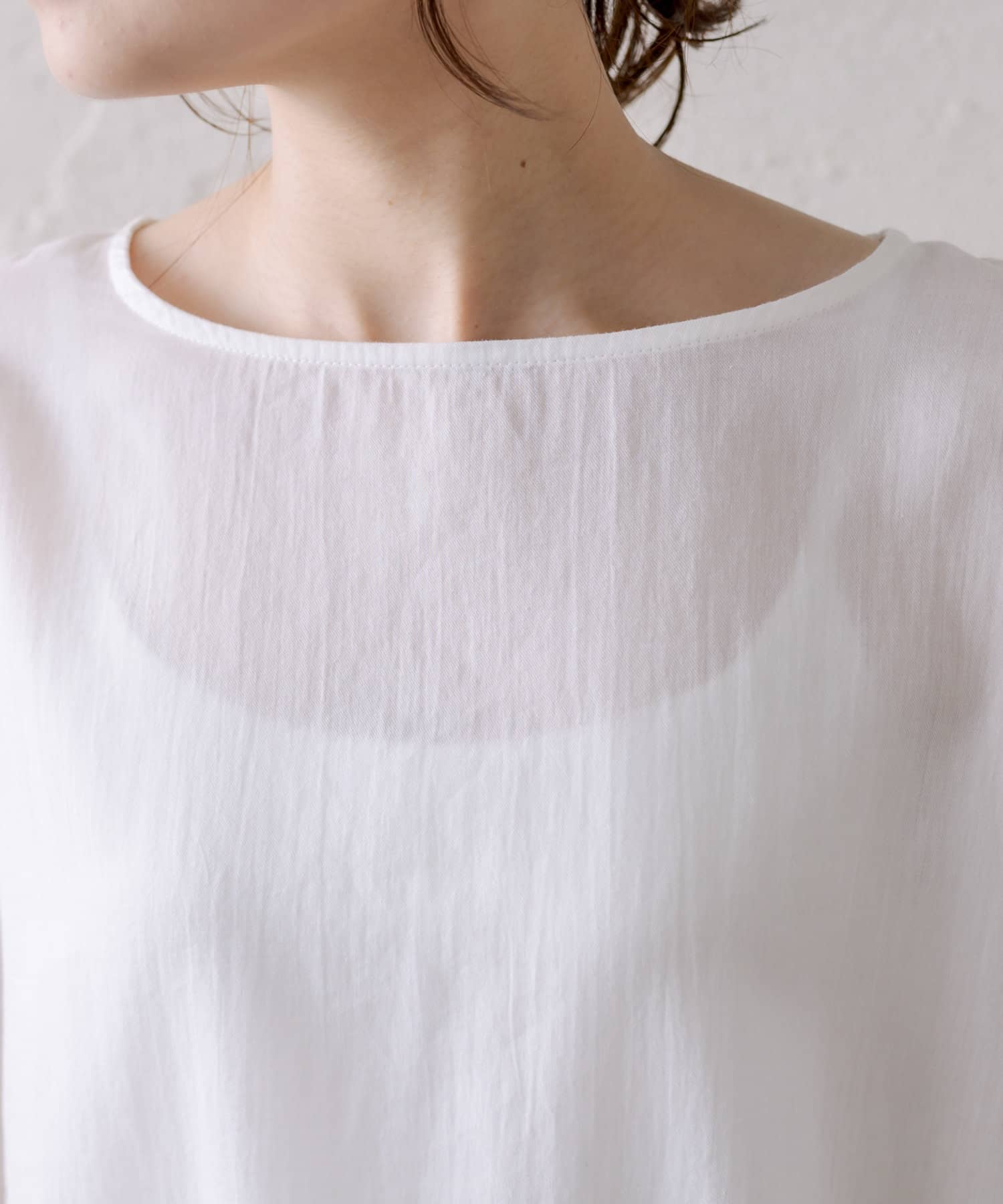 横幅に広がったネックラインが首元を美しく見せてくれることで、大人の女性が楽しめるブラウスに仕上げました。