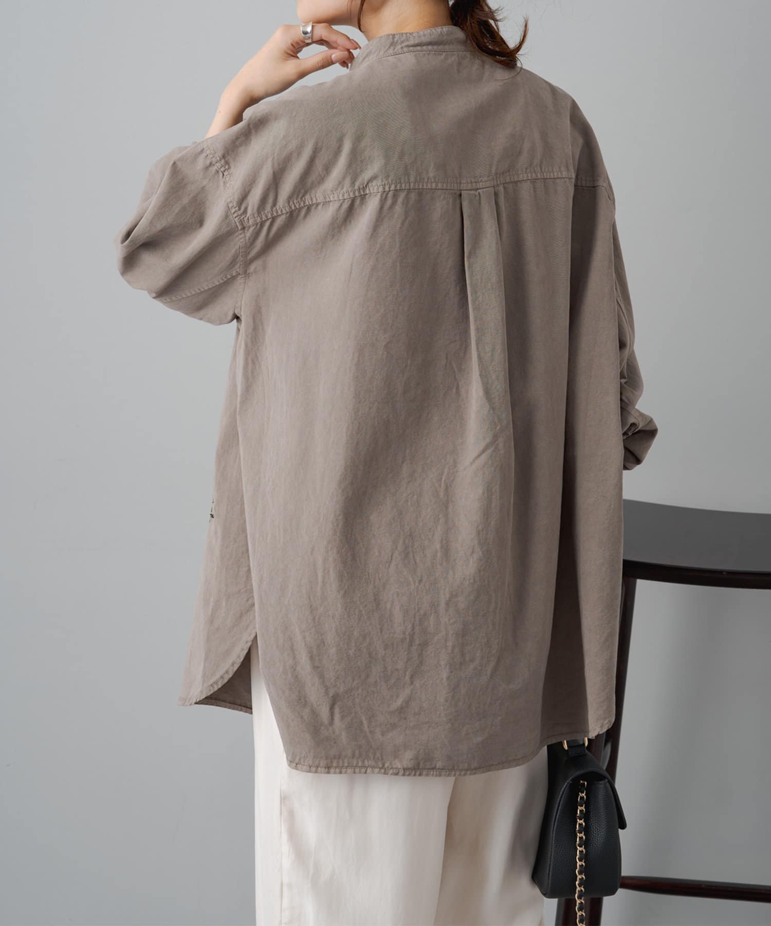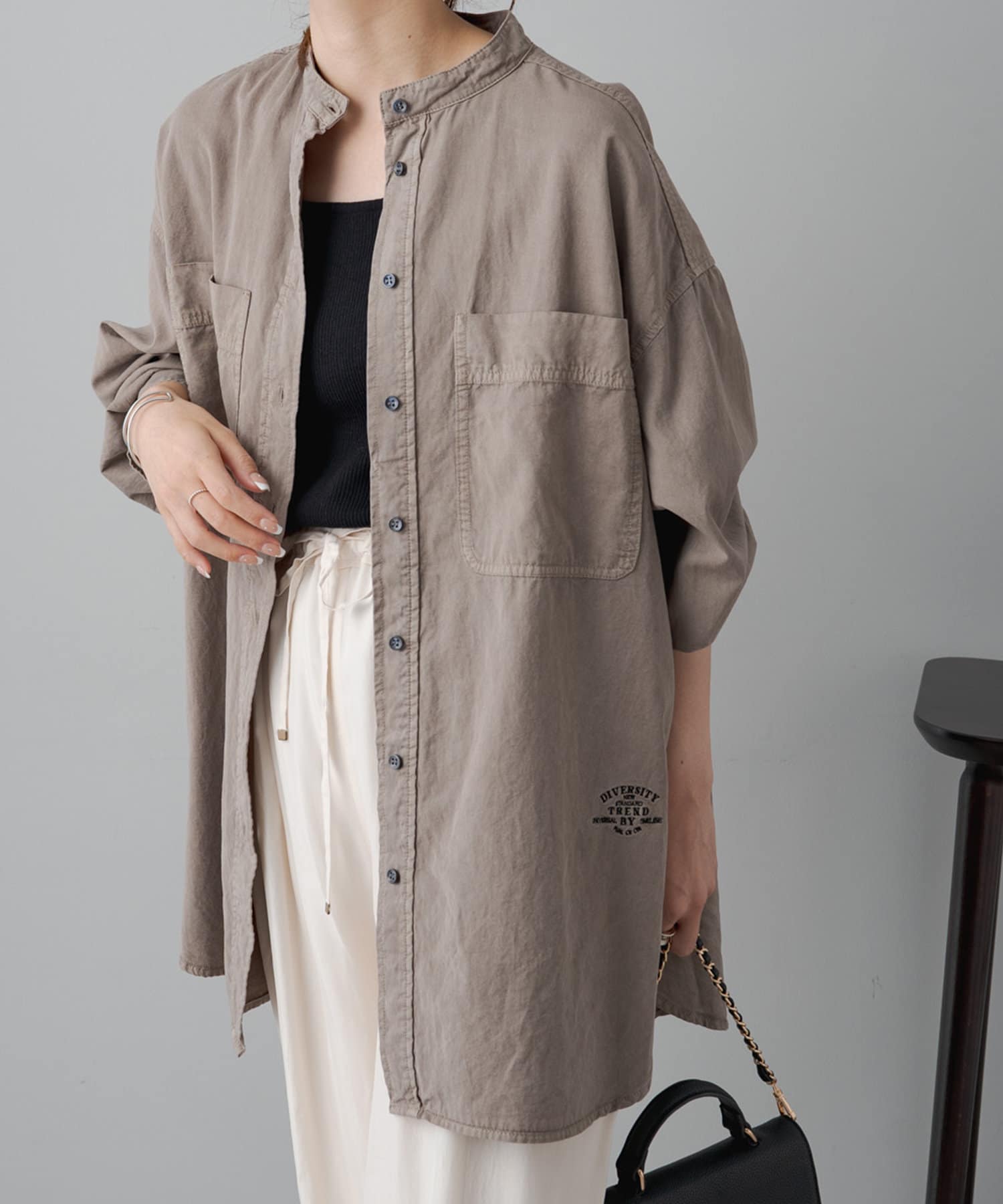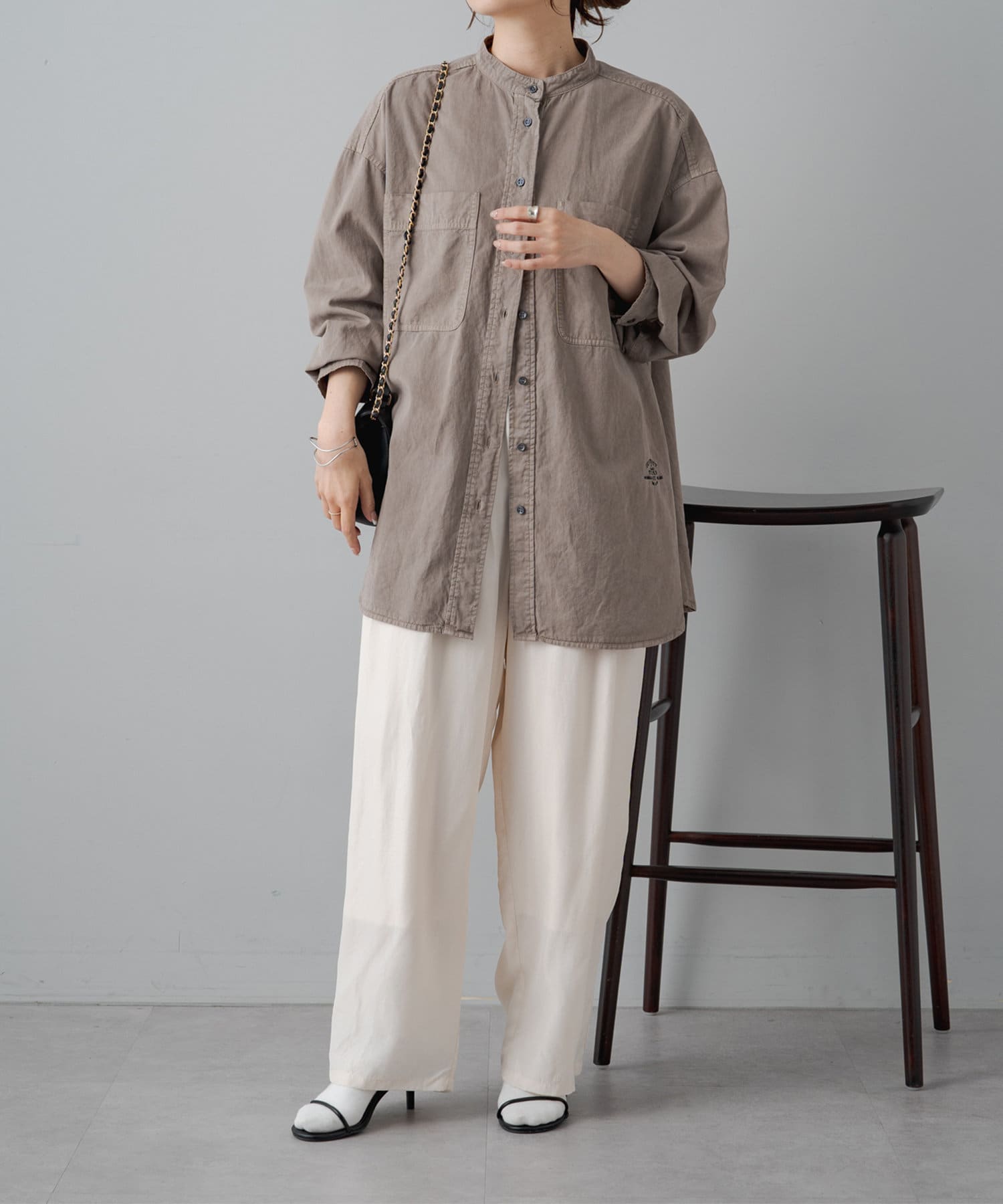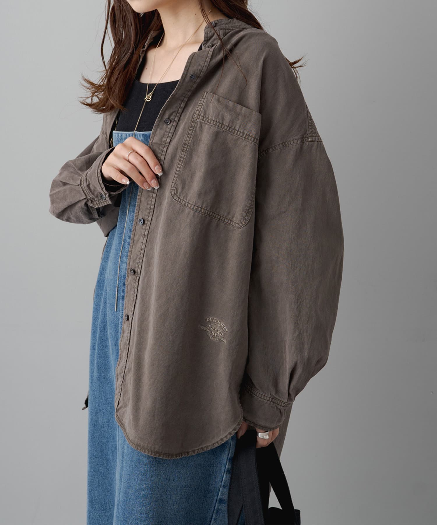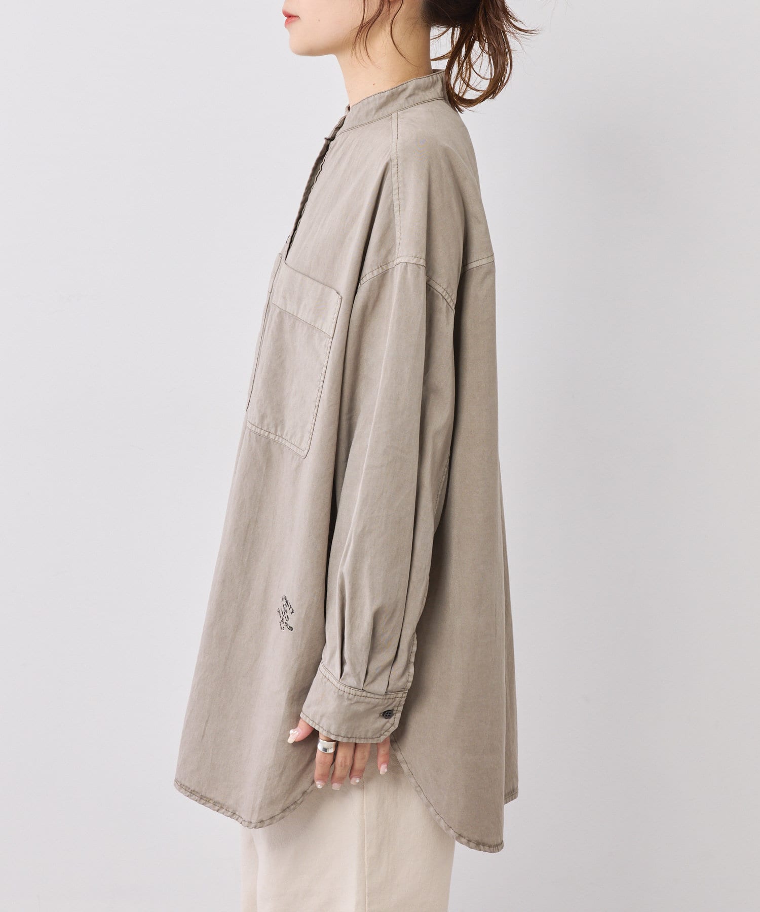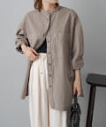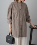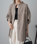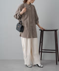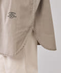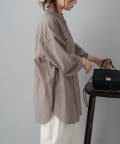 スタイリングはチュニックのような感覚で裾をアウトにしてボトムを合わせるもよし、前裾をボトムにタックインして着用するもよし、フロントボタンを開けて羽織として着用してもよし。