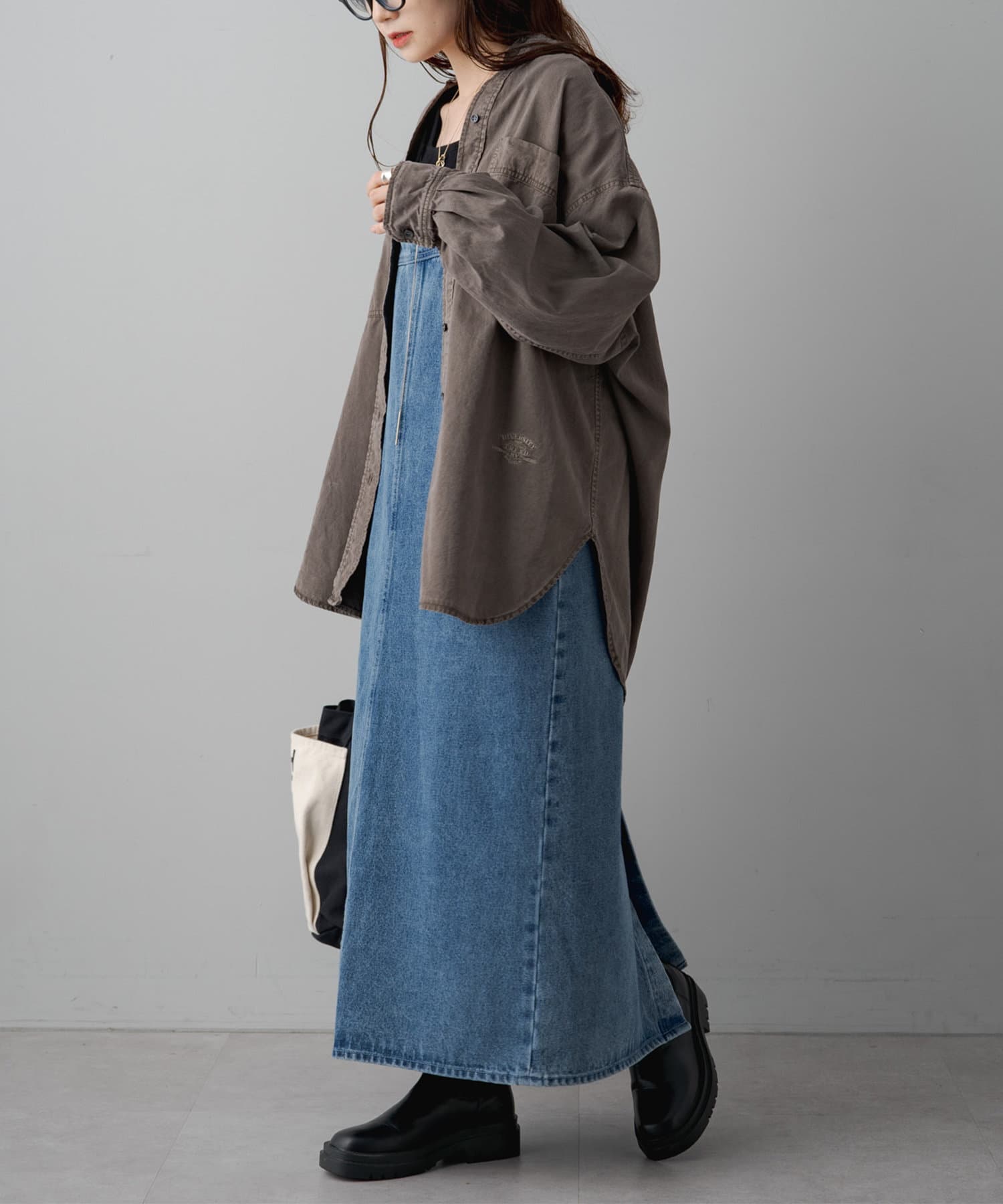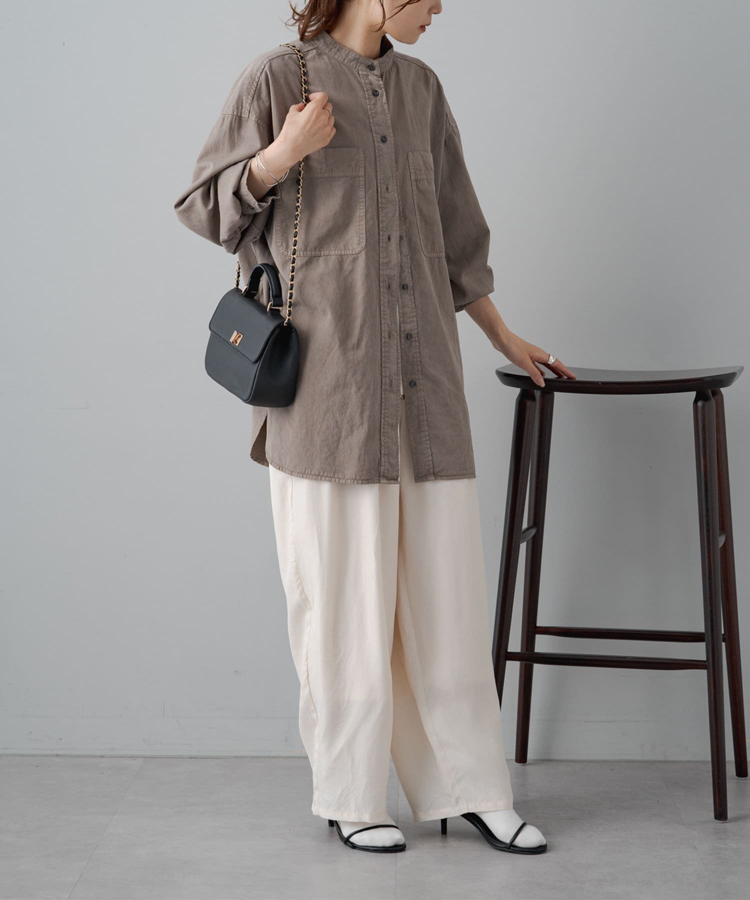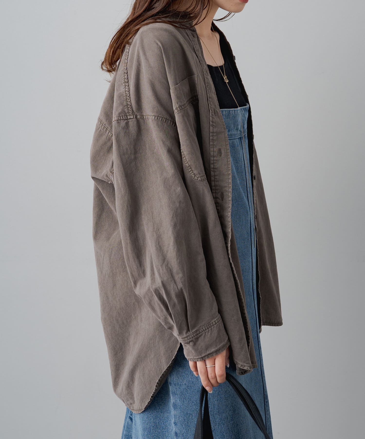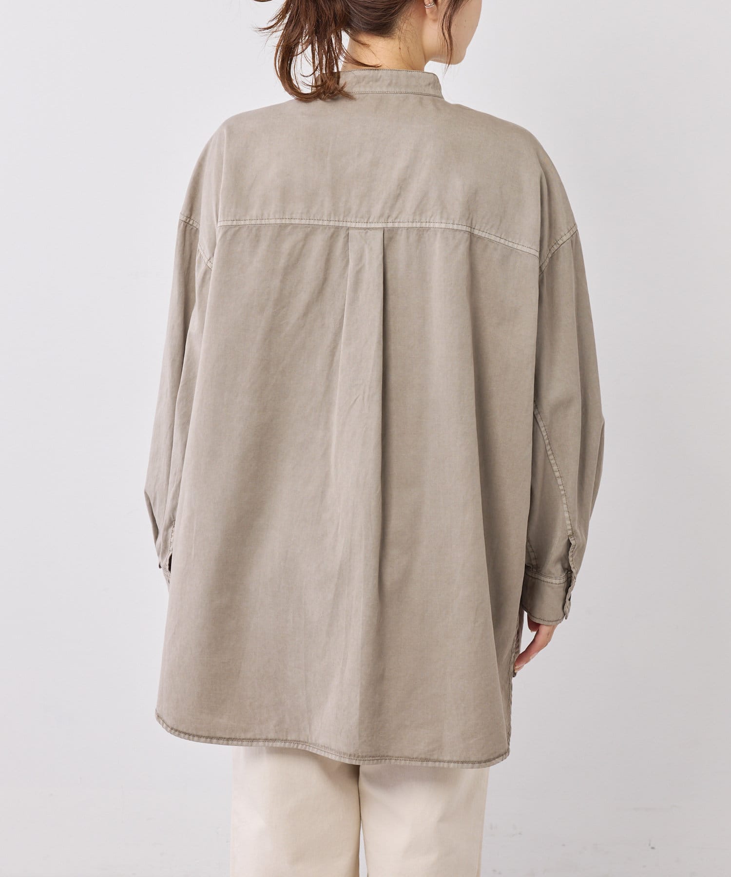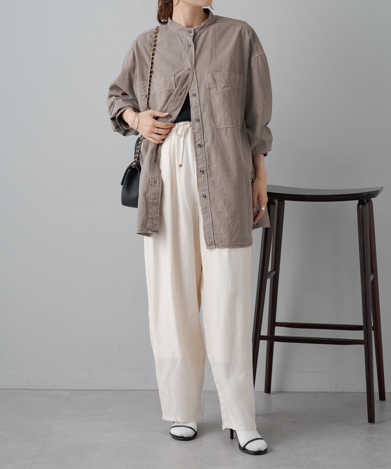 スタイリングはチュニックのような感覚で裾をアウトにしてボトムを合わせるもよし、前裾をボトムにタックインして着用するもよし、フロントボタンを開けて羽織として着用してもよし。