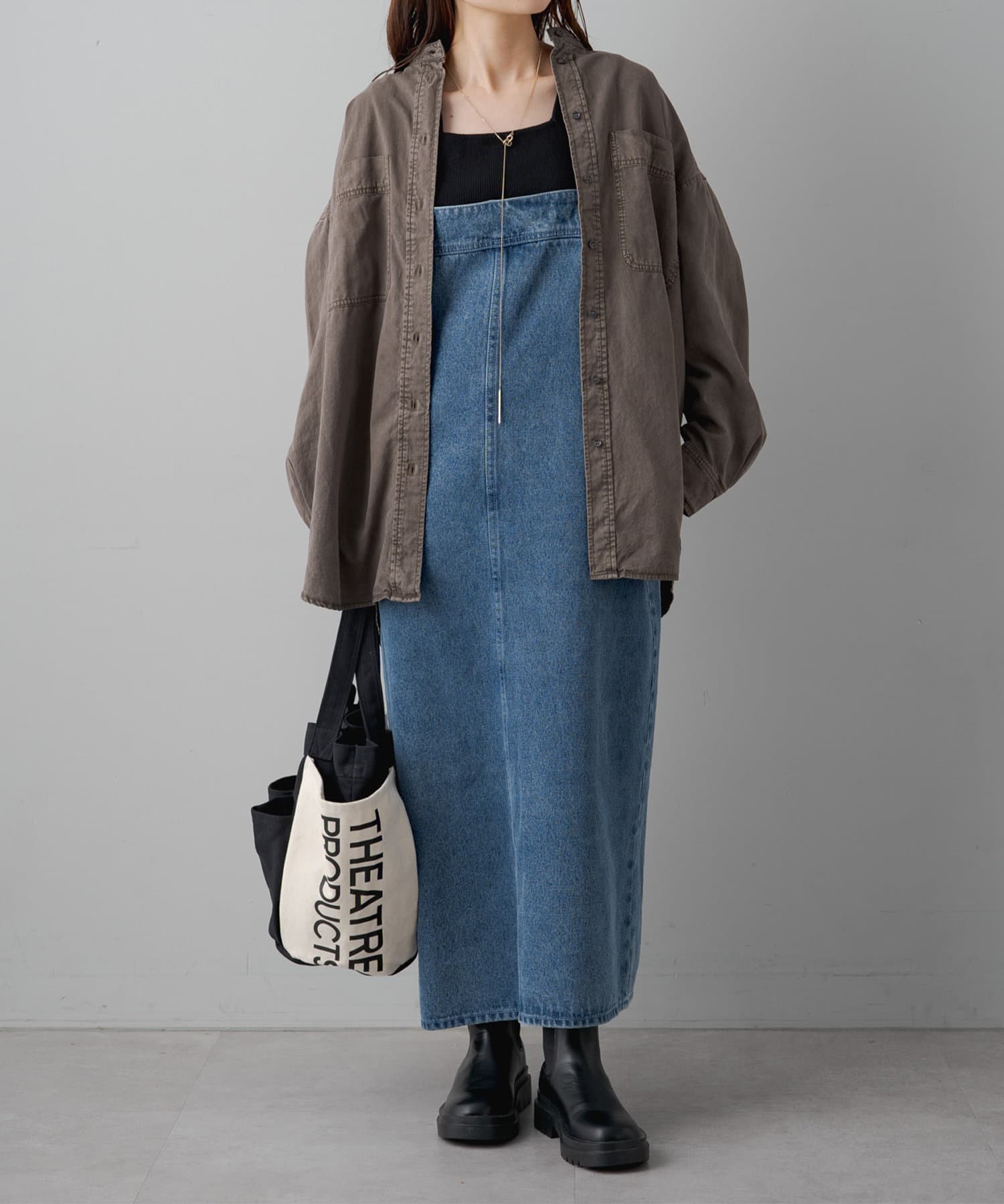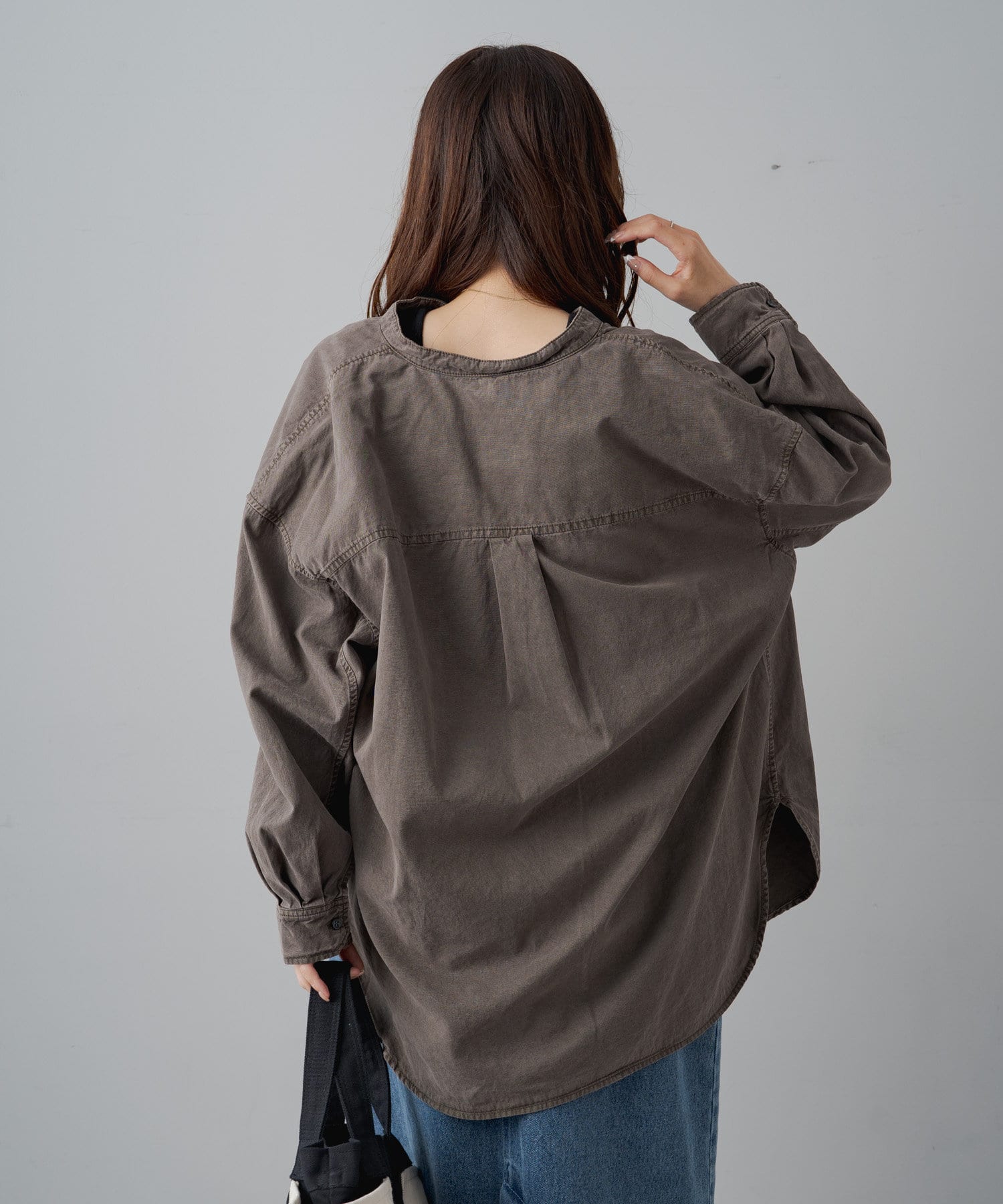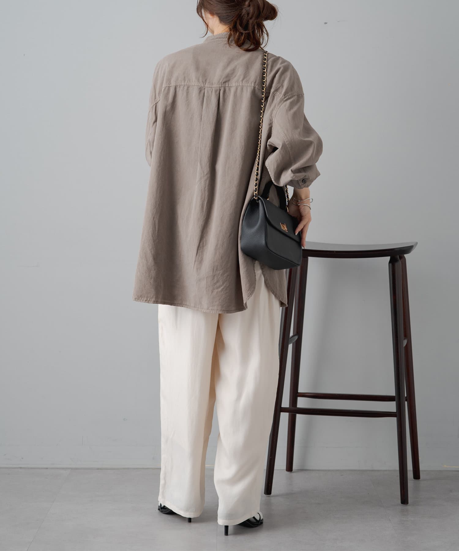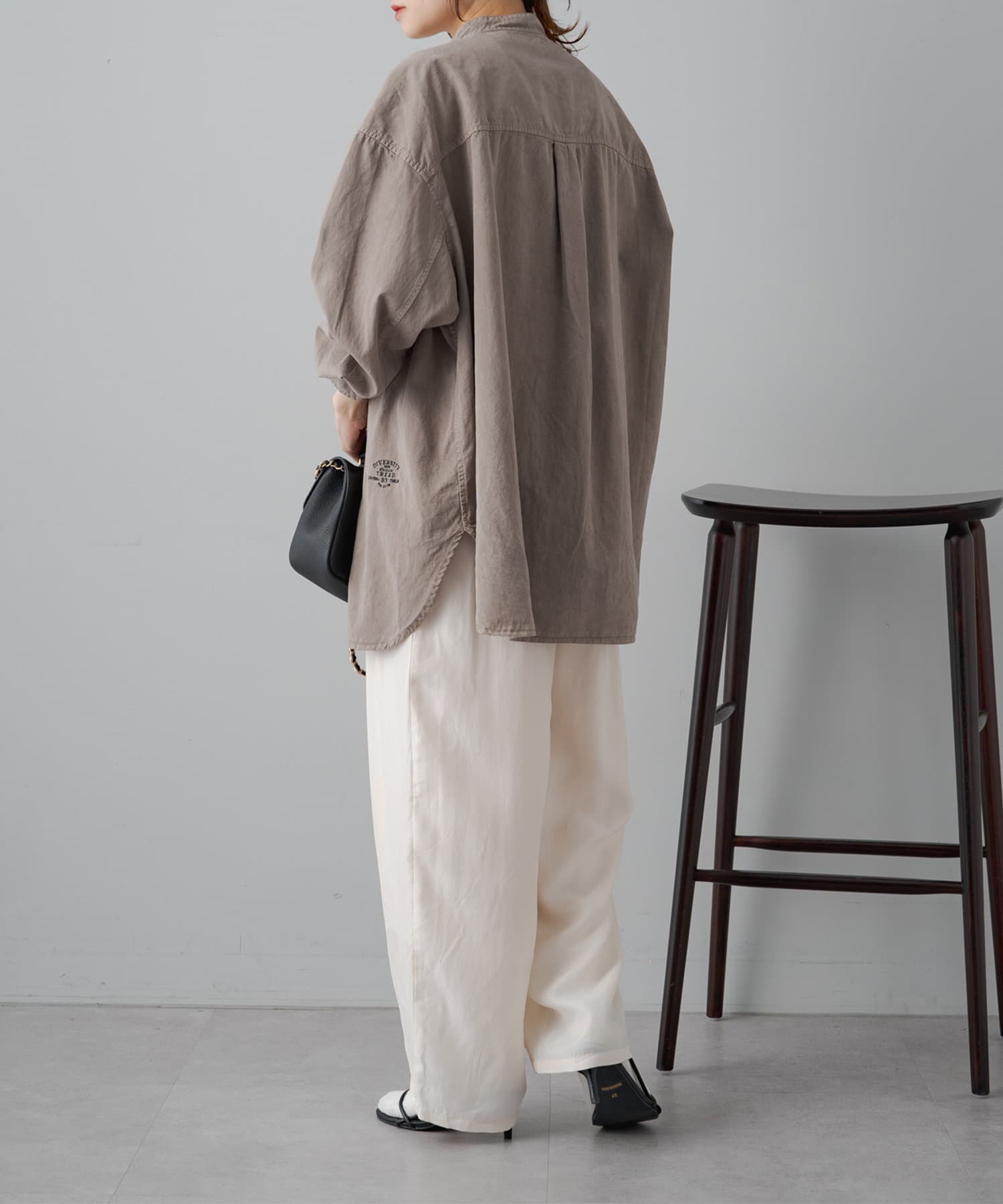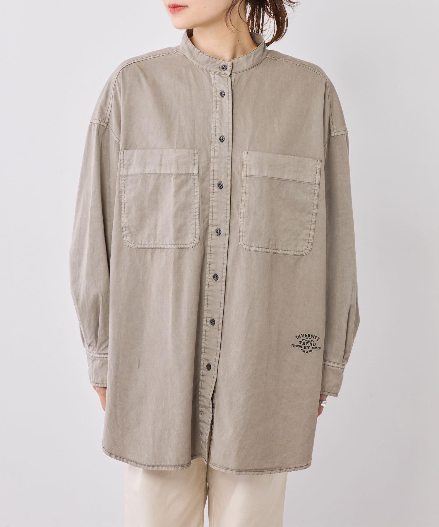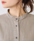 スタイリングはチュニックのような感覚で裾をアウトにしてボトムを合わせるもよし、前裾をボトムにタックインして着用するもよし、フロントボタンを開けて羽織として着用してもよし。