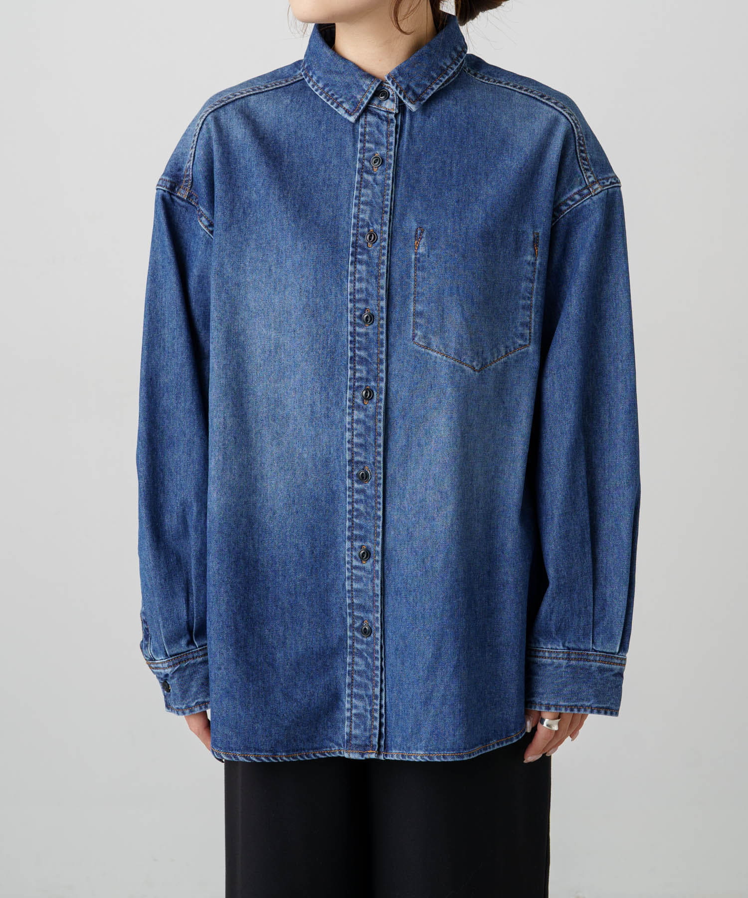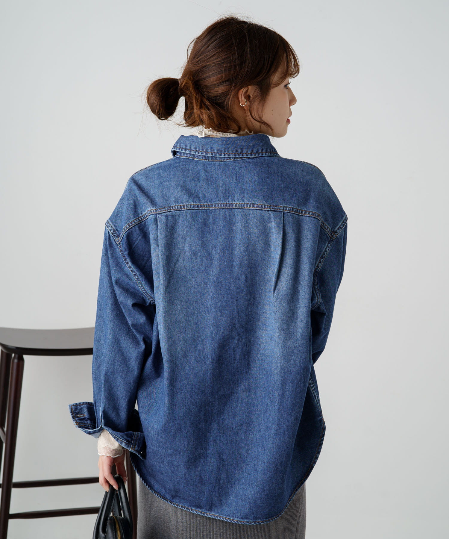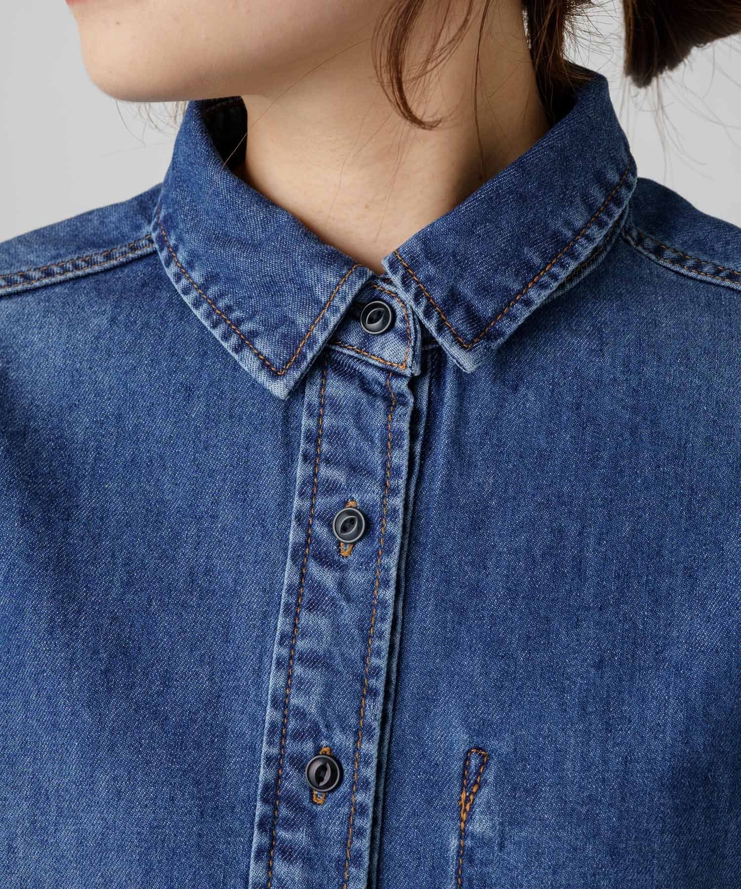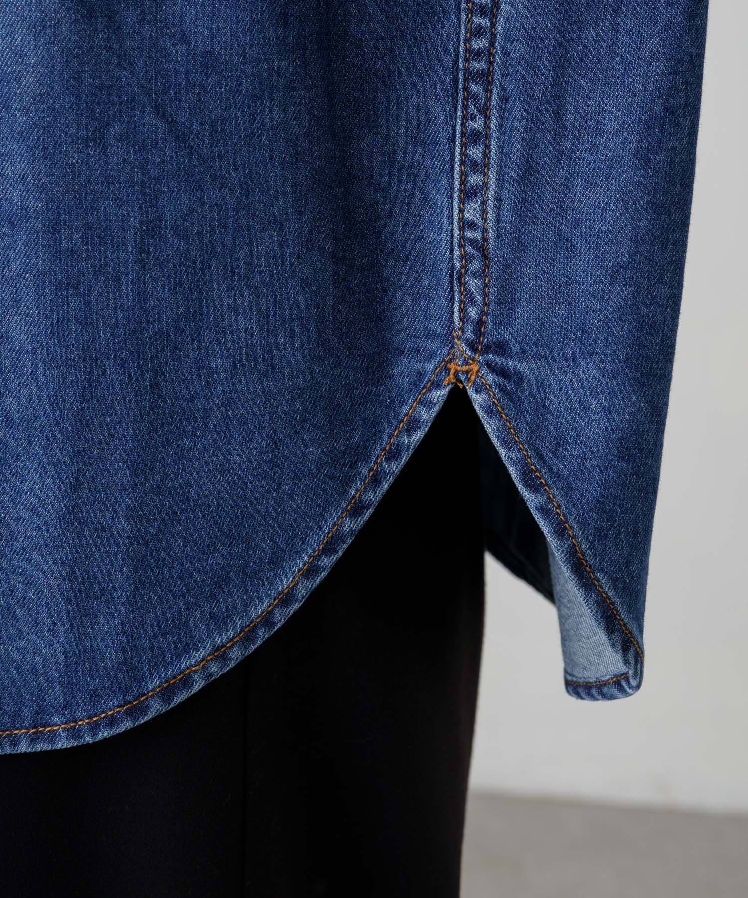 ヒップが隠れる長めの着丈でルーズなシルエットが魅力のデニムシャツ。