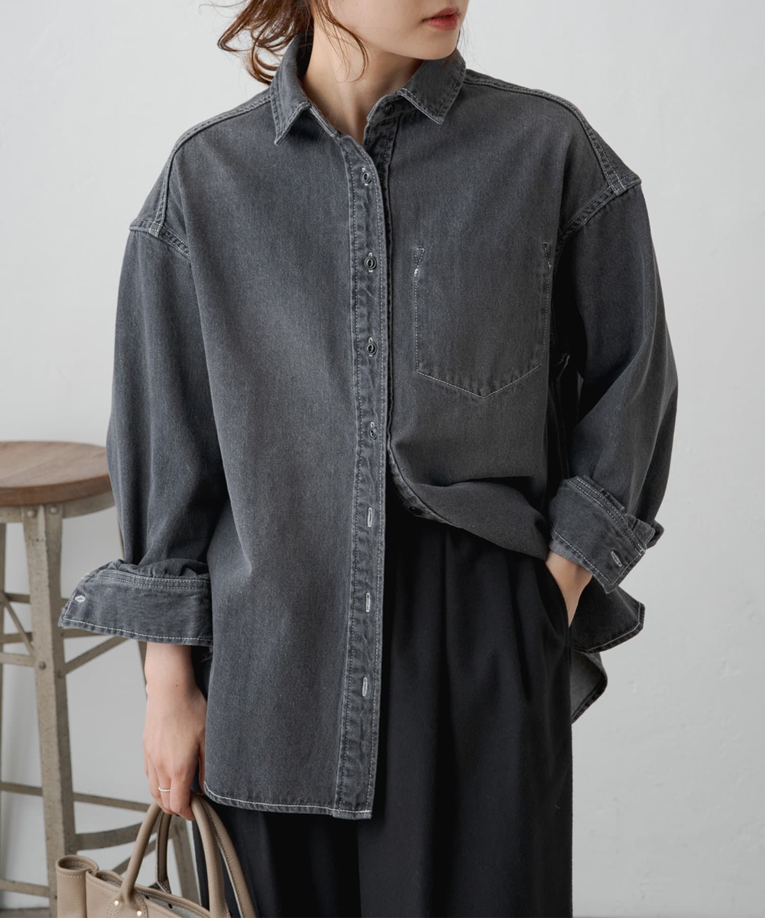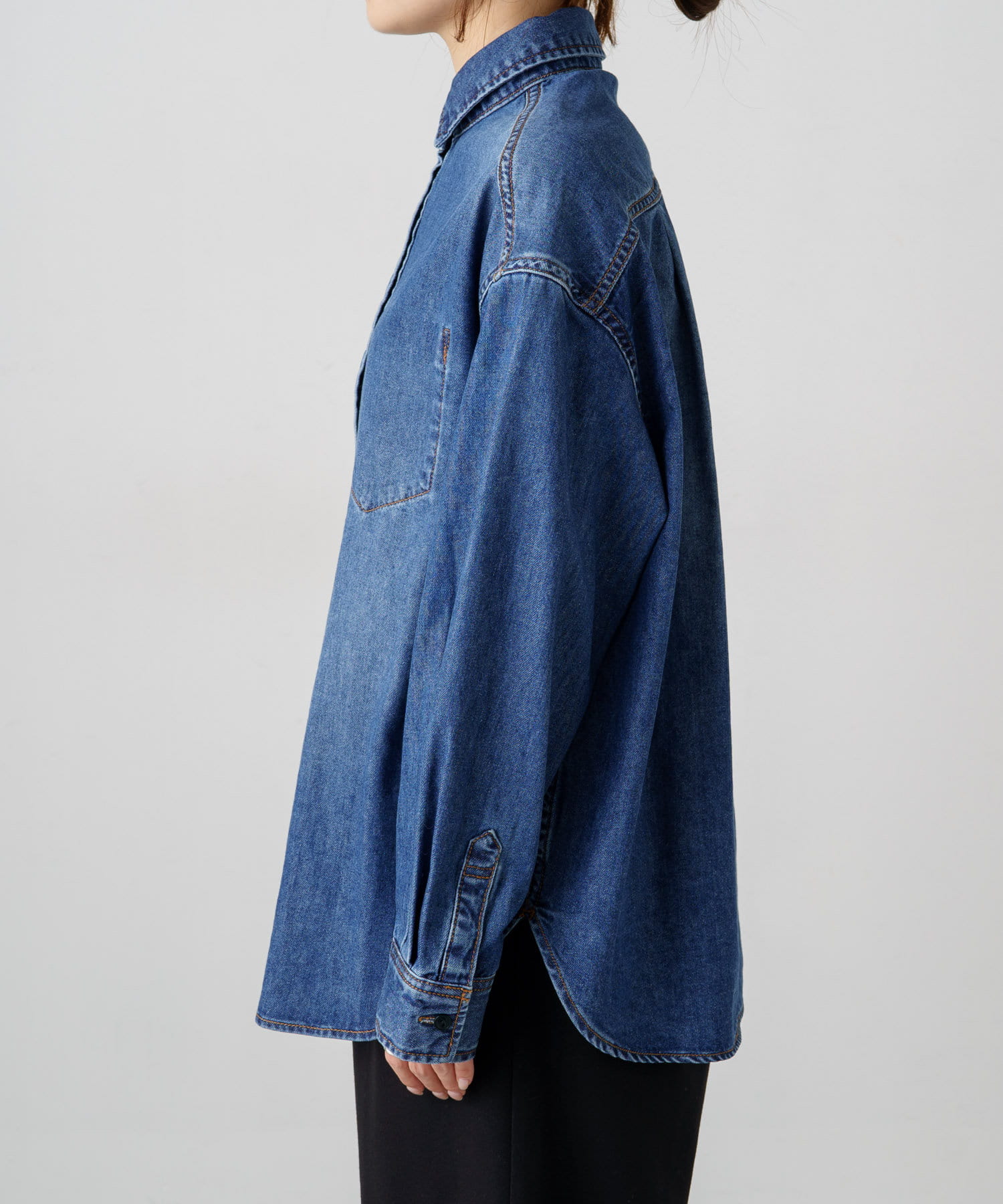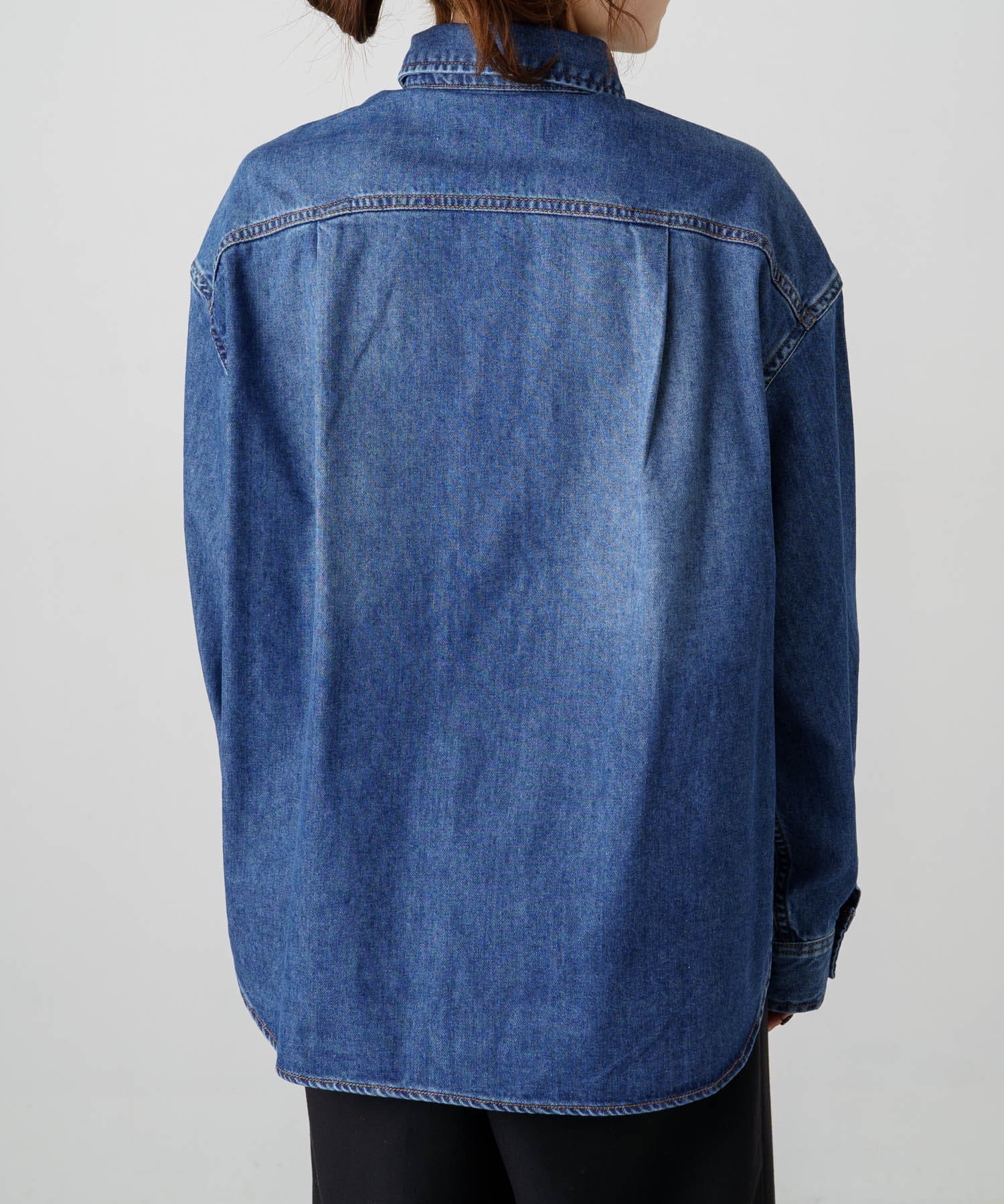 ヒップが隠れる長めの着丈でルーズなシルエットが魅力のデニムシャツ。