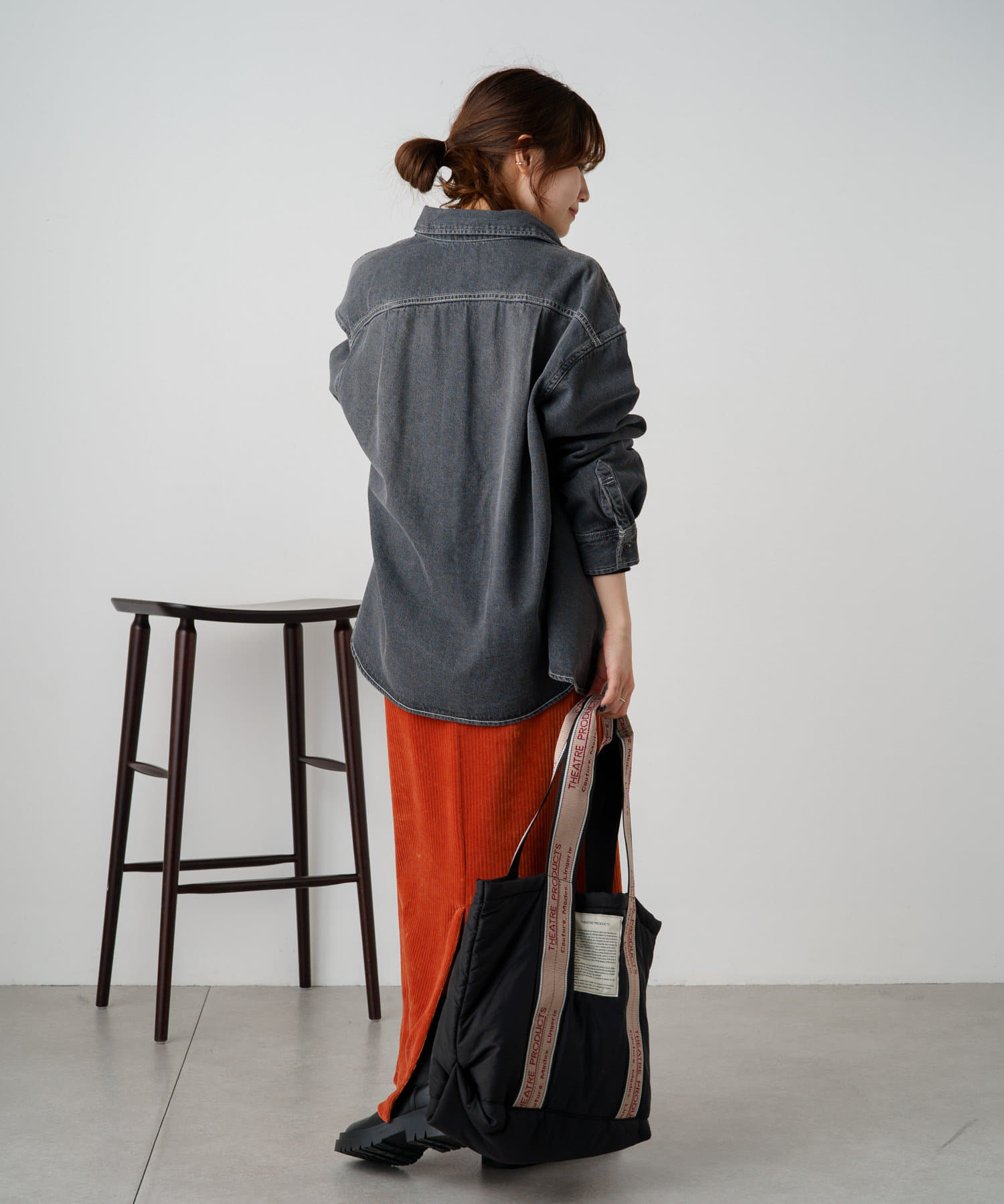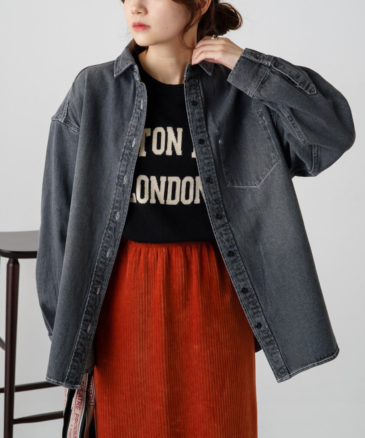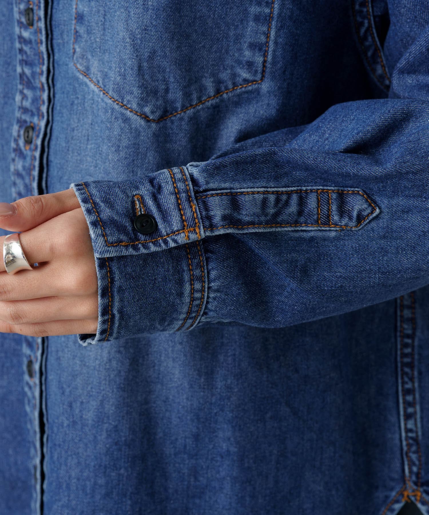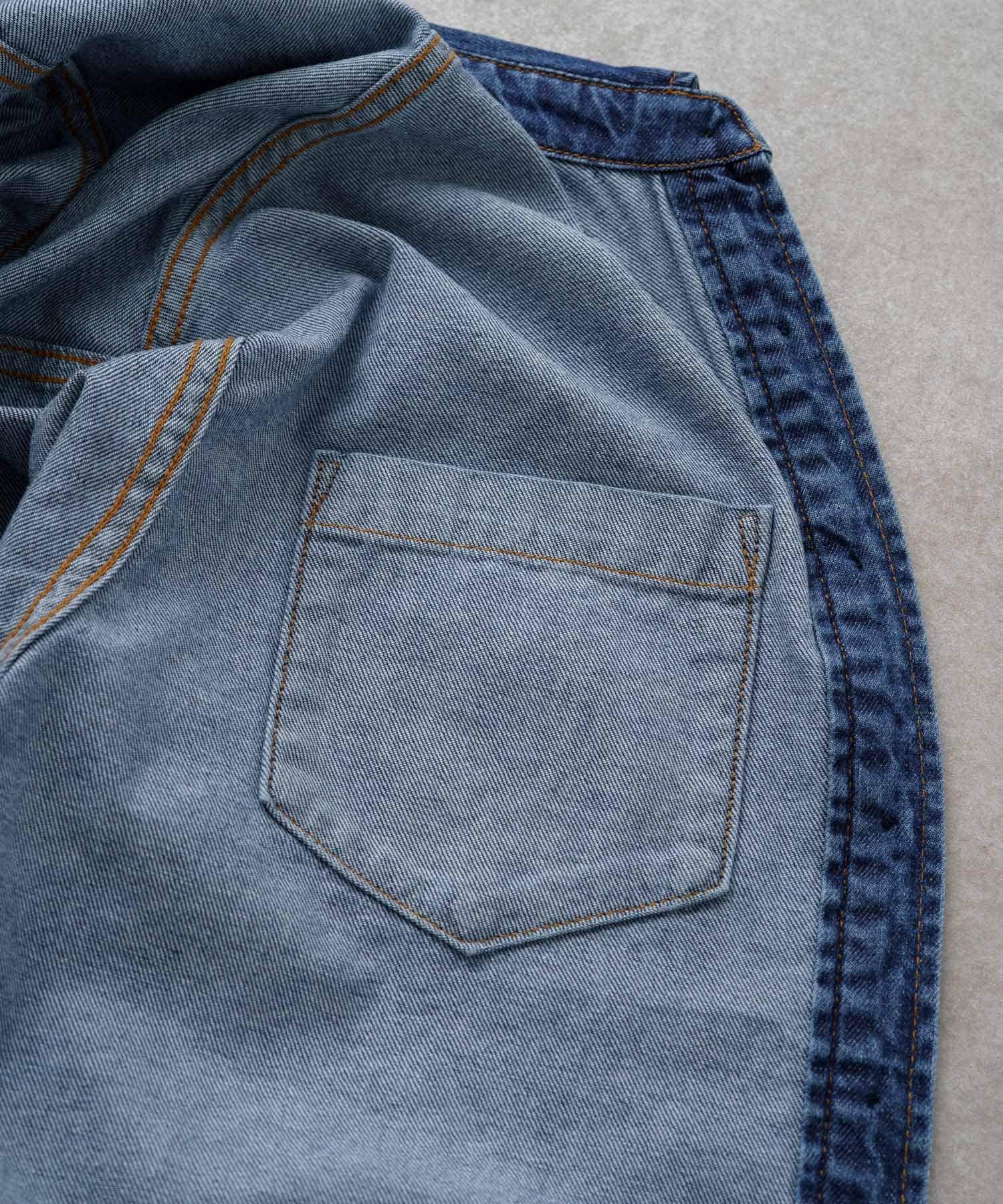 ヒップが隠れる長めの着丈でルーズなシルエットが魅力のデニムシャツ。