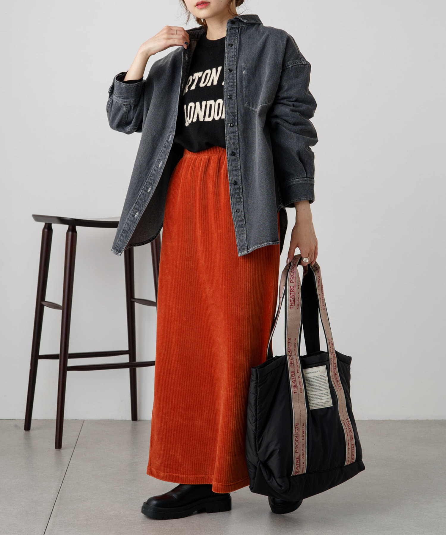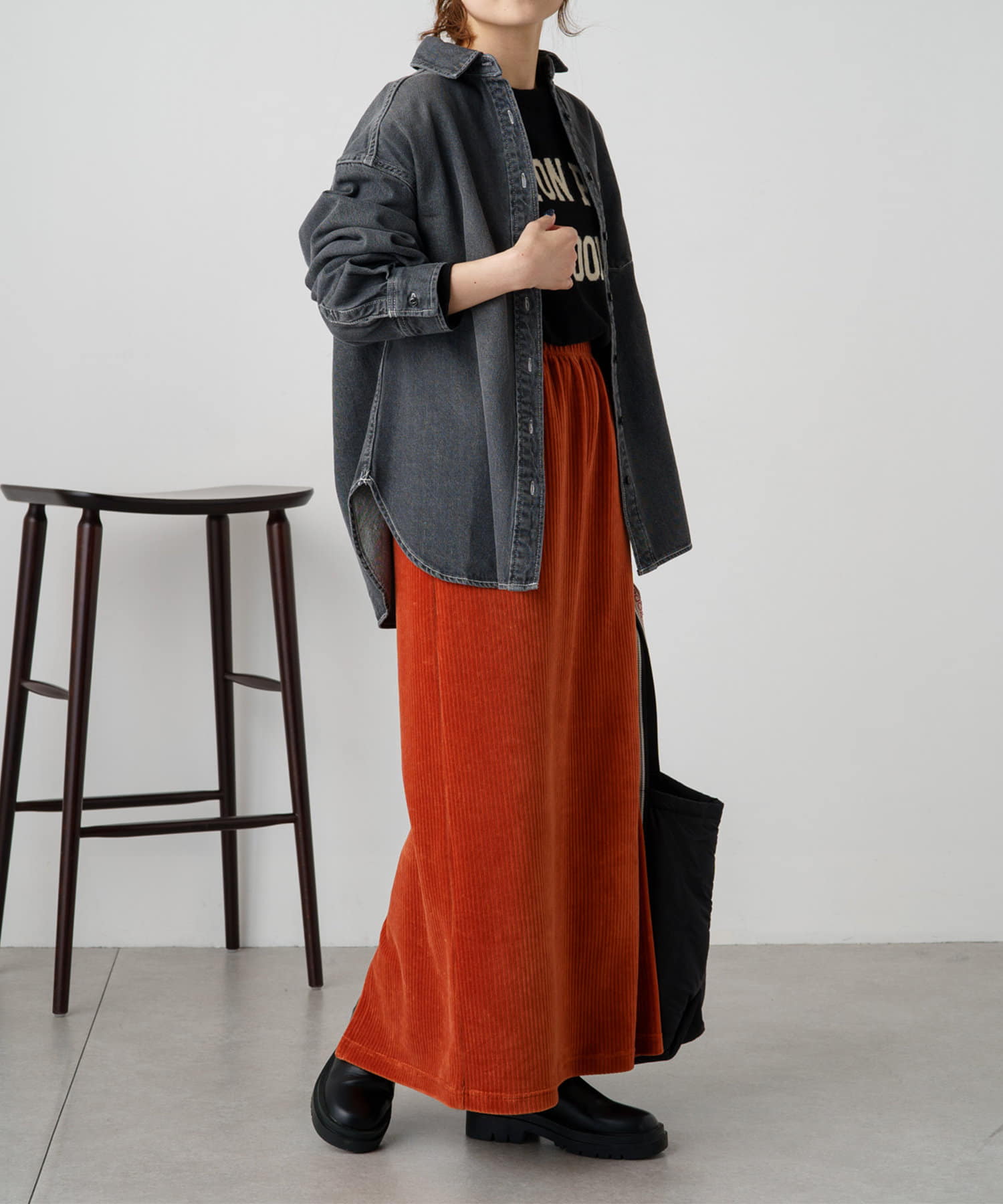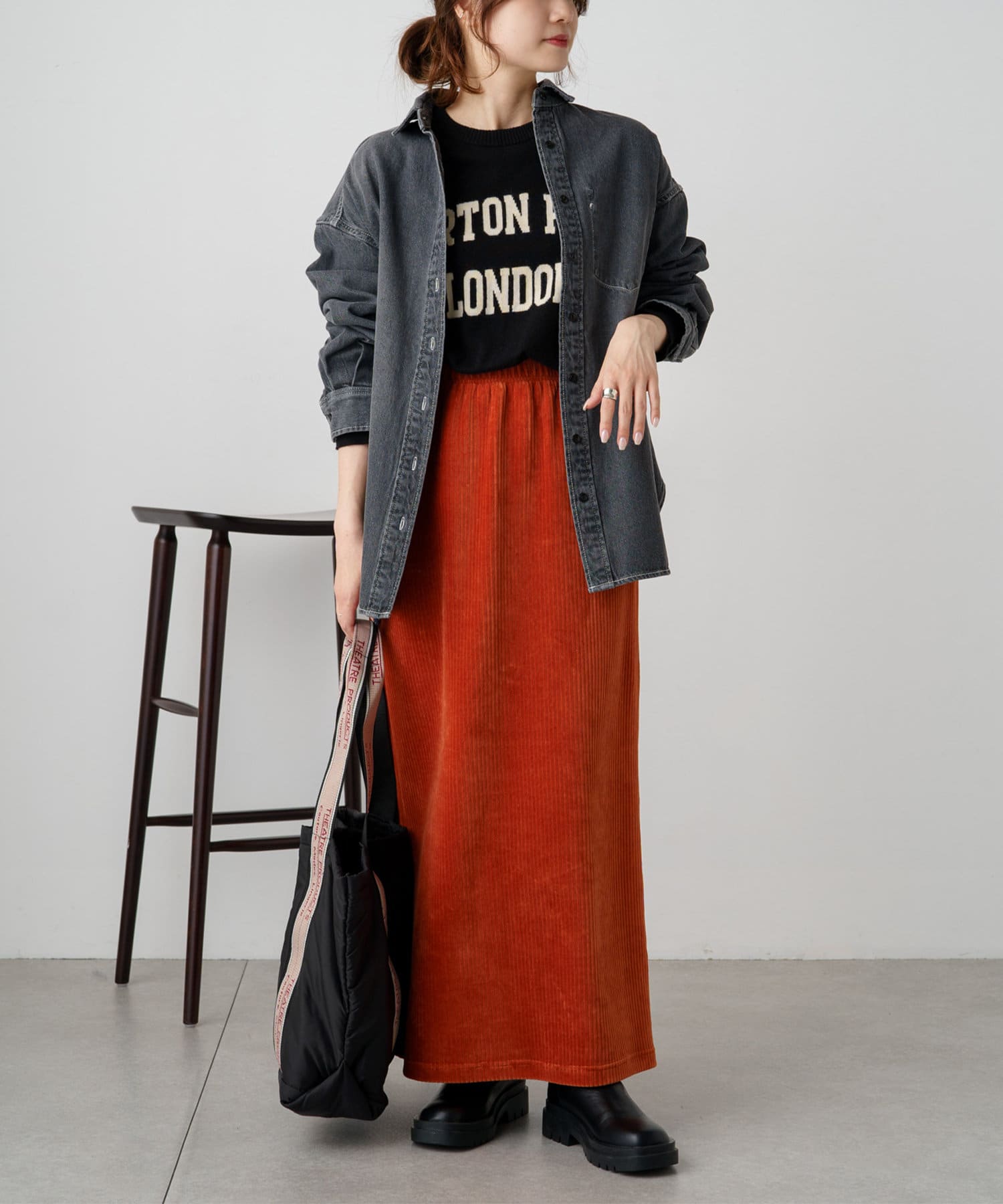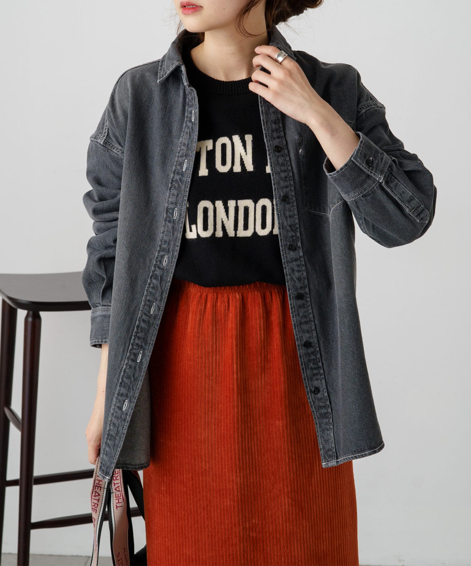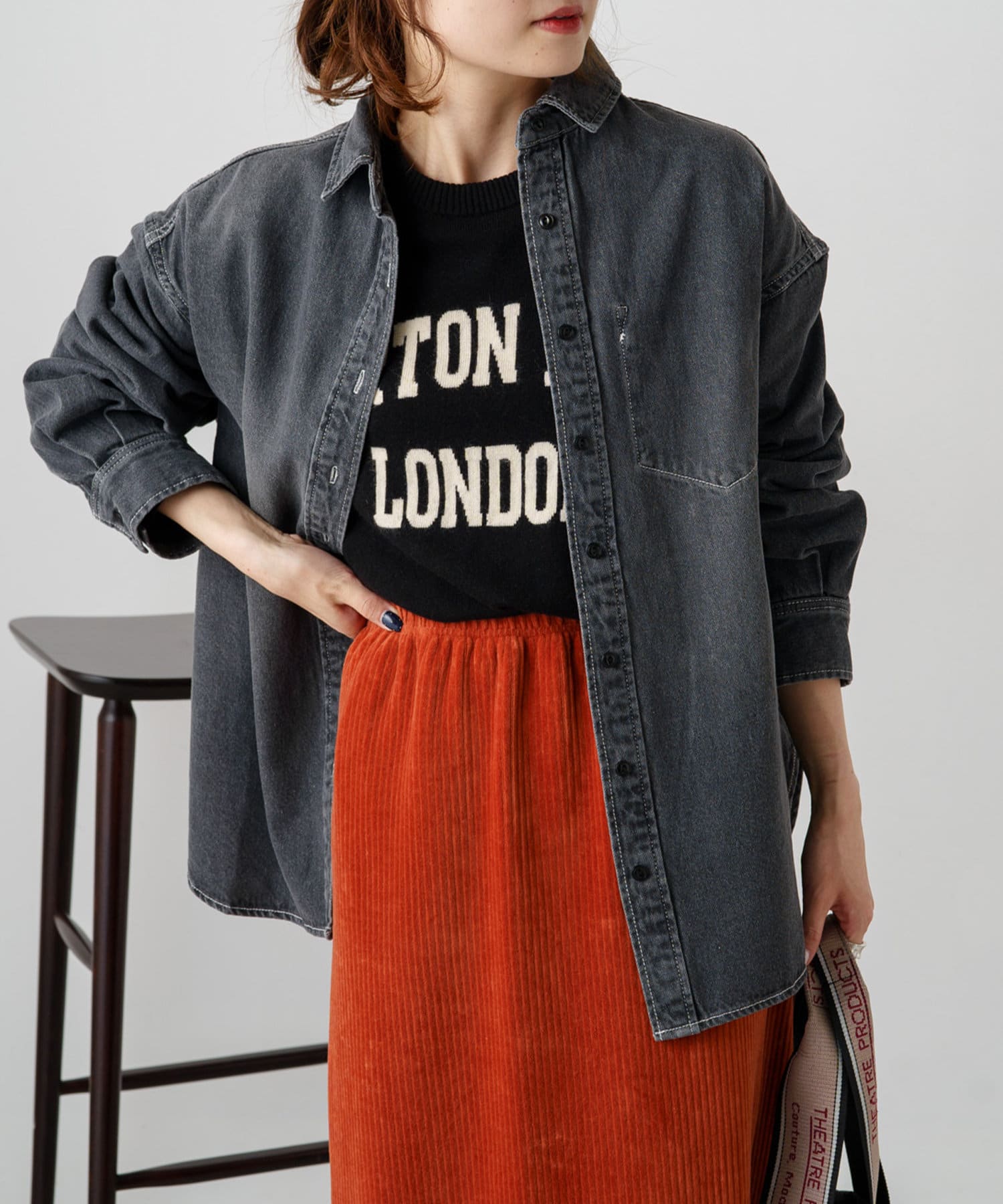 ボトムスにはスラックスやデニムパンツでセットアップ風に。ニットやコールテンなど異素材の組み合わせもおすすめです。