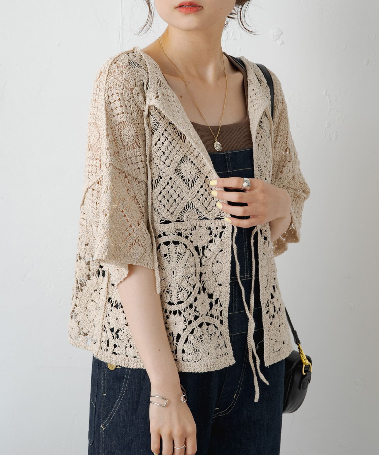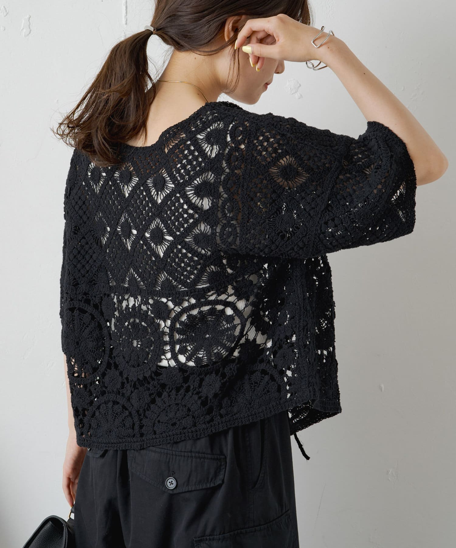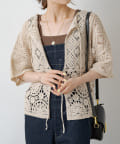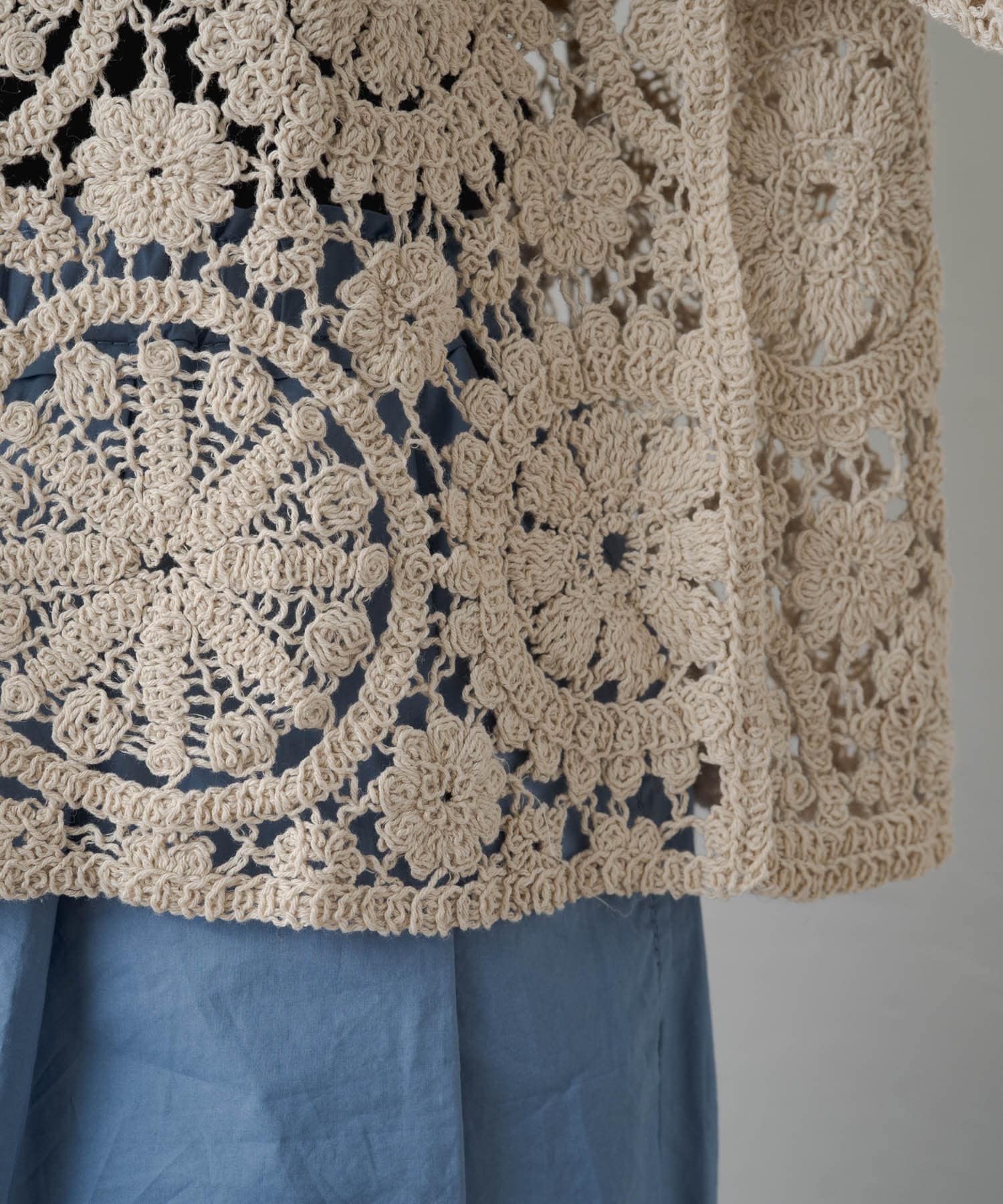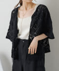 様々な編み柄を組み合わせたカギ針編みカーディガン。
