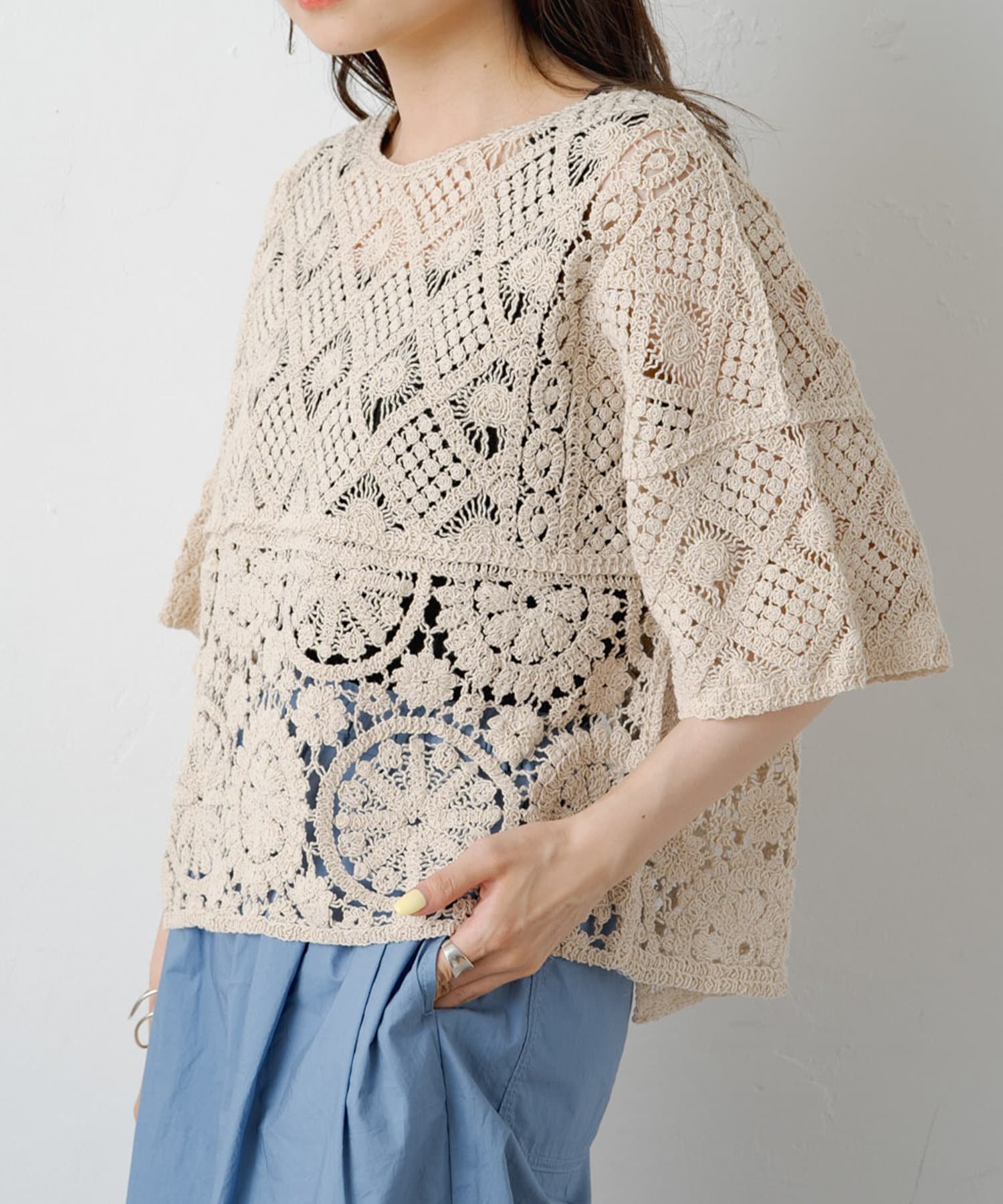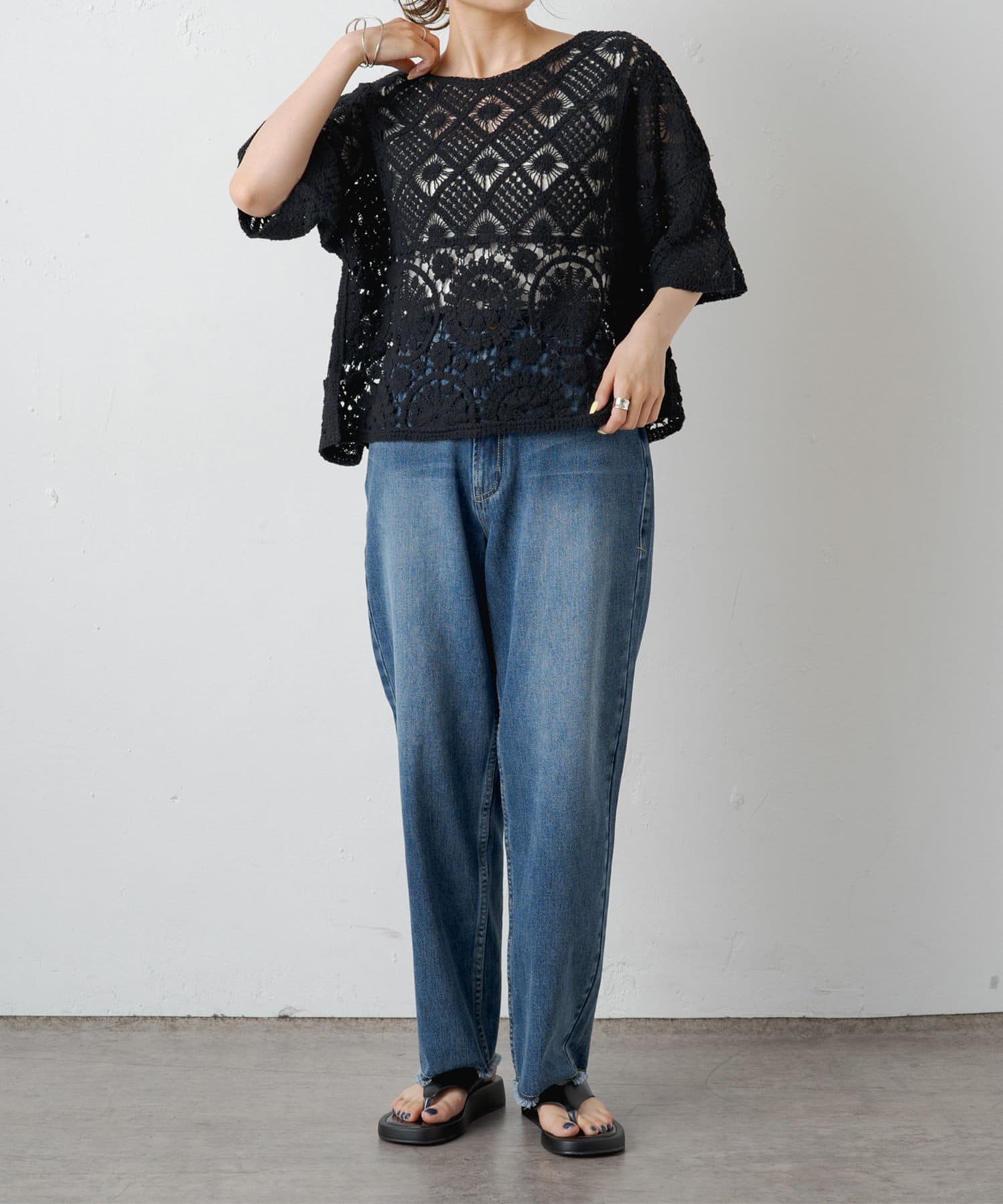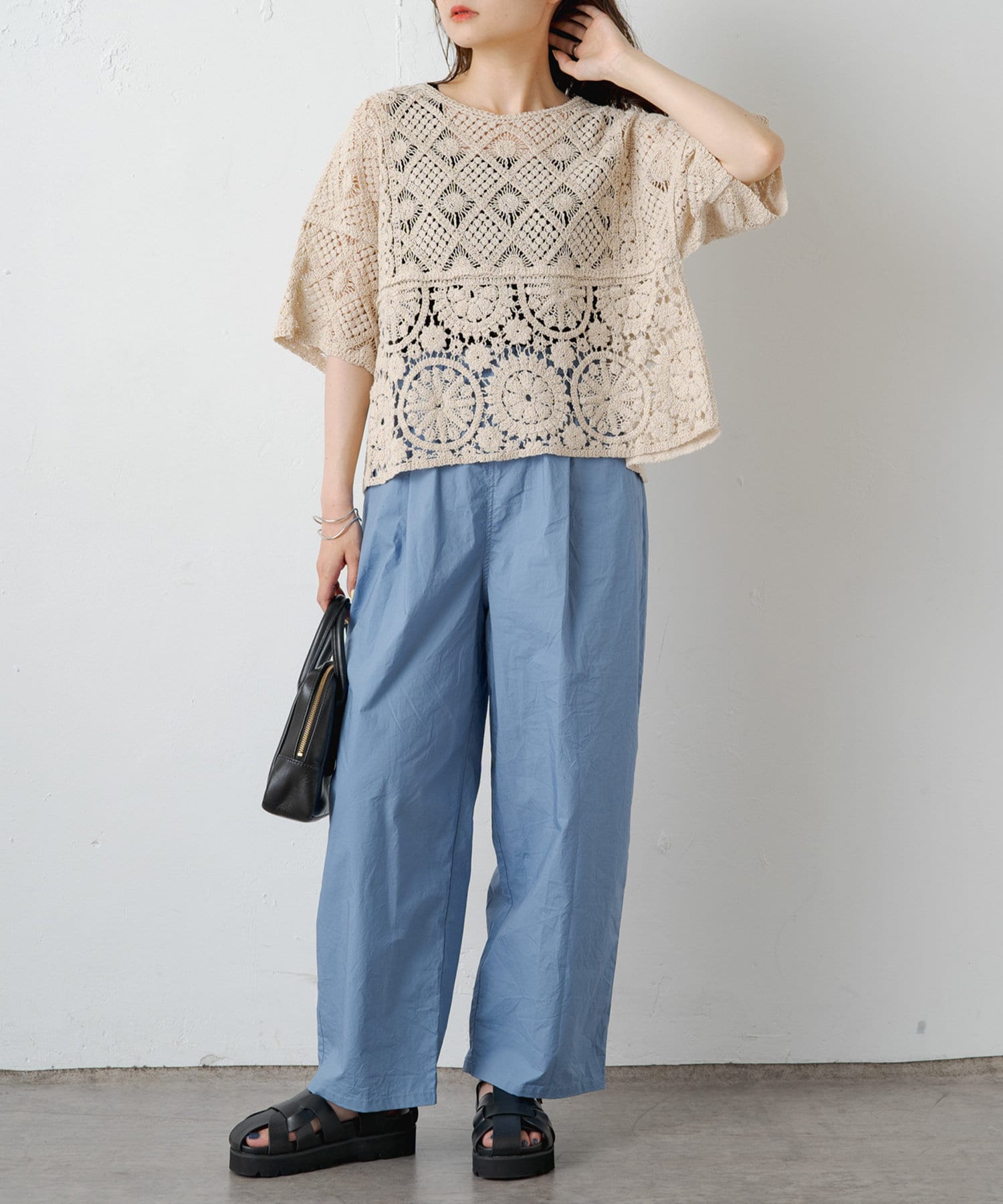 素材感:さらりとしたドライな肌触りで、軽やかな着心地。透け感があるので夏でも快適です◎