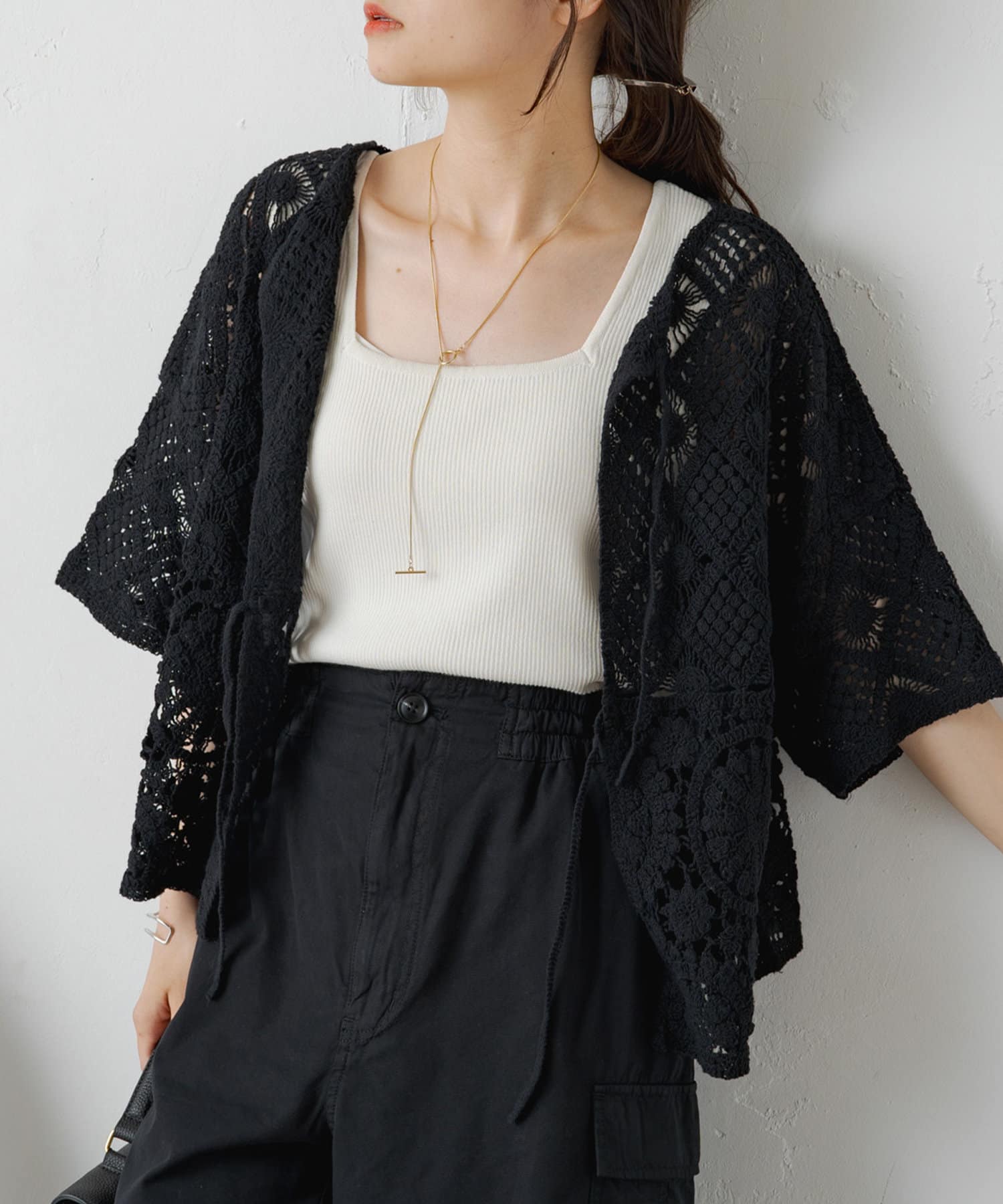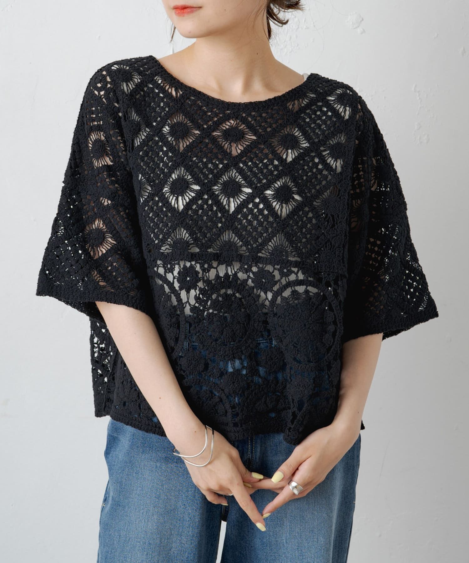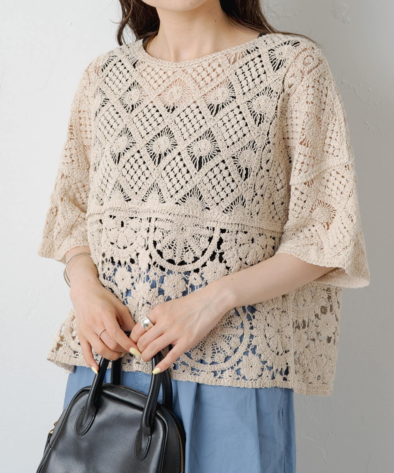 素材感:さらりとしたドライな肌触りで、軽やかな着心地。透け感があるので夏でも快適です◎