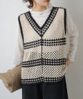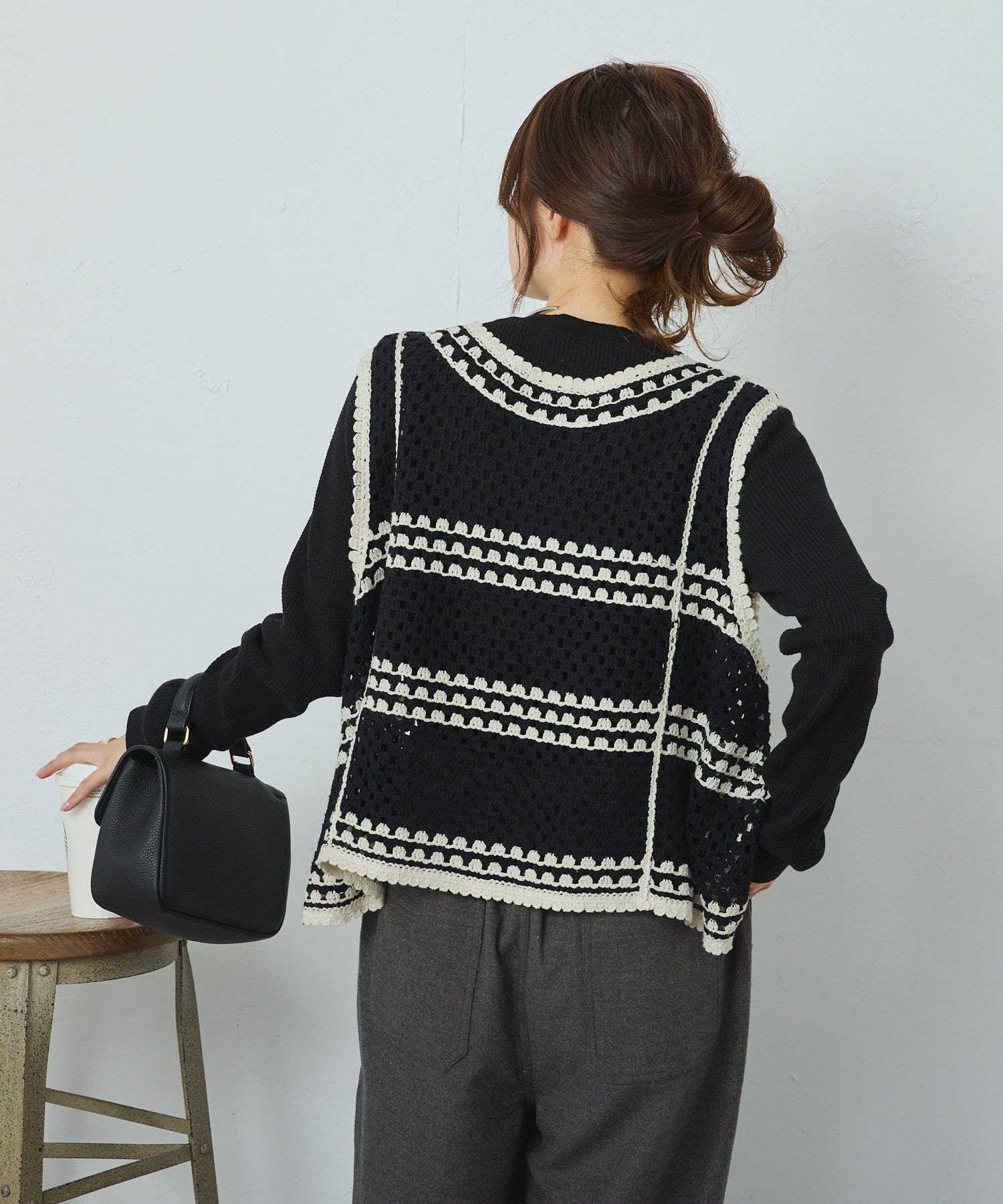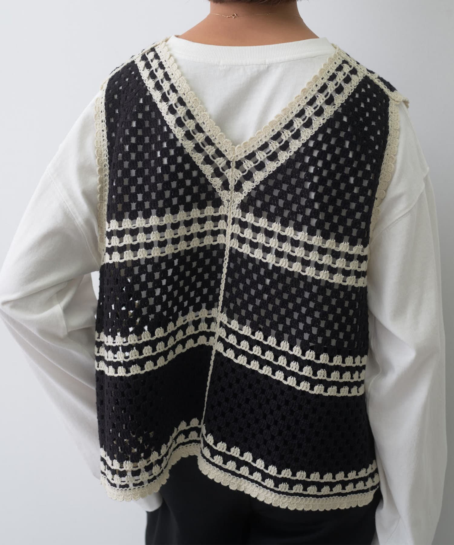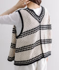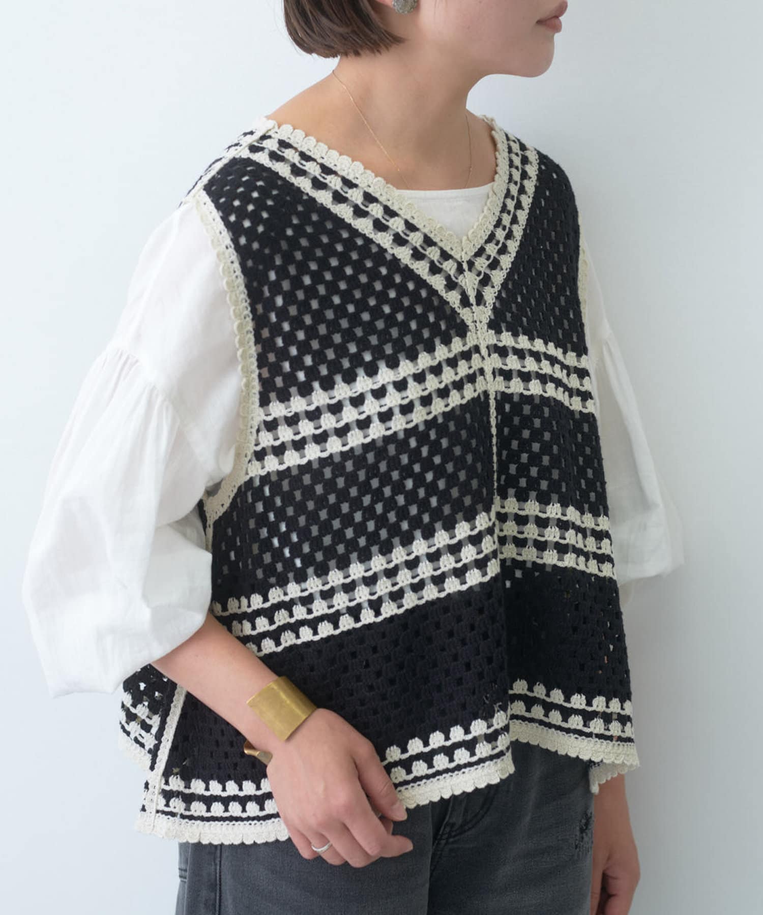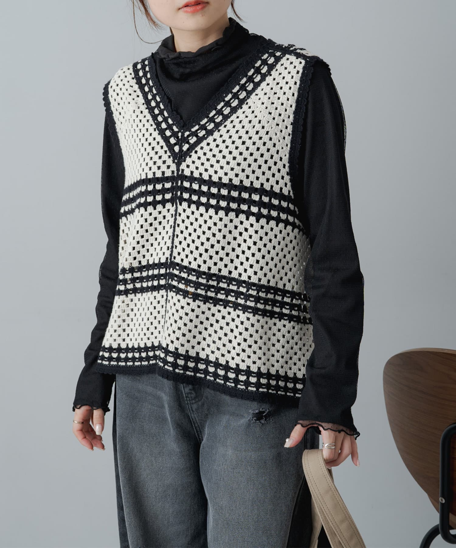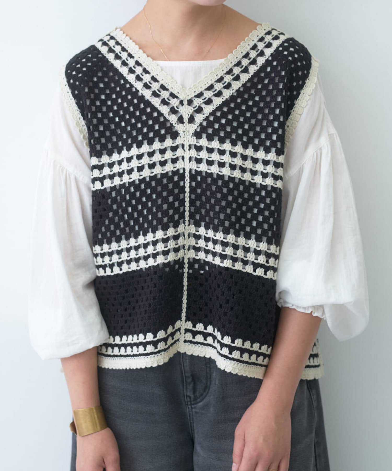 クロシェ/かぎ針編みのような編地が表情豊かな配色ベスト。
