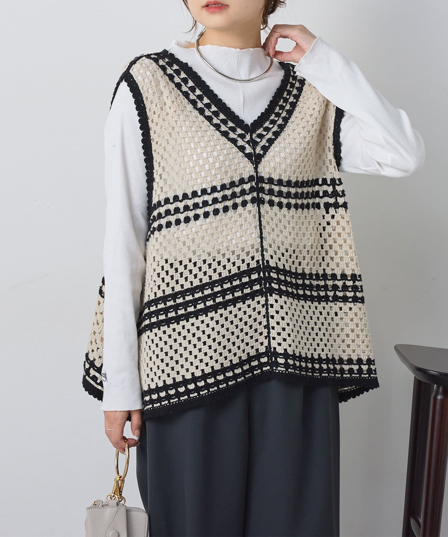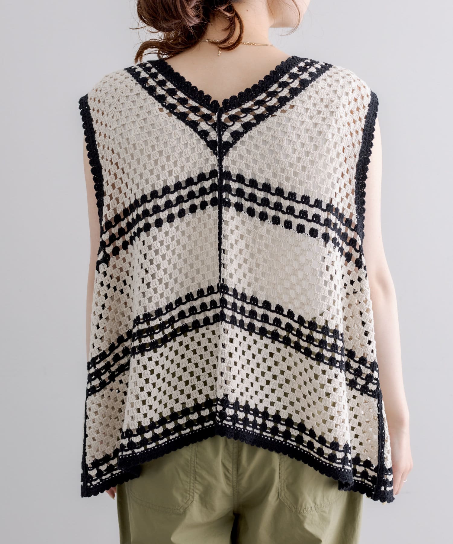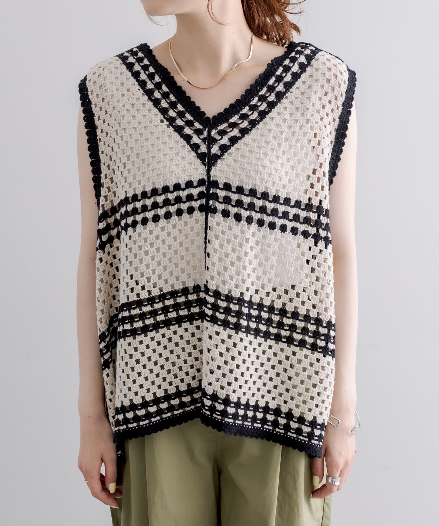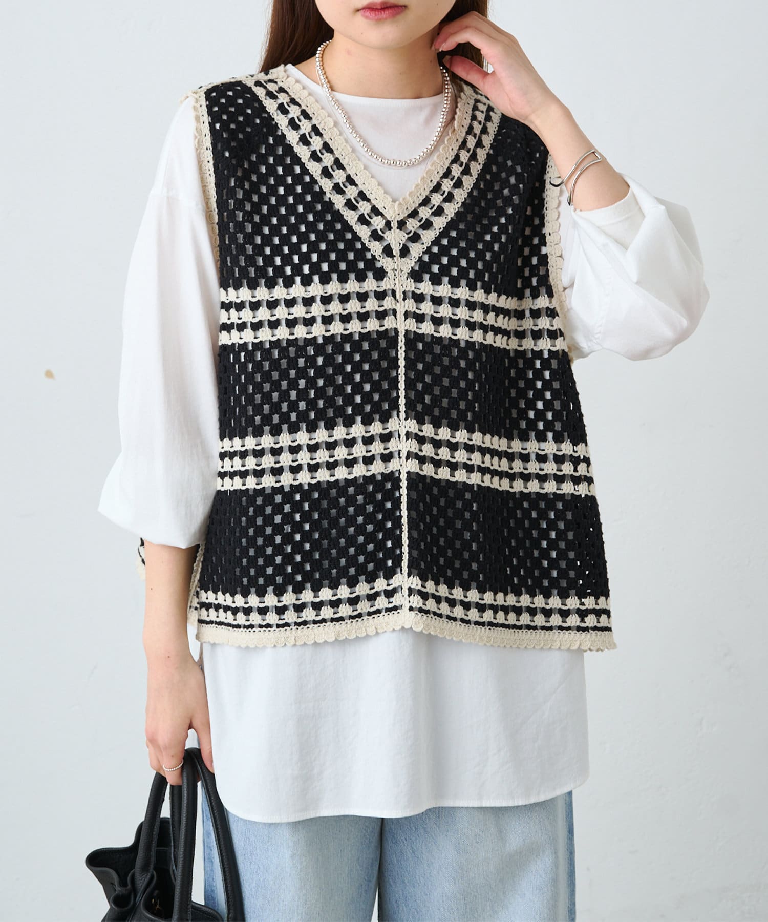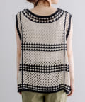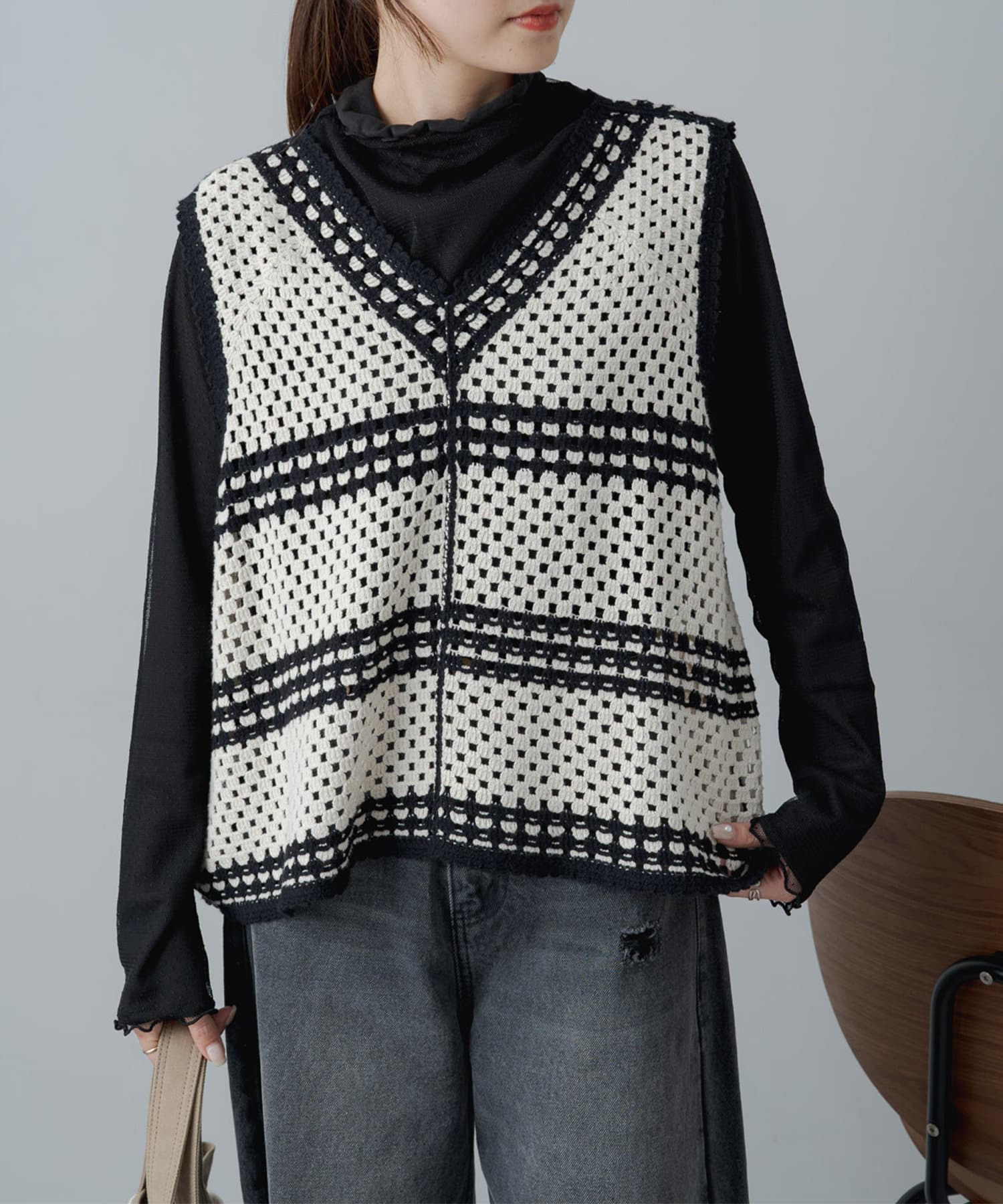 クロシェ/かぎ針編みのような編地が表情豊かな配色ベスト。