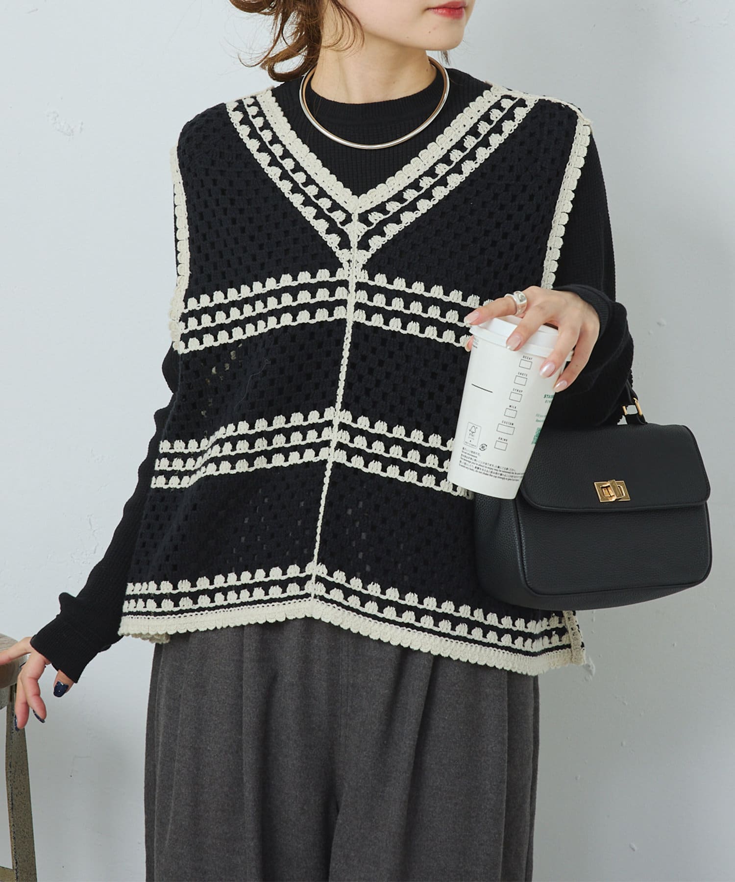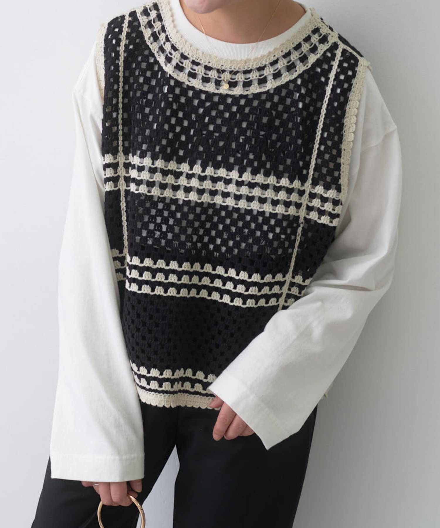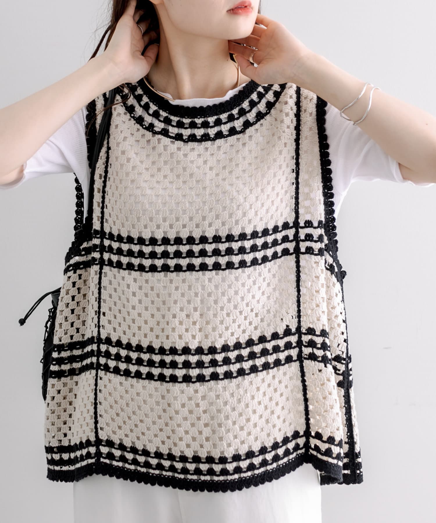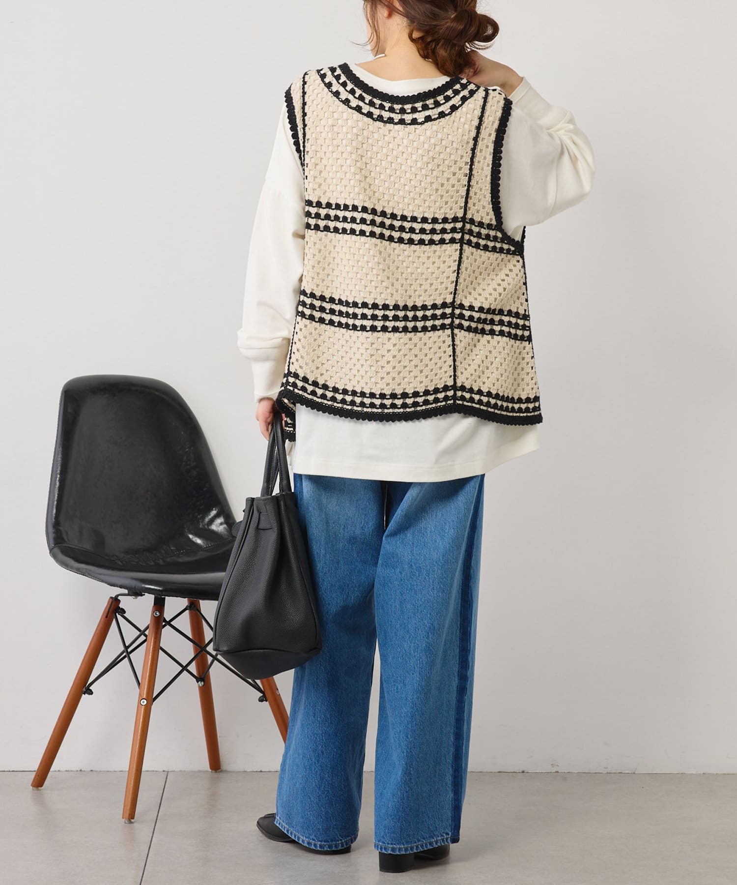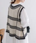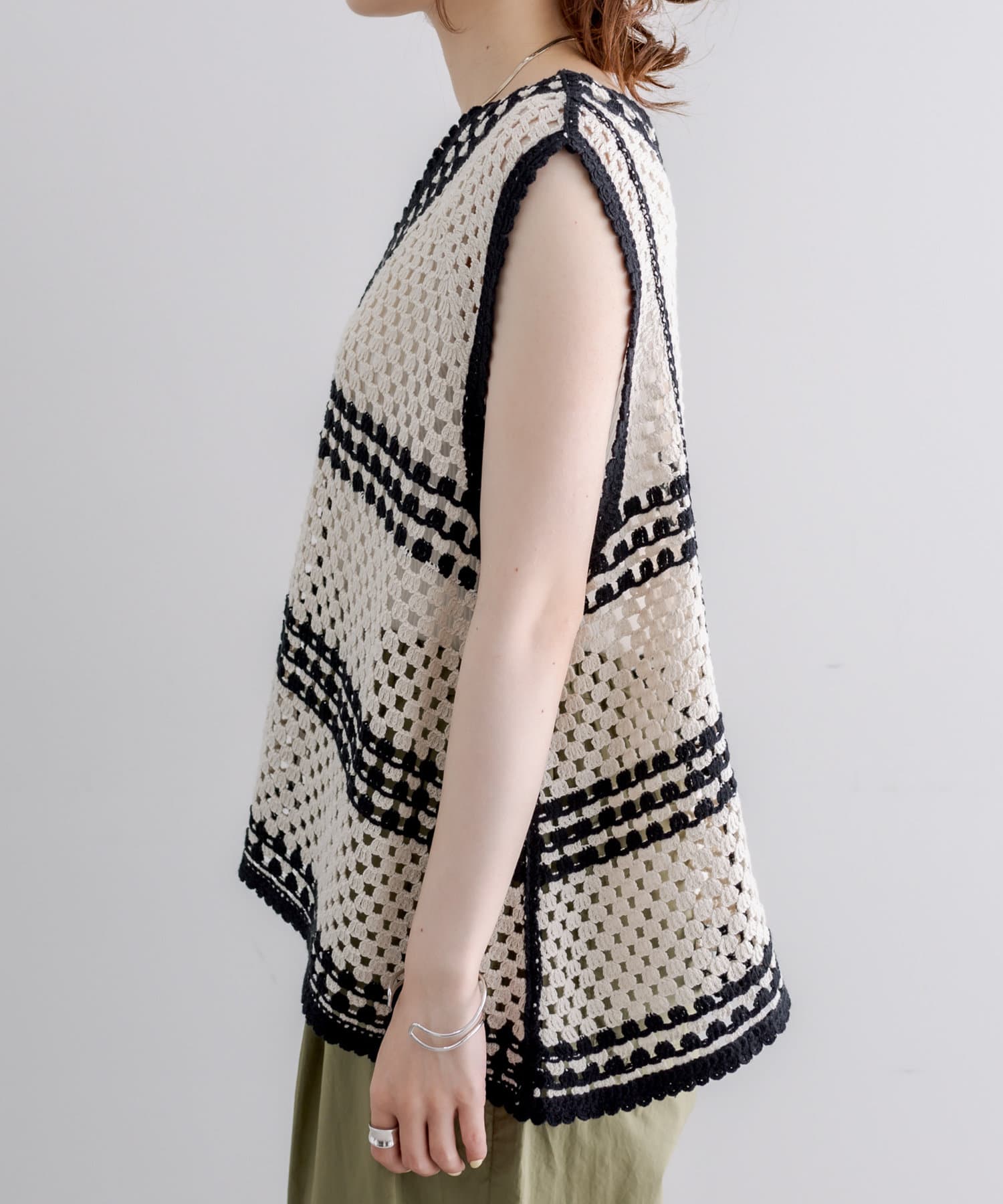 クロシェ/かぎ針編みのような編地が表情豊かな配色ベスト。