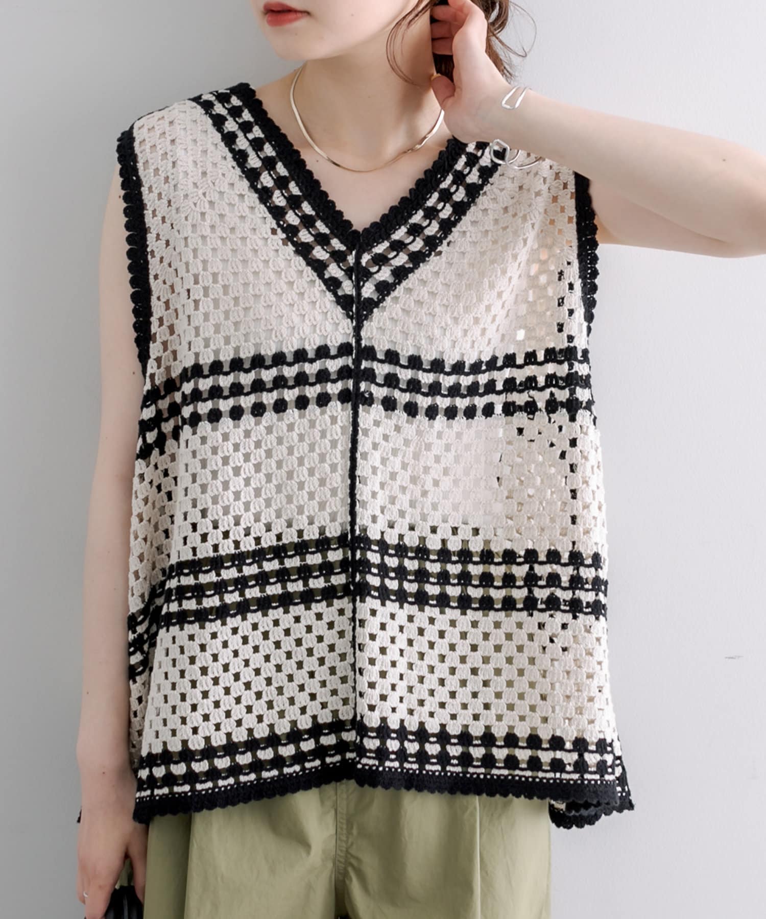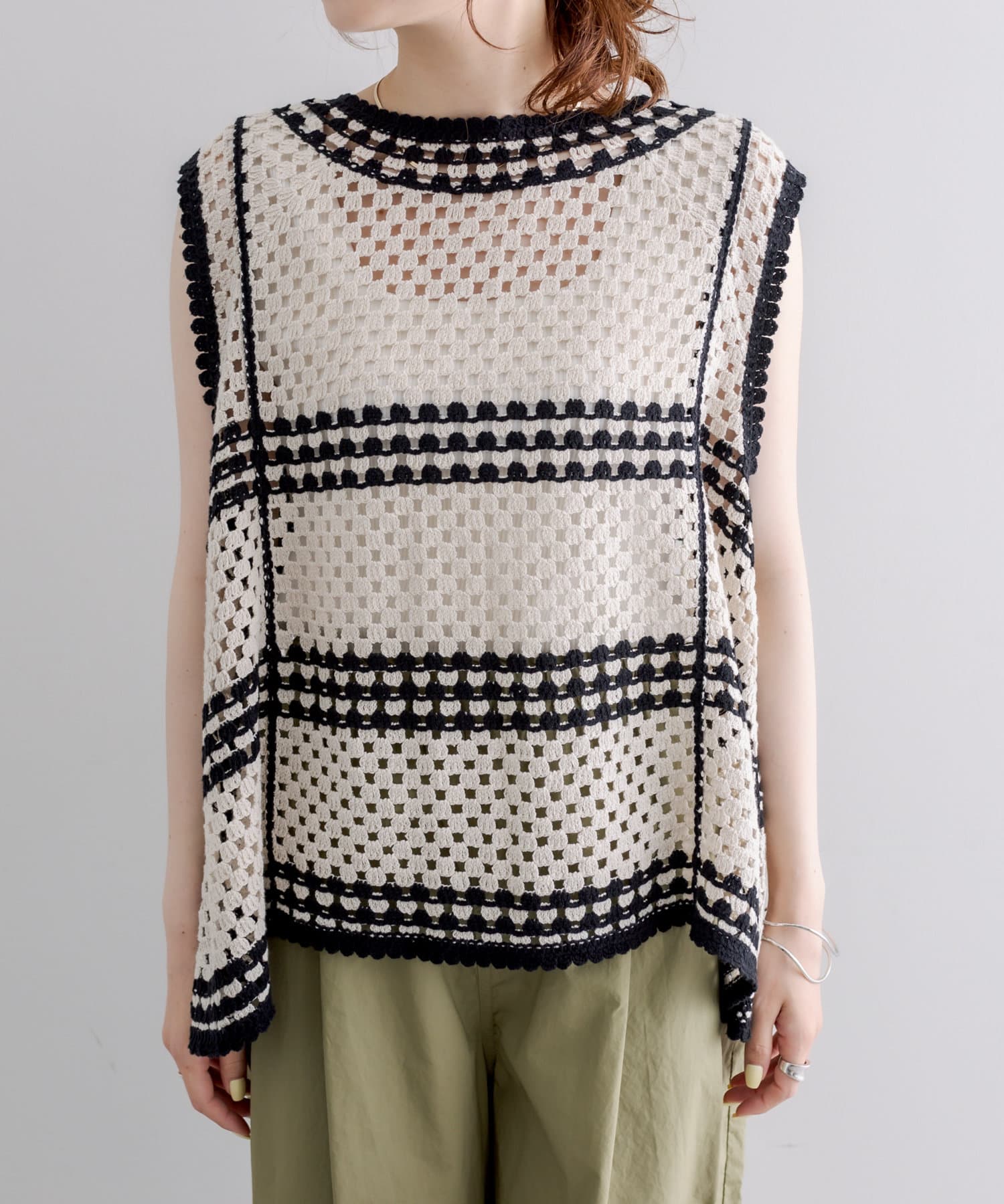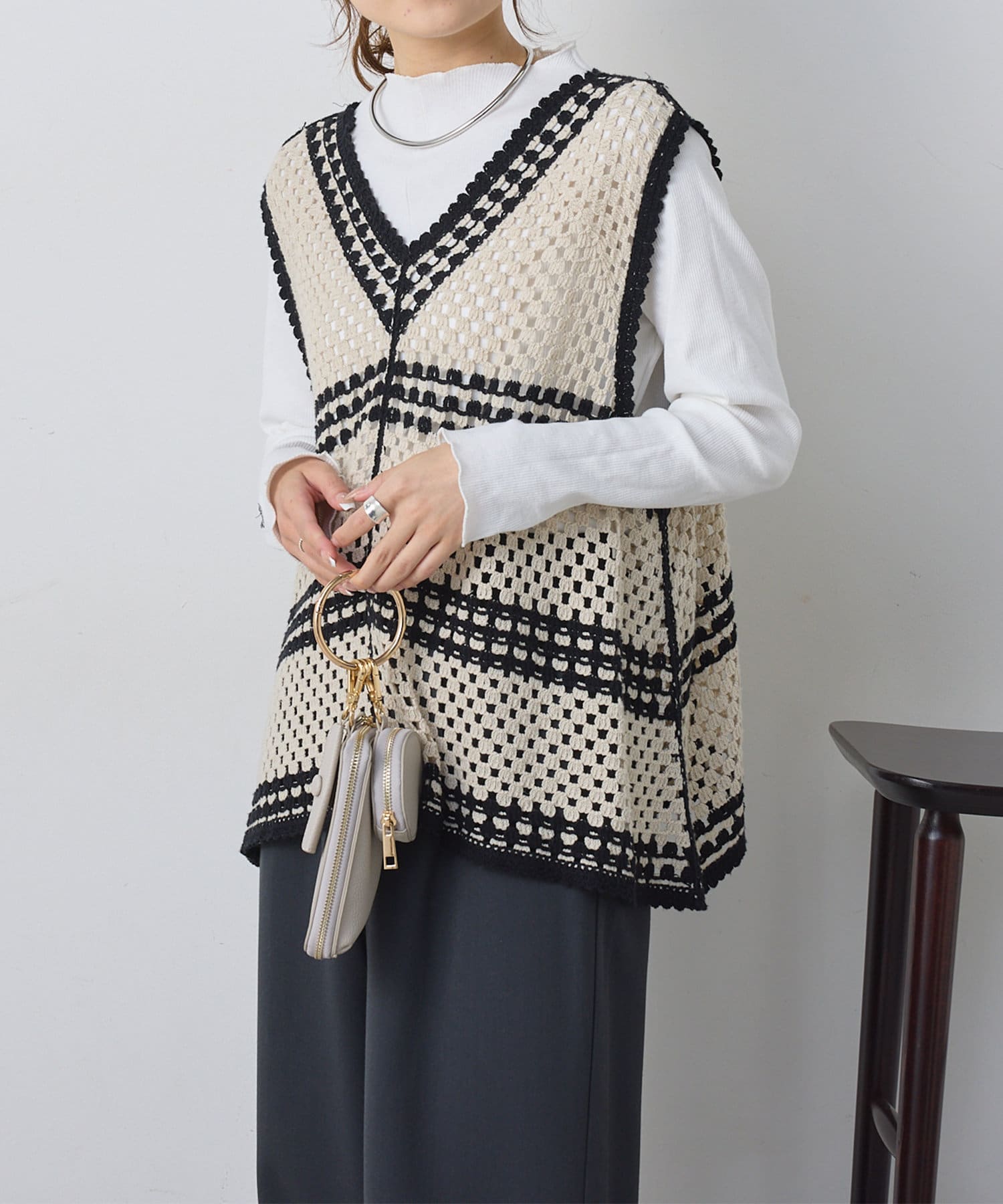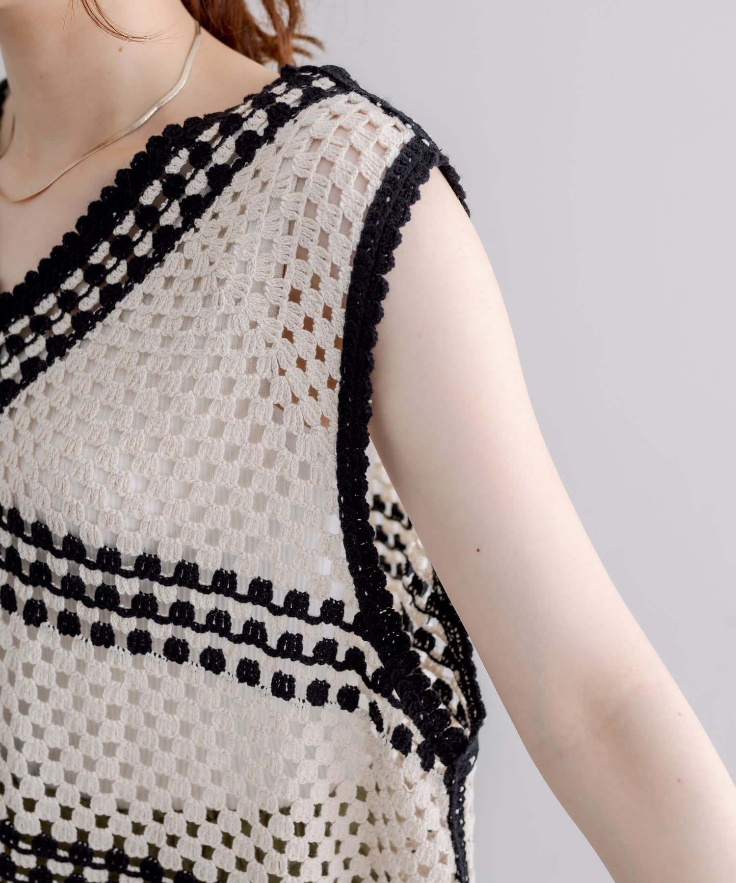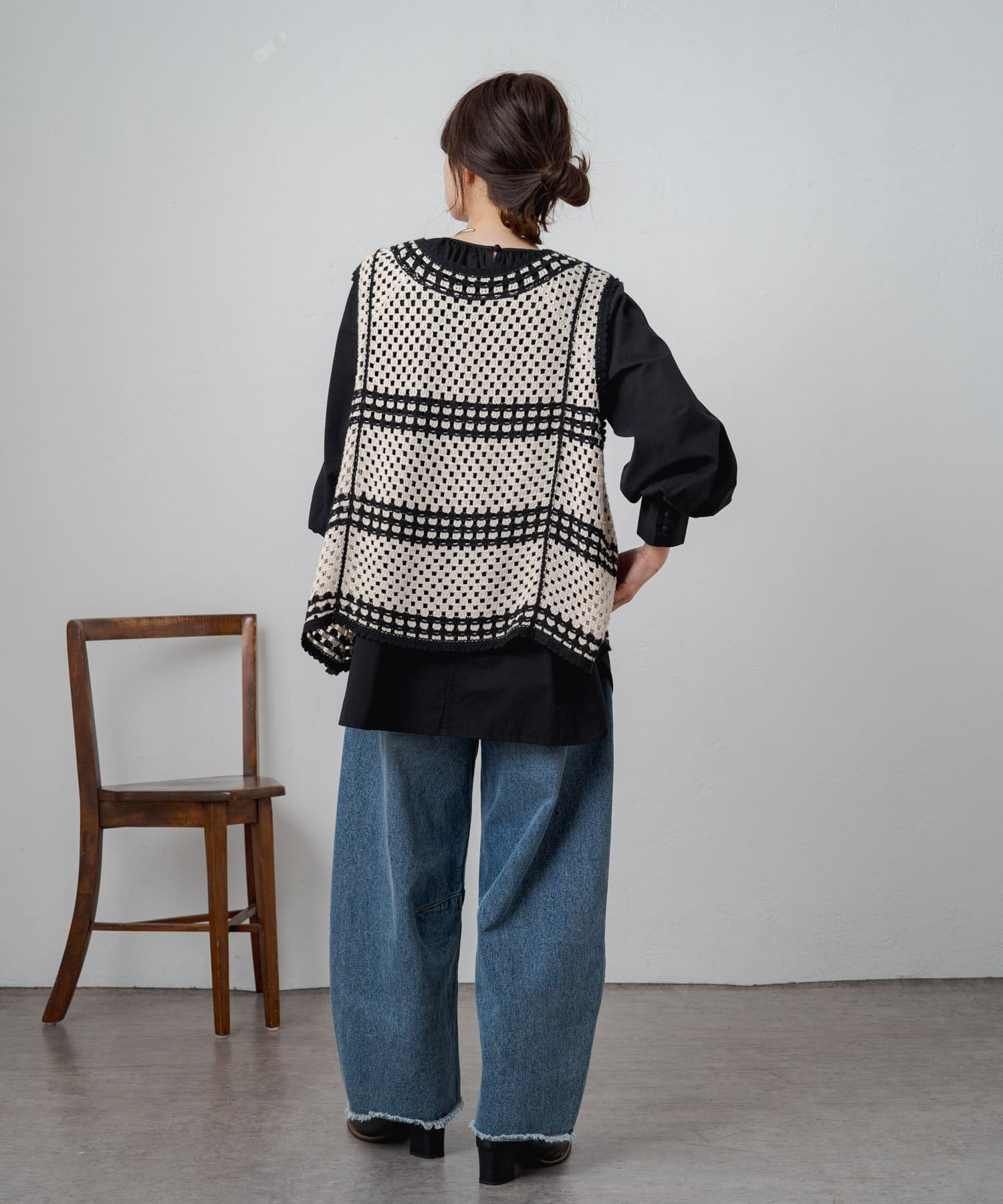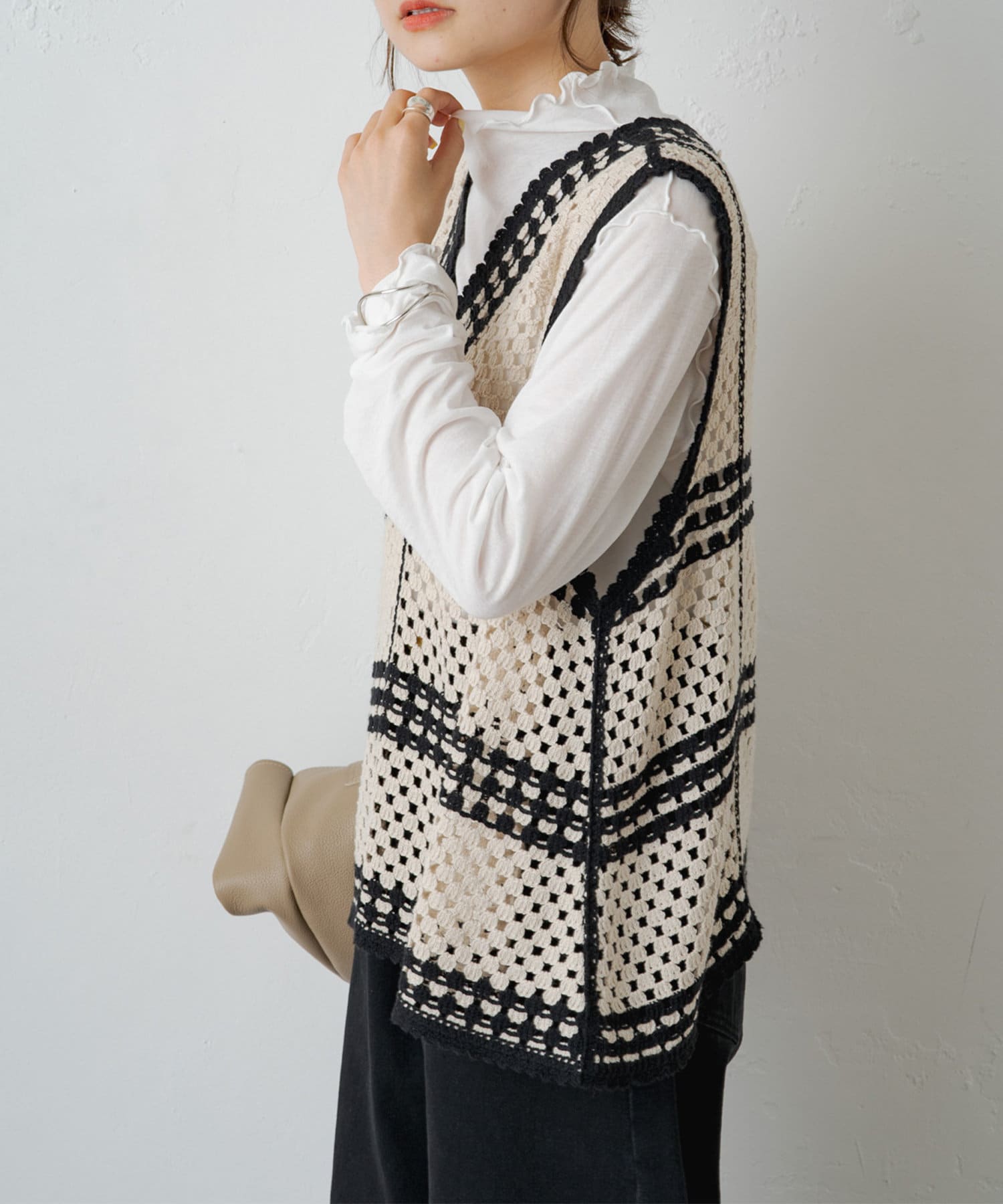 クロシェ/かぎ針編みのような編地が表情豊かな配色ベスト。