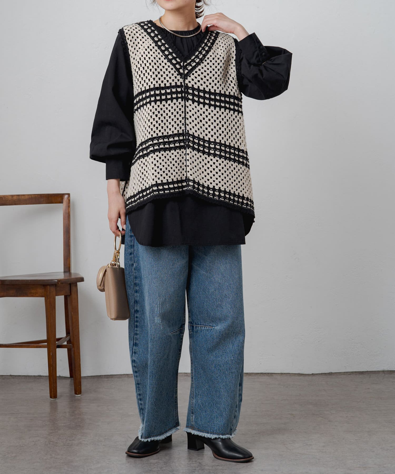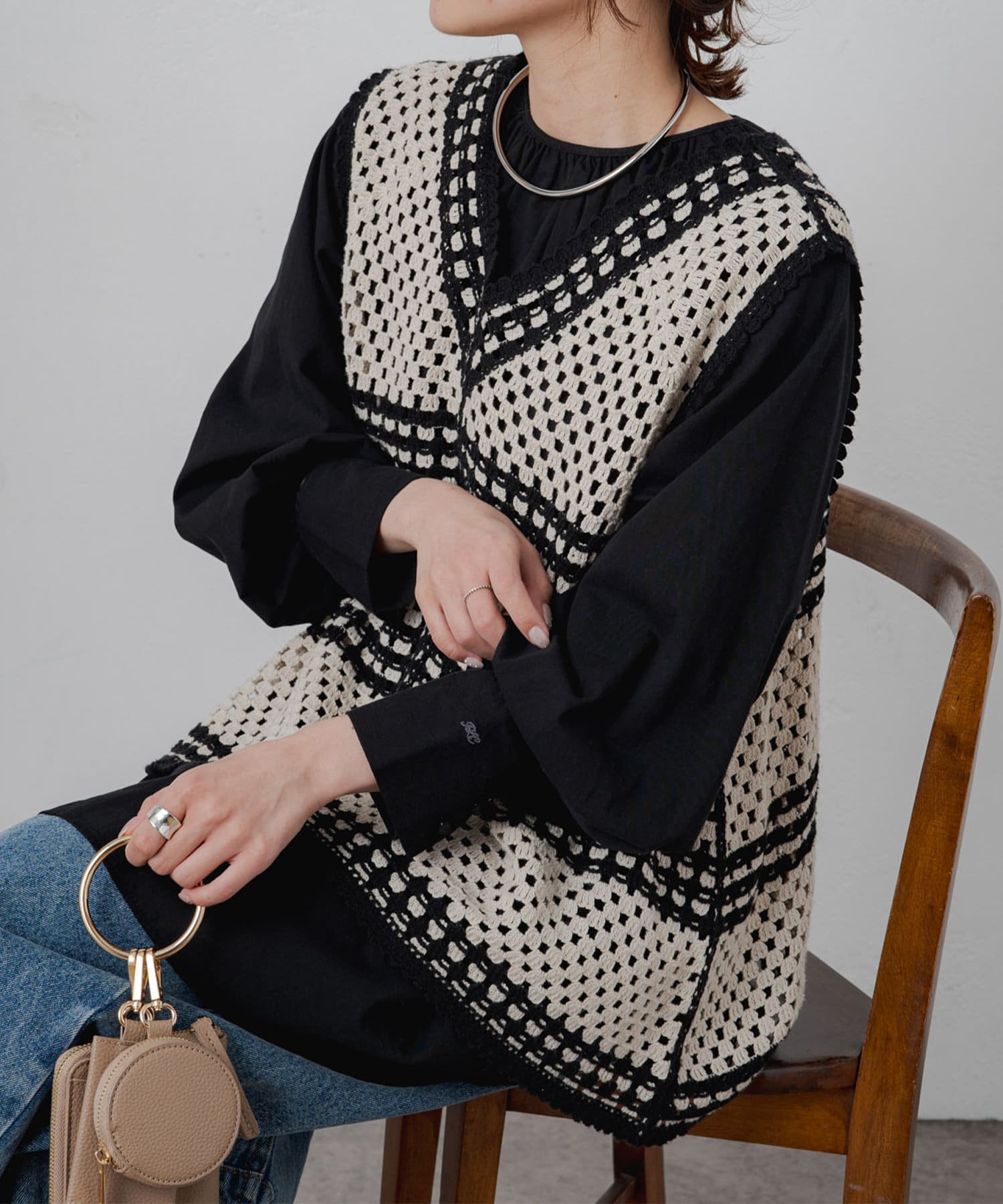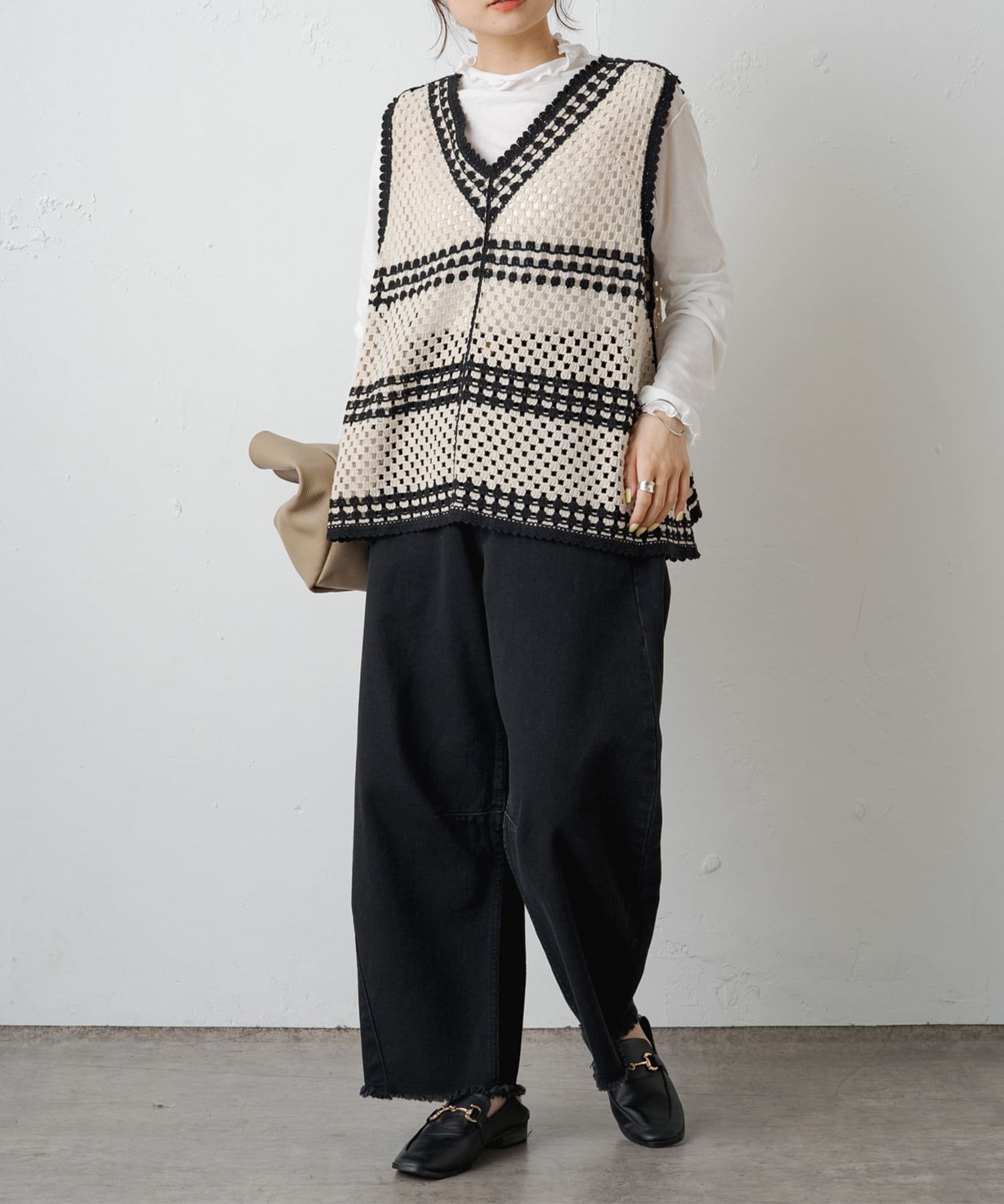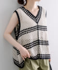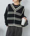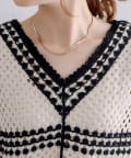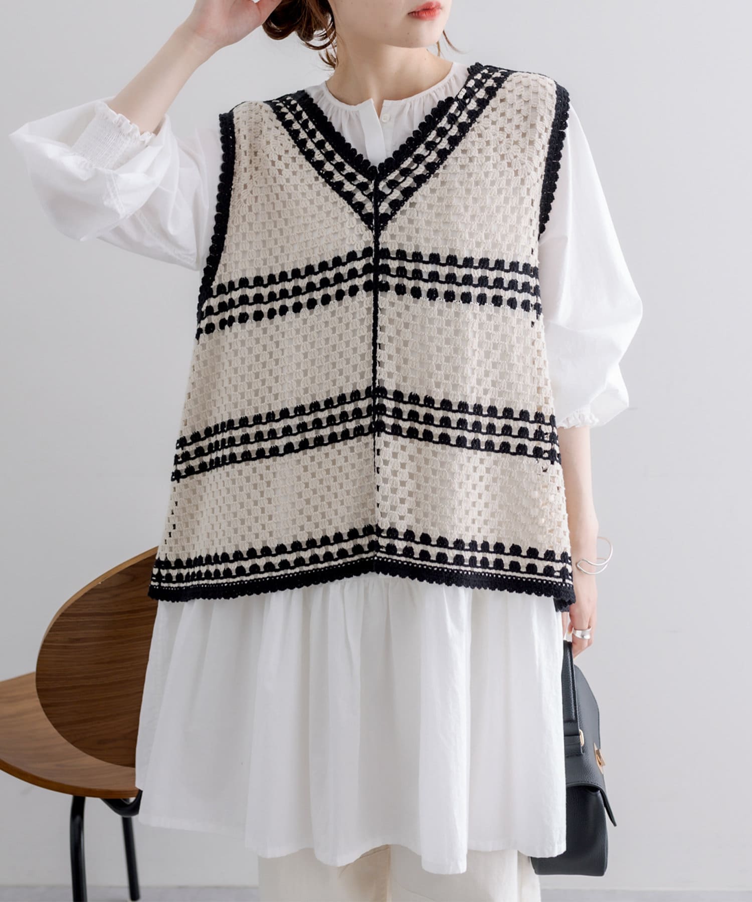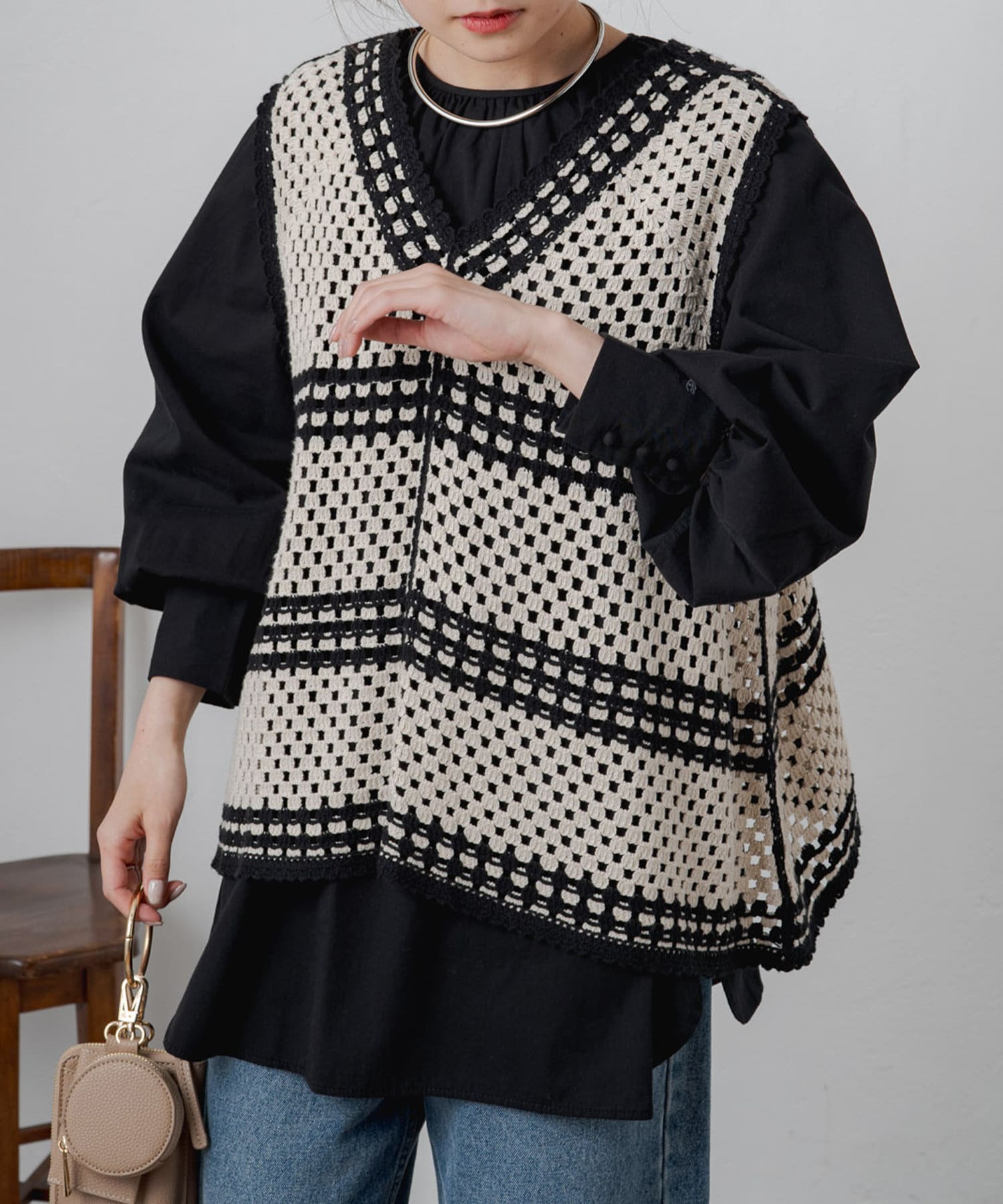 クロシェ/かぎ針編みのような編地が表情豊かな配色ベスト。