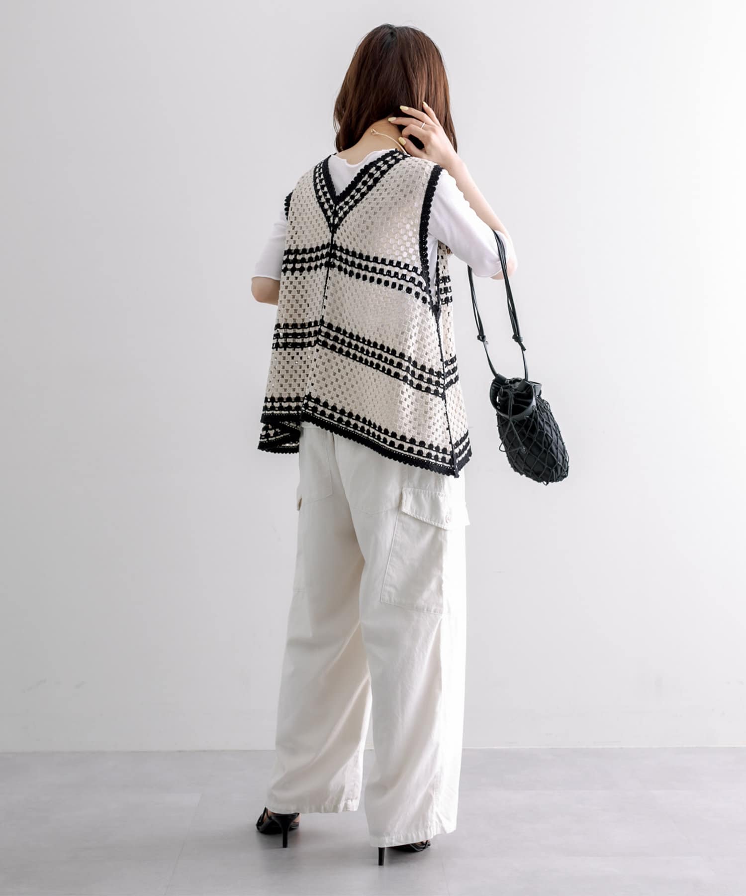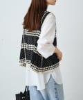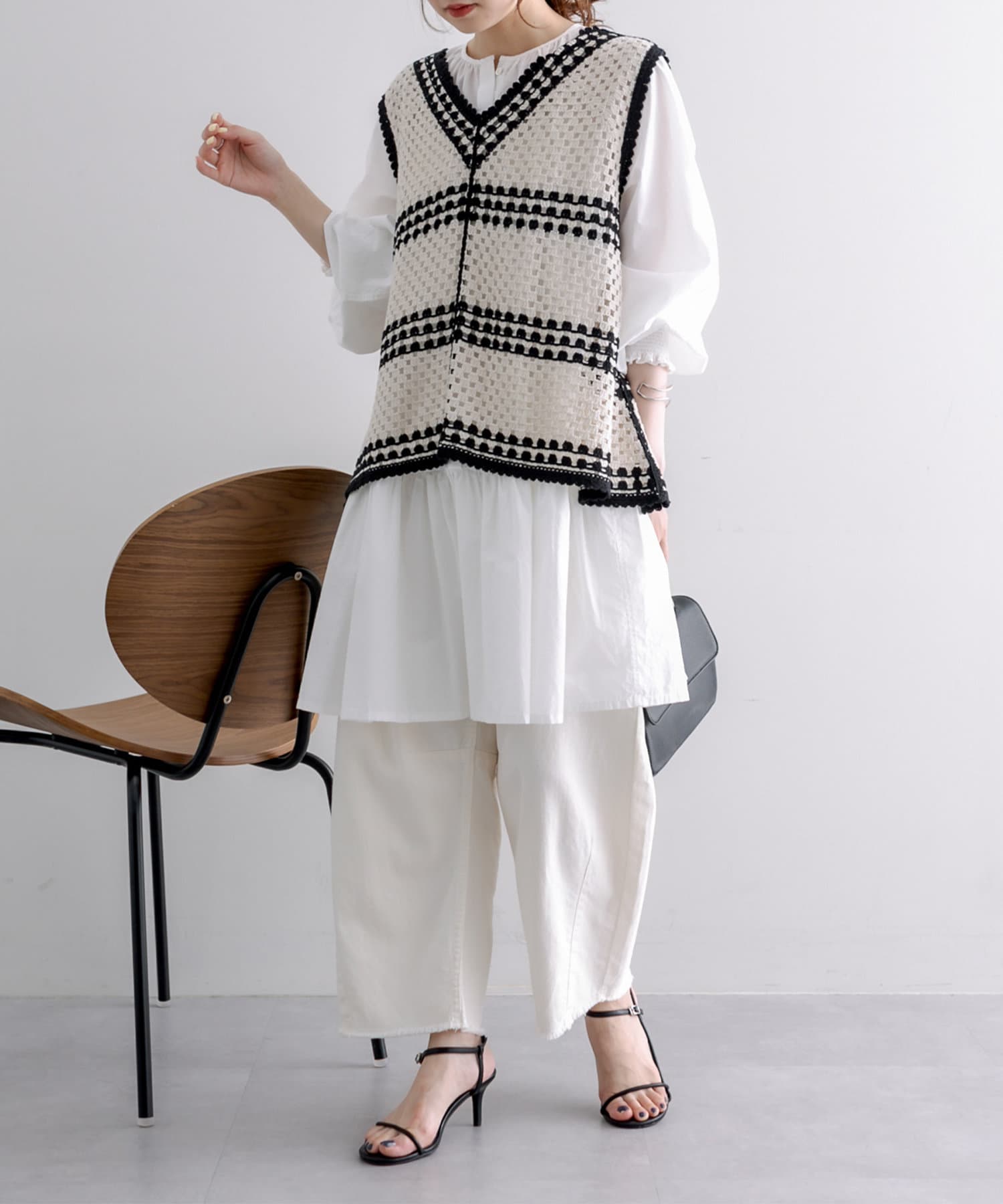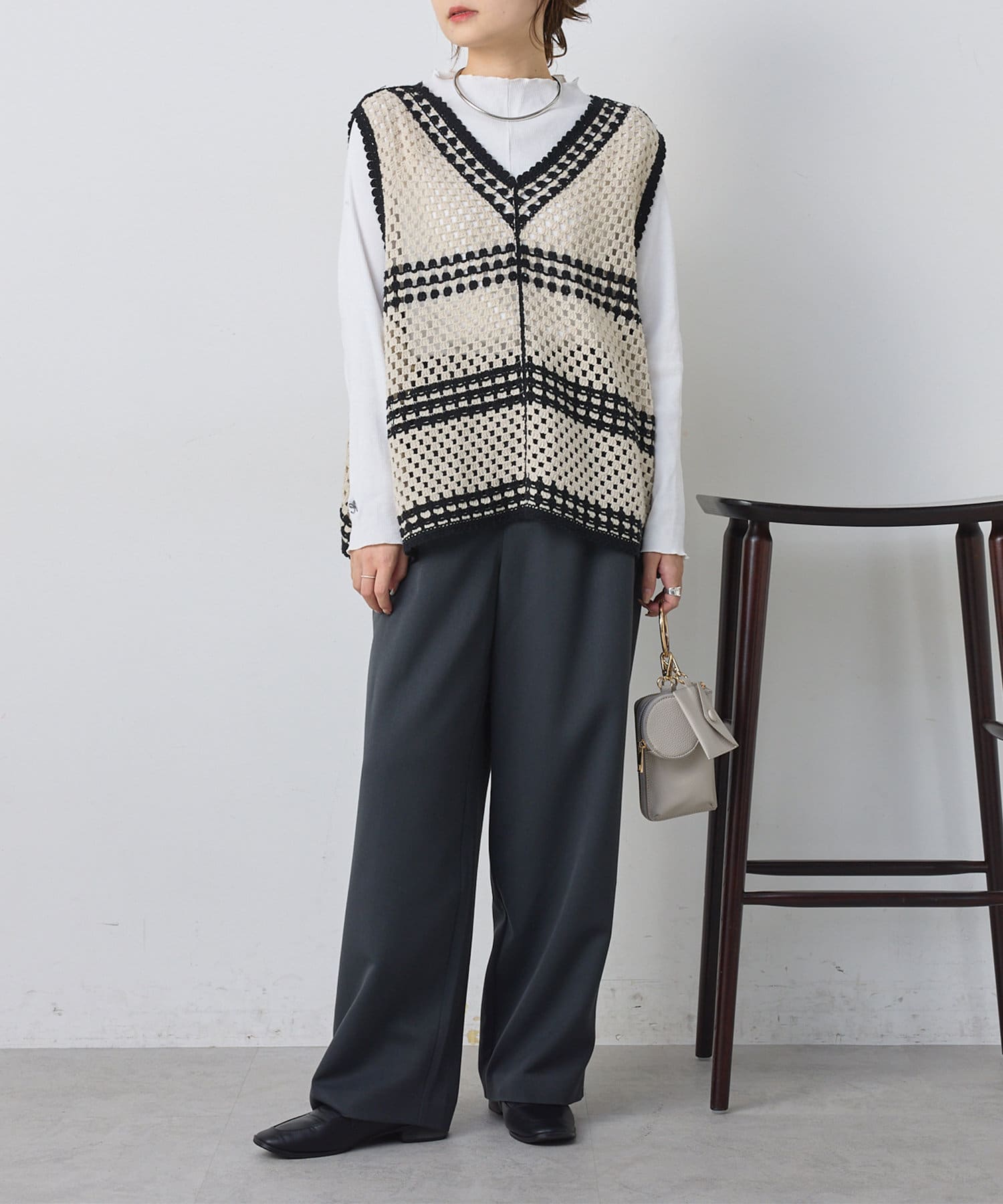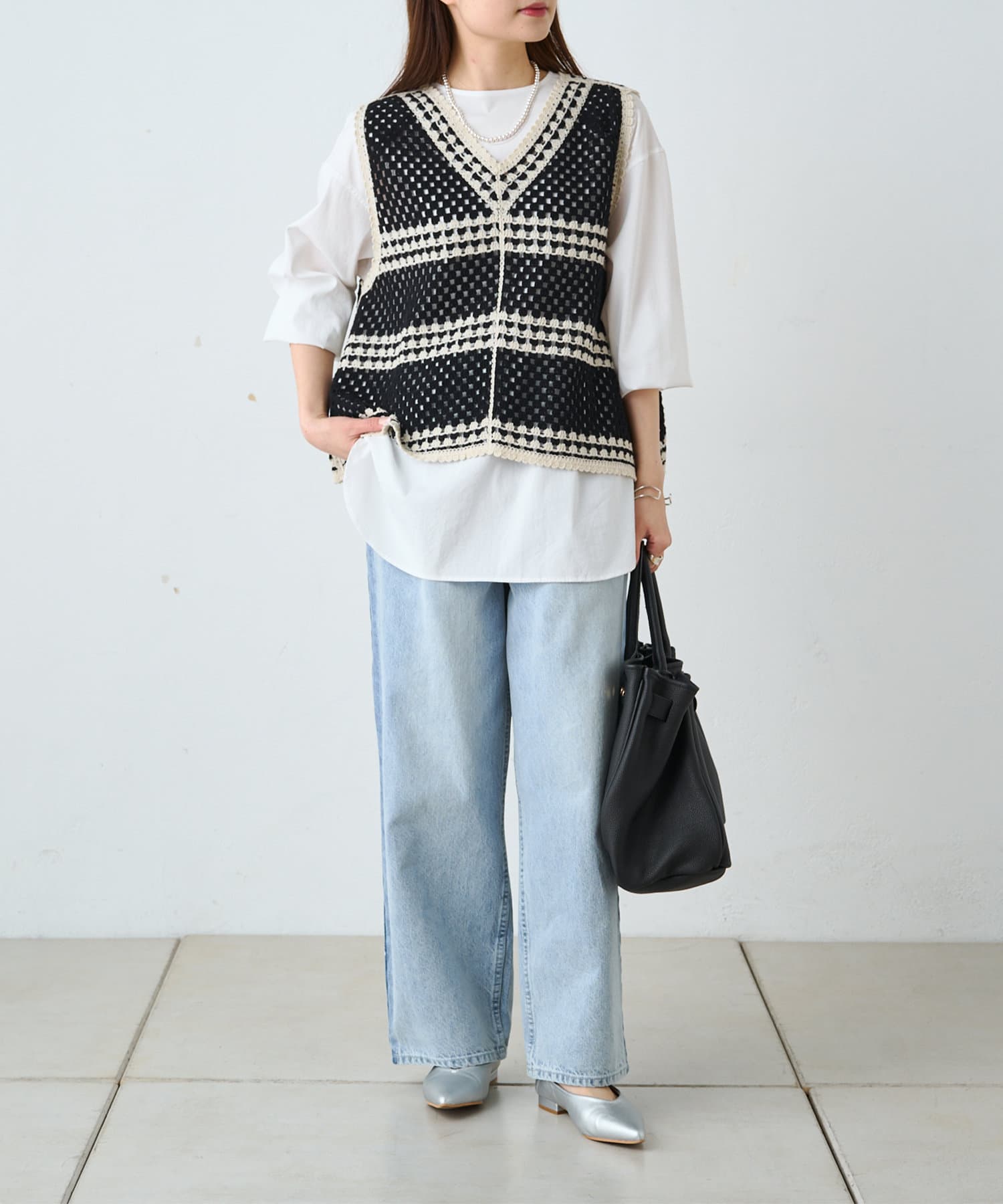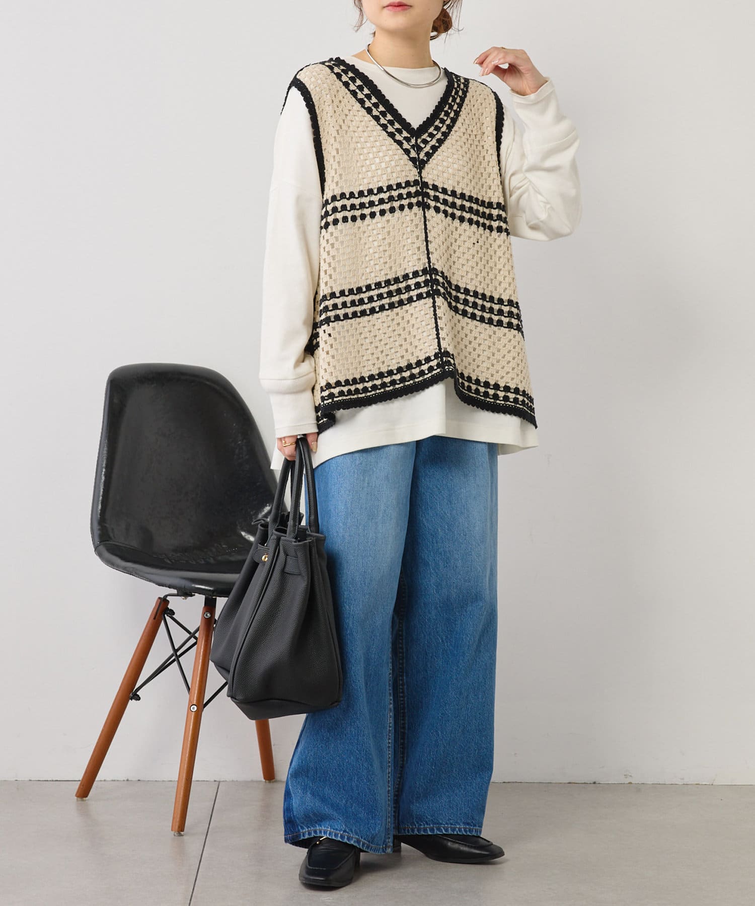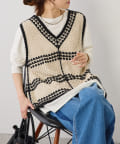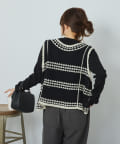 クロシェ/かぎ針編みのような編地が表情豊かな配色ベスト。