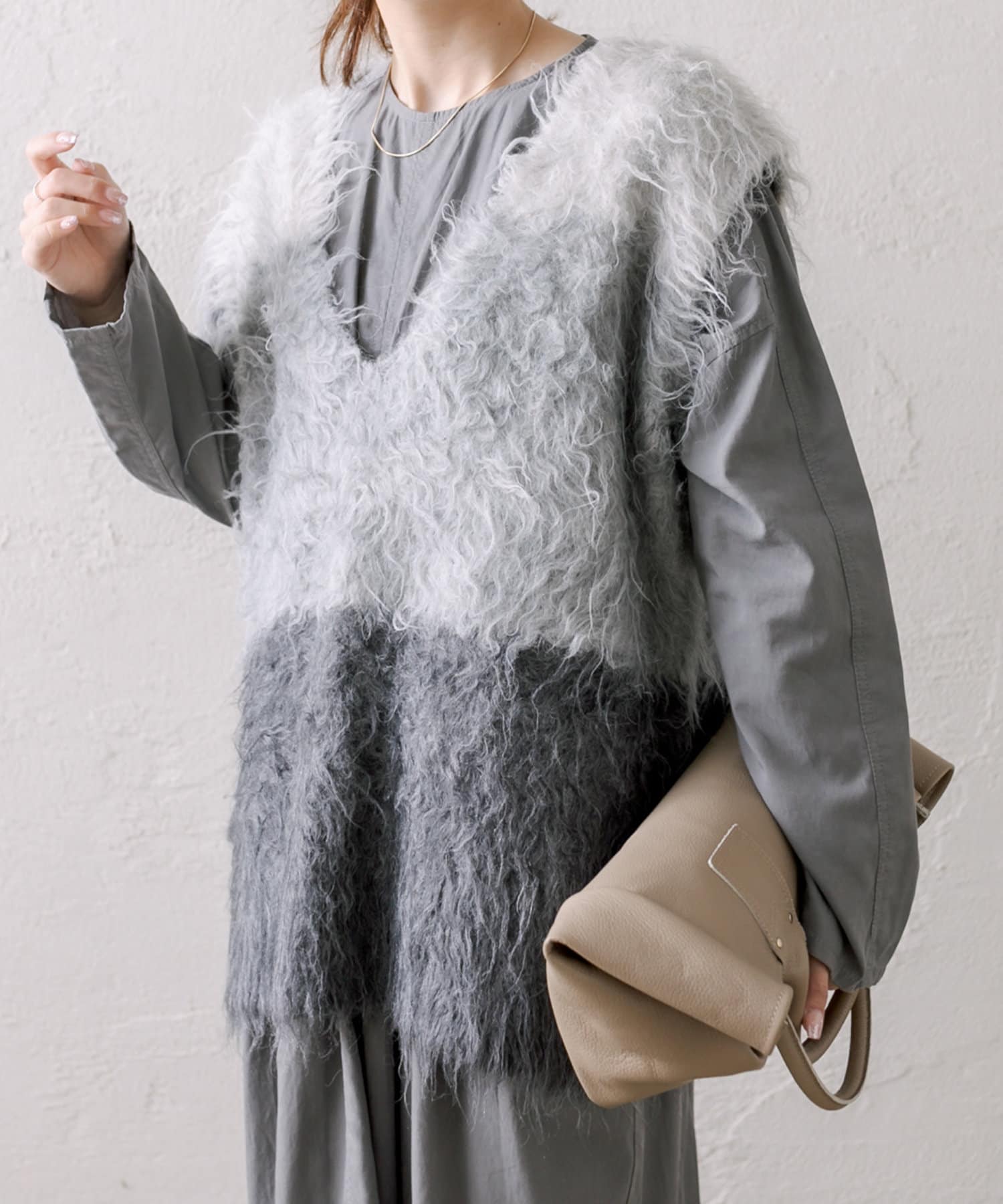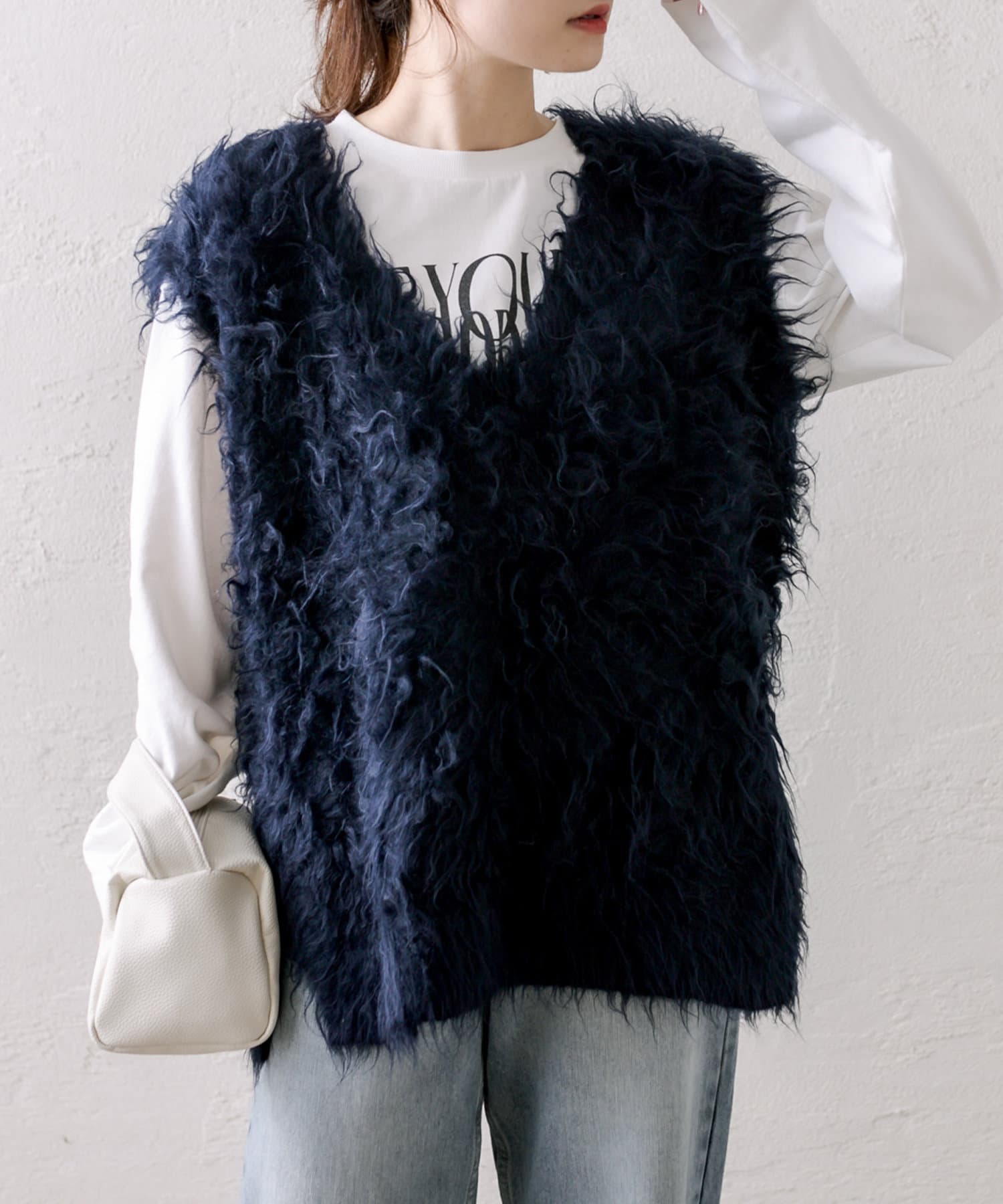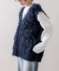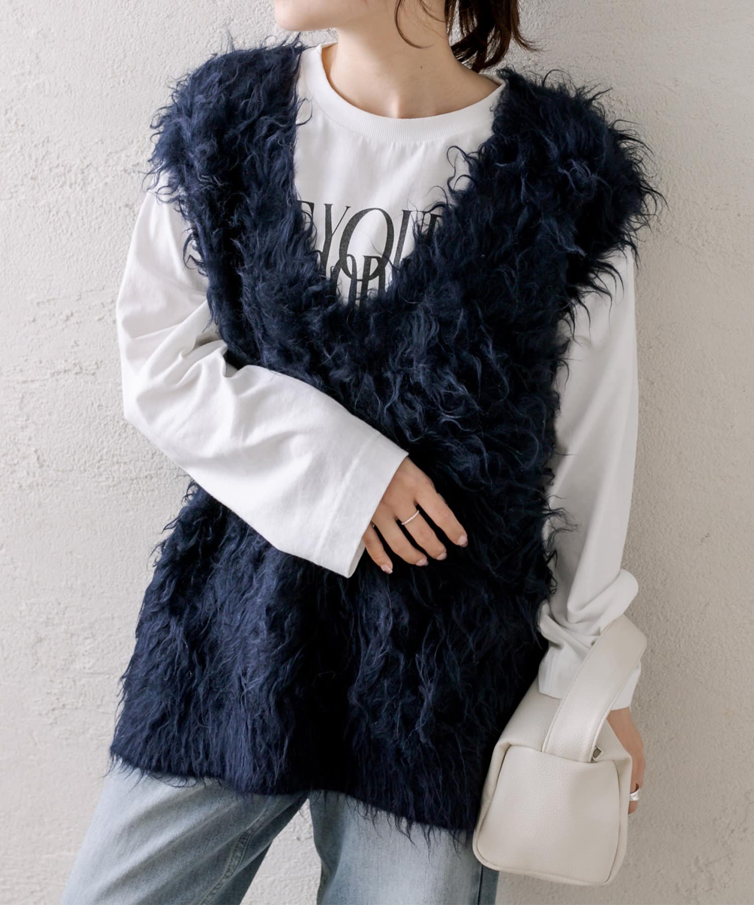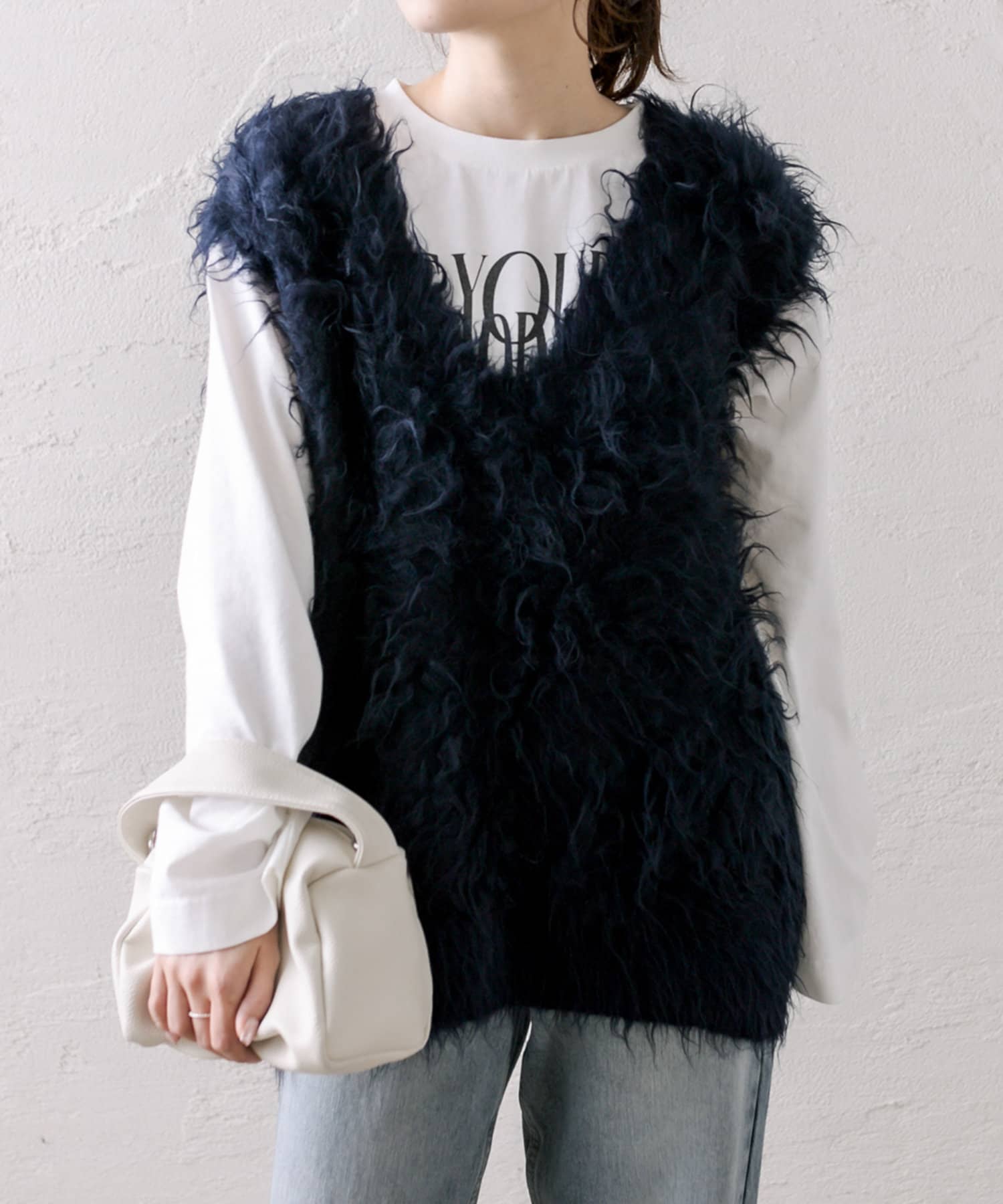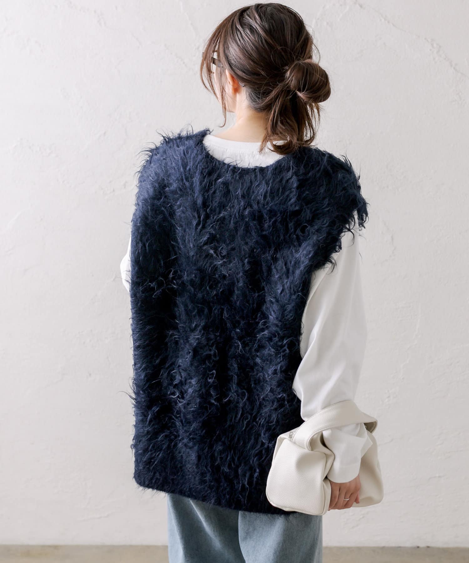ボリューム感のある毛並みが1枚で華やかに決まるニットベスト。