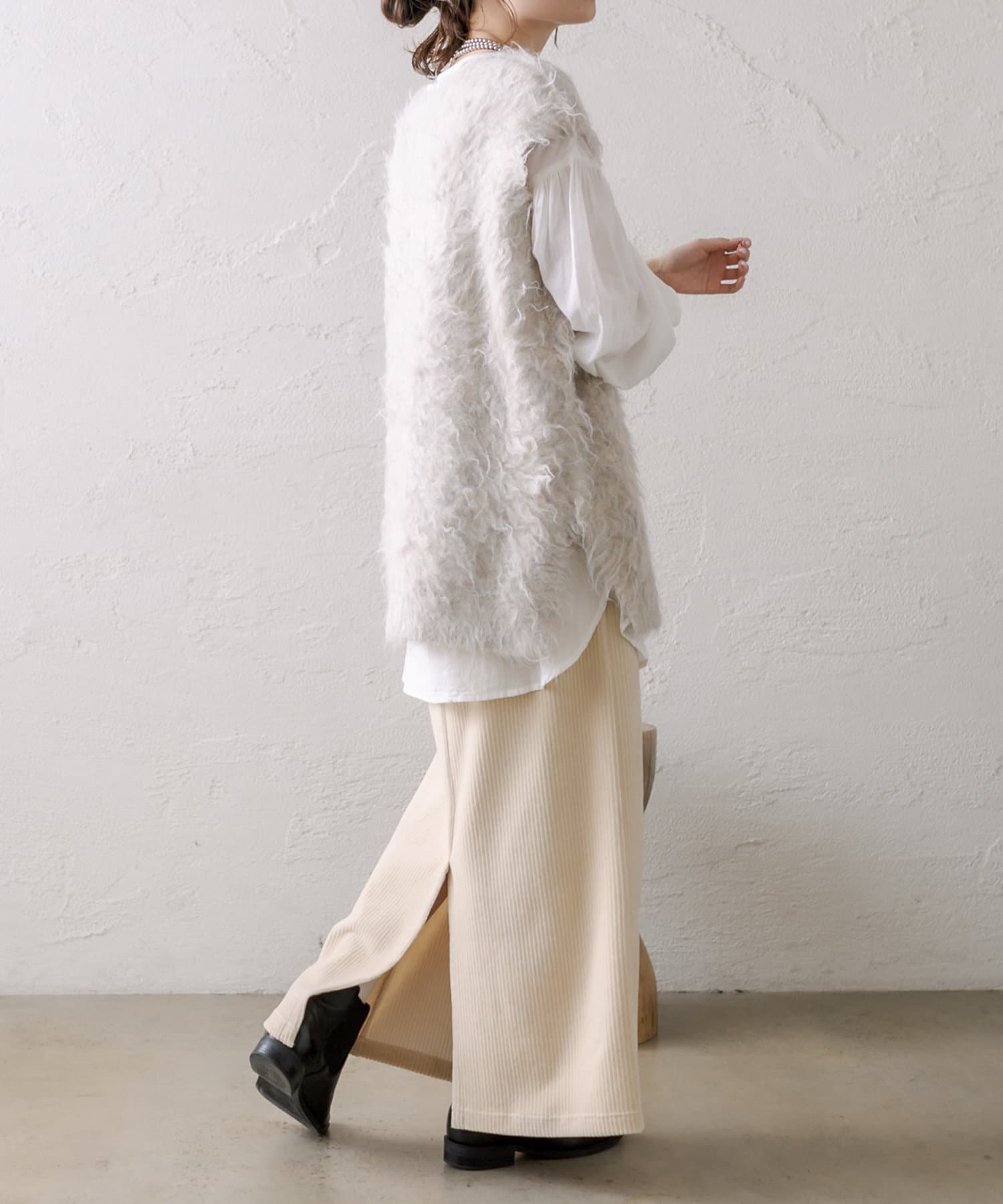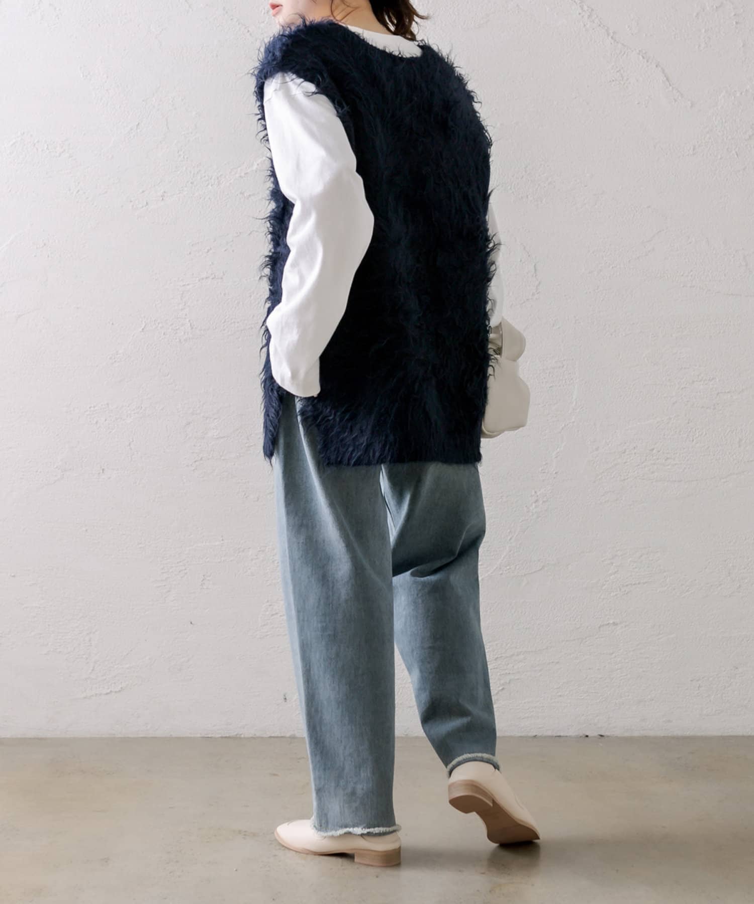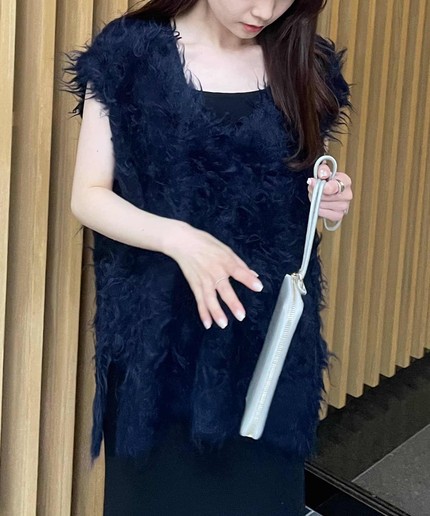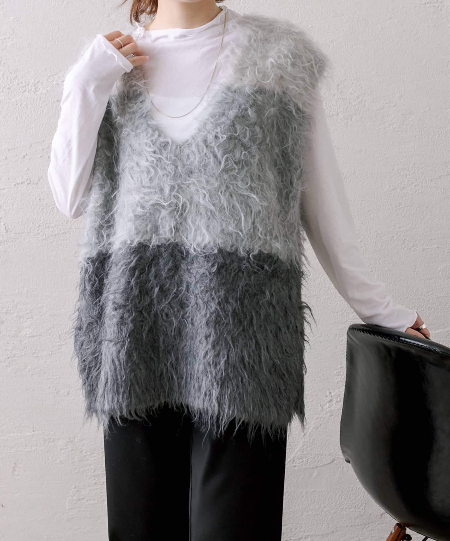 ボリューム感のある毛並みが1枚で華やかに決まるニットベスト。