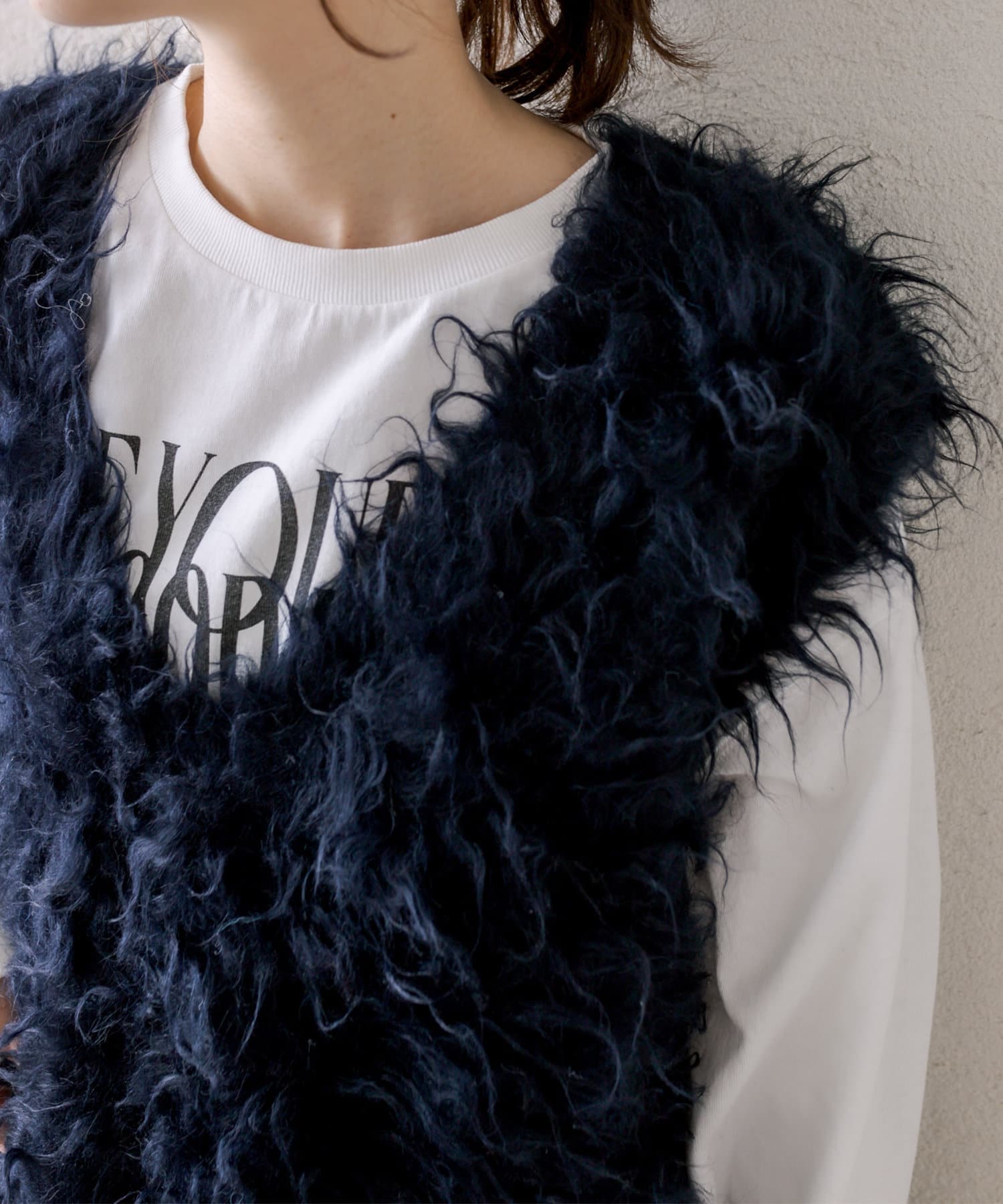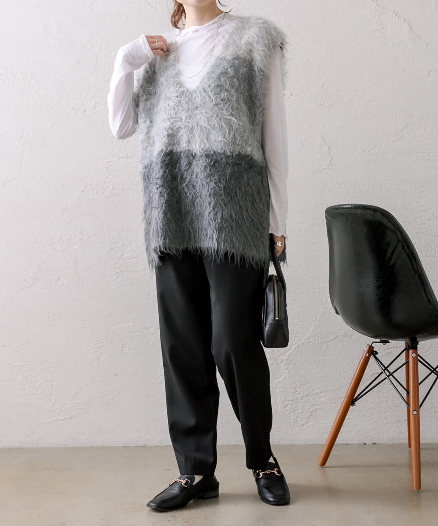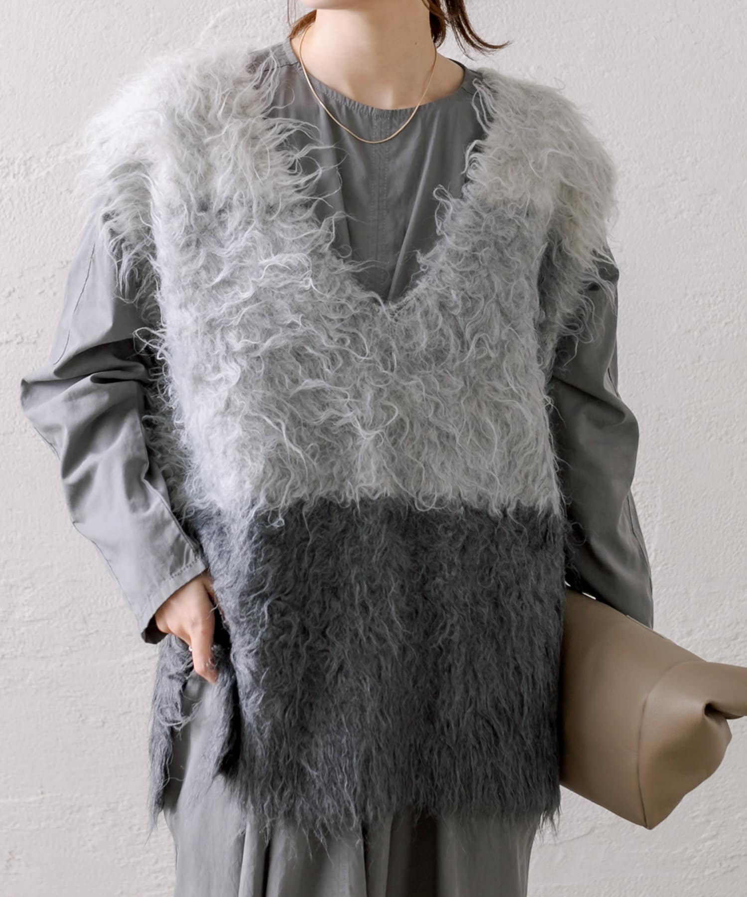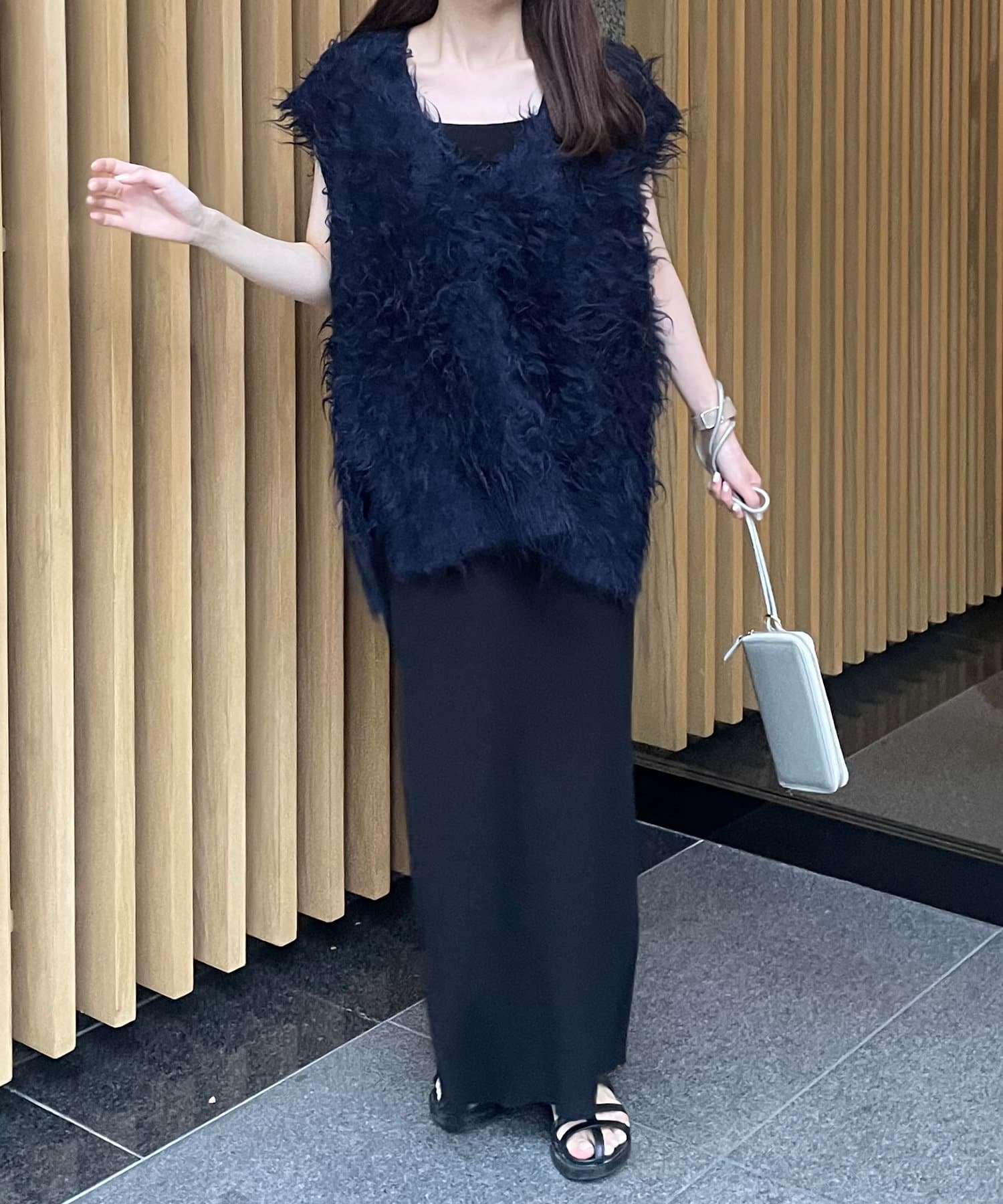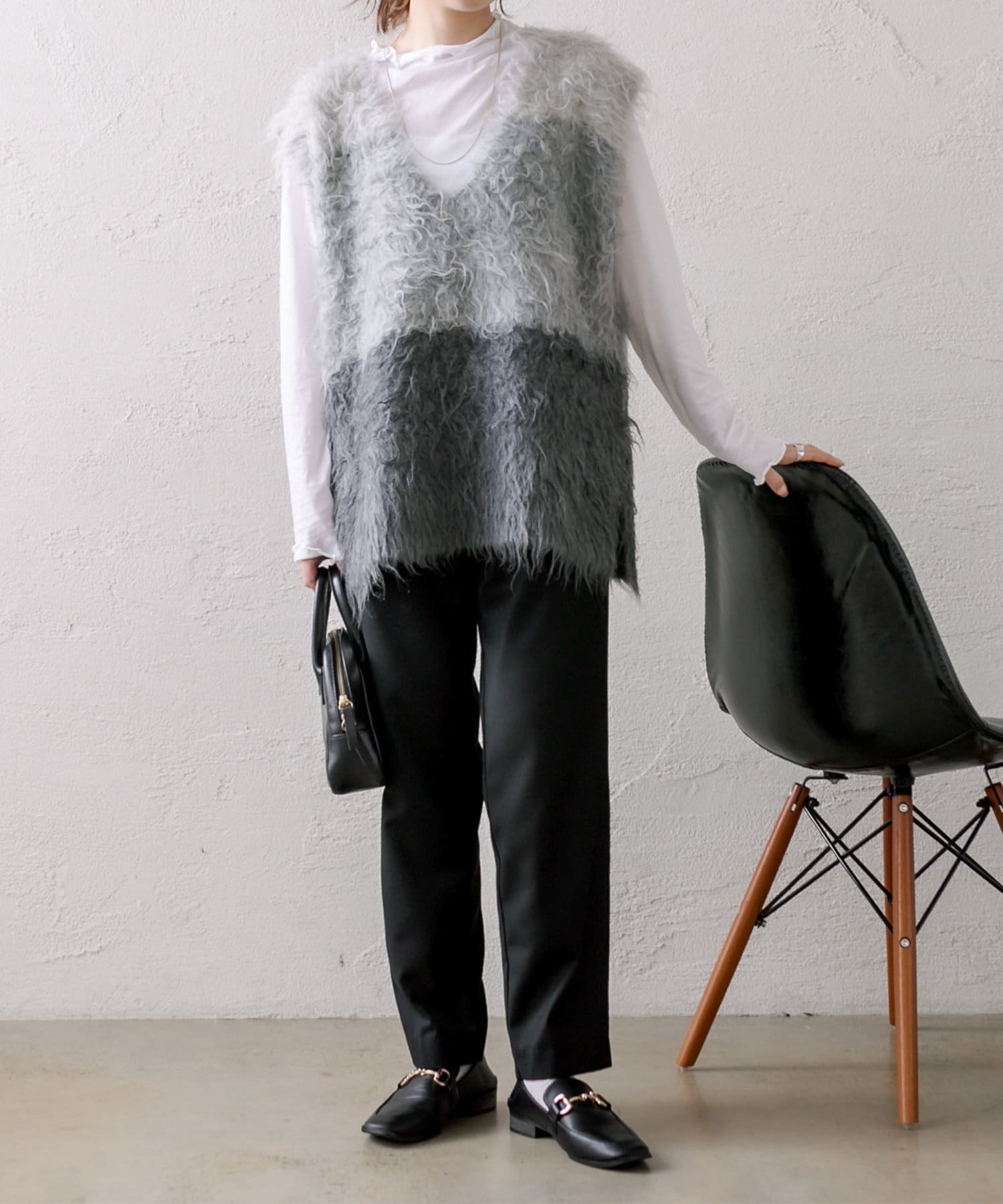 ボリューム感のある毛並みが1枚で華やかに決まるニットベスト。
