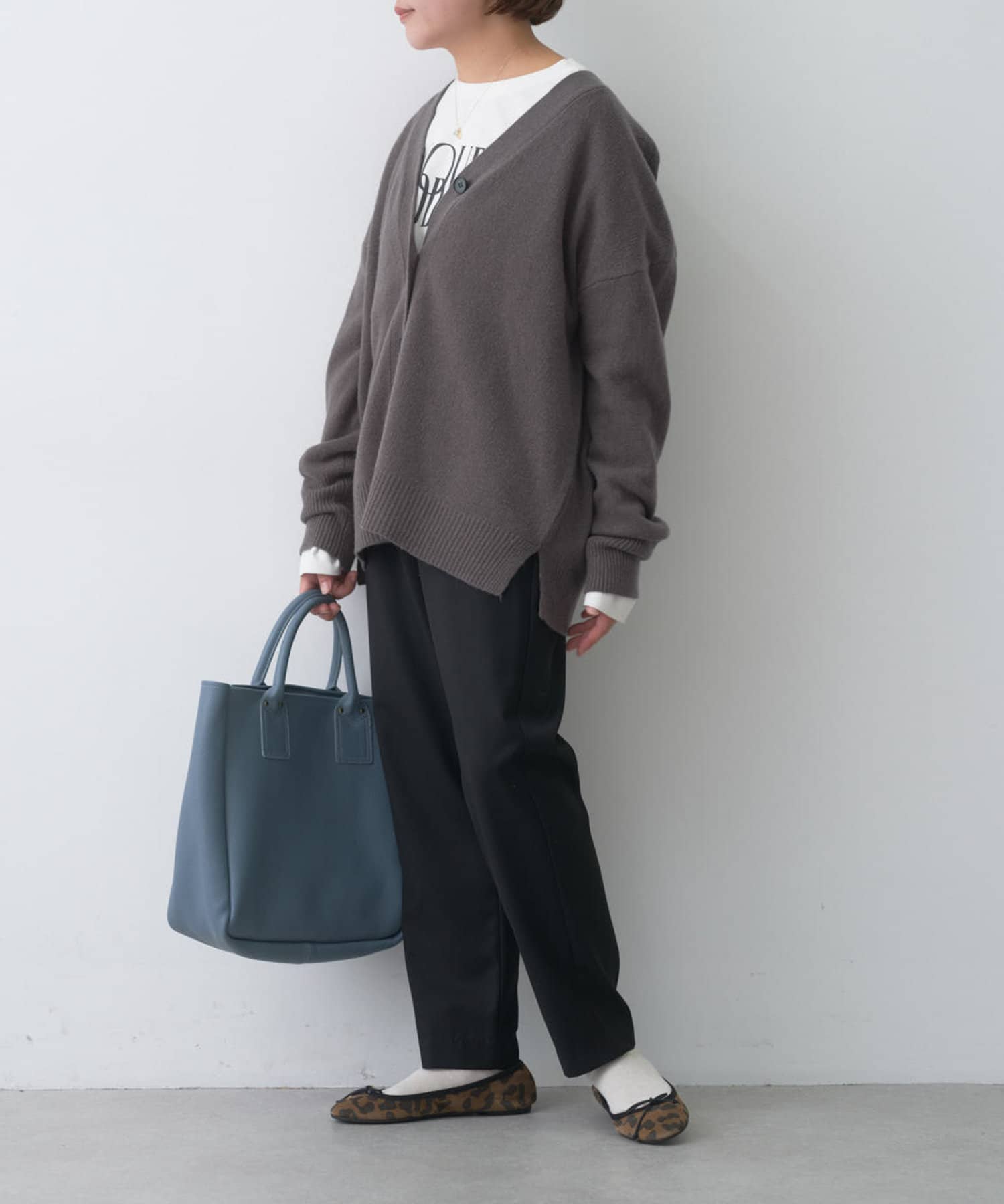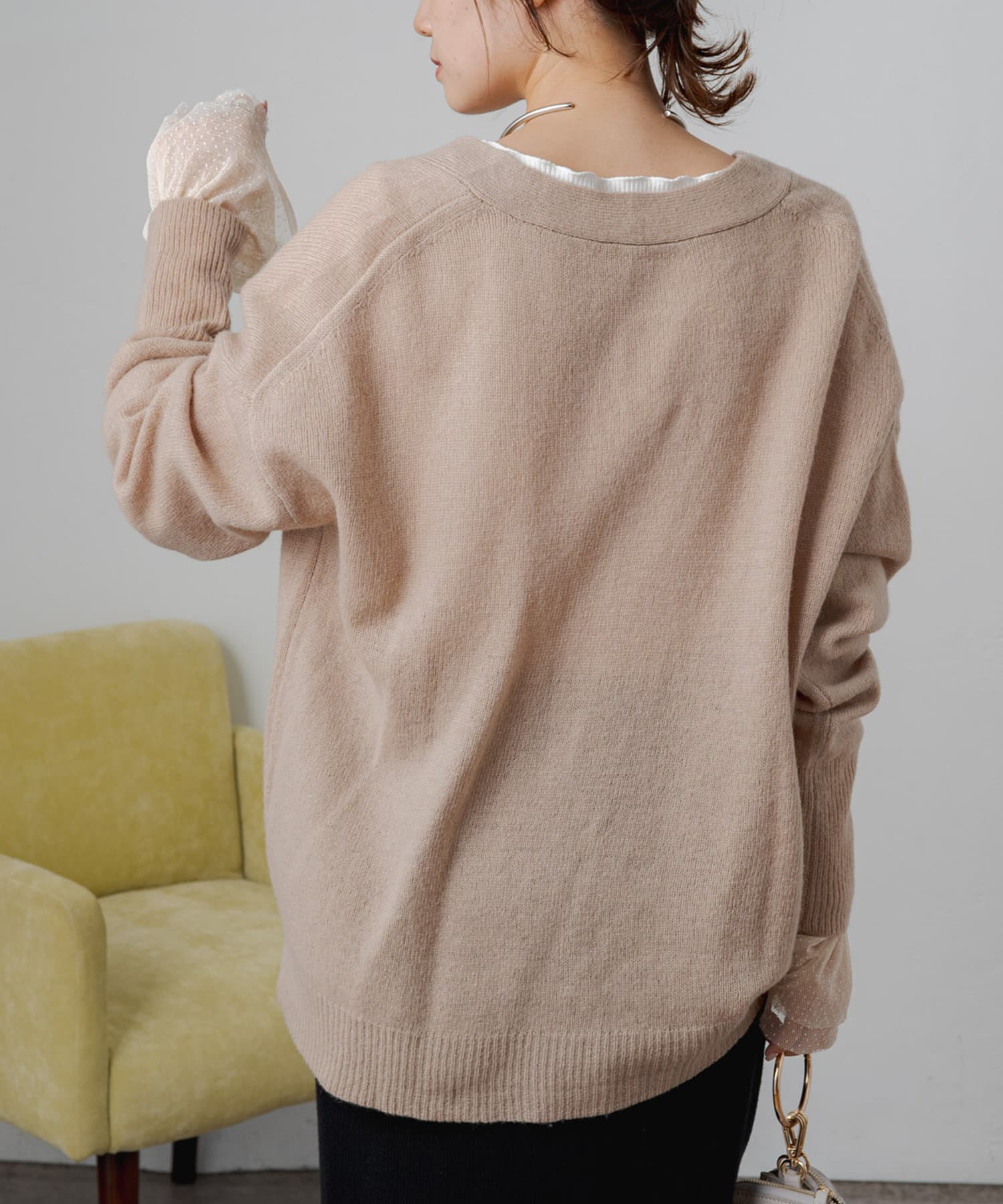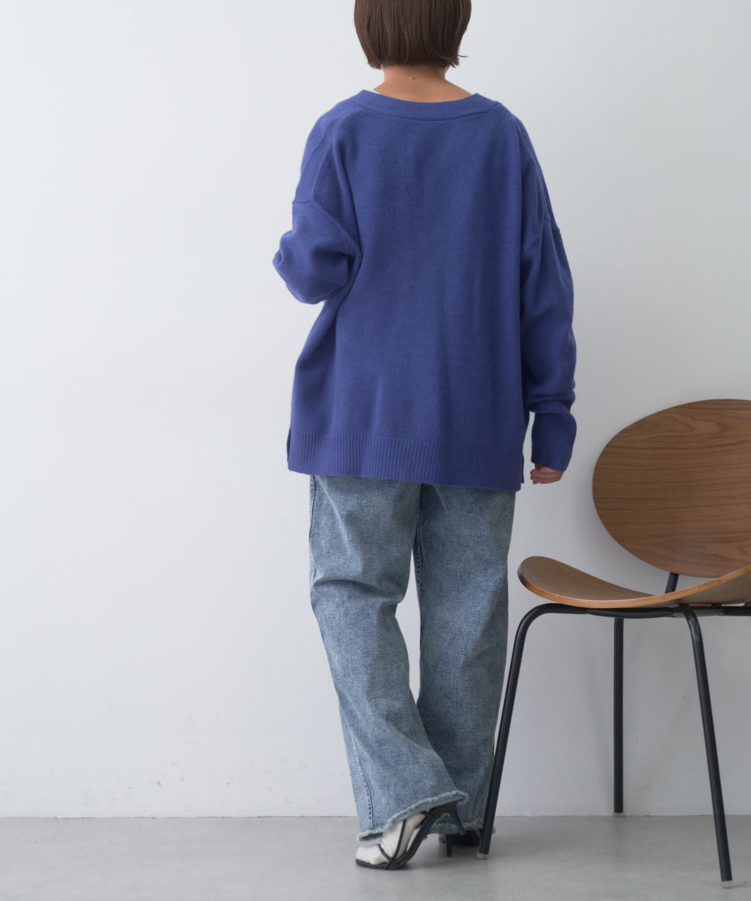 程よくゆとりのあるシルエットながら、Vネックデザインがすっきりとした印象に。