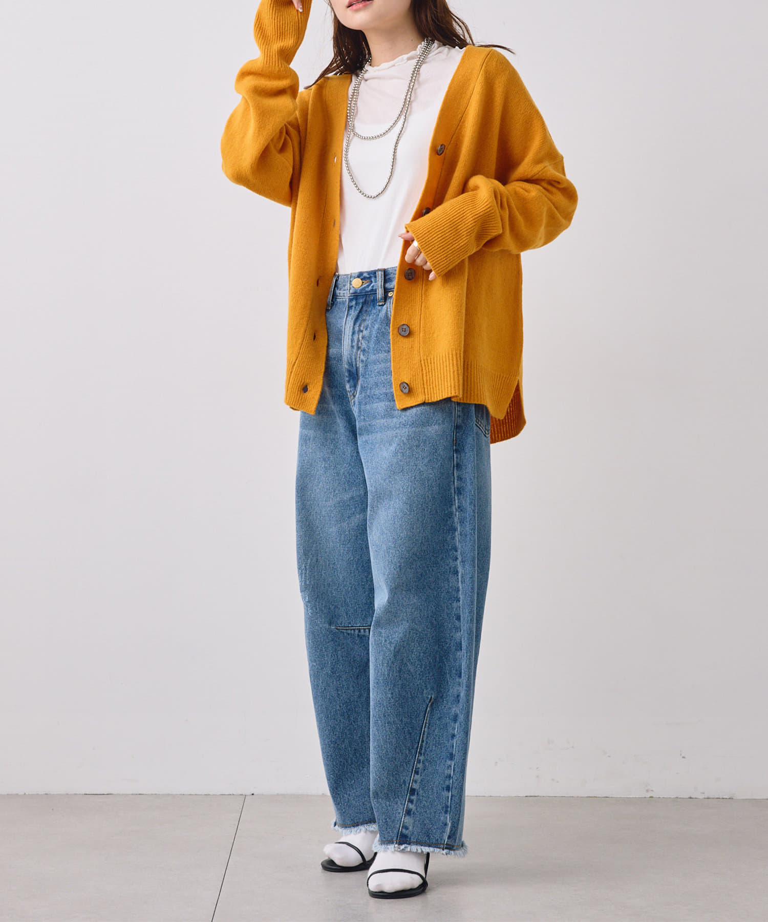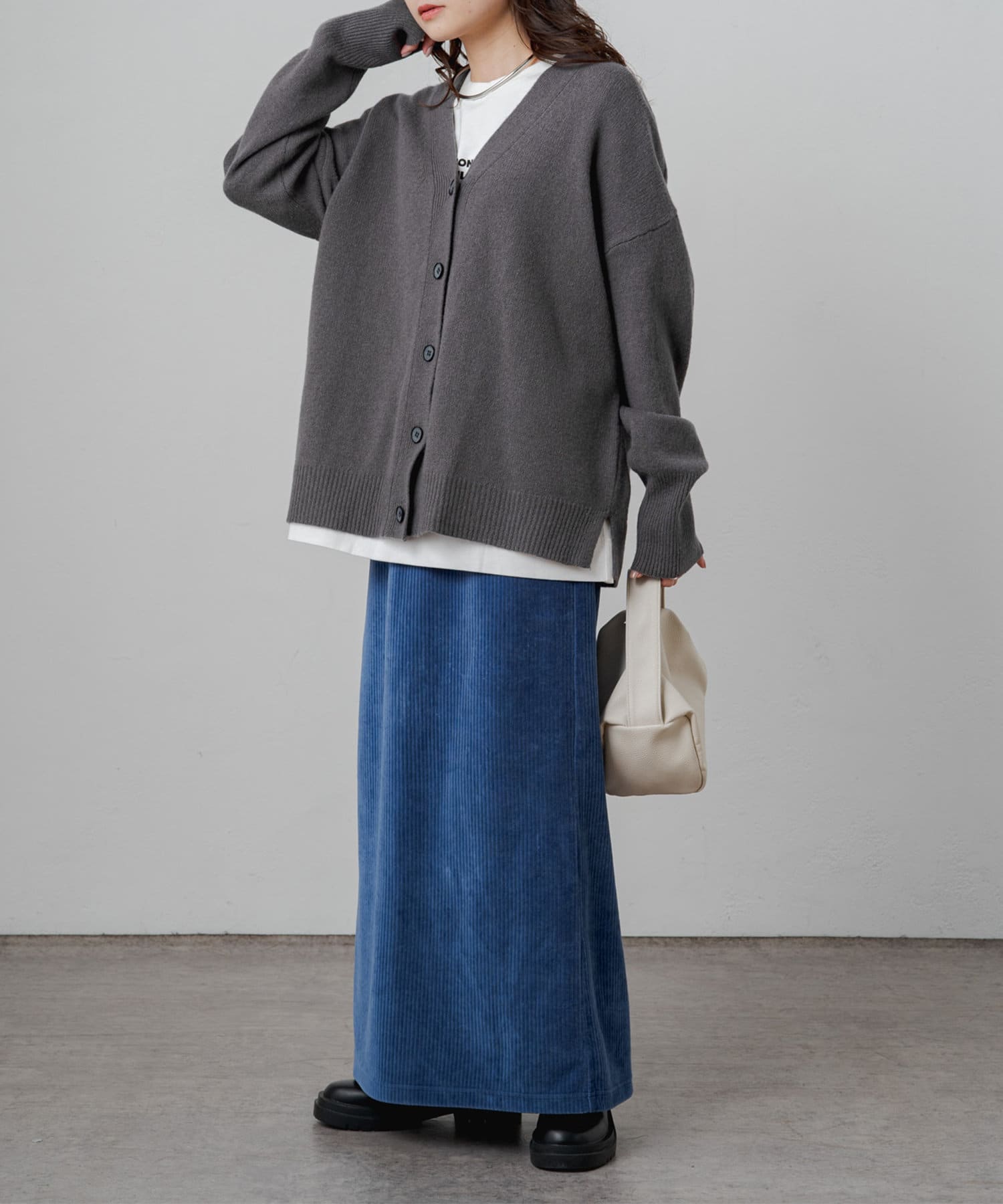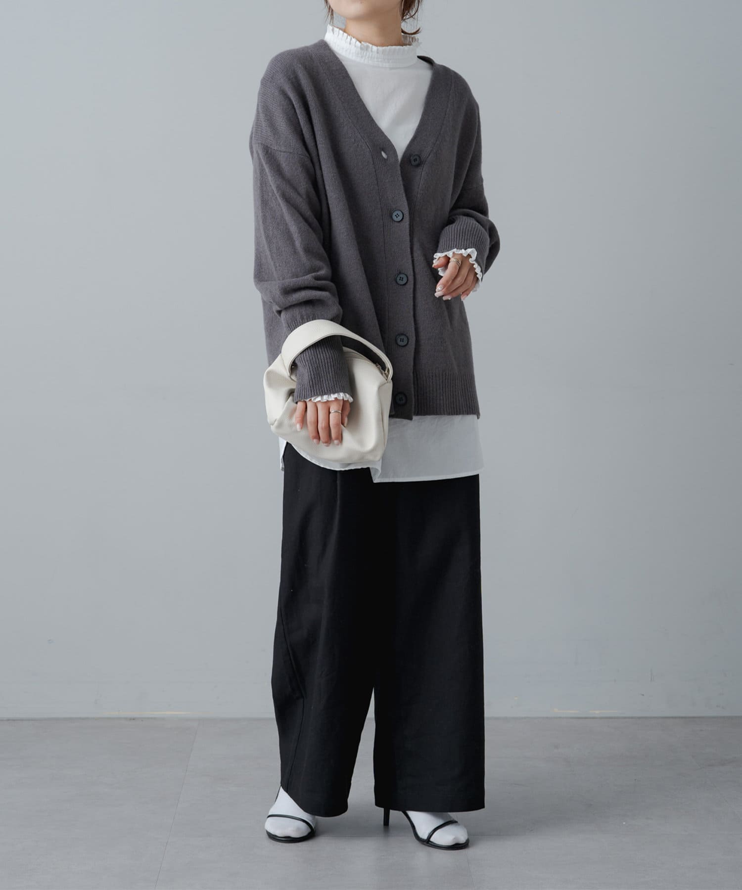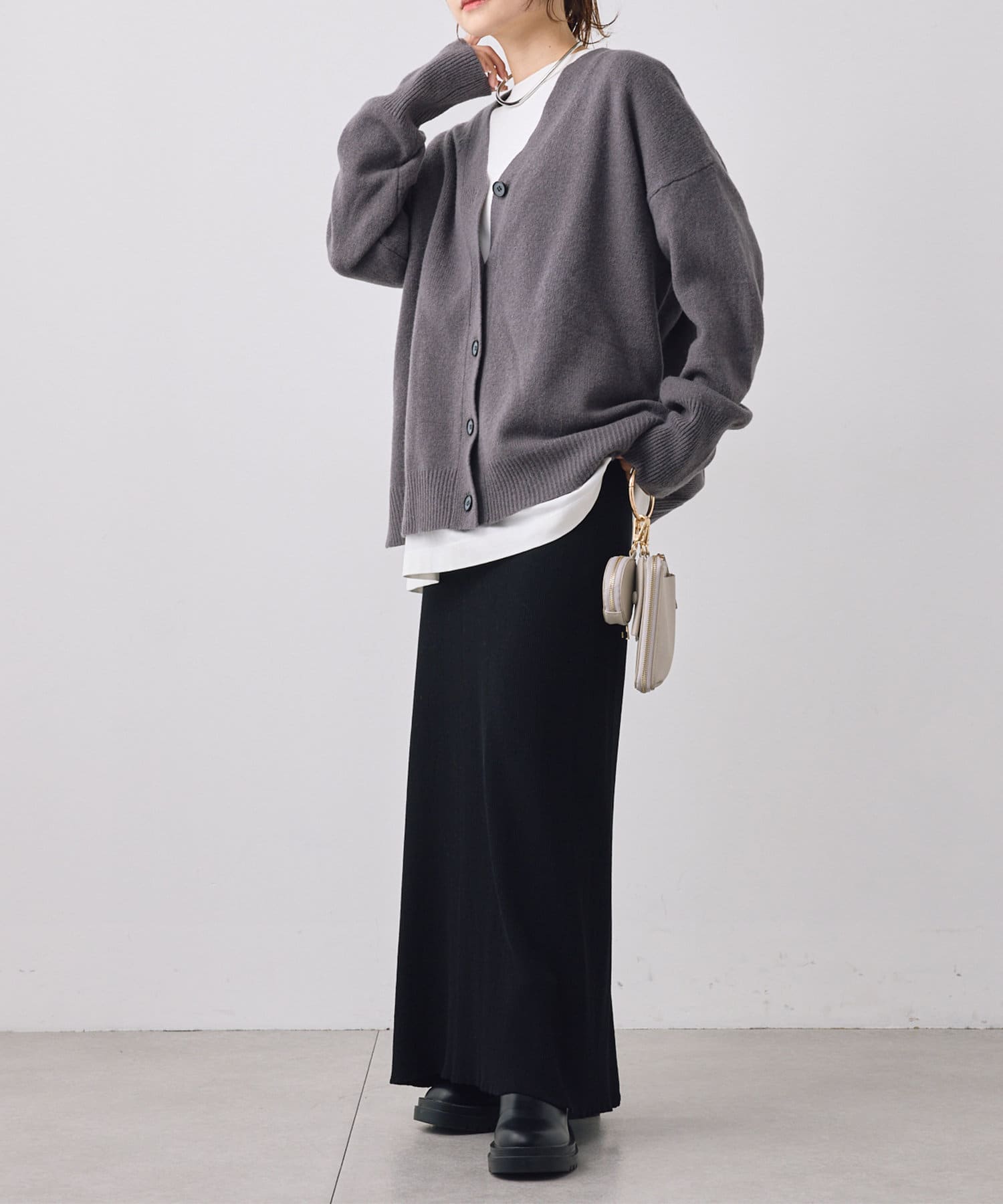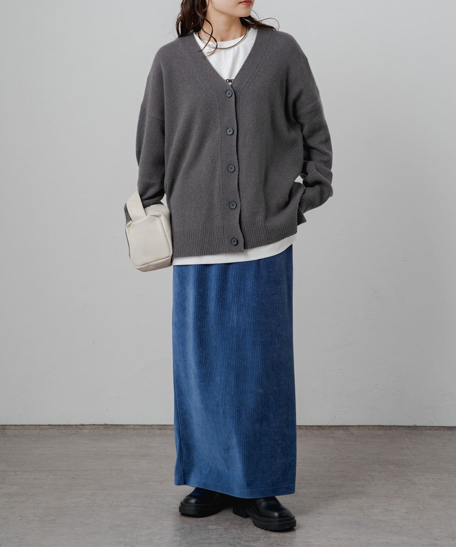 着まわしの効く丈感は、パンツからスカートまで様々なボトムと相性良く着ていただけます。