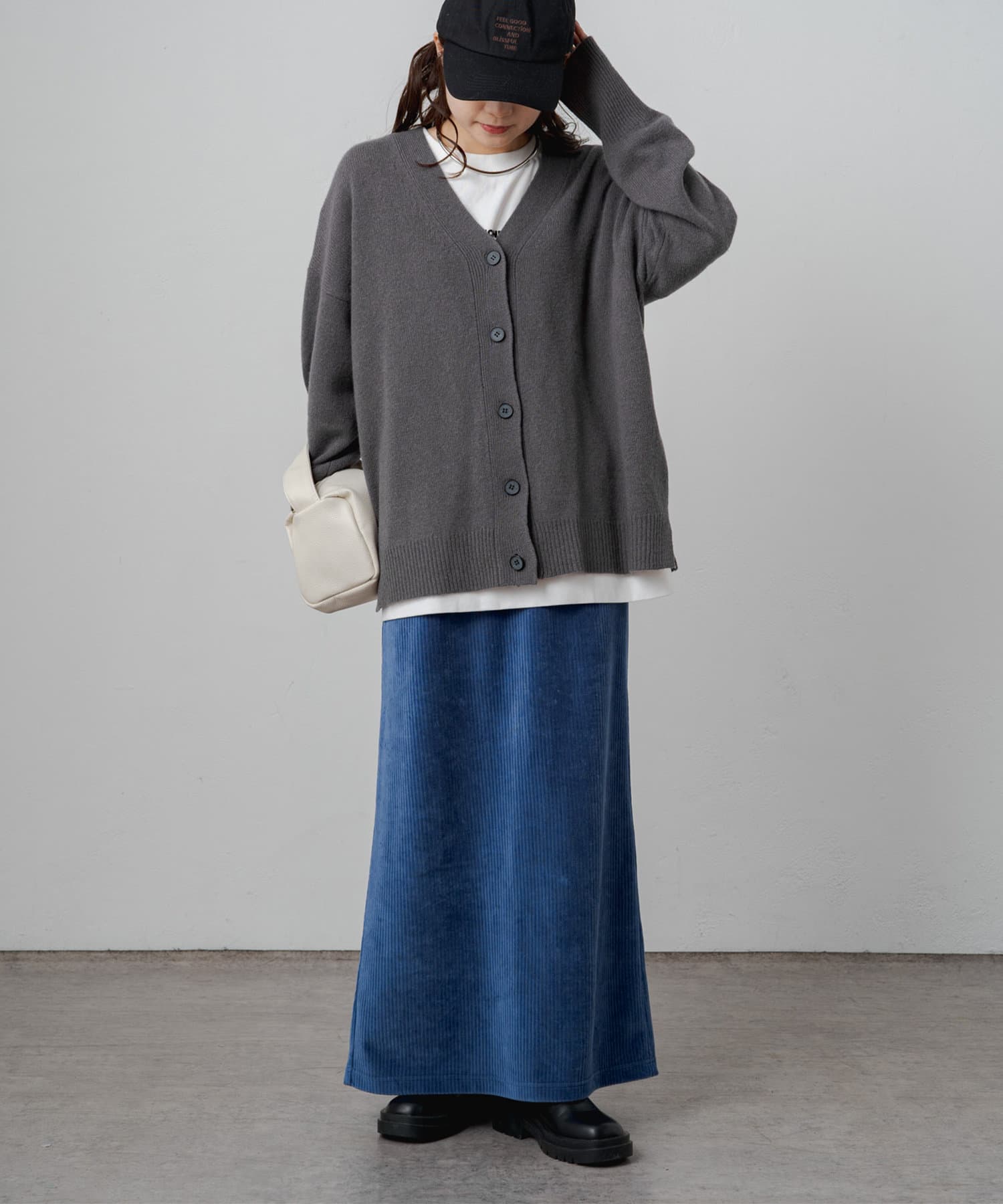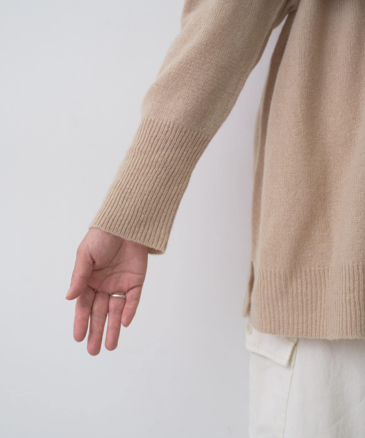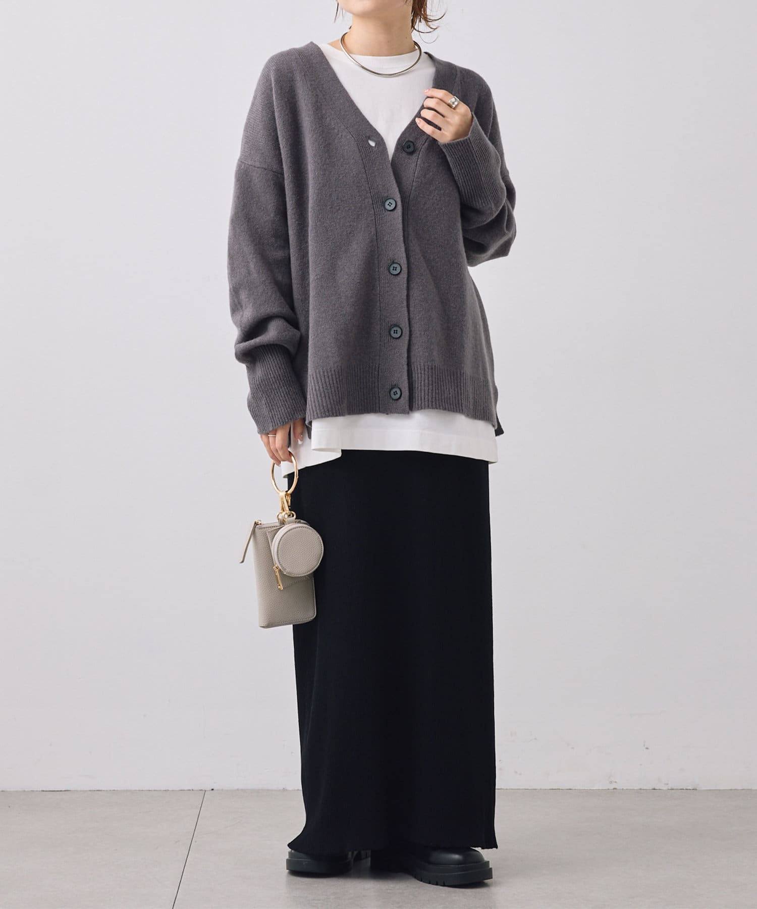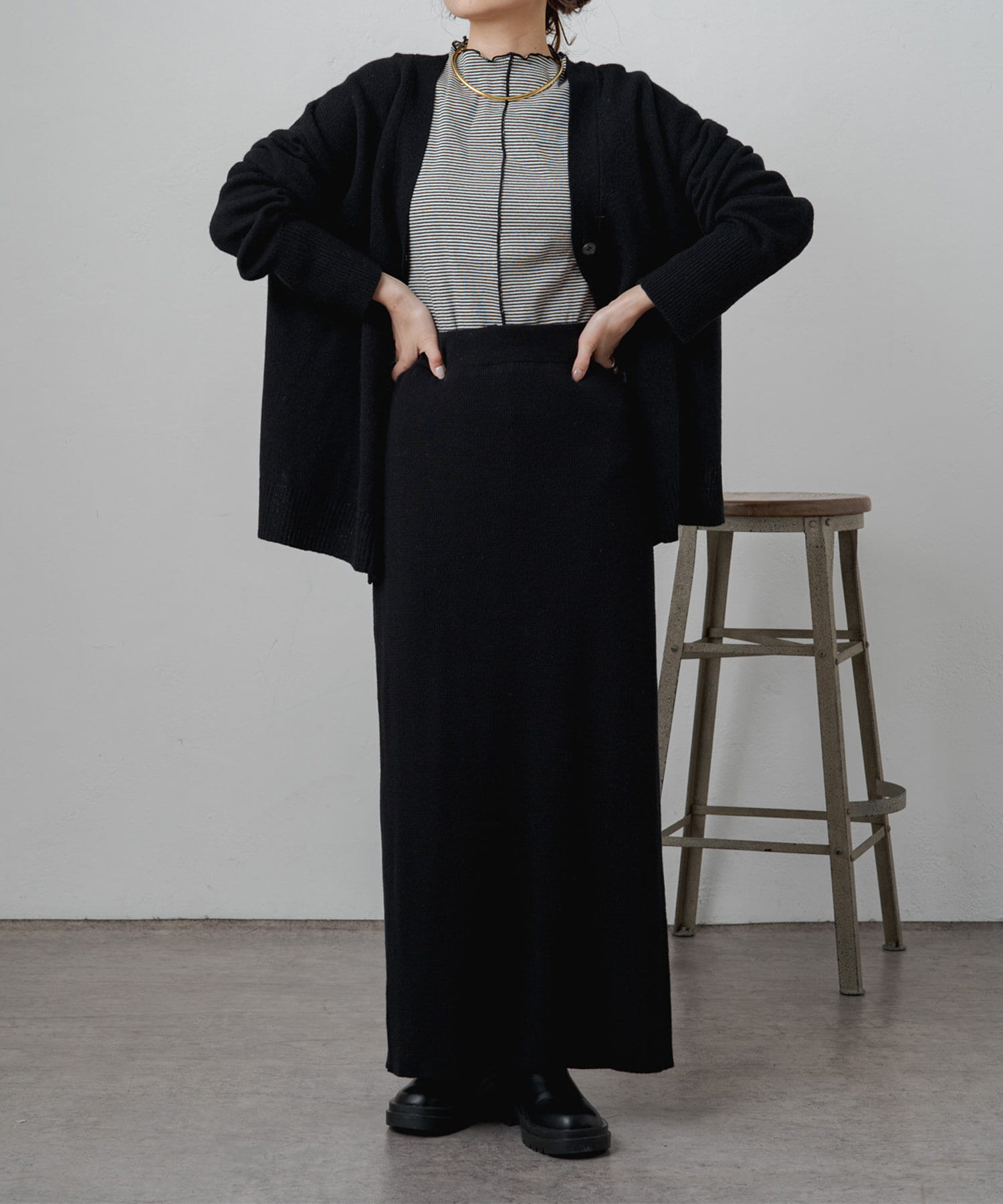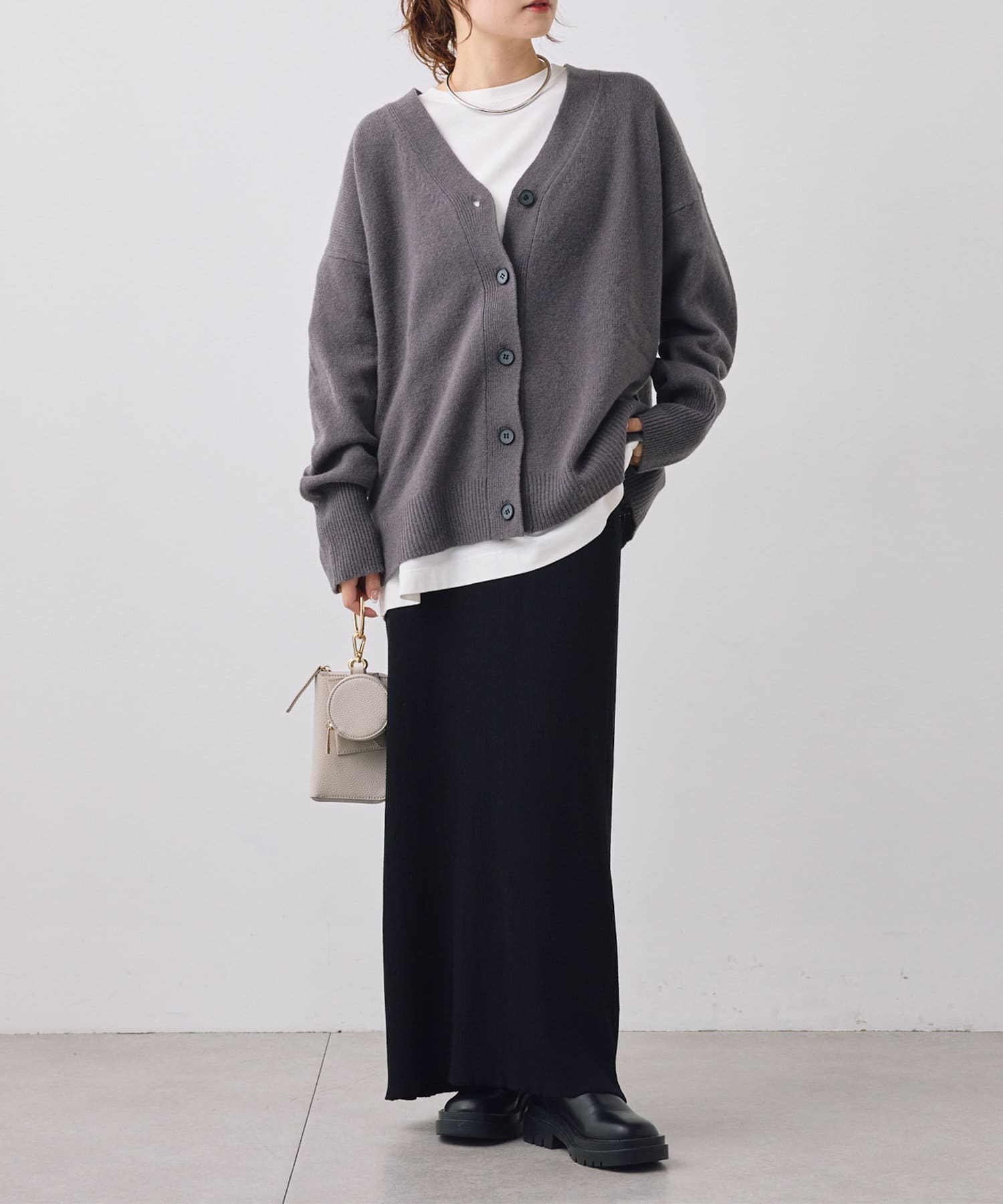 着まわしの効く丈感は、パンツからスカートまで様々なボトムと相性良く着ていただけます。