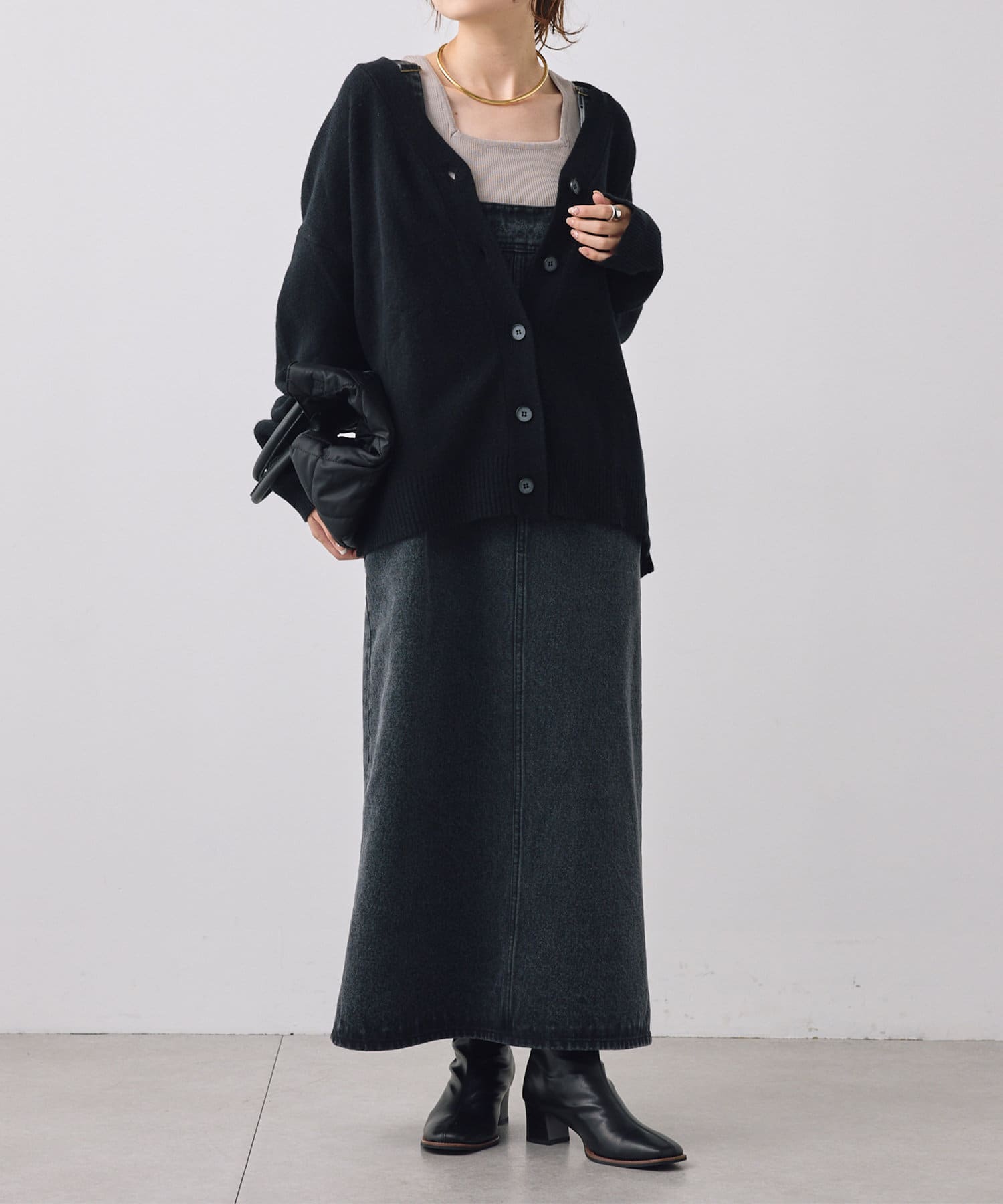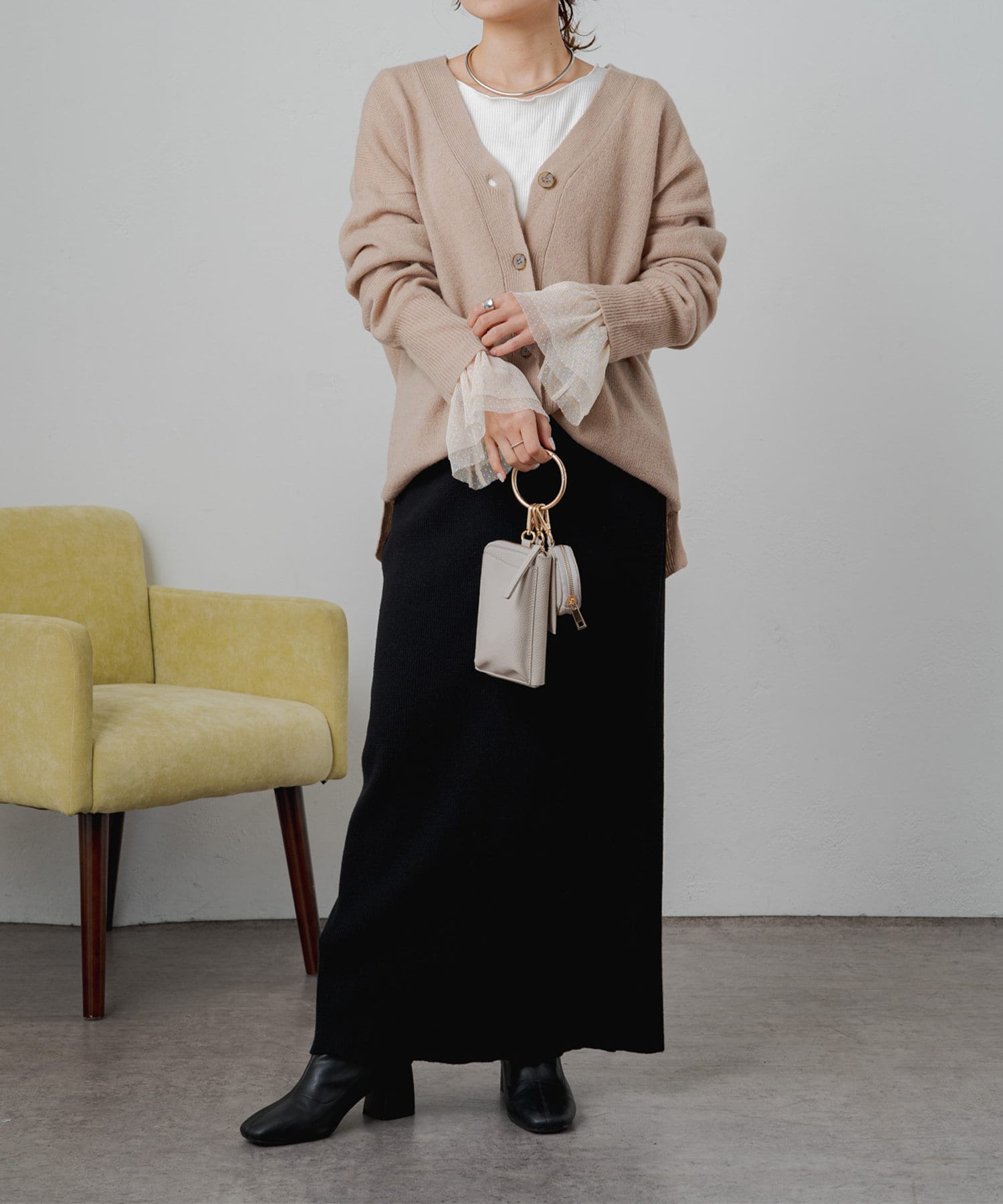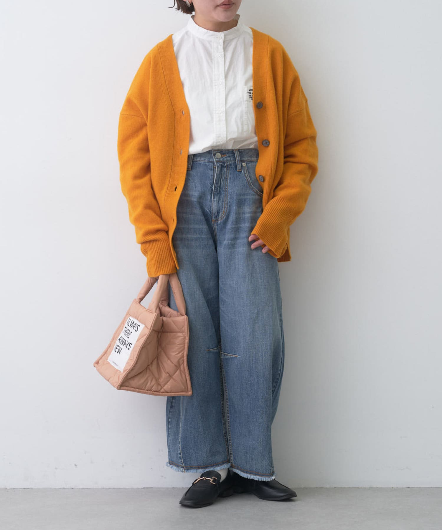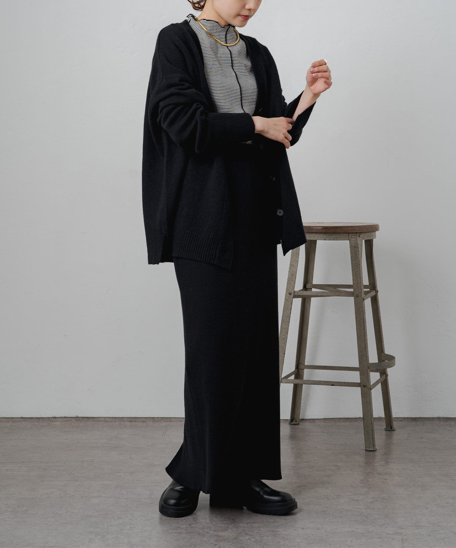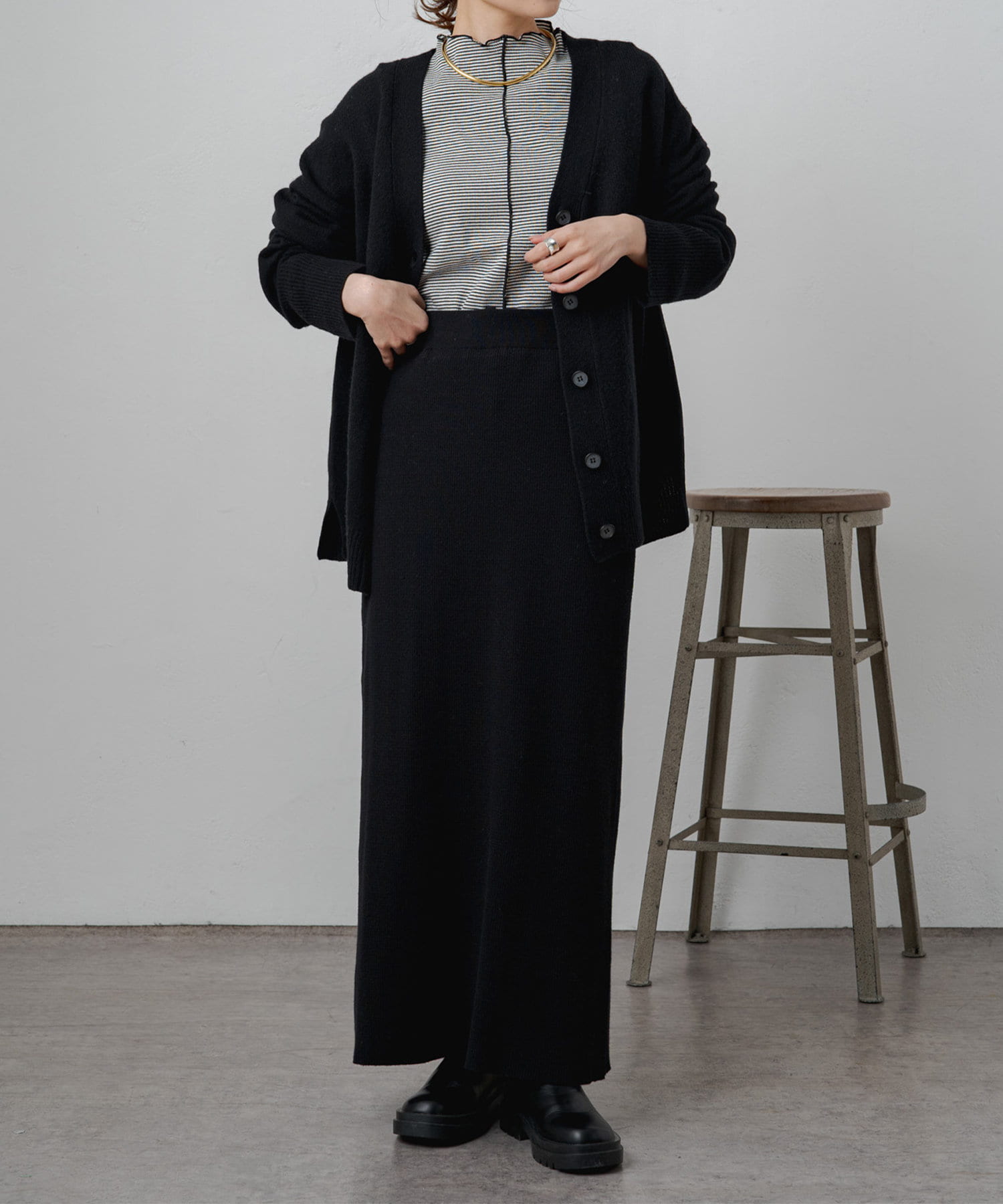 着まわしの効く丈感は、パンツからスカートまで様々なボトムと相性良く着ていただけます。
