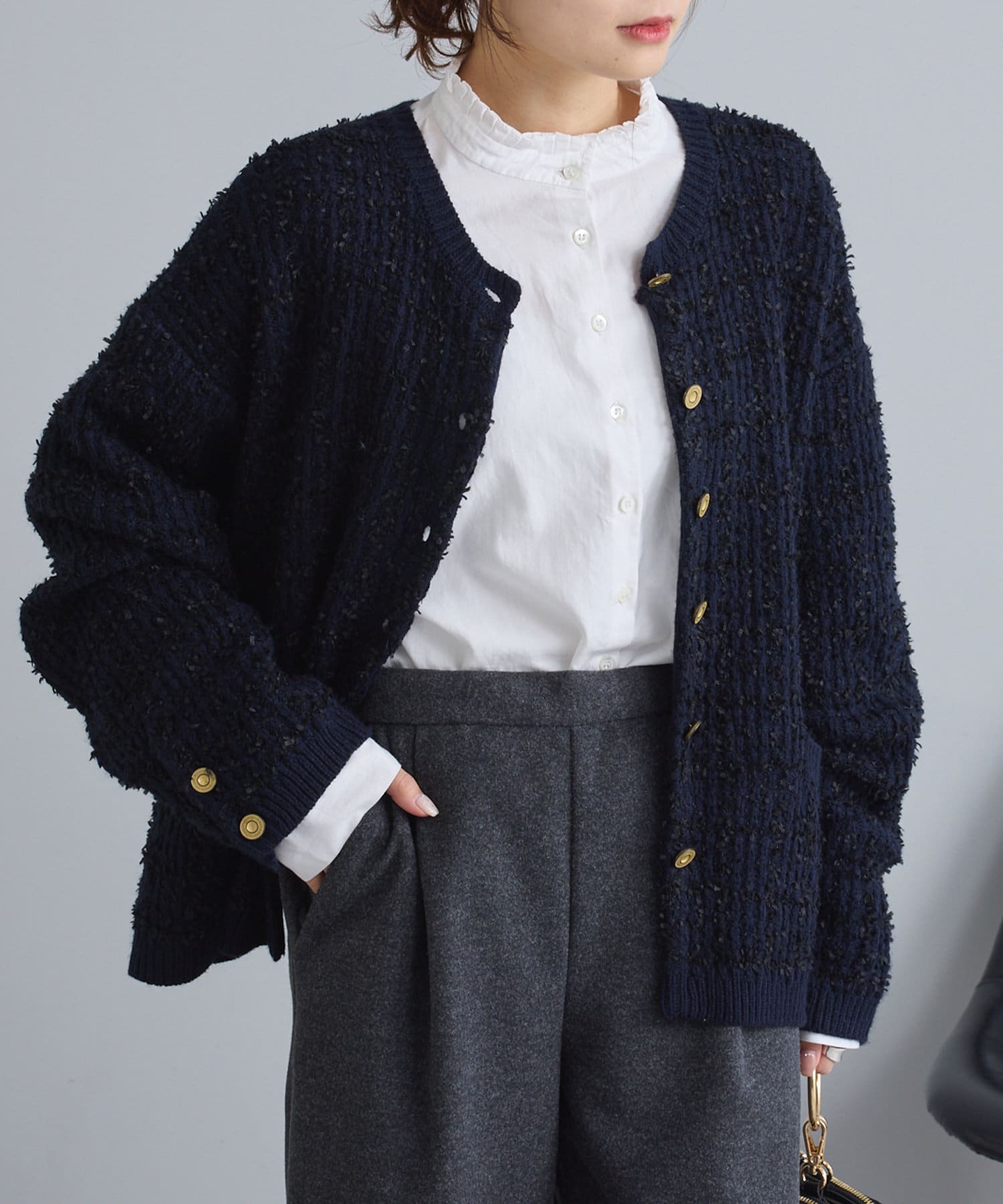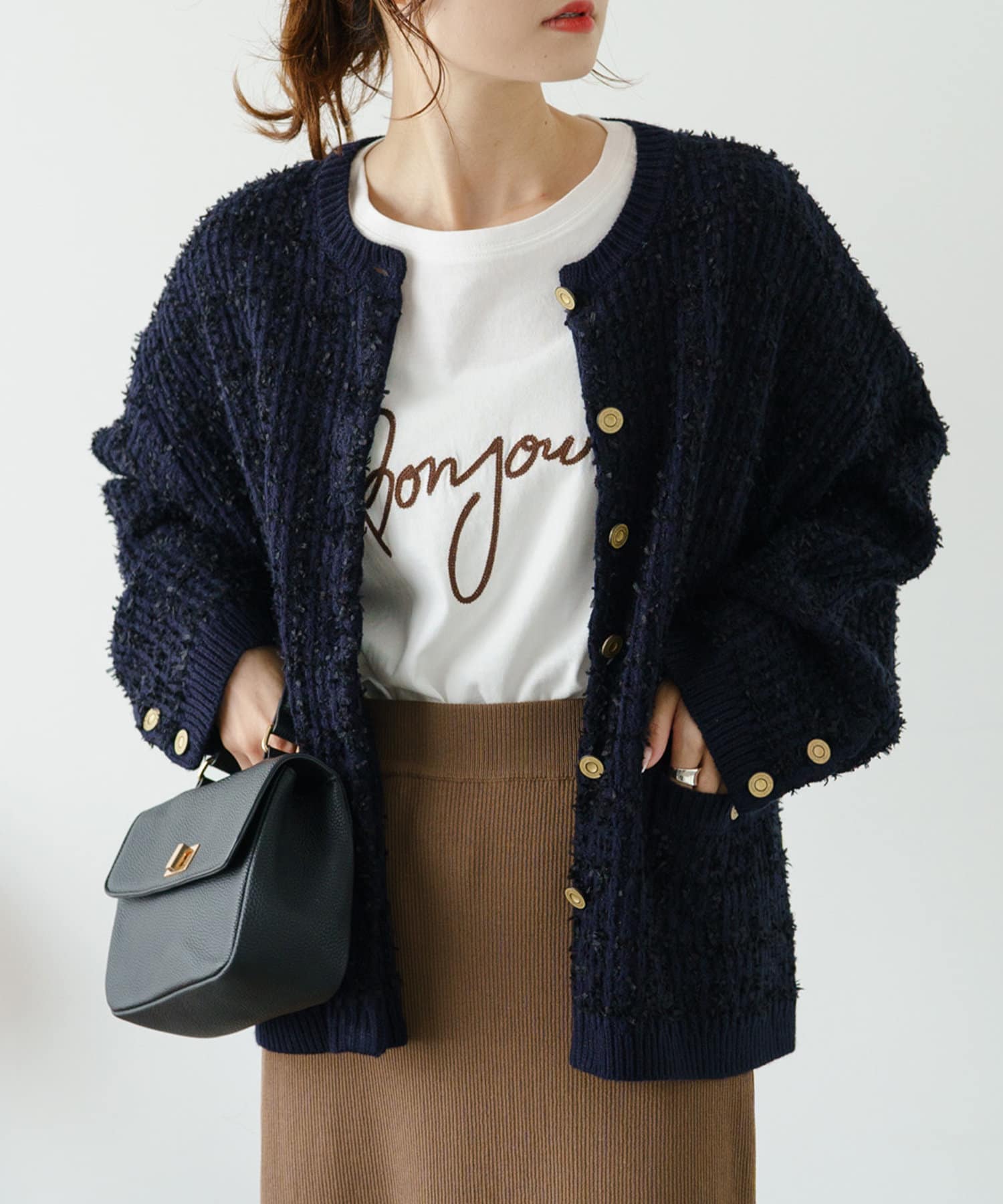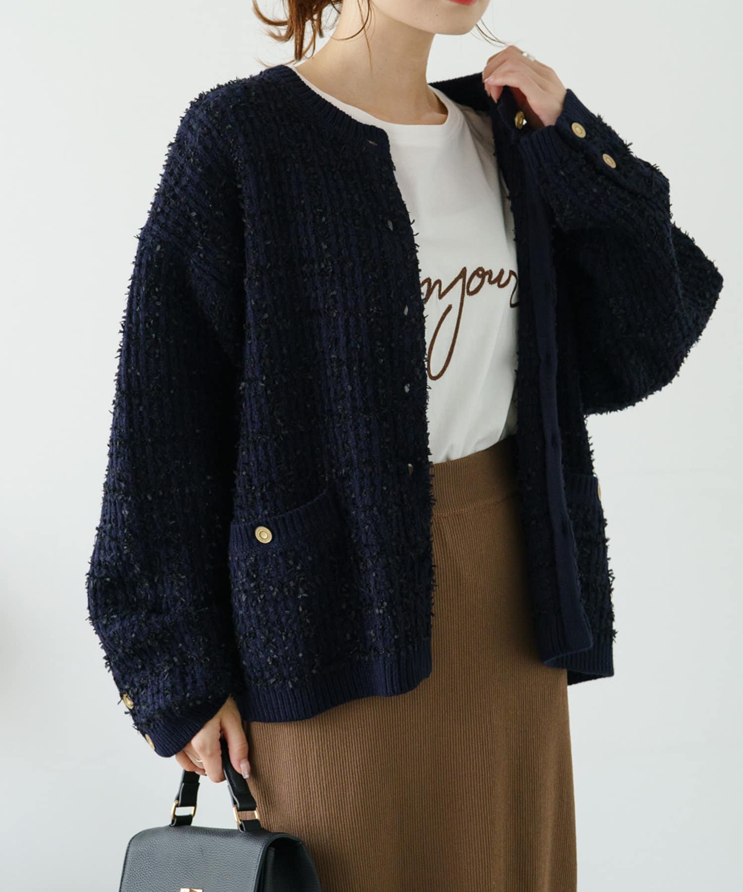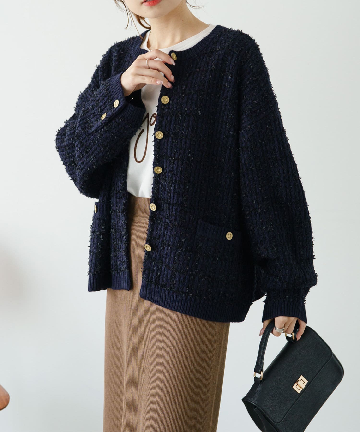 きれいめに仕上げてもサマになるツイードライクカーディガン。
