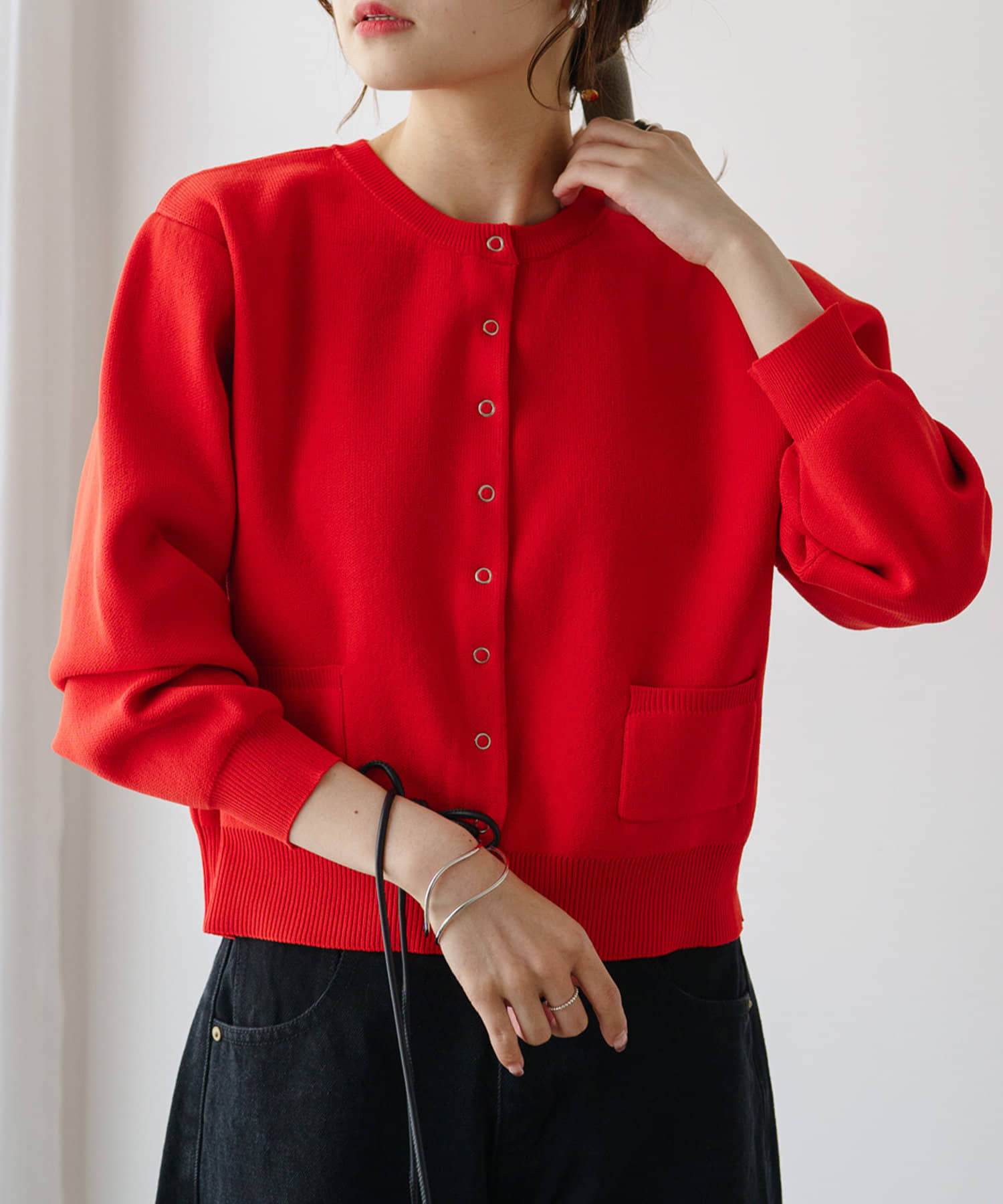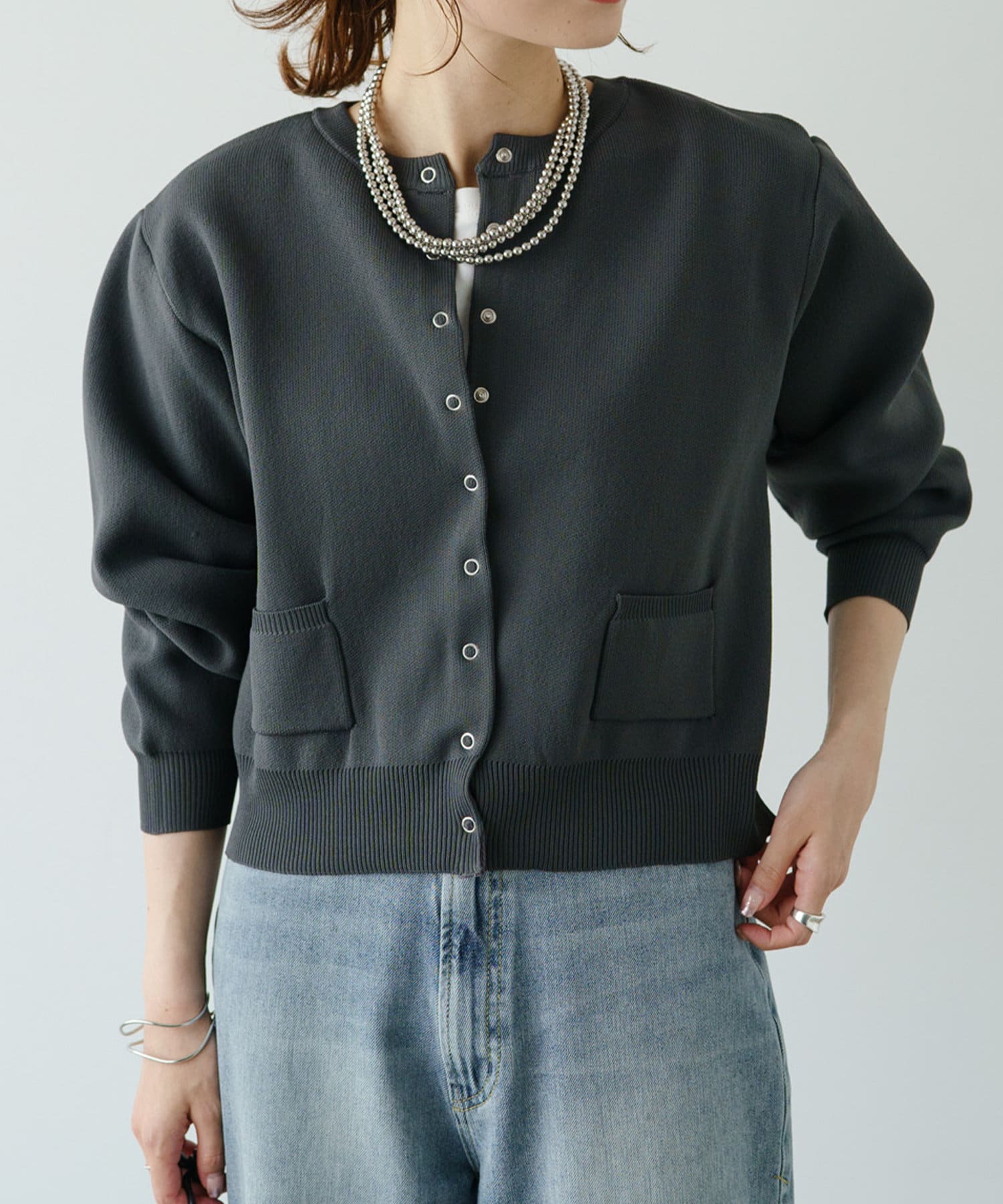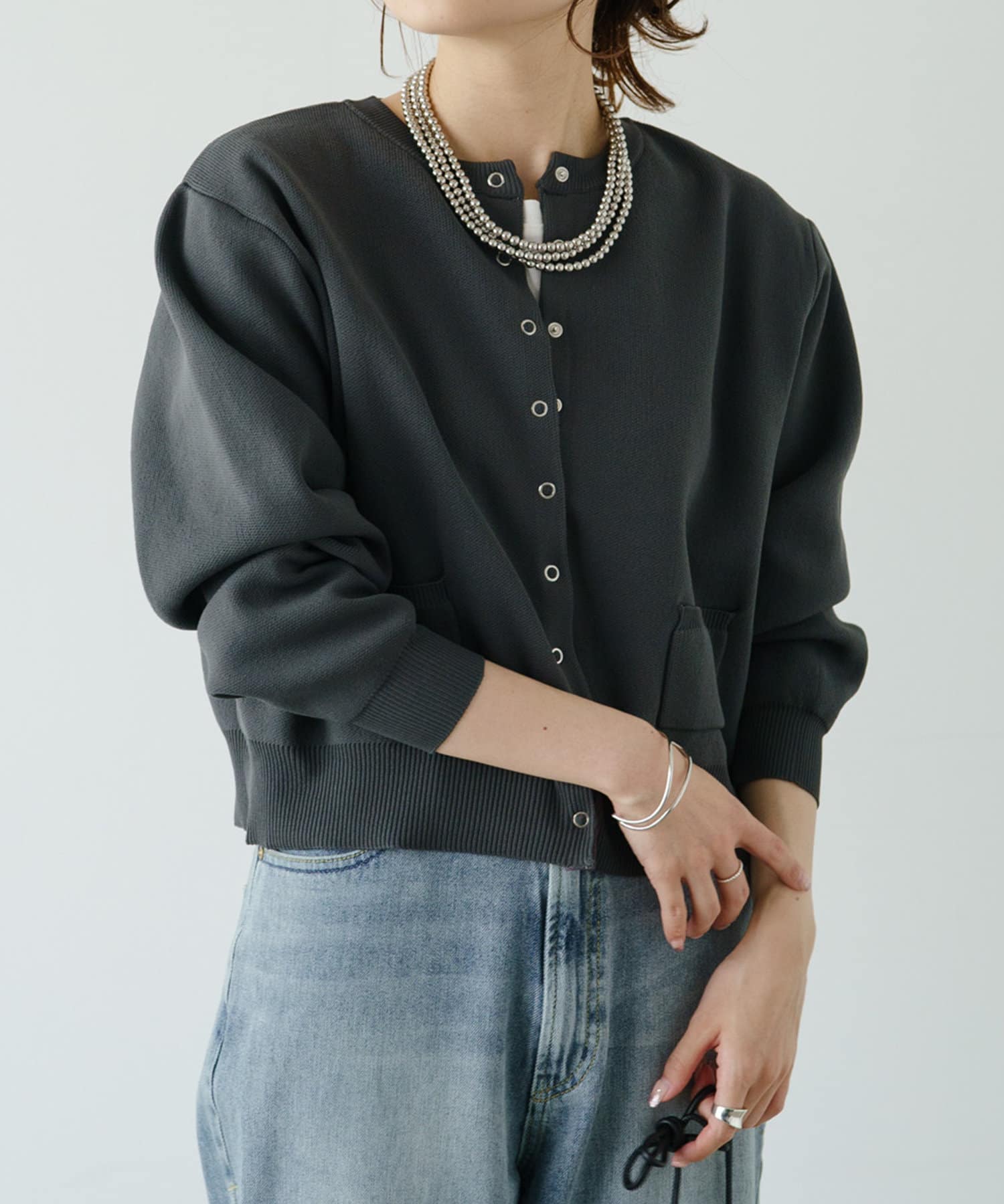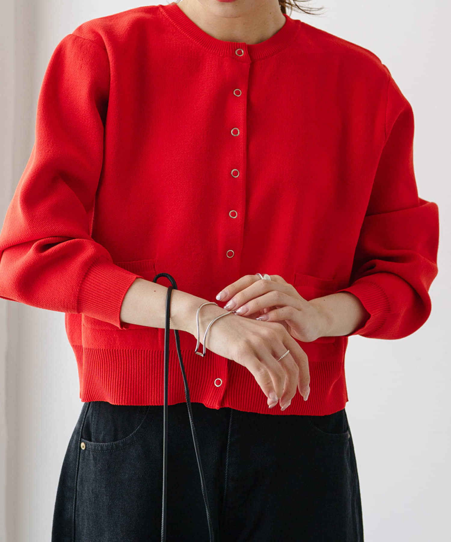 リングドットボタンとミニポケットがさりげないアクセントで目を惹くカーディガン。