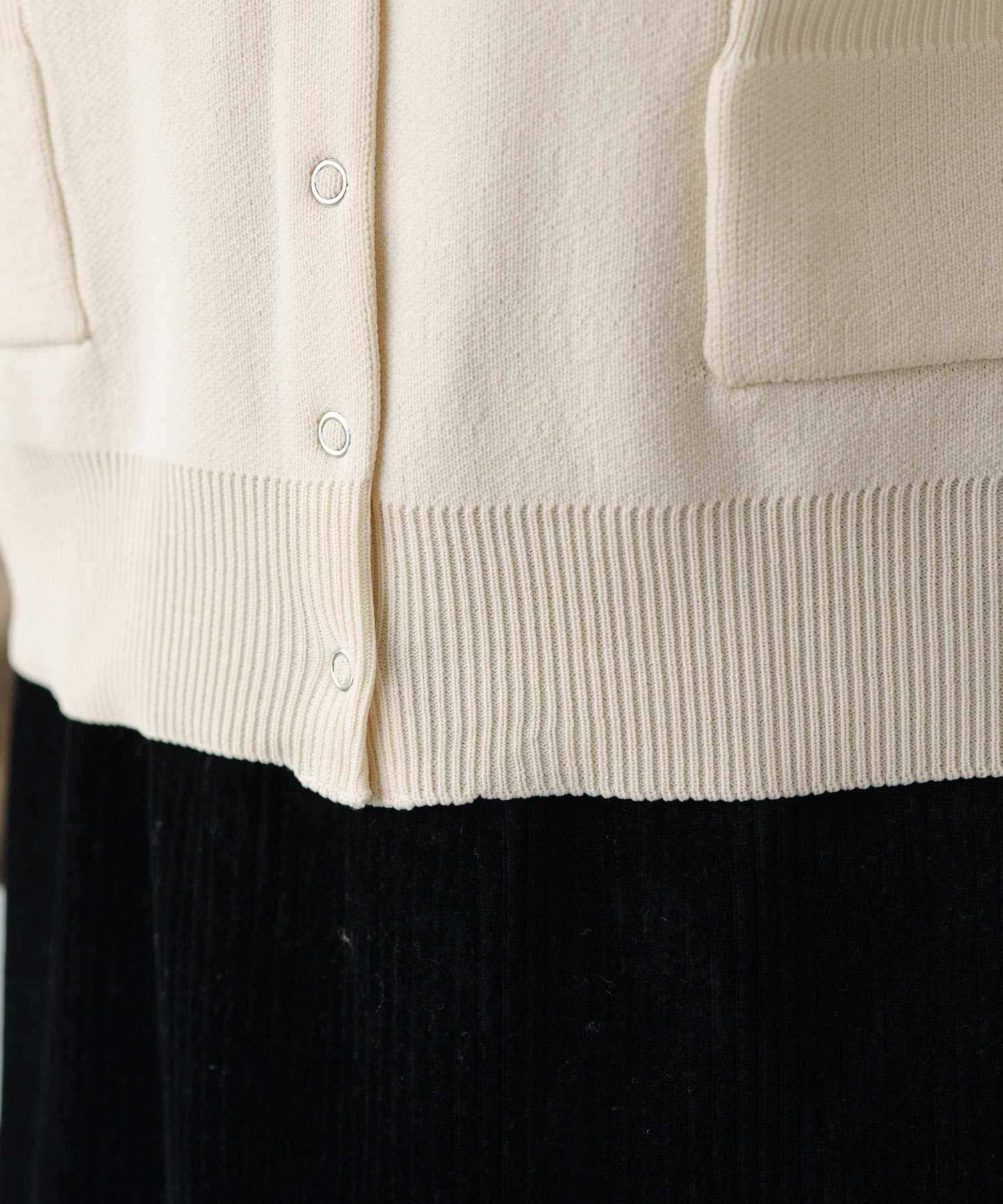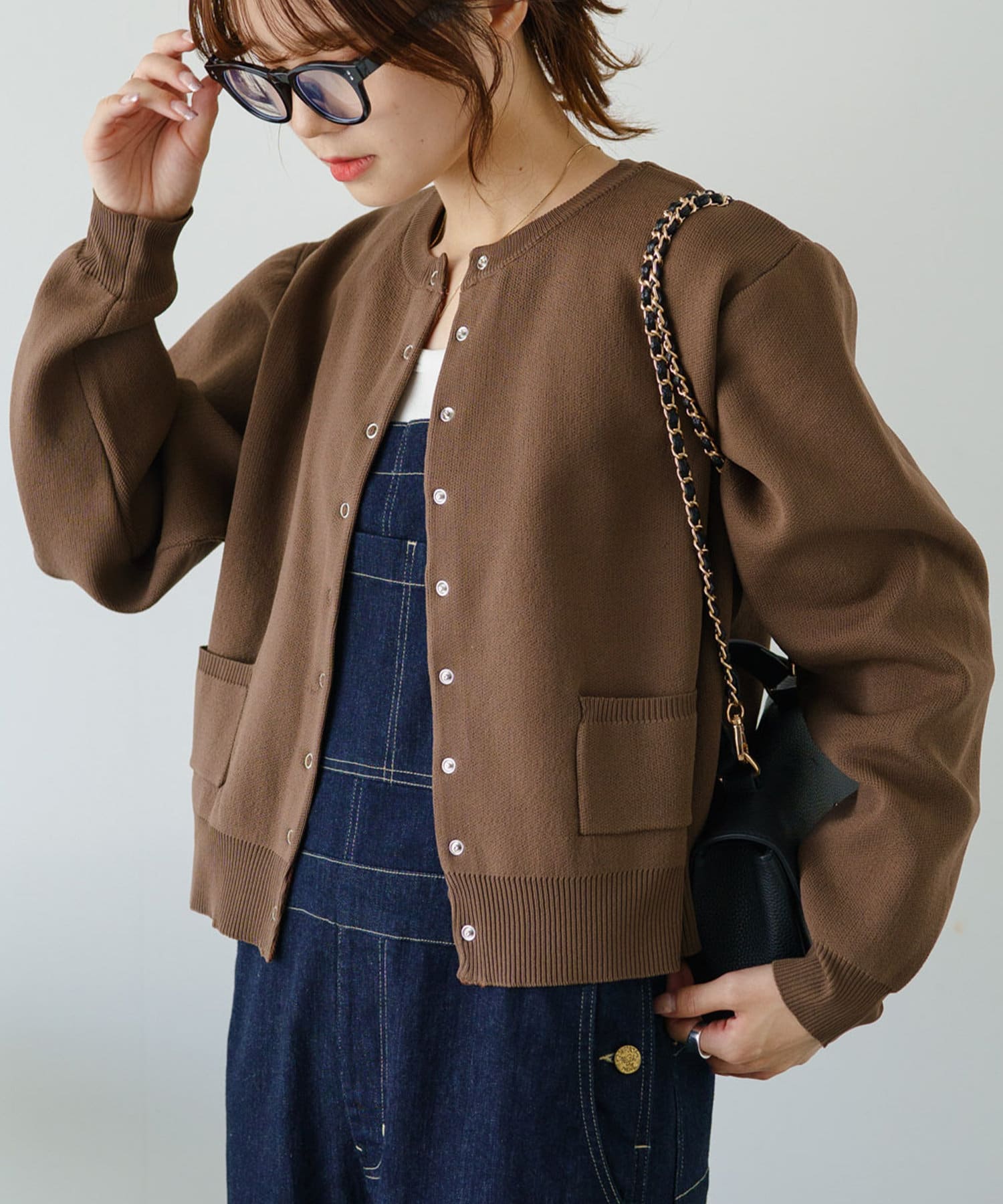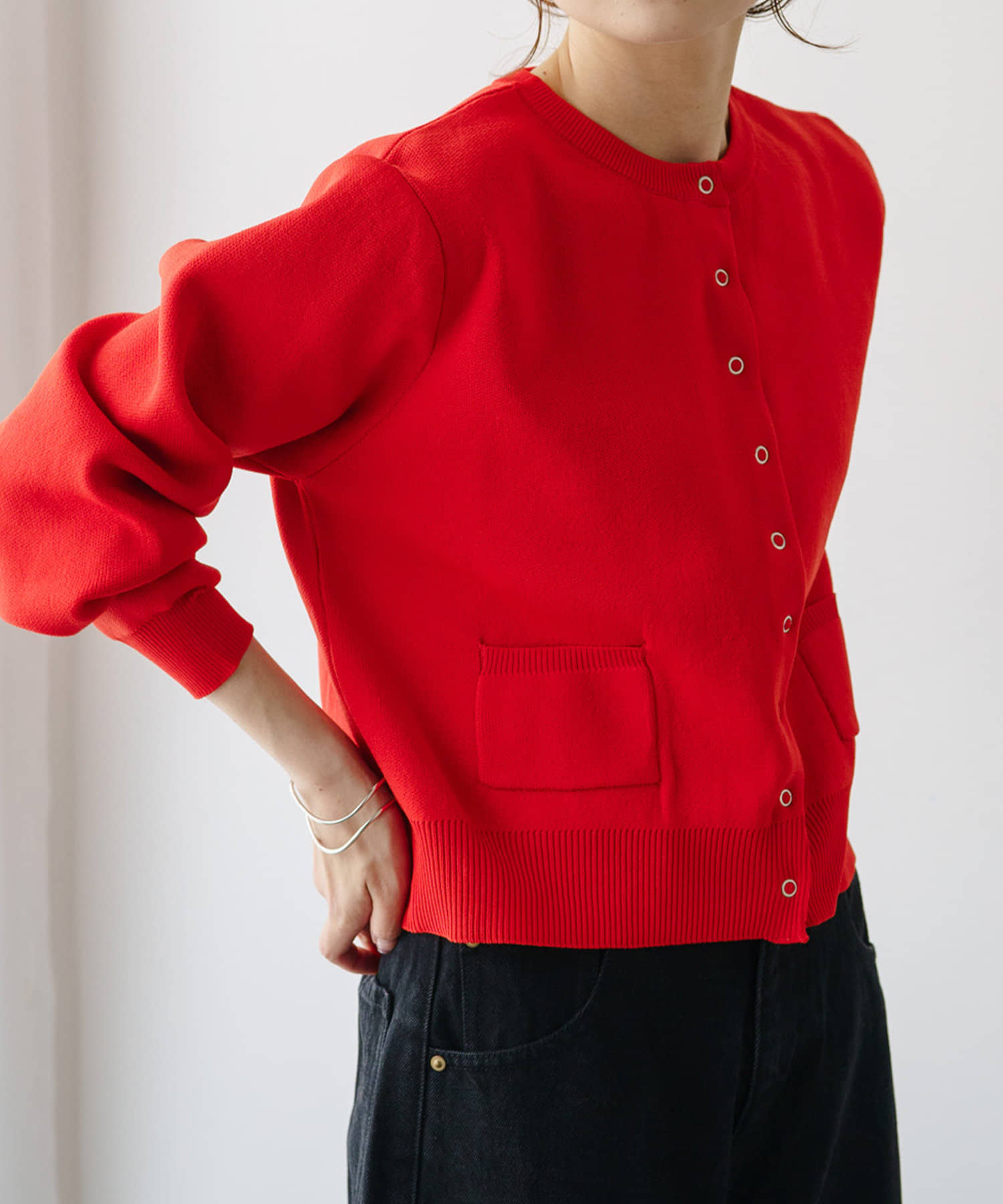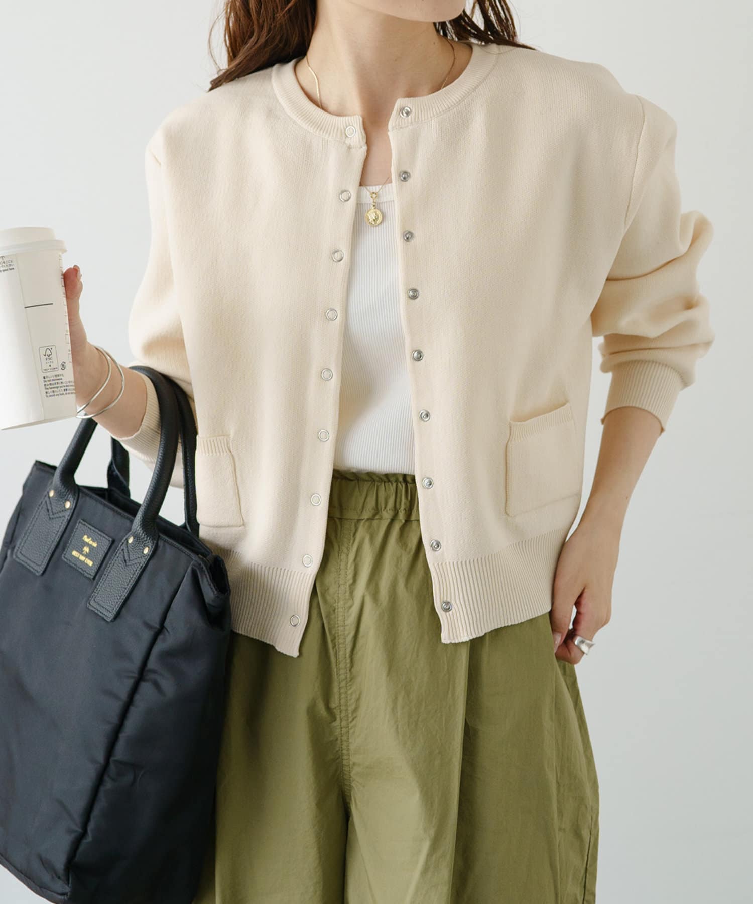 リングドットボタンとミニポケットがさりげないアクセントで目を惹くカーディガン。