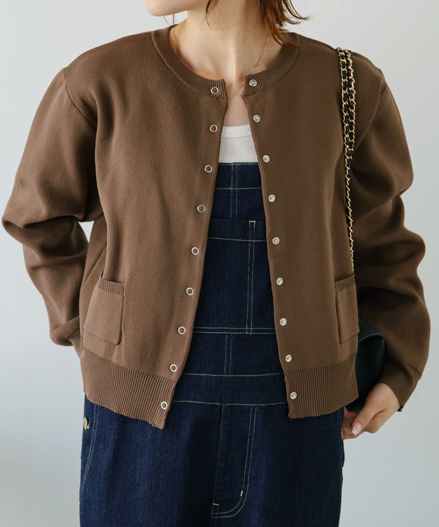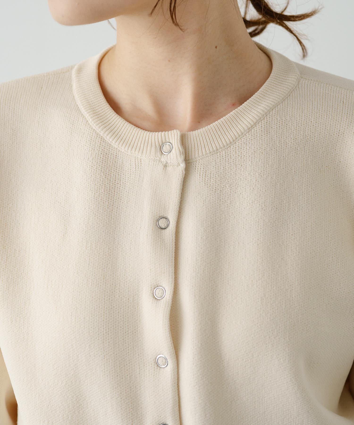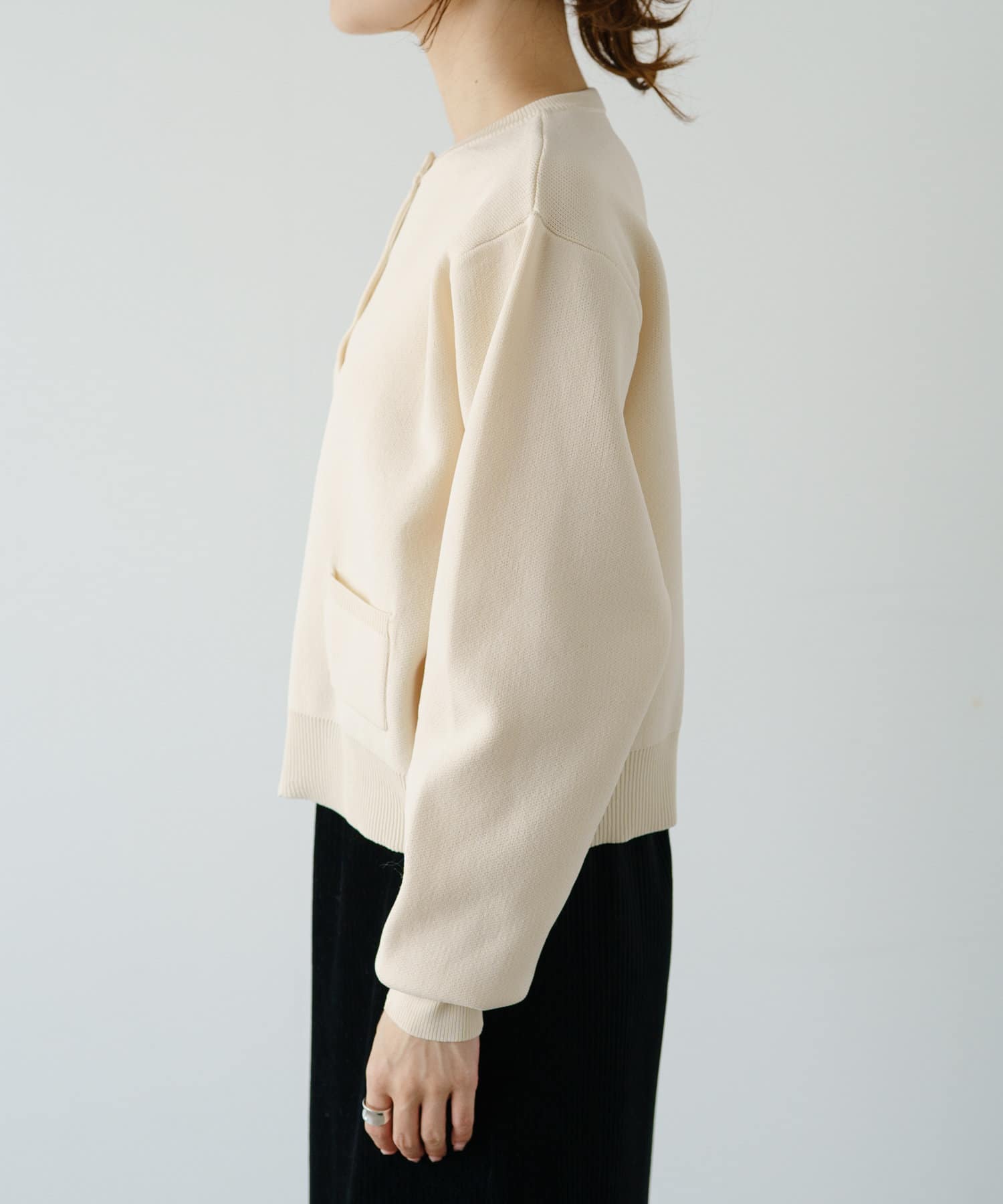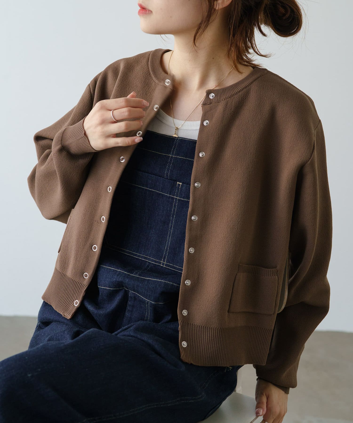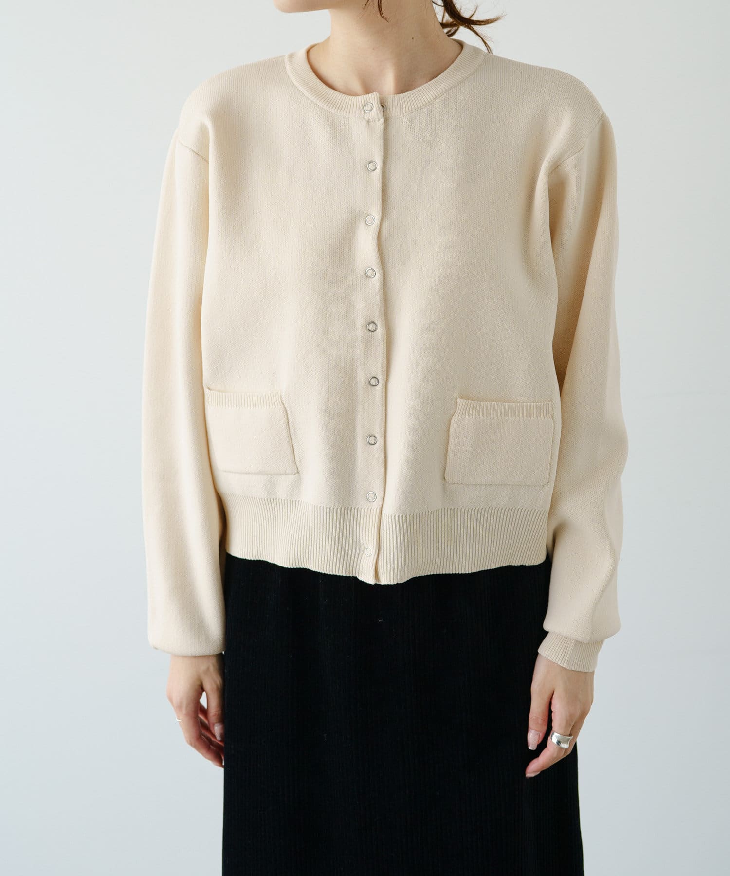 リングドットボタンとミニポケットがさりげないアクセントで目を惹くカーディガン。