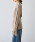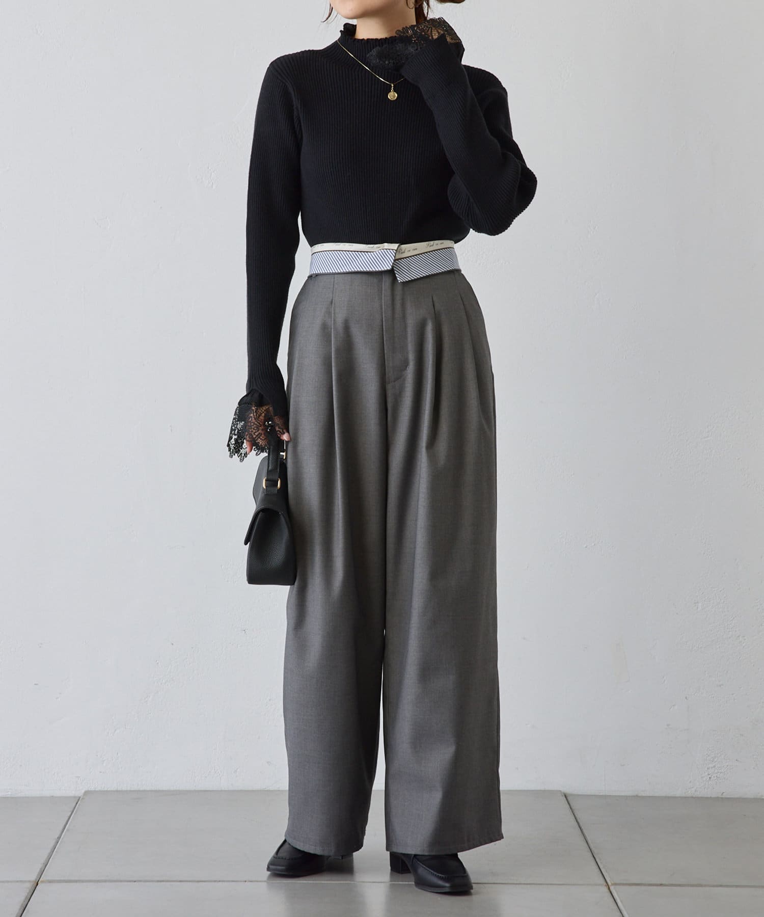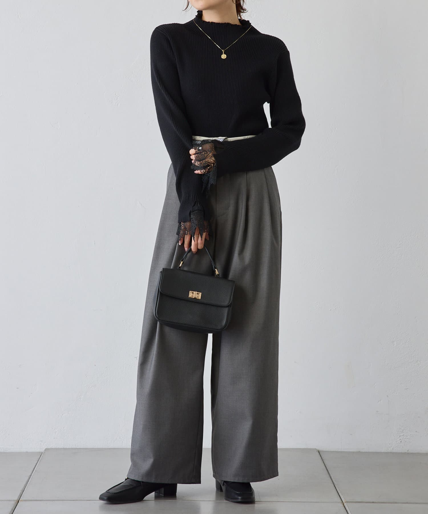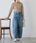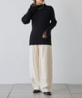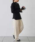 シンプルなシルエットなのでパンツやスカート、ボトムスにインでもアウトでもどちらでもスタイリングいただけて幅広いボトムスと好相性◎