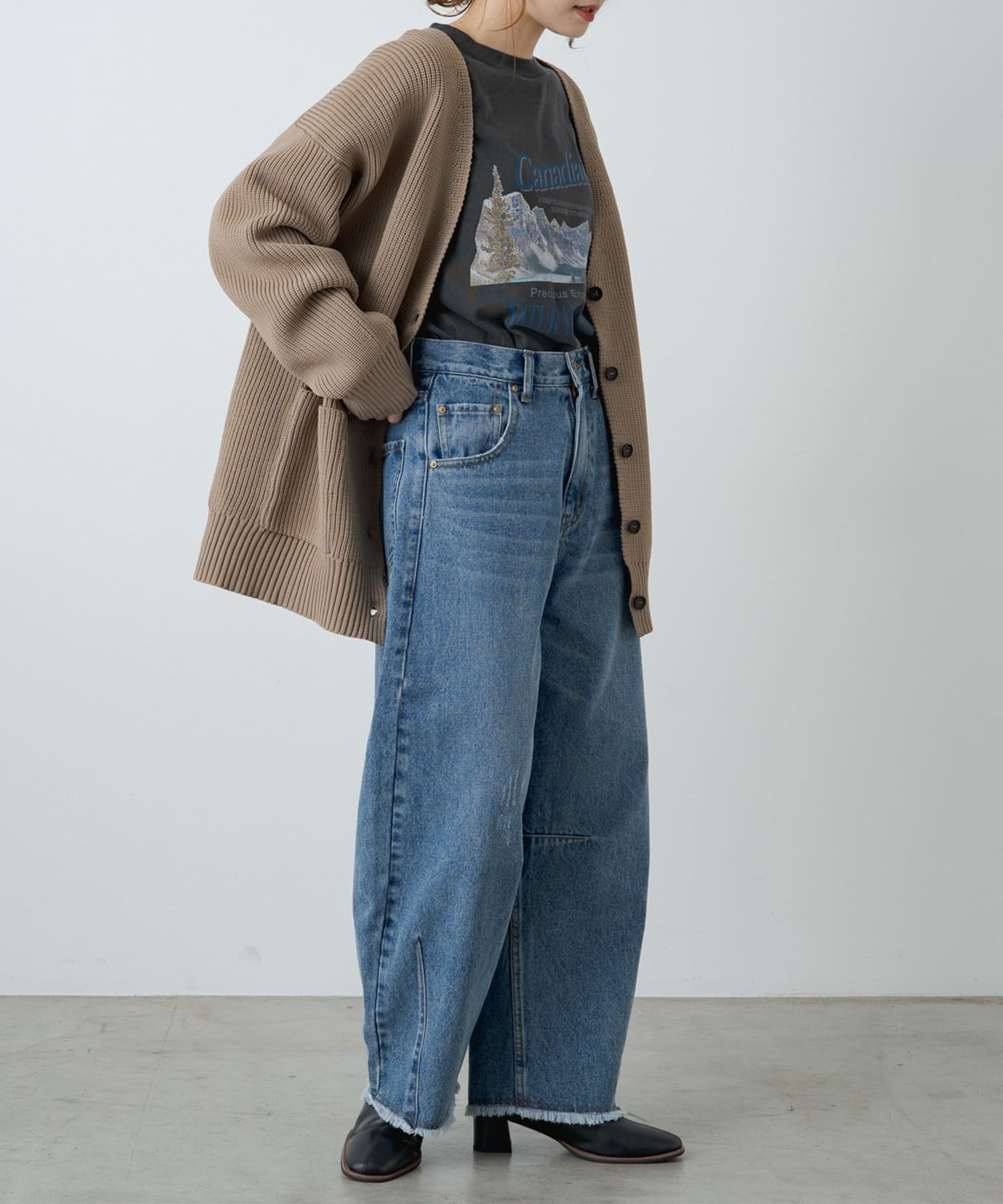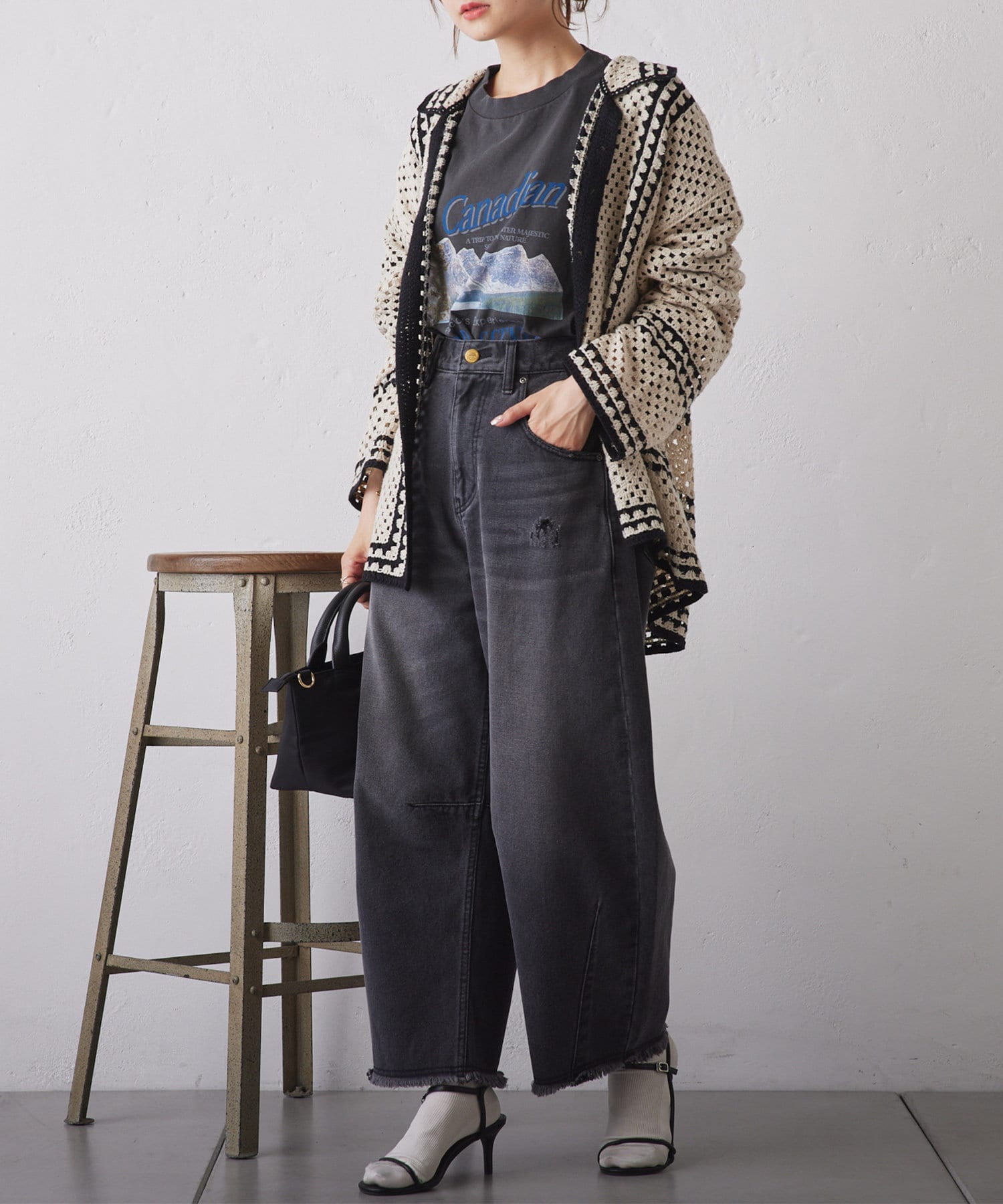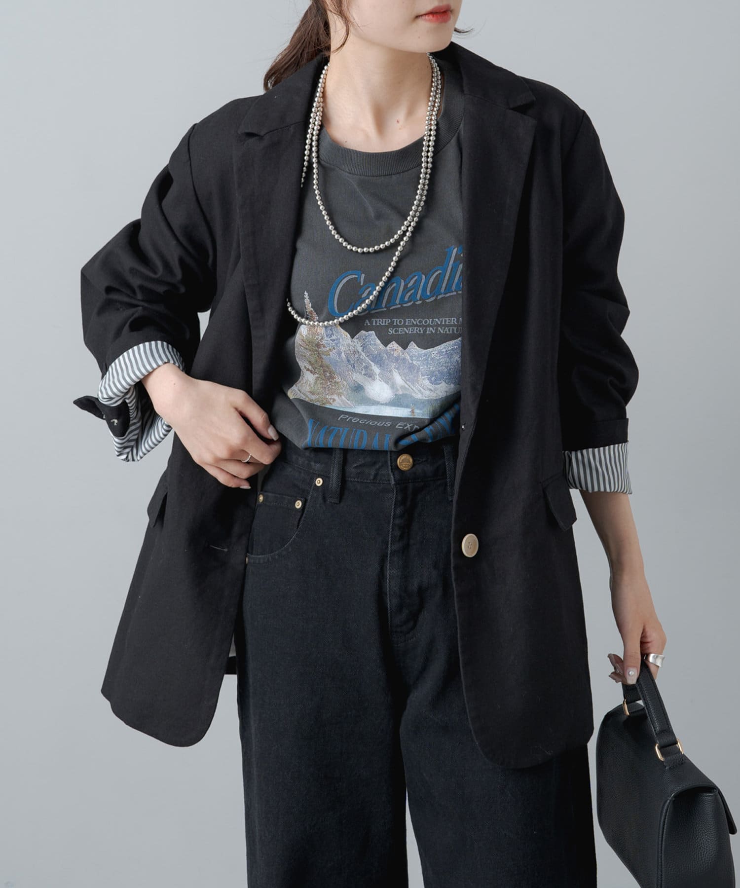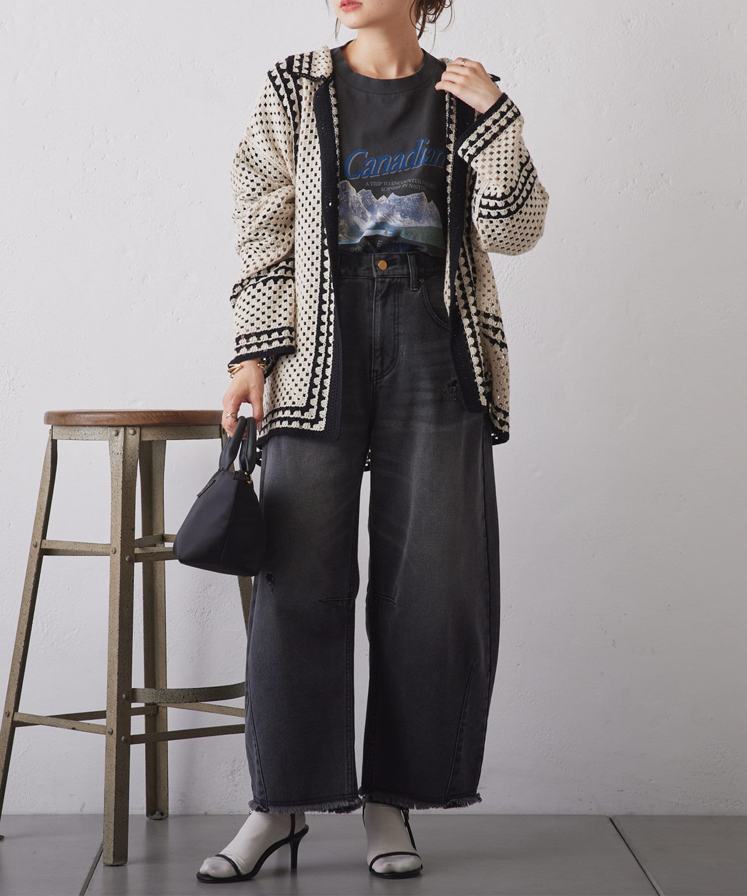 キャッチーなデザインなので1枚着はもちろん、ジャケットやーカーディガンのレイヤード時にも抜群の存在感を発揮。
