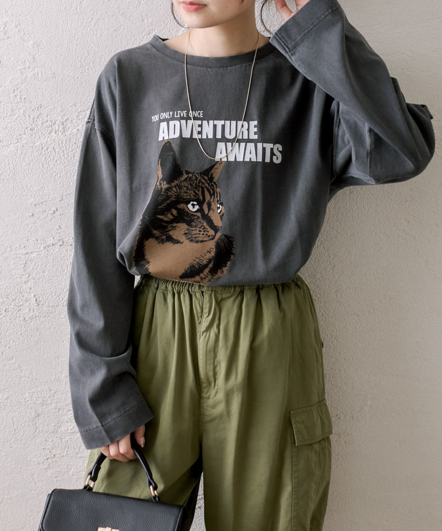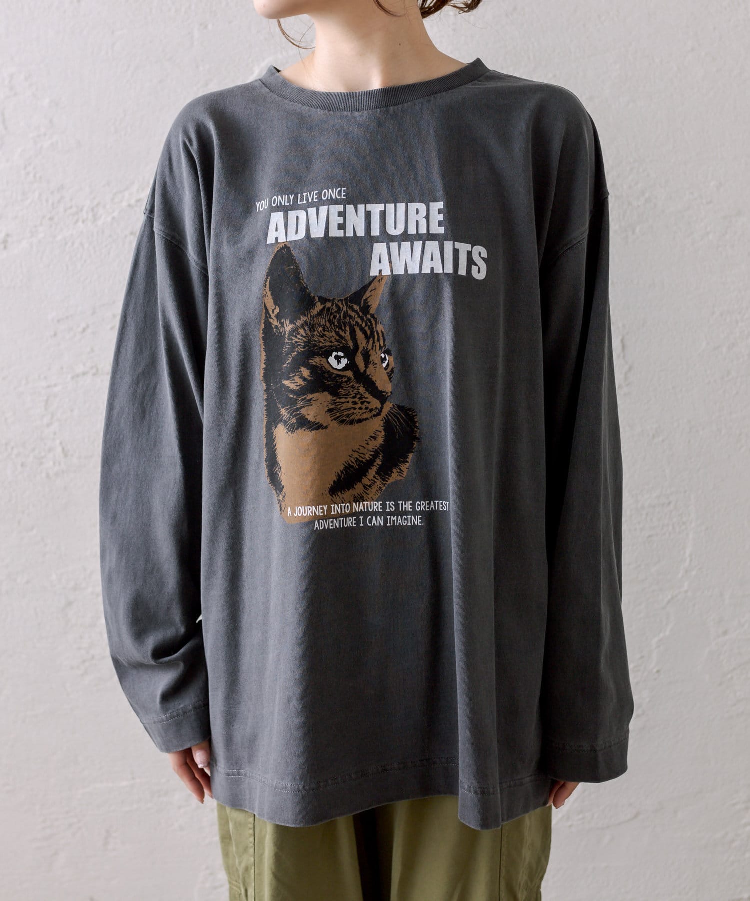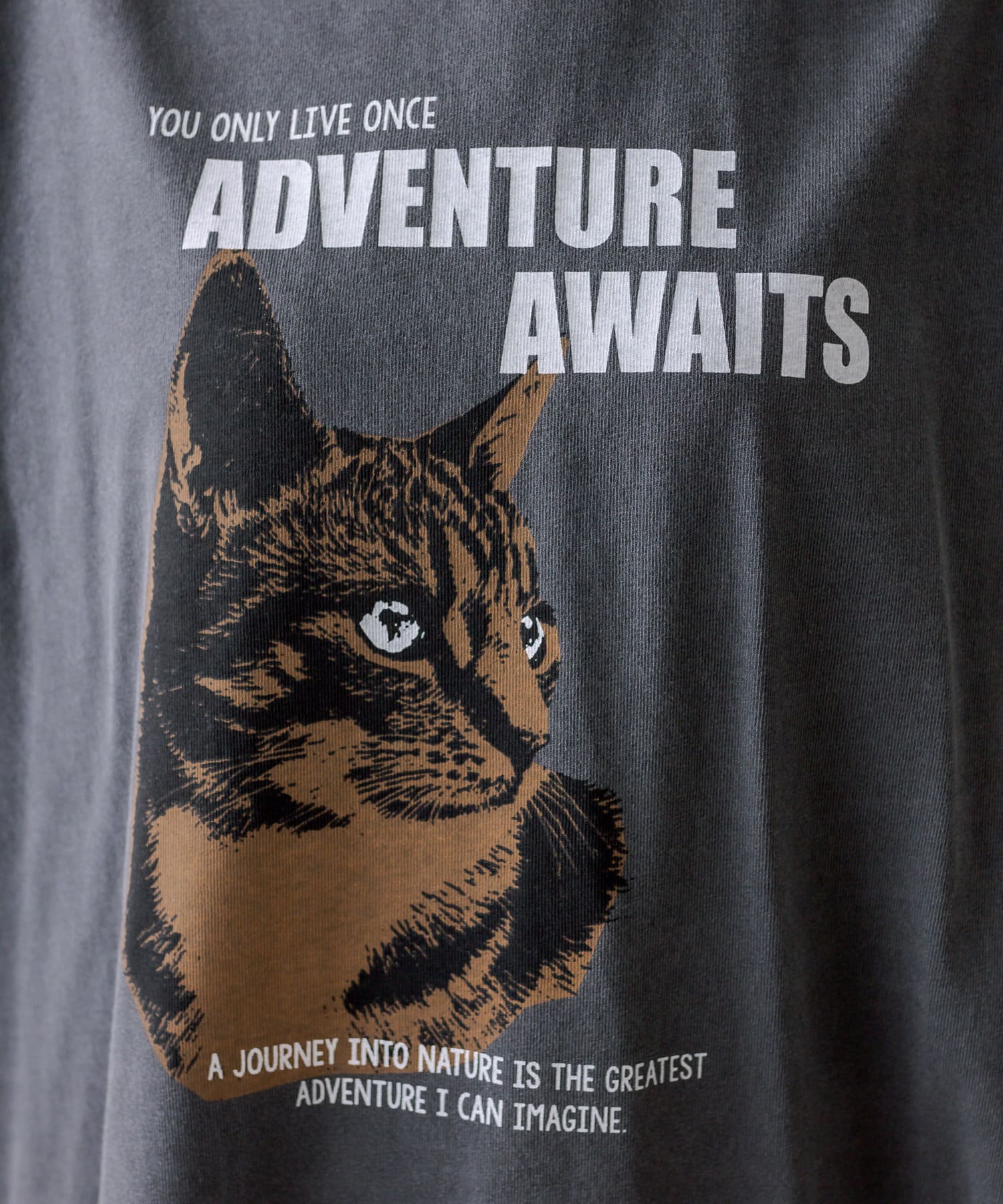 猫モチーフのグラフィックデザインで存在感抜群のプリントTシャツ。
