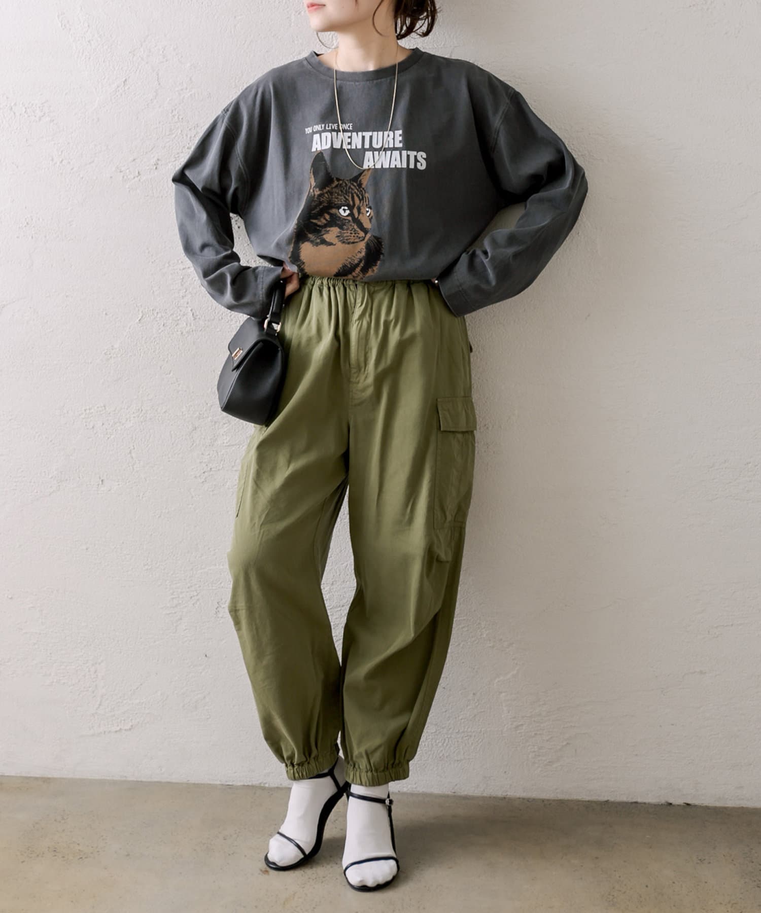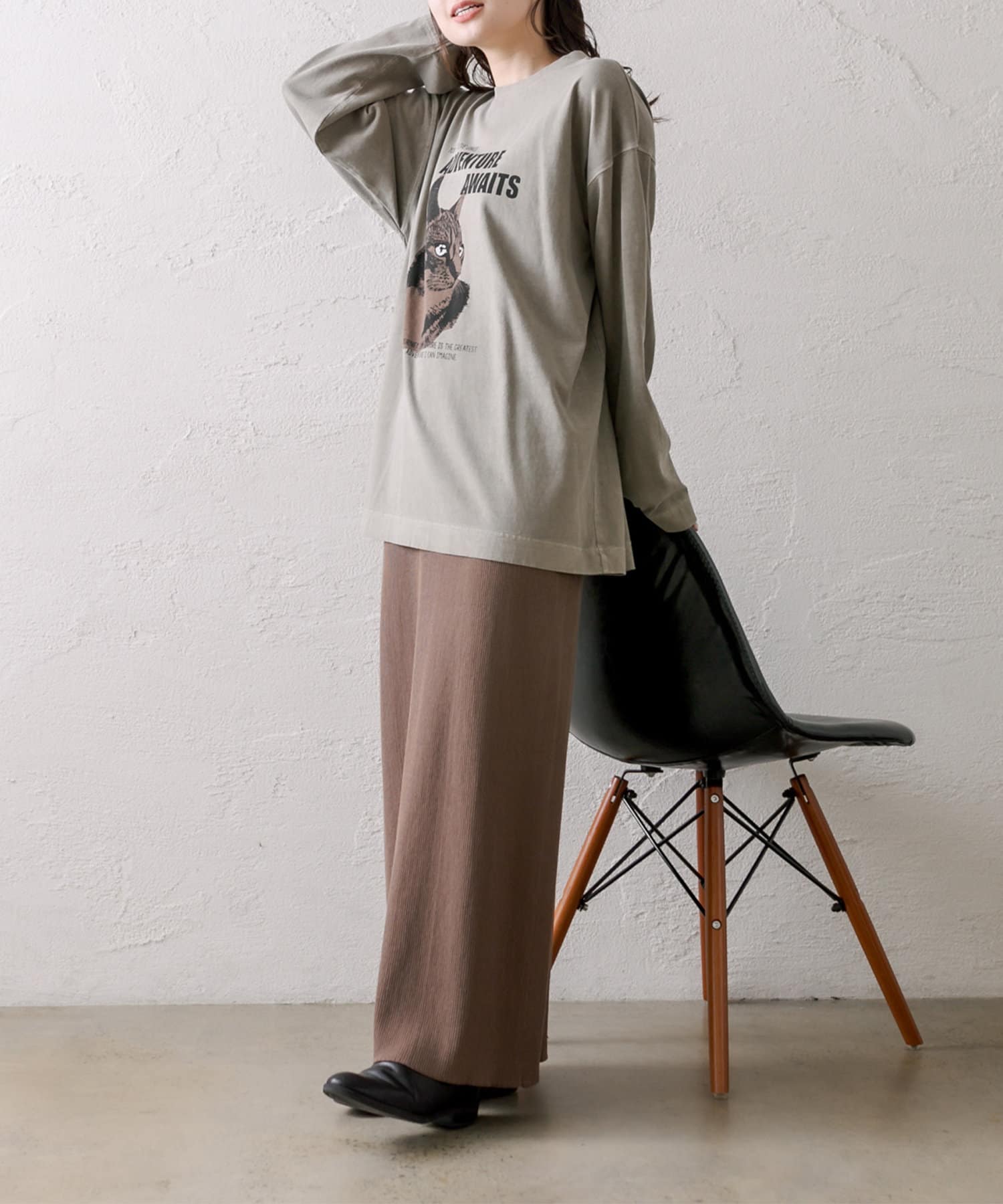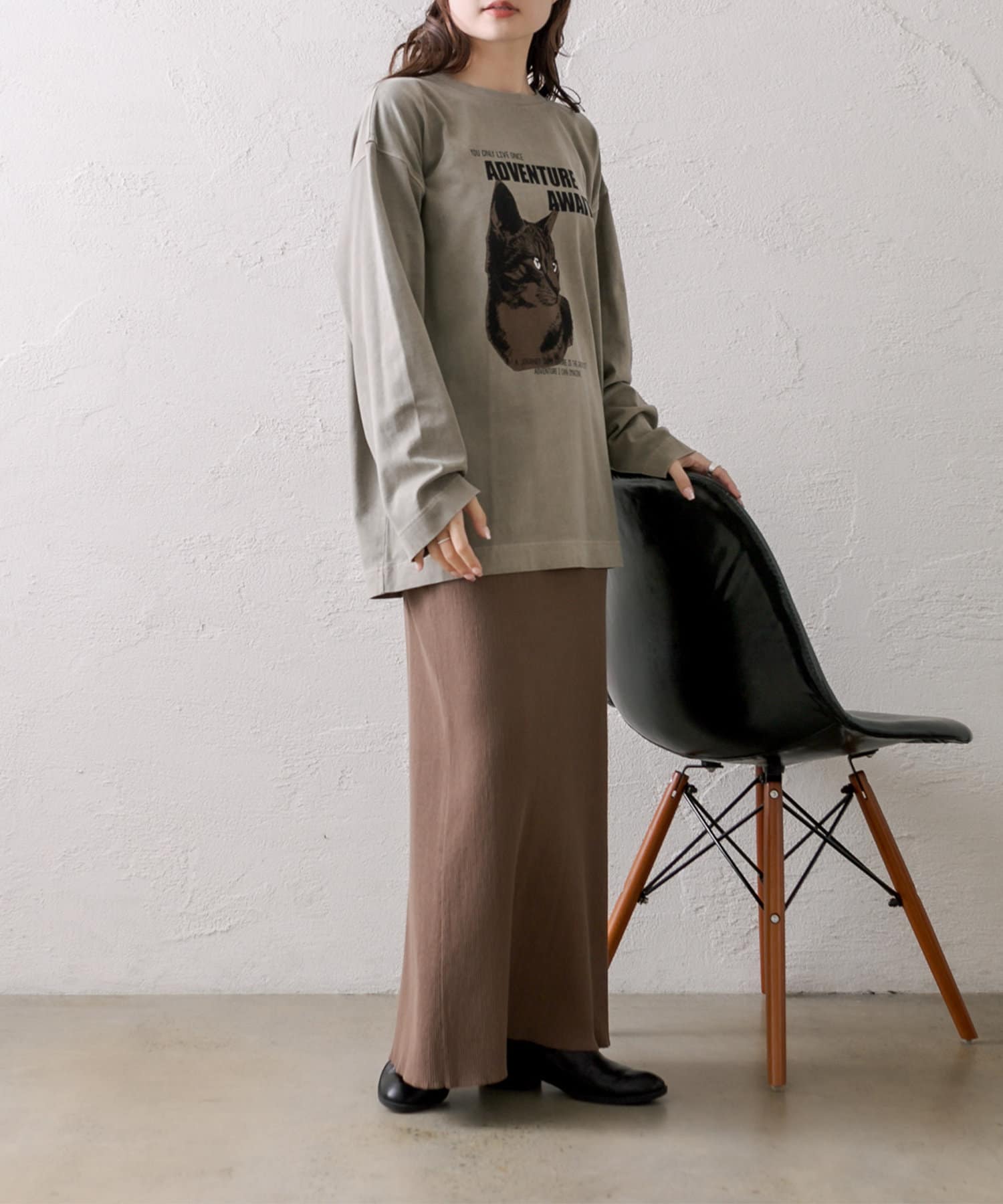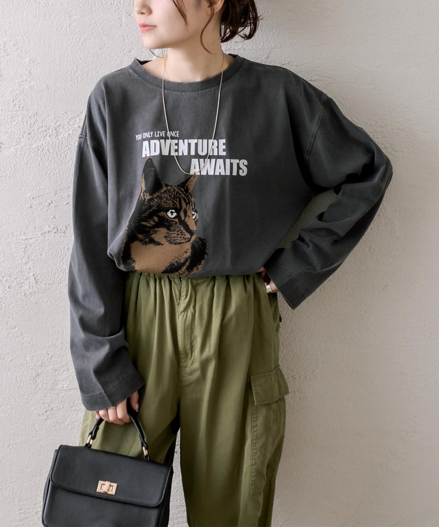 猫モチーフのグラフィックデザインで存在感抜群のプリントTシャツ。