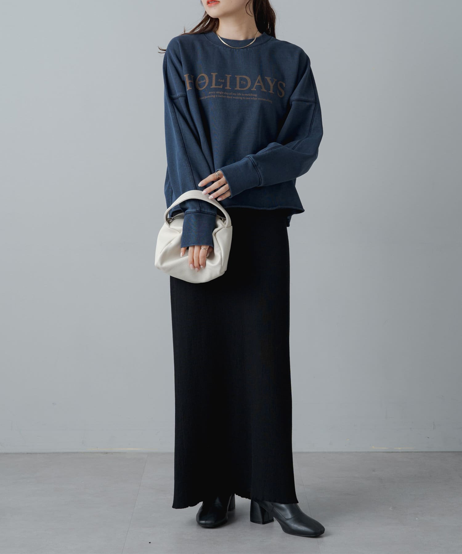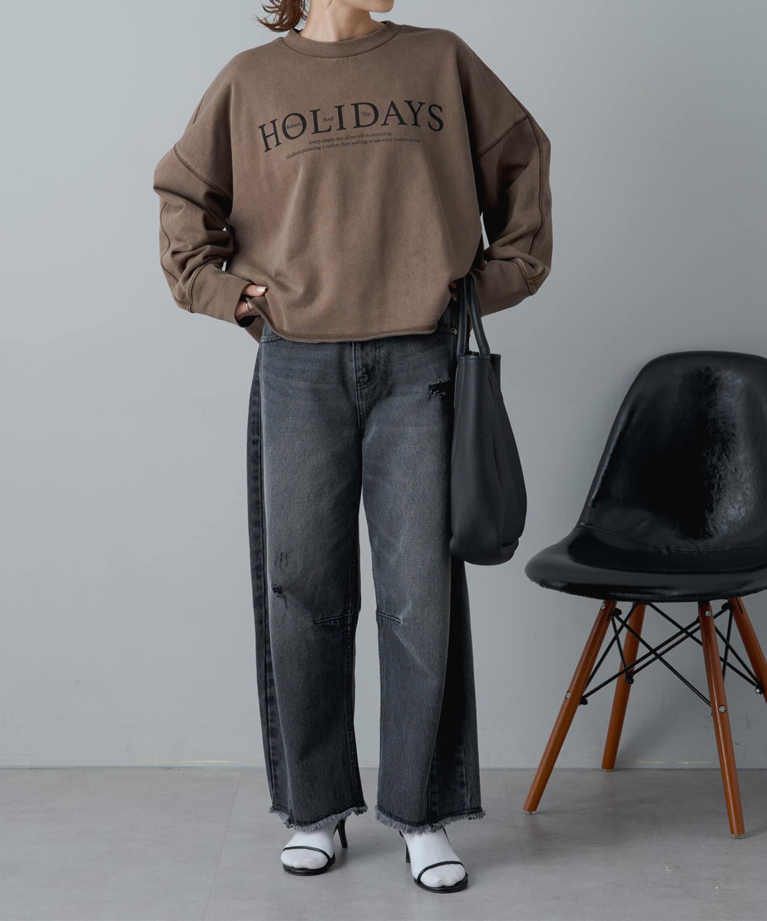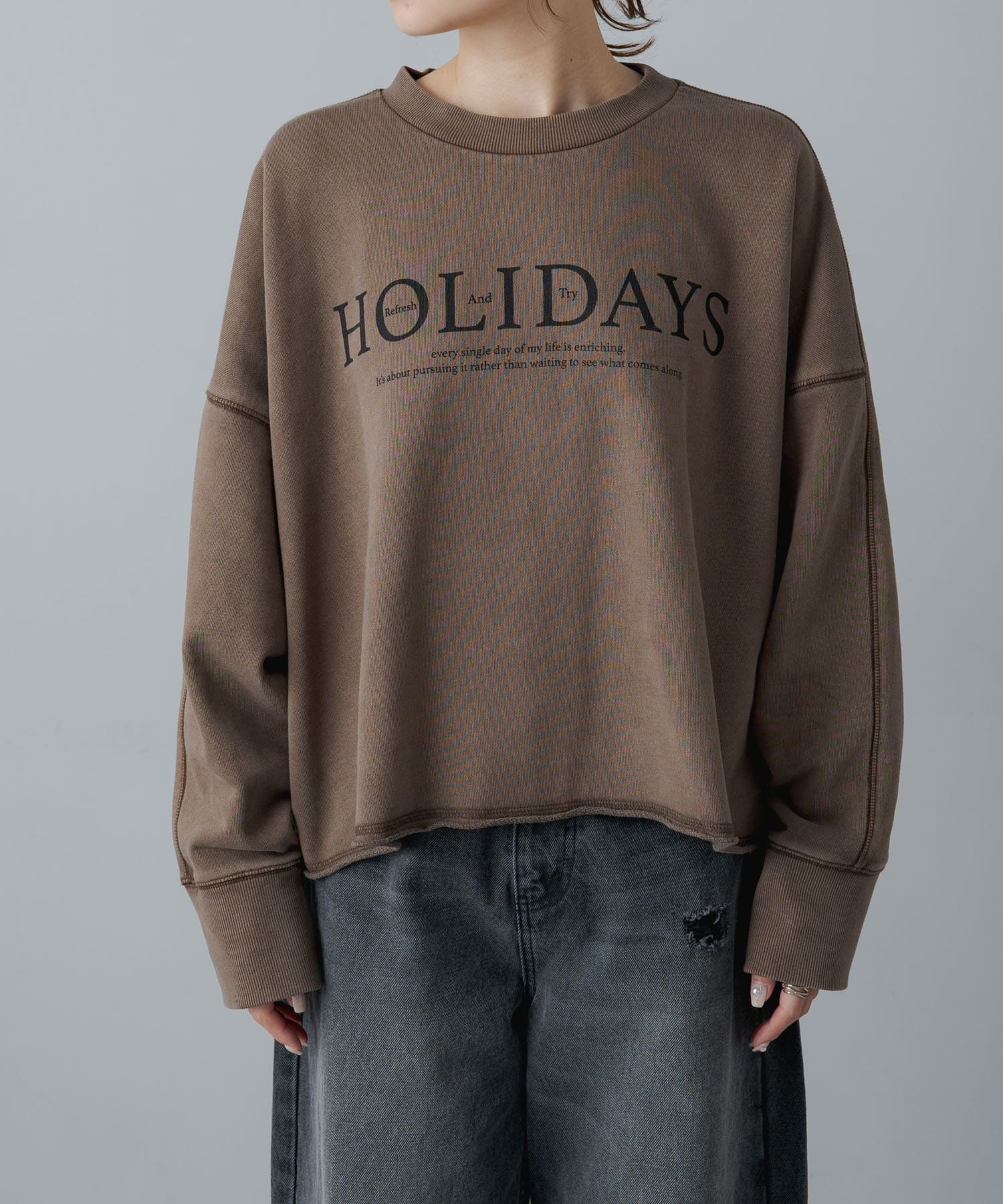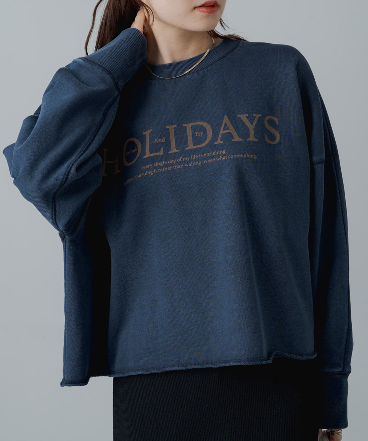 トレンドライクなショート丈が大人のカジュアルスタイルをアップデートするロゴプリントスウェット。