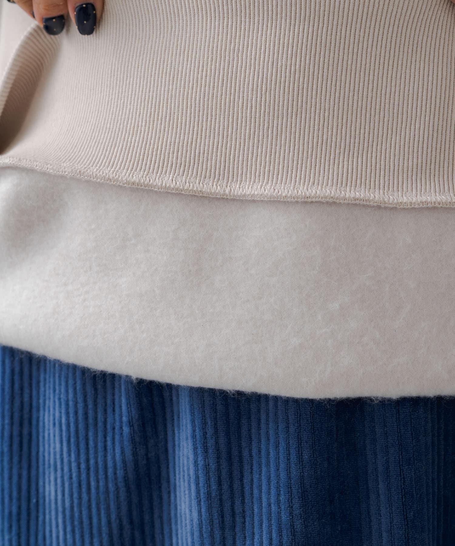 素材感:程良く伸びることと裏が起毛しており着用感のとても良い生地感です。