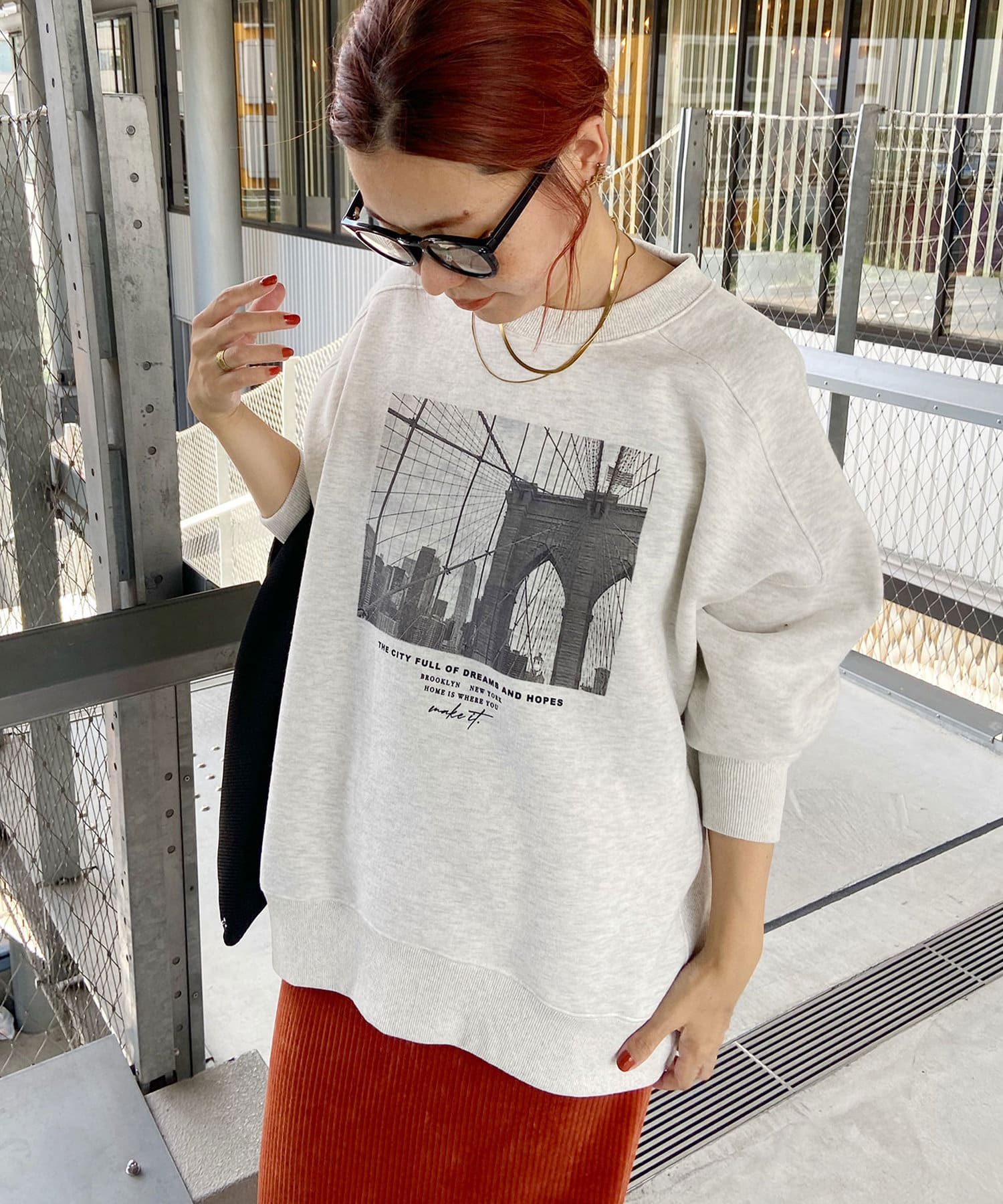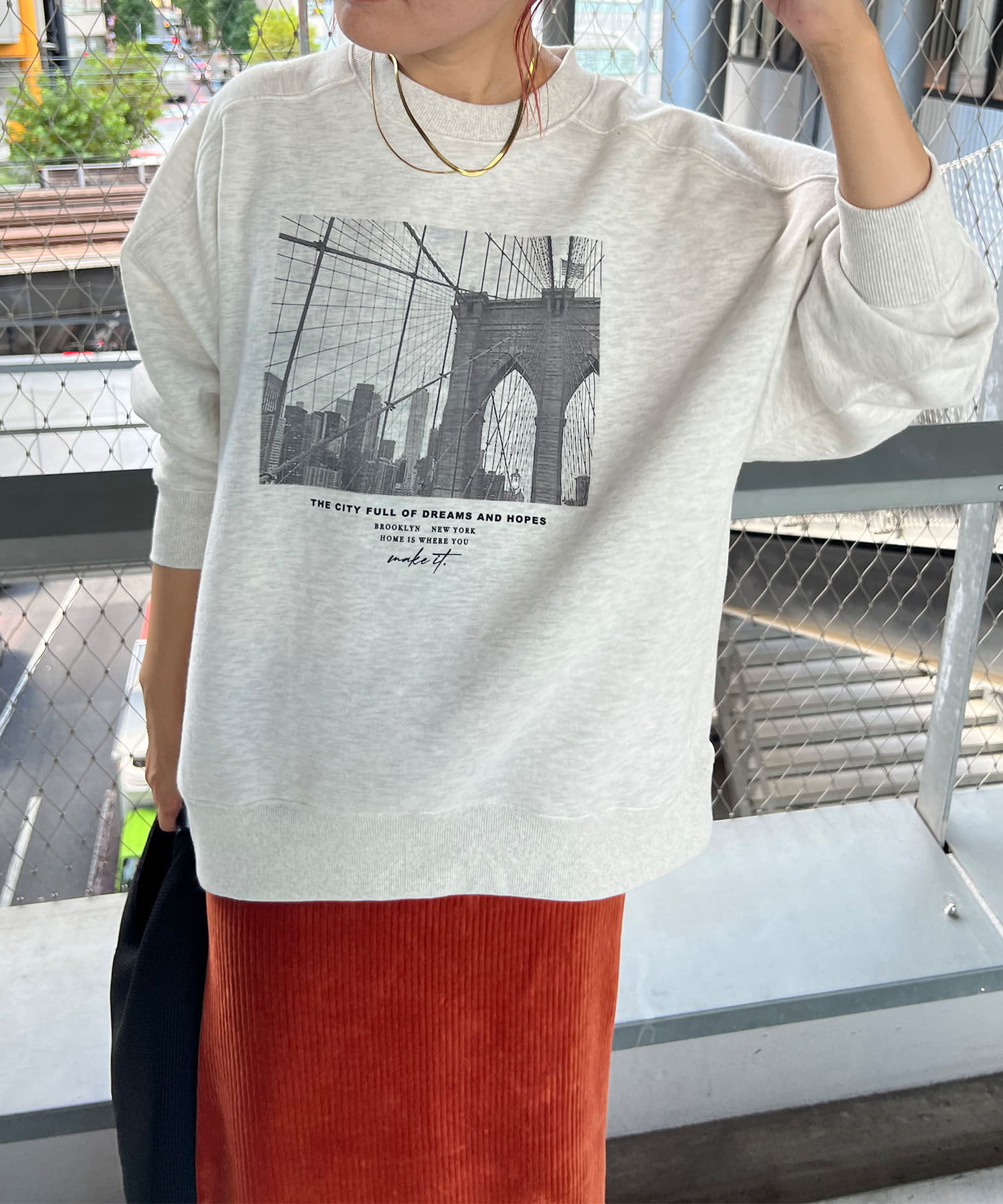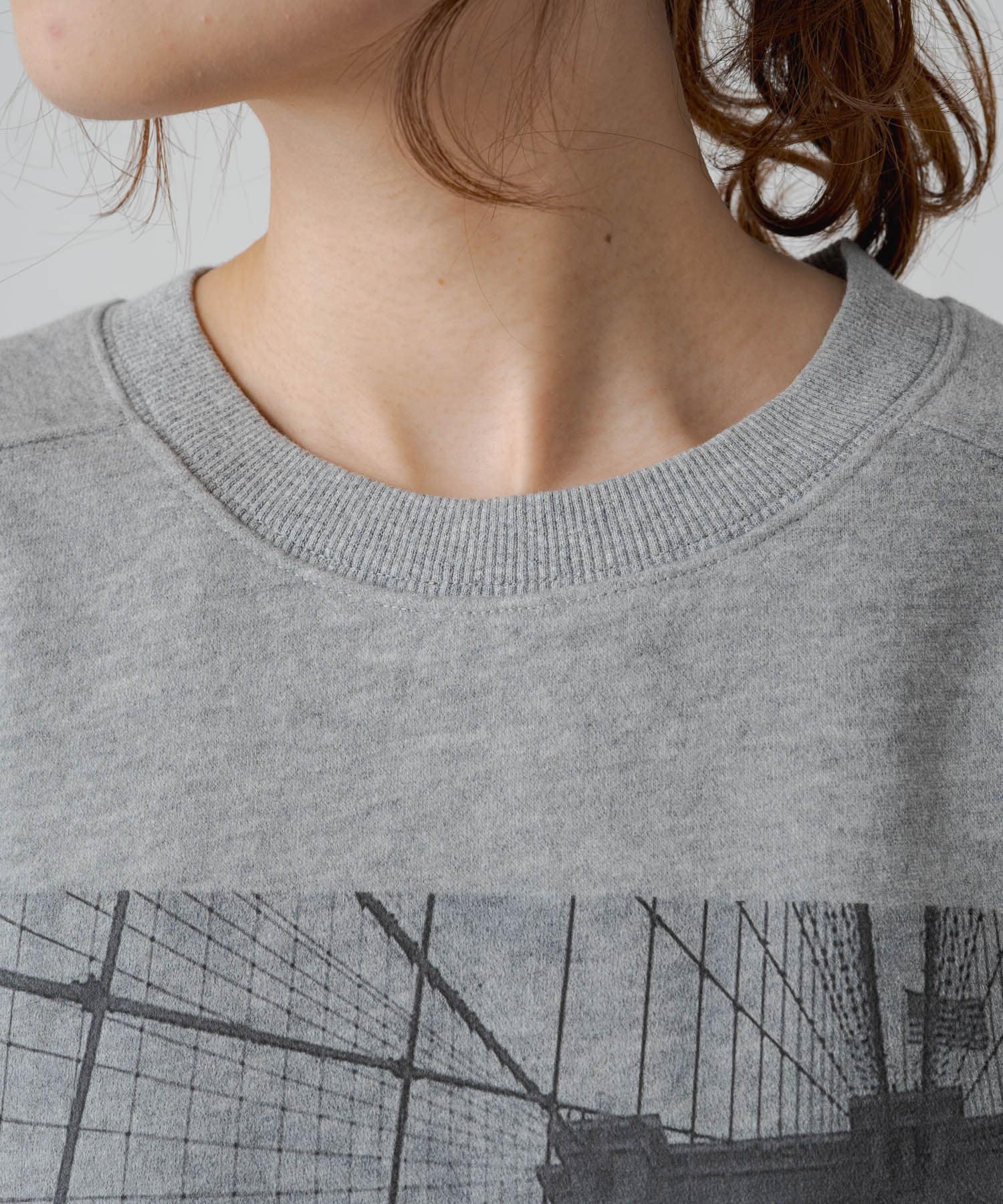 ニューヨークのブルックリン・ブリッジのフォトプリントがアクセントになった裏起毛スウェット。