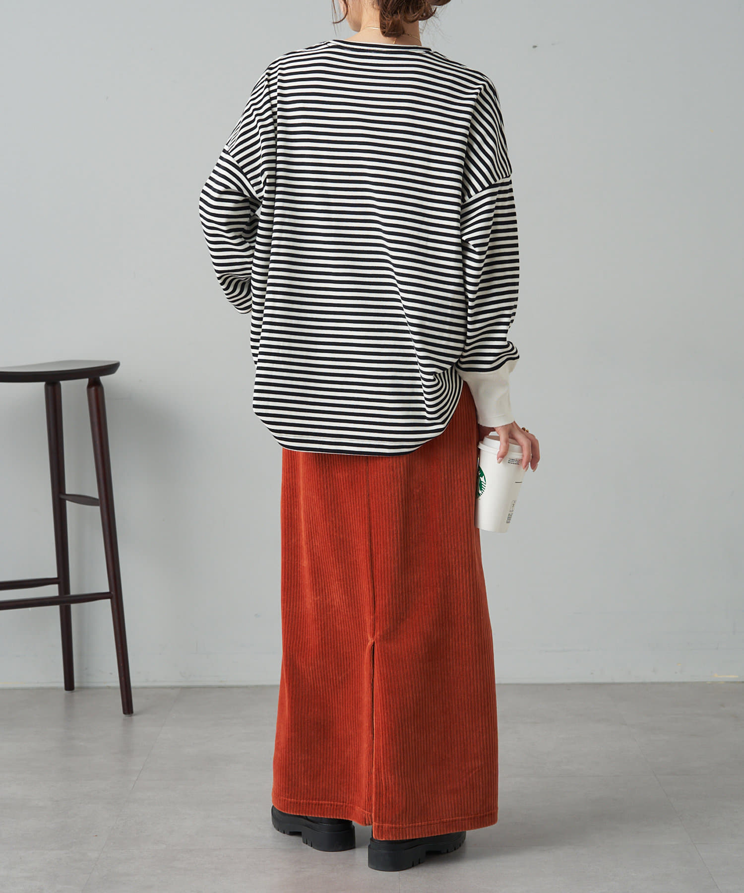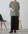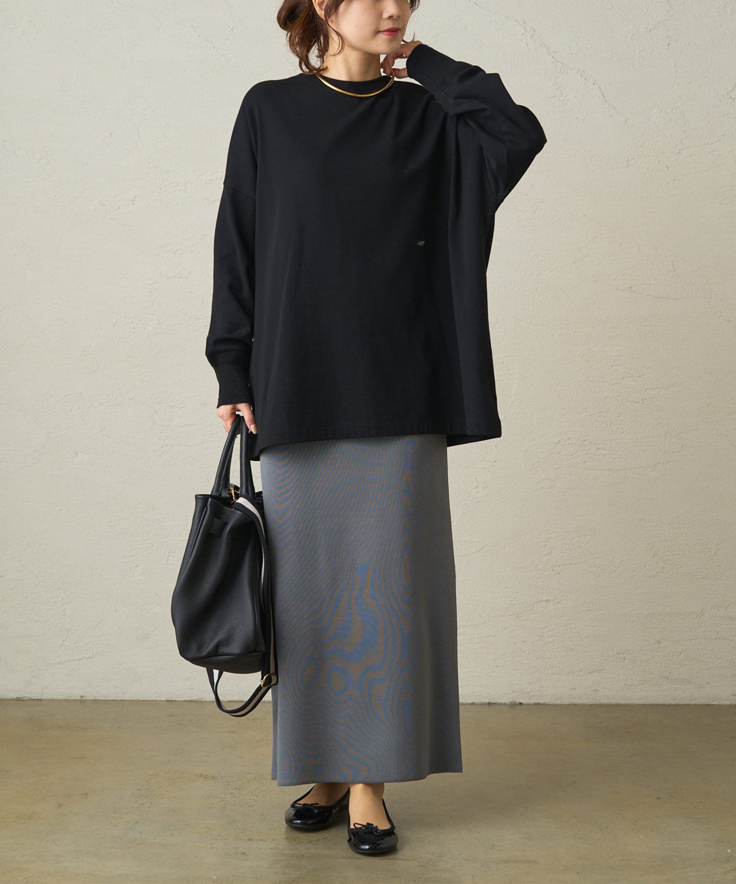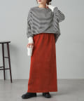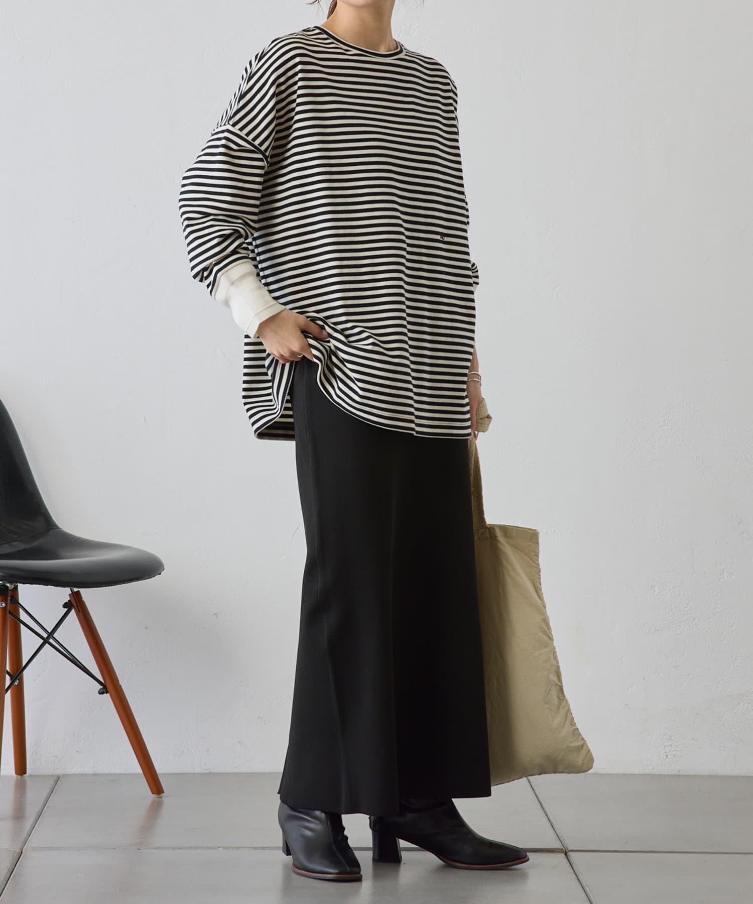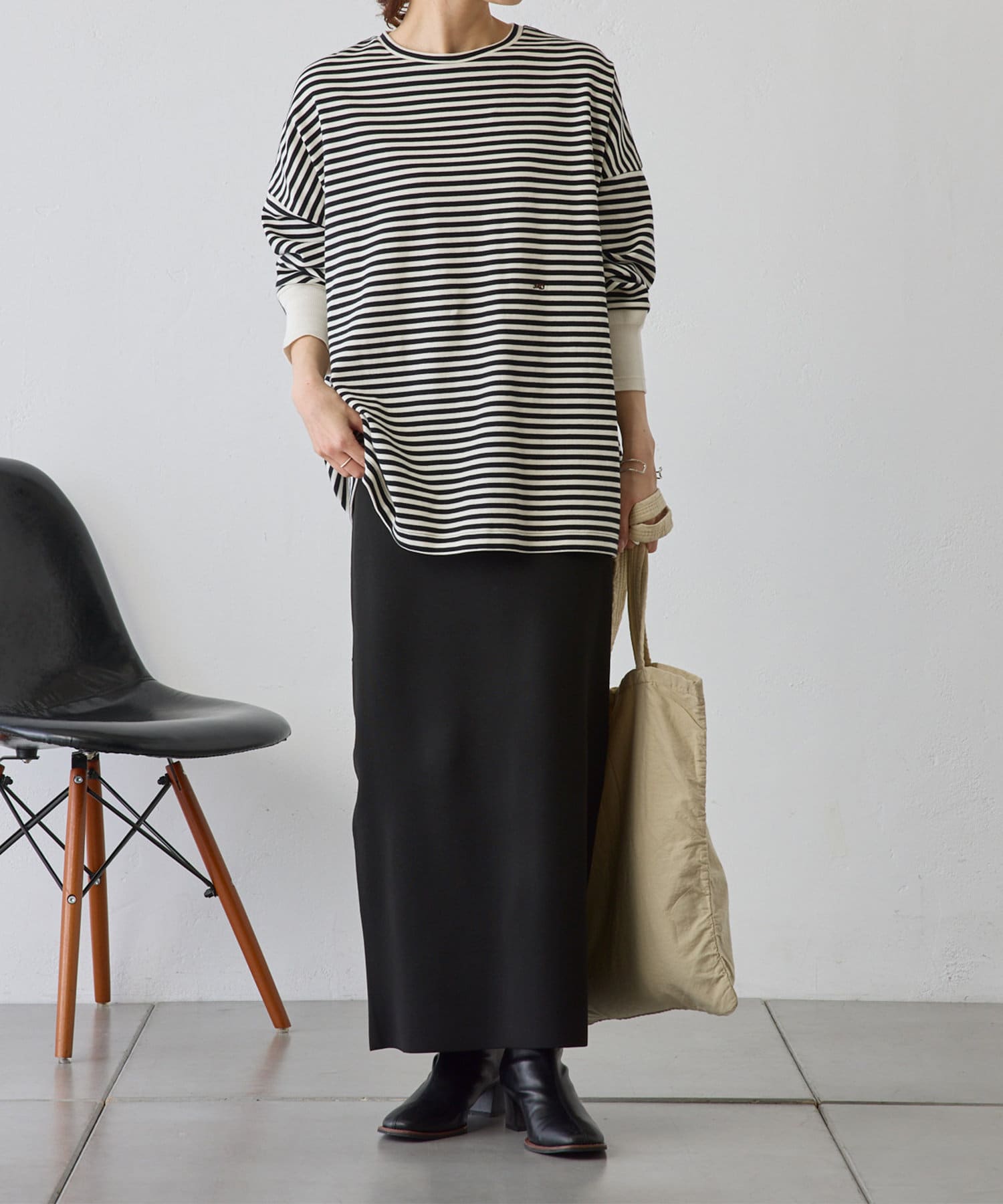 チュニック丈なのでスカート合わせならIラインのナロースカートがスッキリ見えておすすめです。