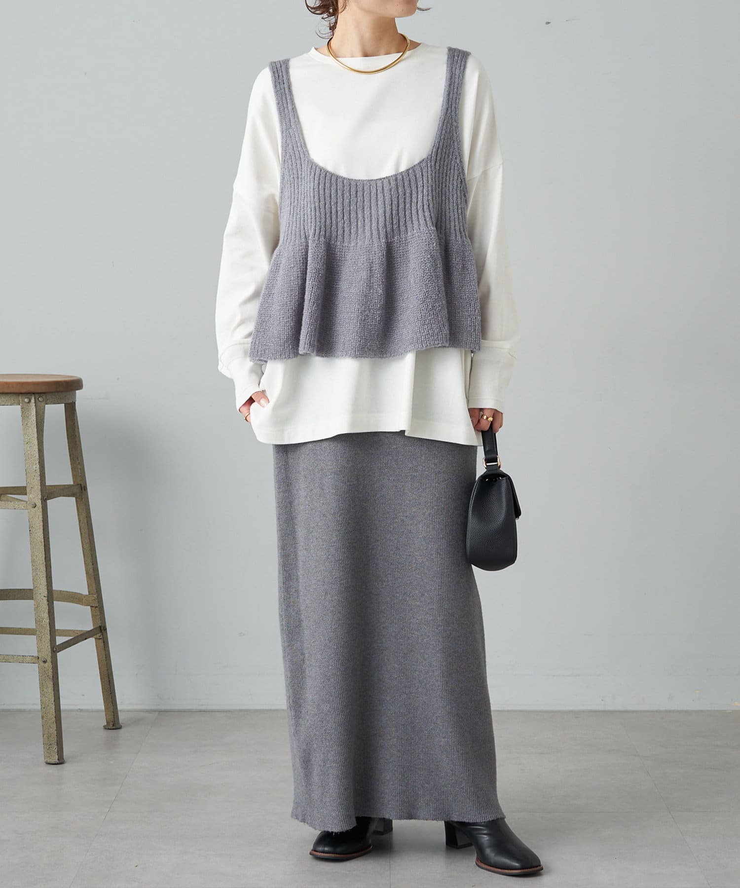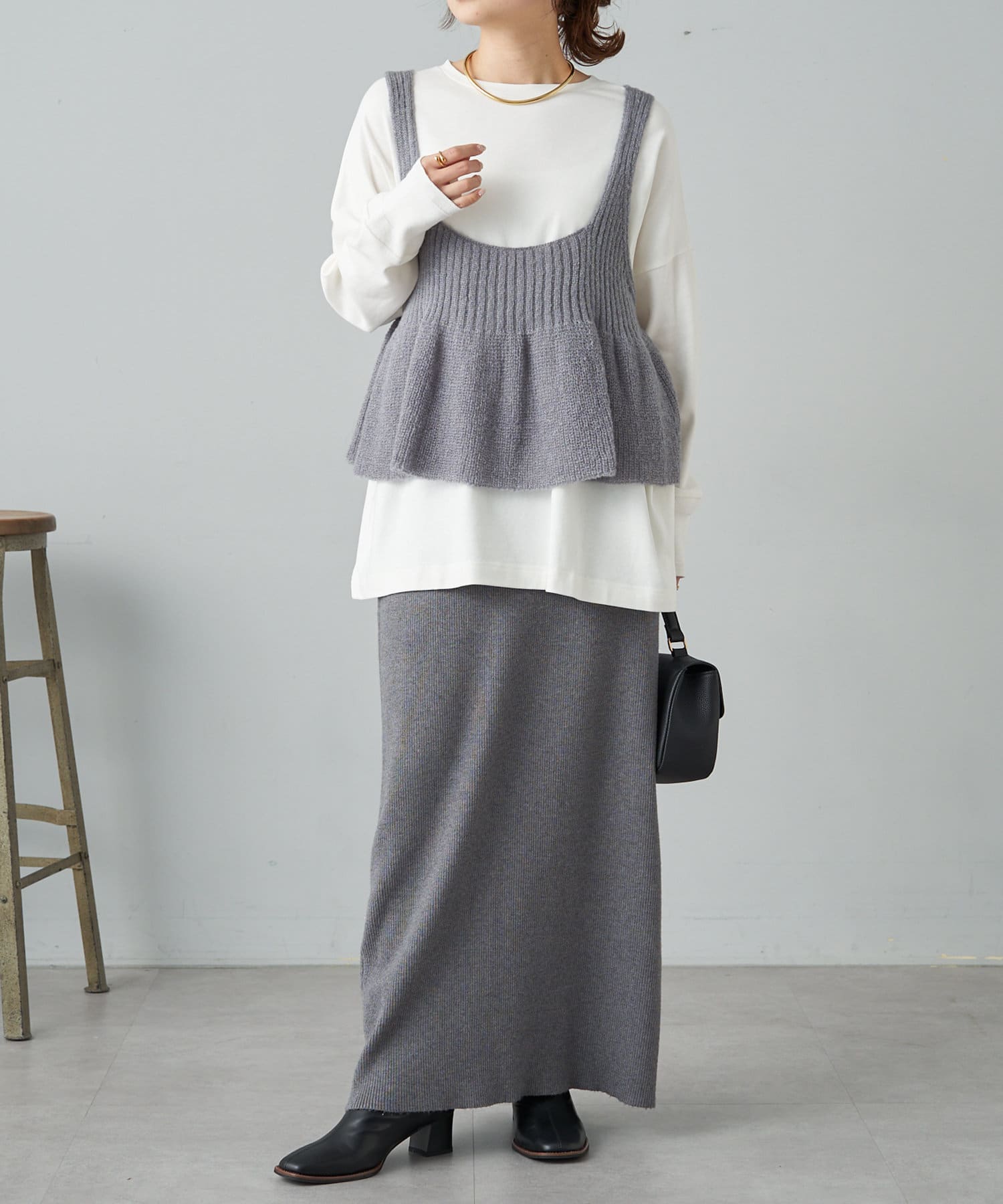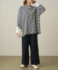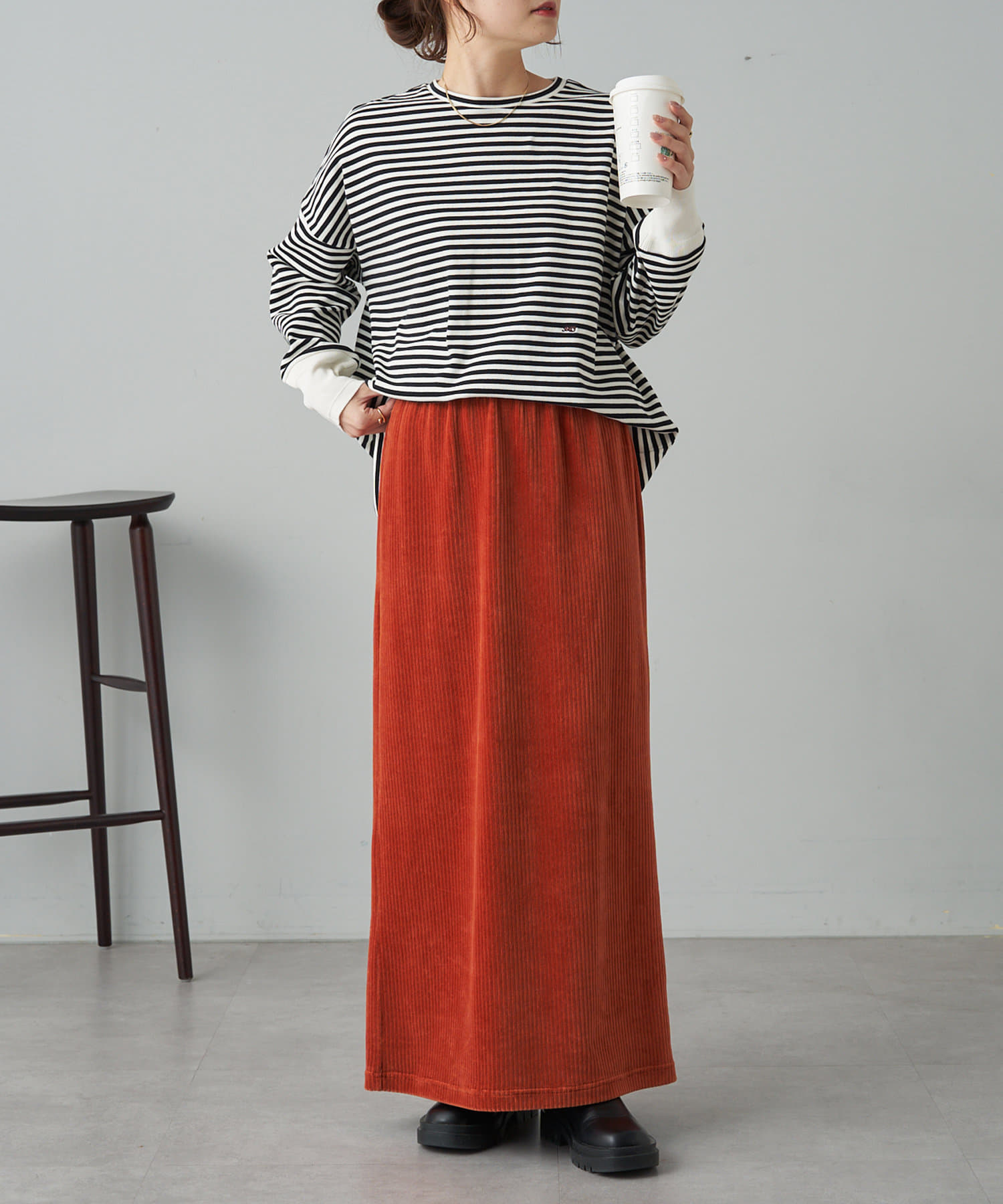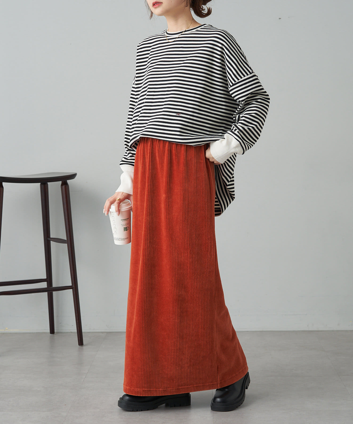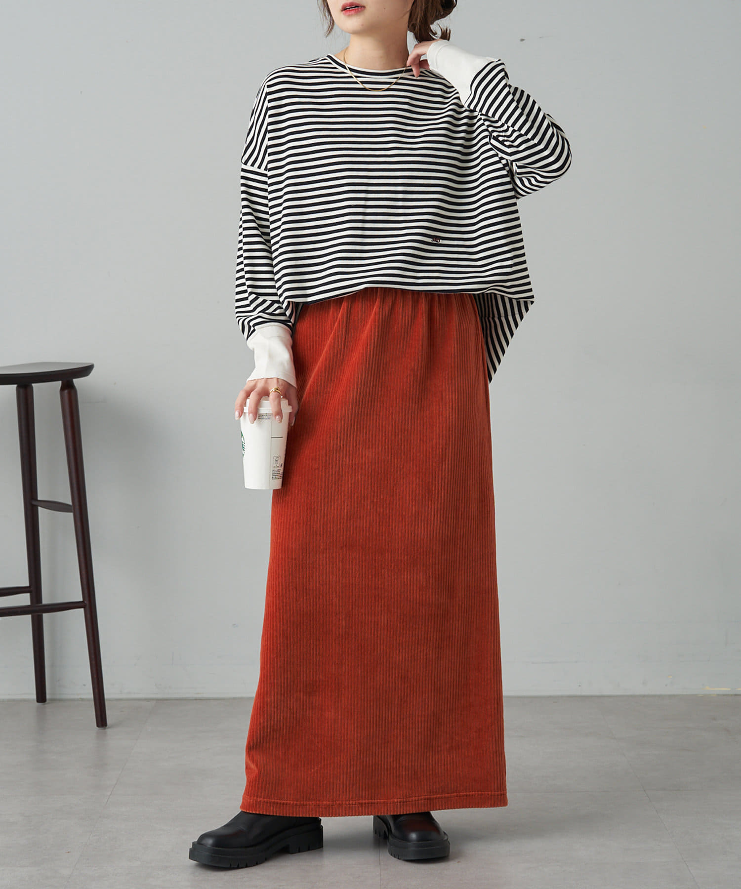 チュニック丈なのでスカート合わせならIラインのナロースカートがスッキリ見えておすすめです。
