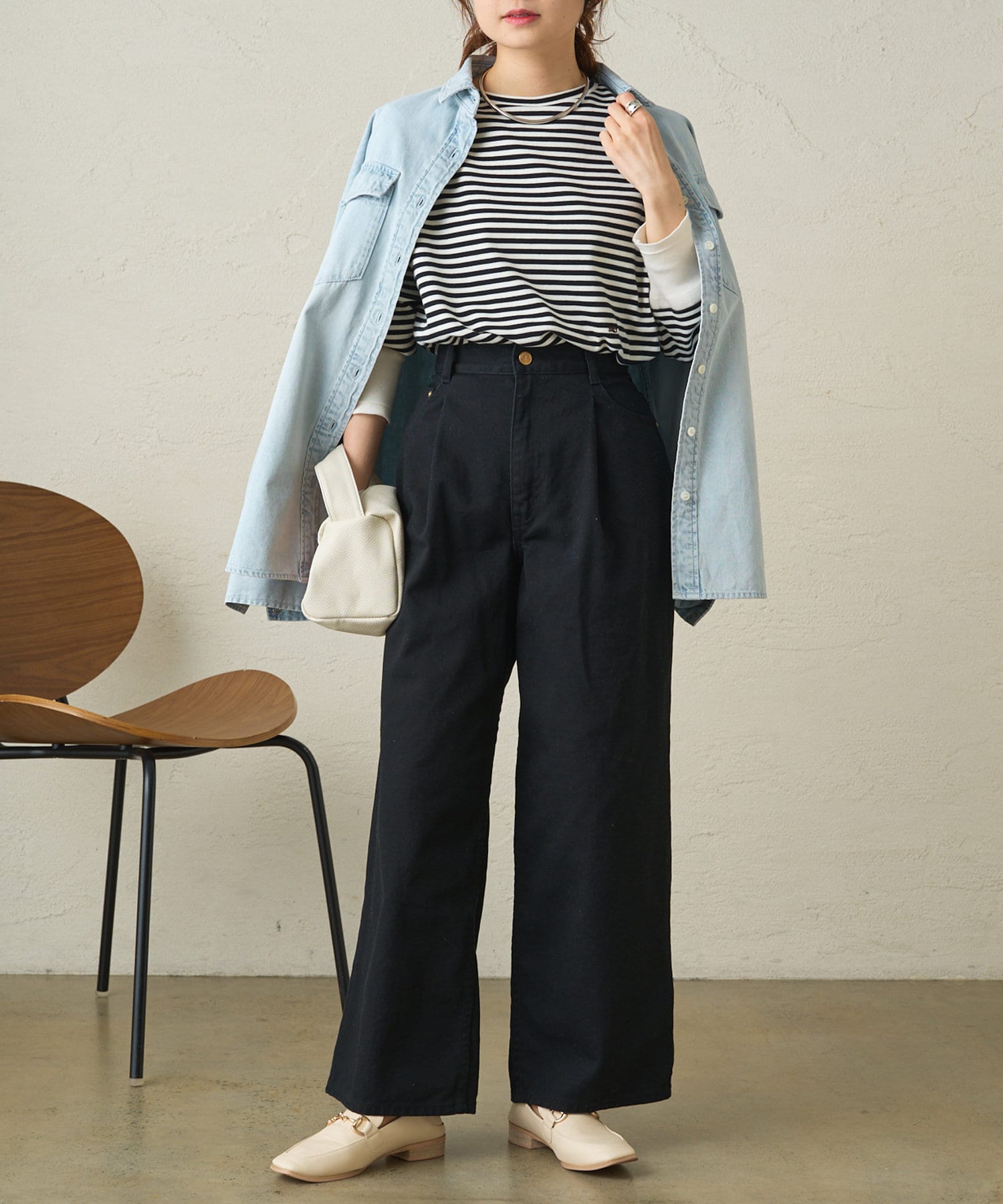 パンツスタイルならデニムパンツでカジュアルな着こなしから、スリットニットパンツではきれい目にも。