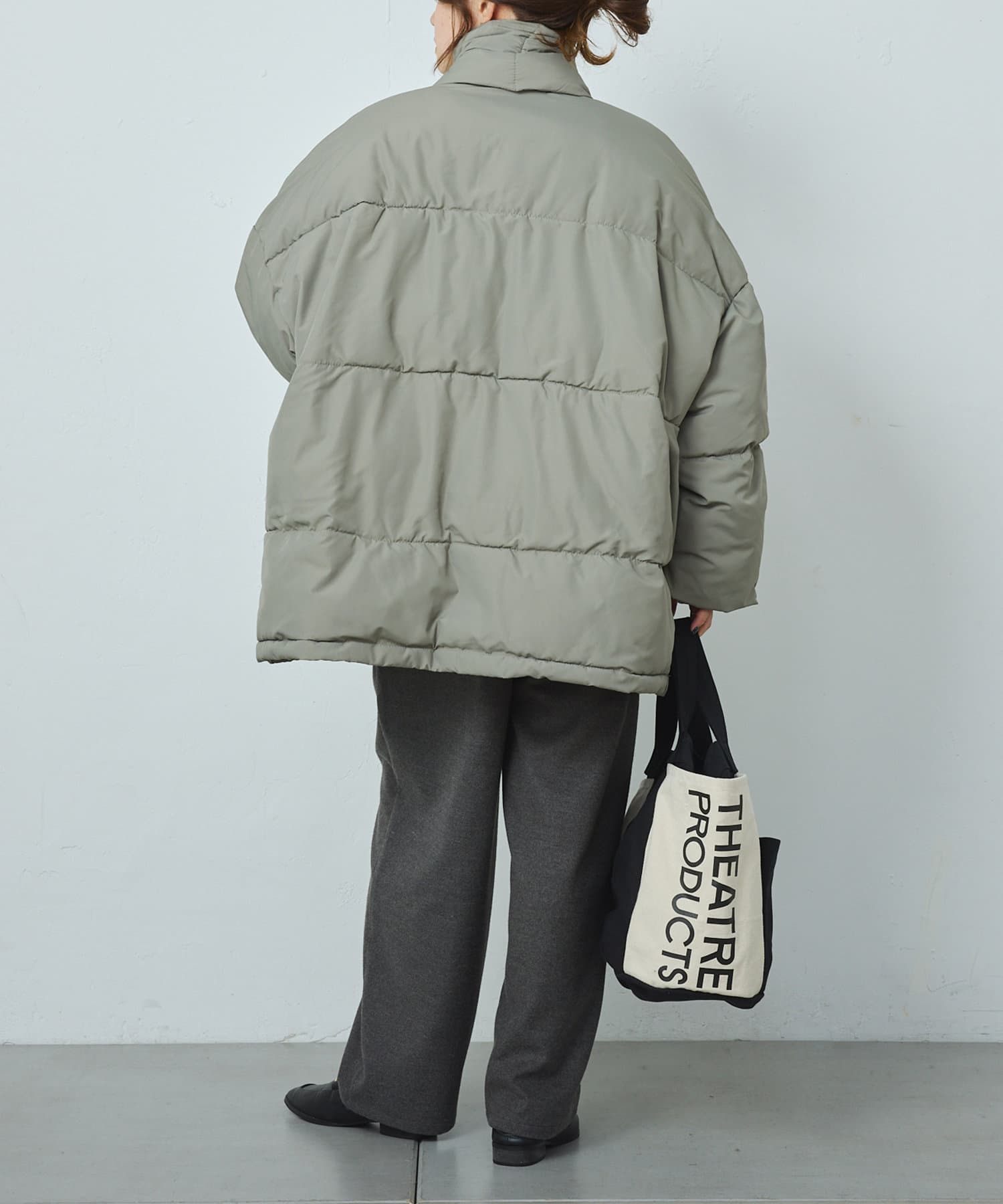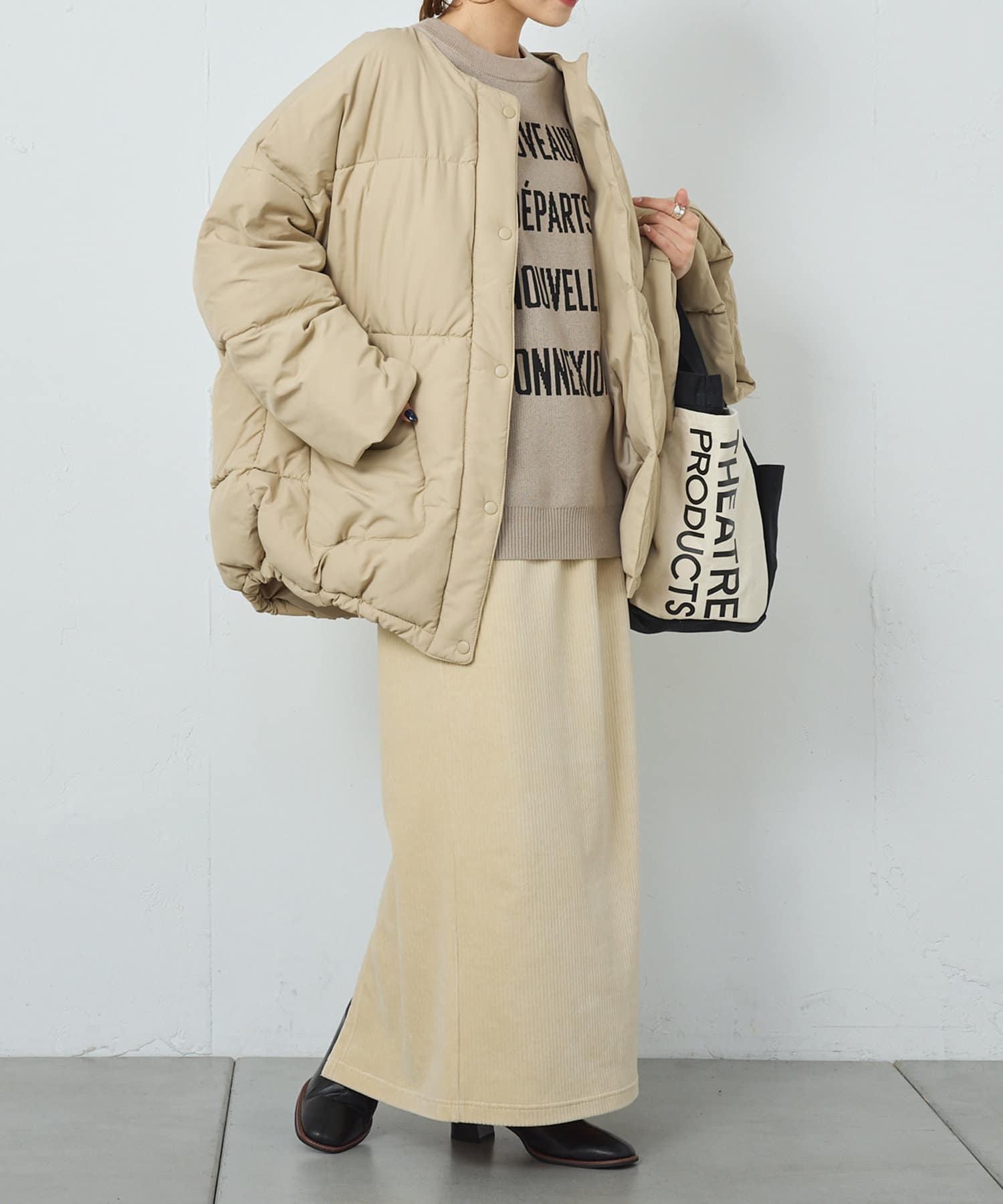 ダウンジャケットはヒップあたりまでカバーできるミドル丈。しっかりとボリューム感がありますが、見た目以上に軽く、軽やかな着心地です。