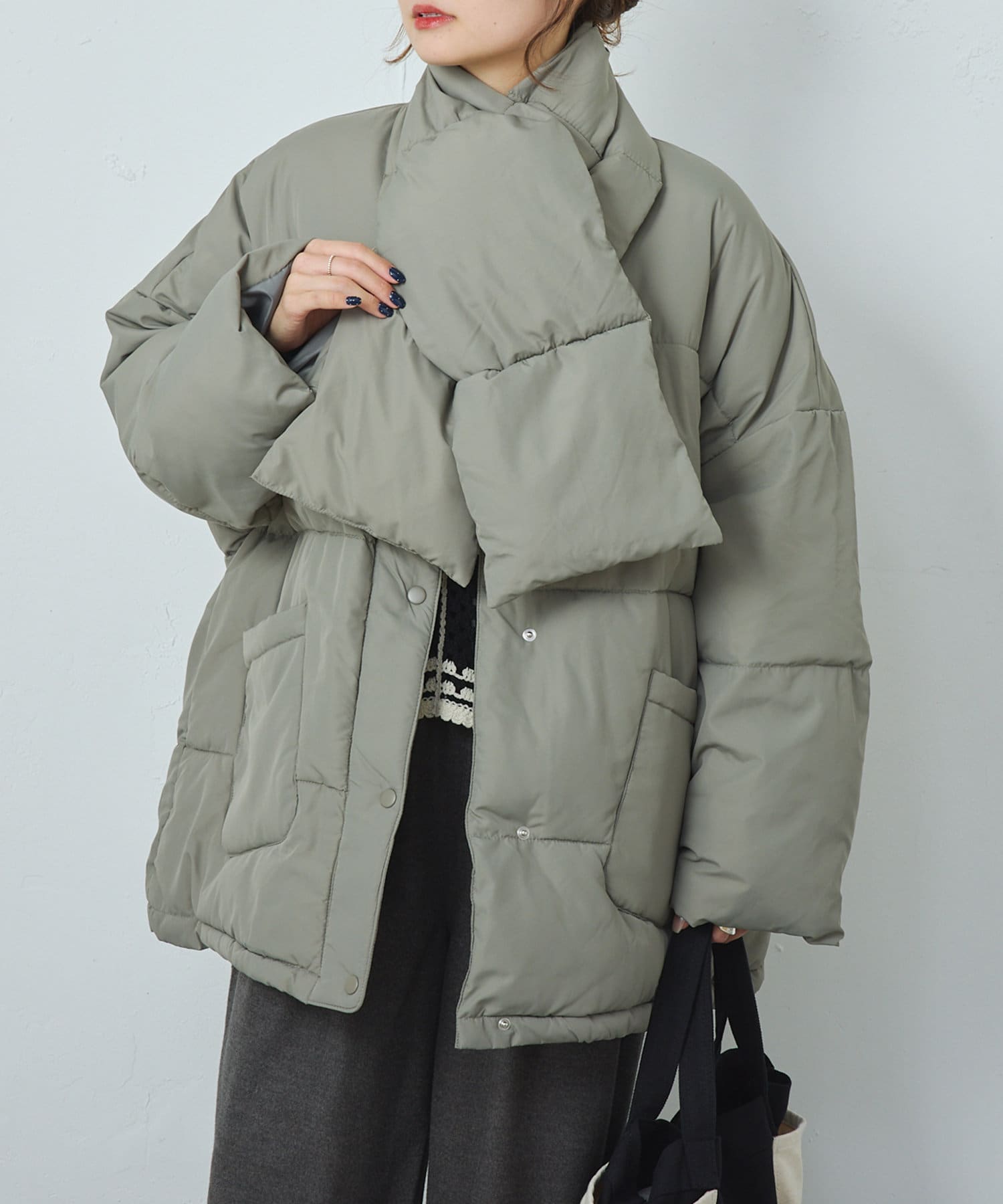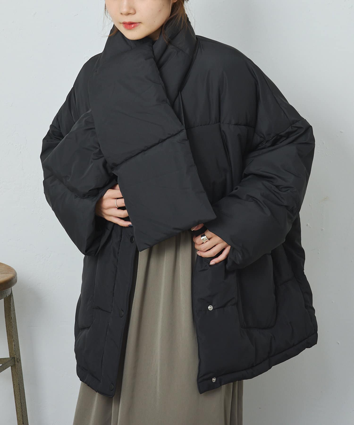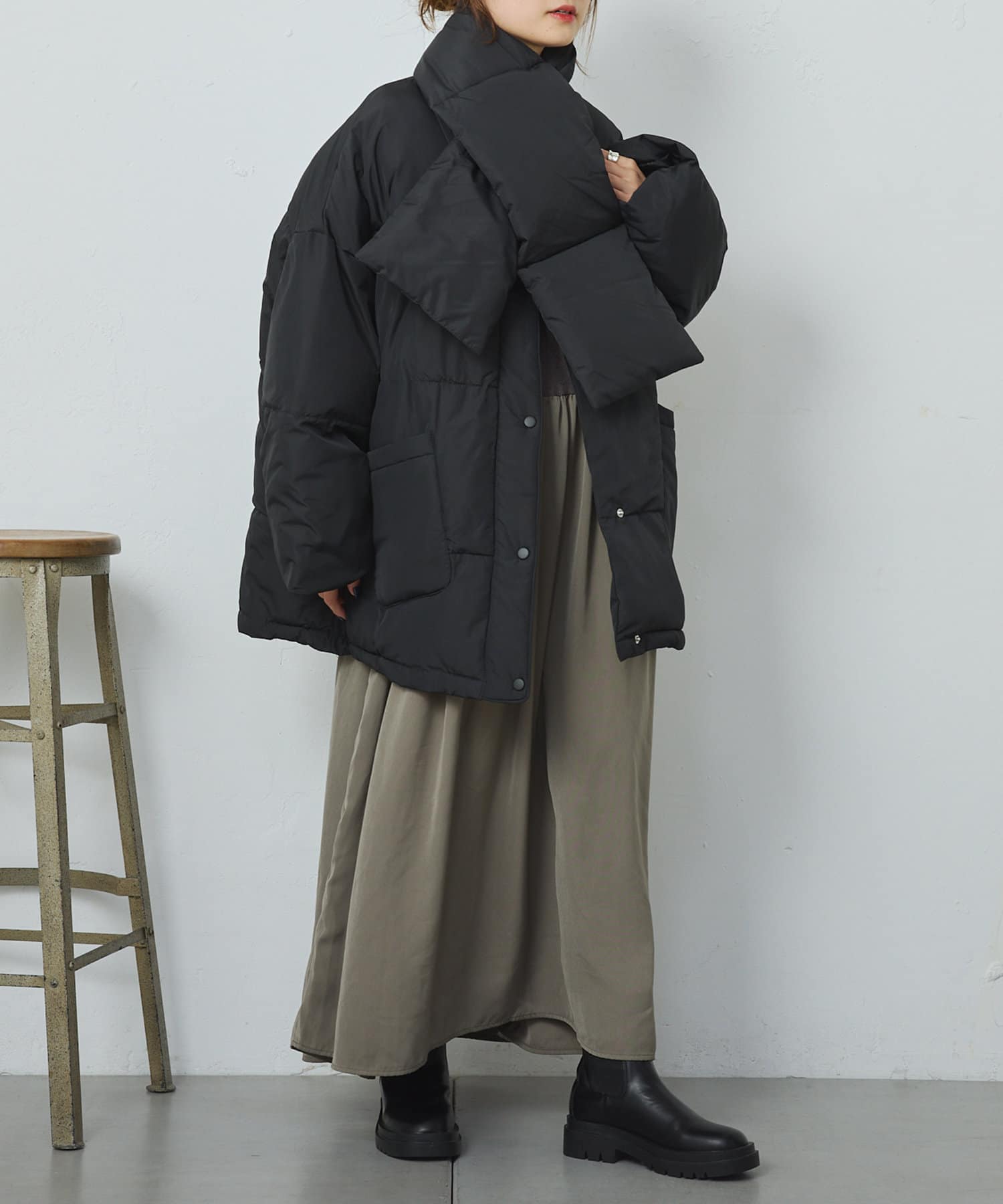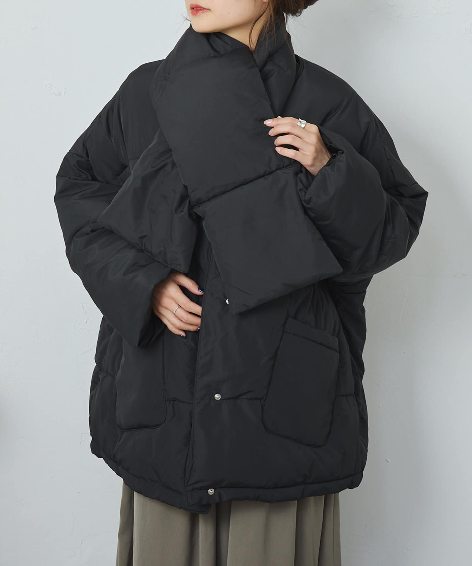 同じ素材のティペット付きであったか&トレンドライクに決まるフェイクダウン。