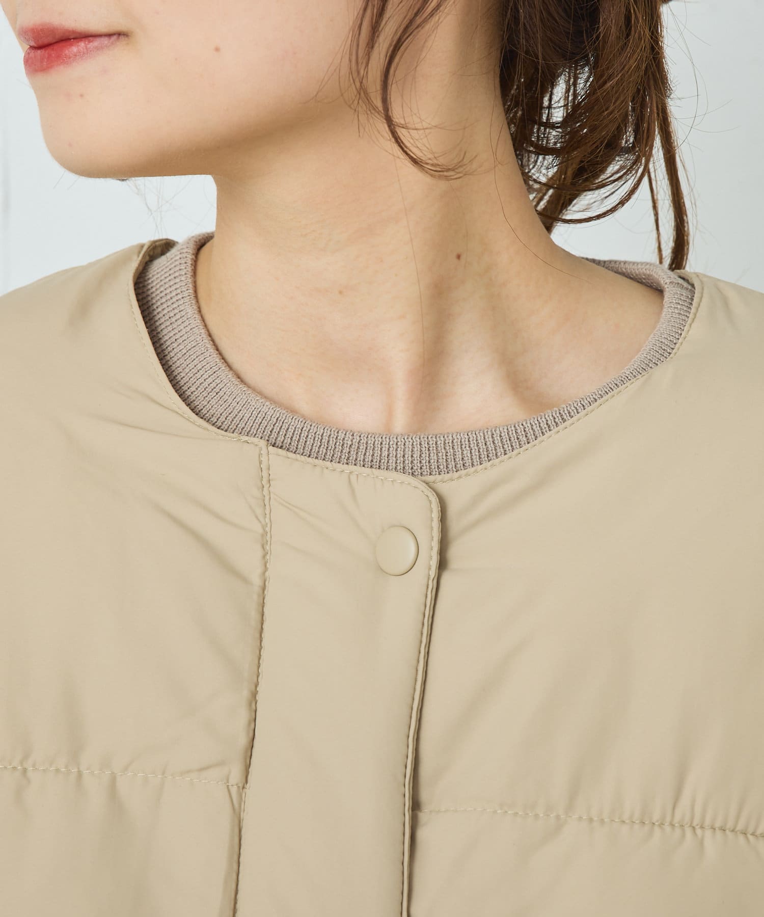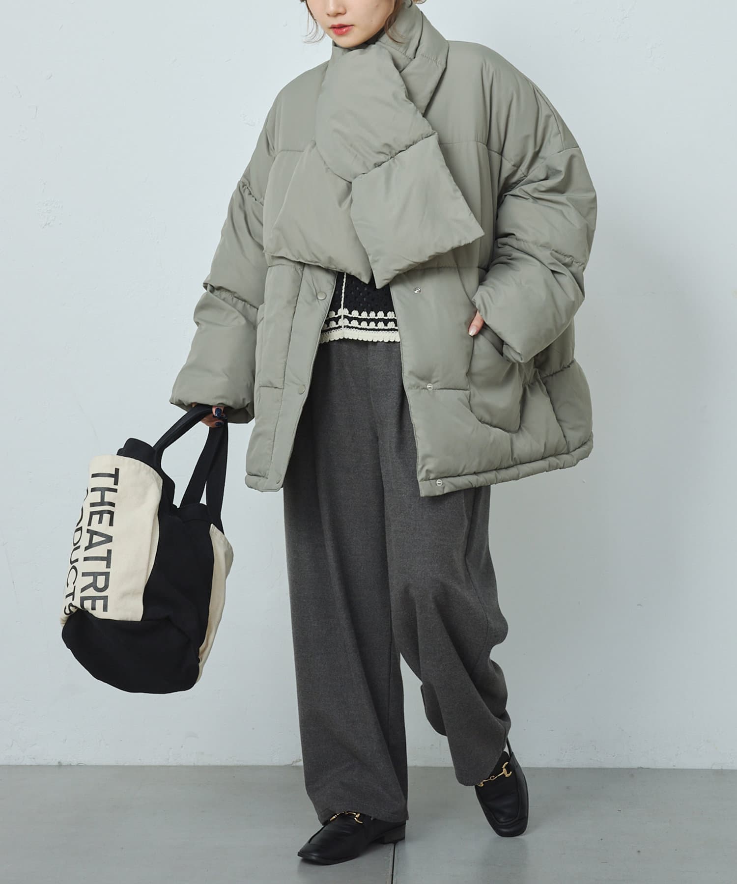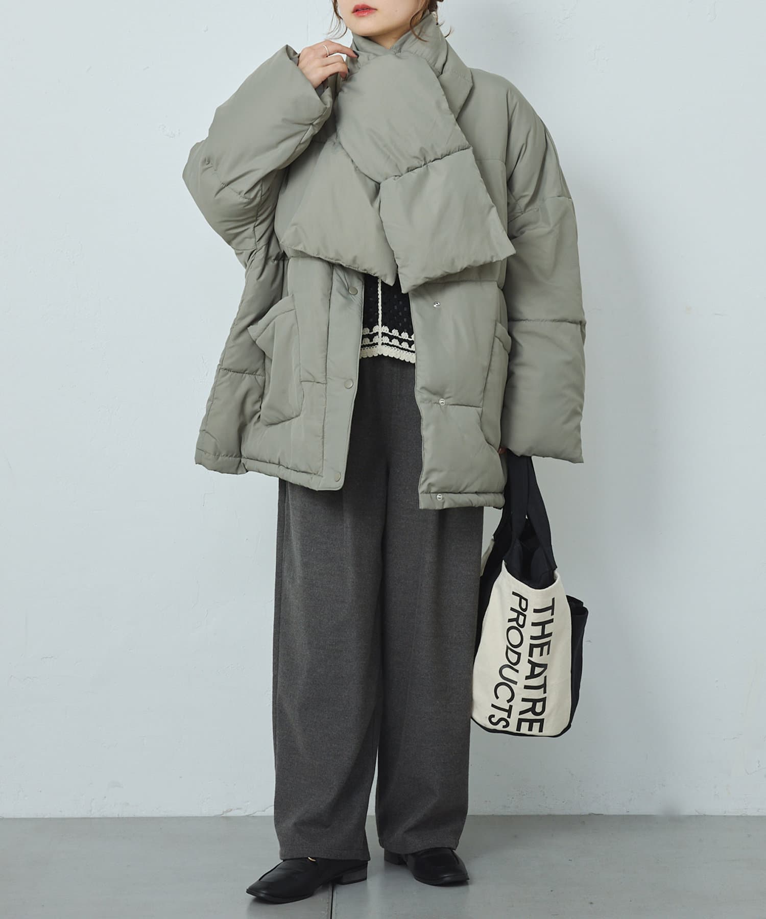 同じ素材のティペット付きであったか&トレンドライクに決まるフェイクダウン。