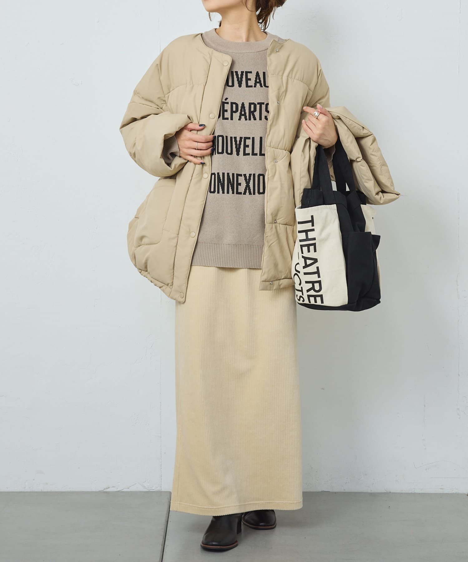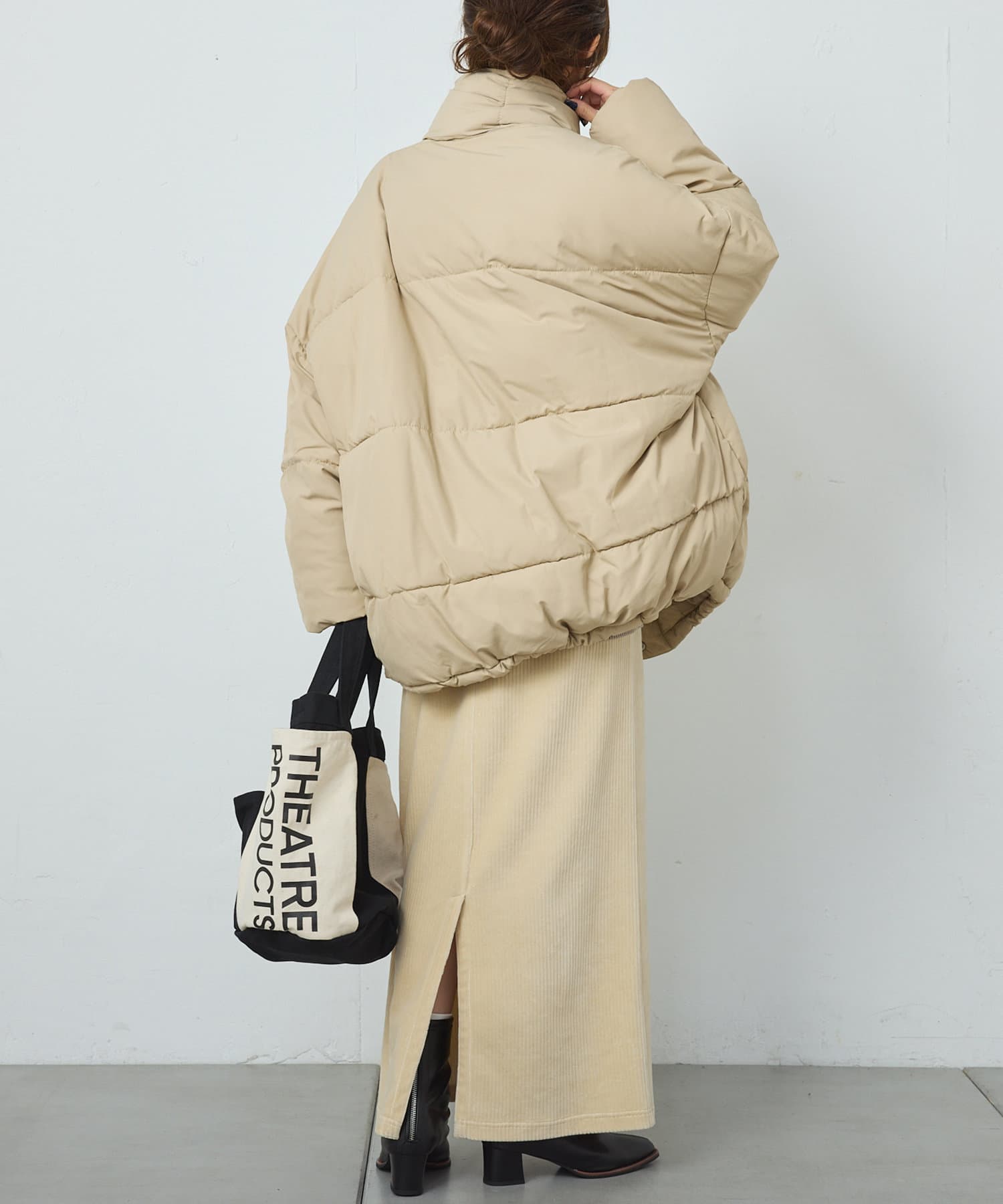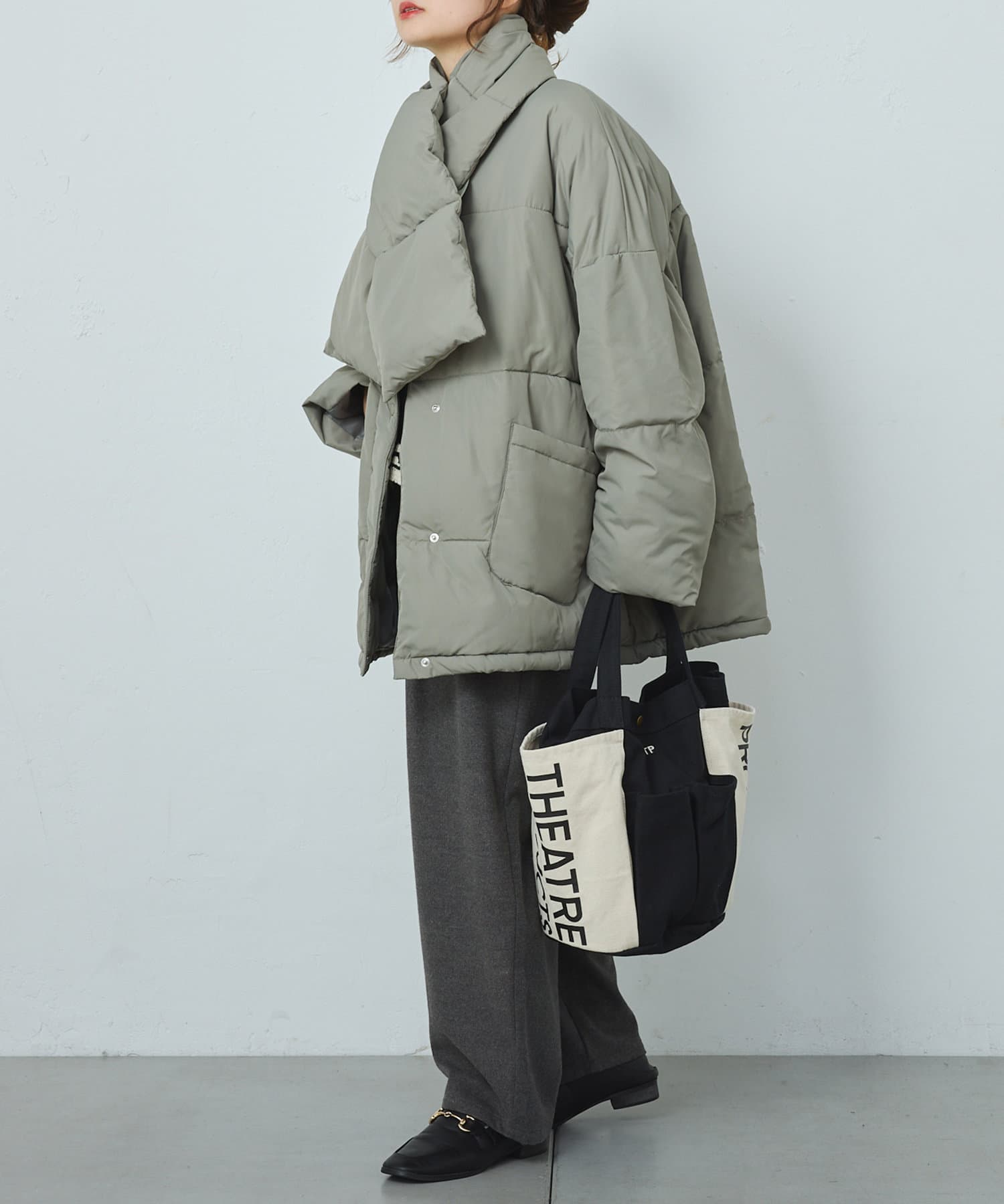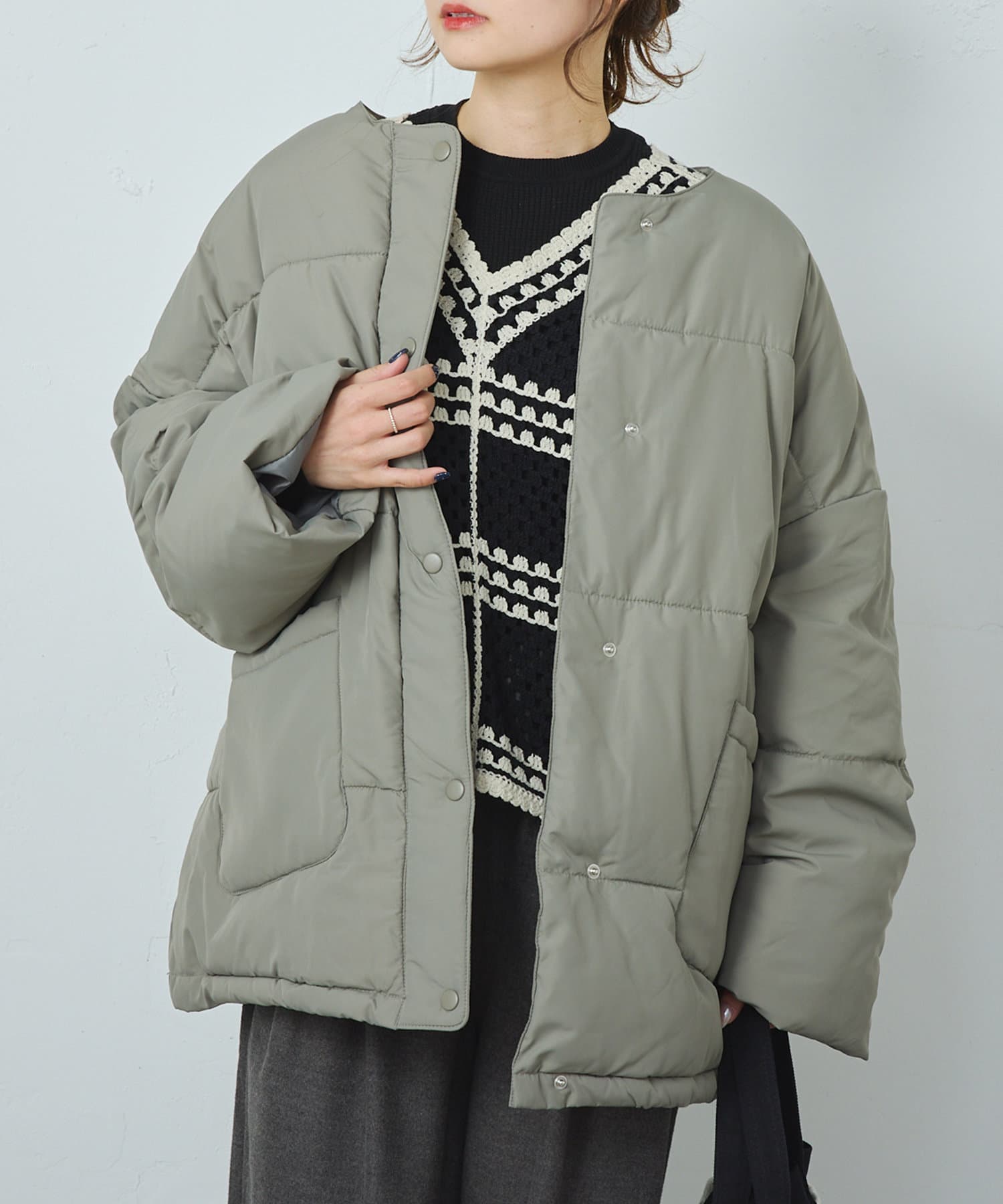 同じ素材のティペット付きであったか&トレンドライクに決まるフェイクダウン。