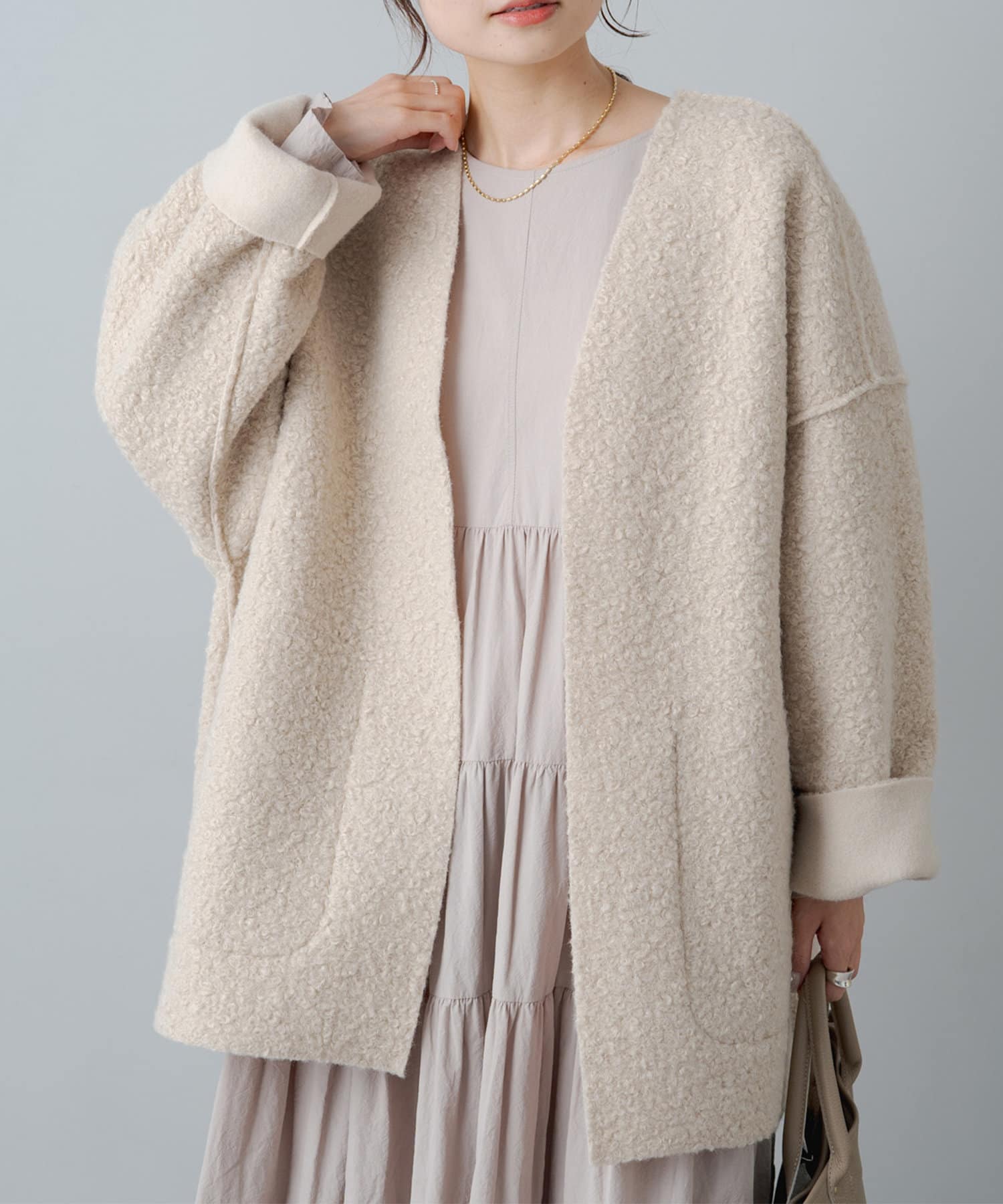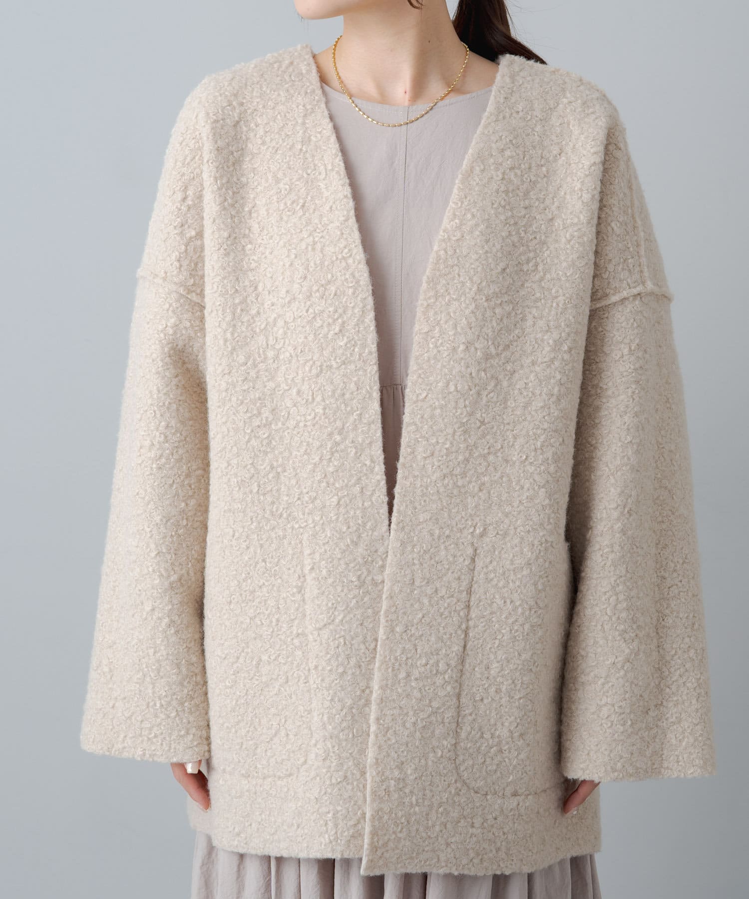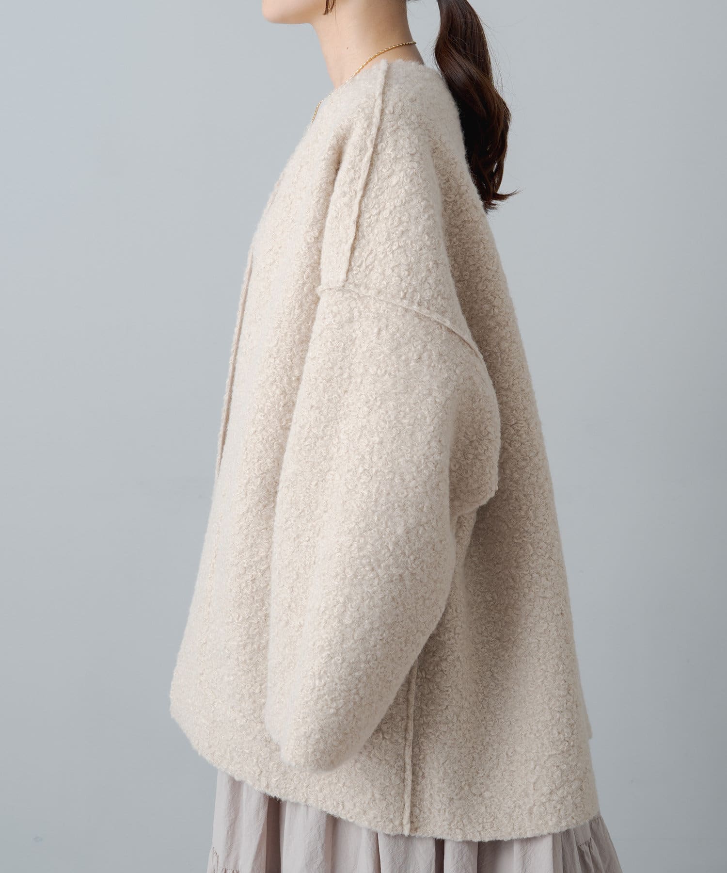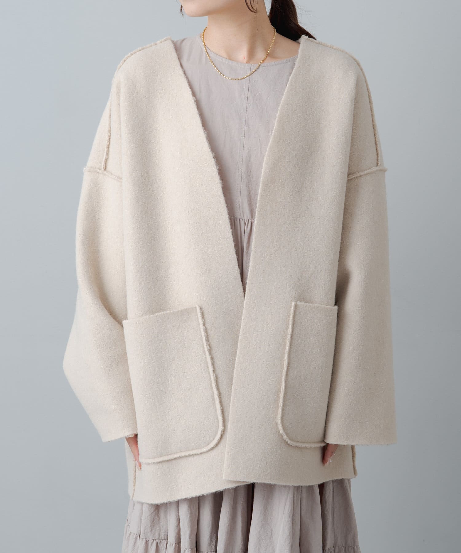 ボタンやジップ無しでさっと羽織れるトッパータイプで軽い着心地。