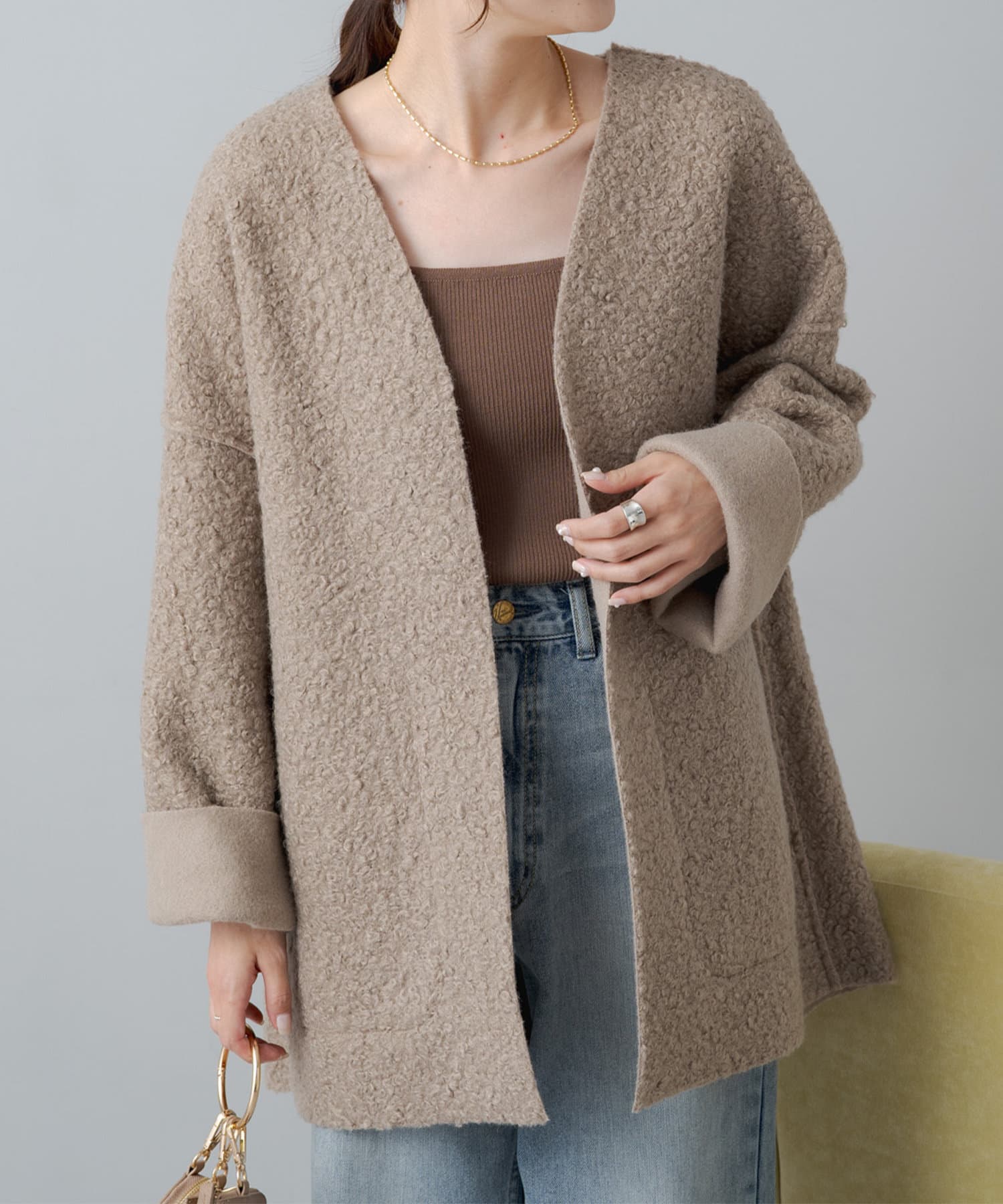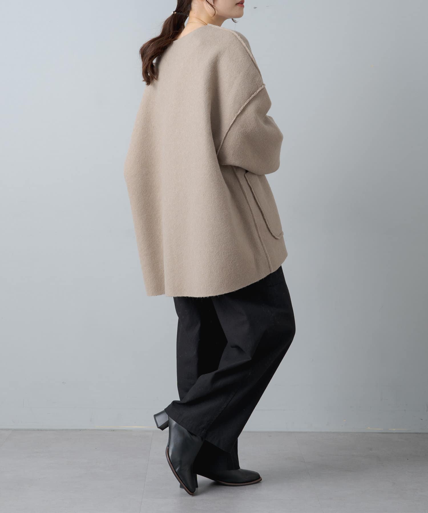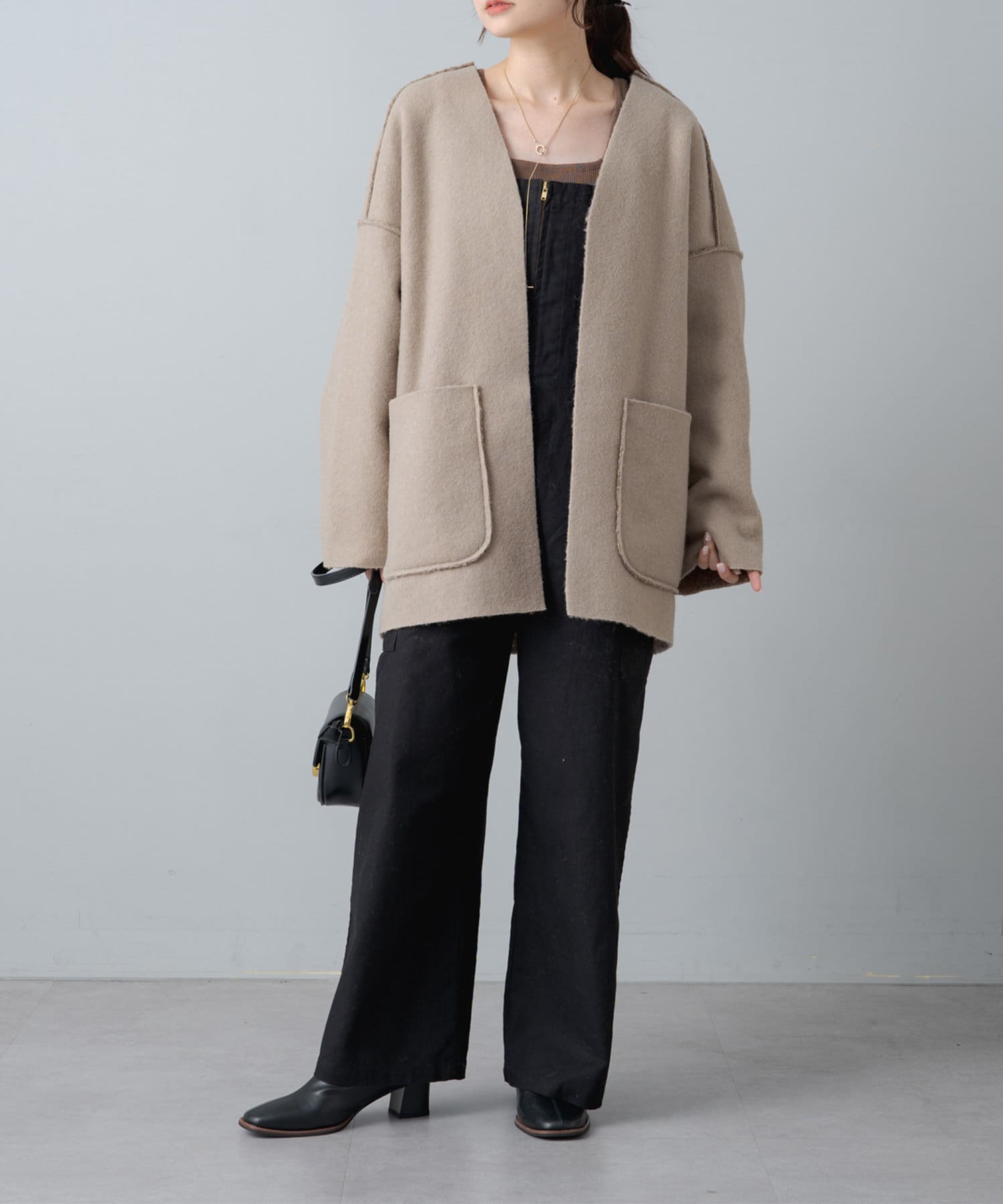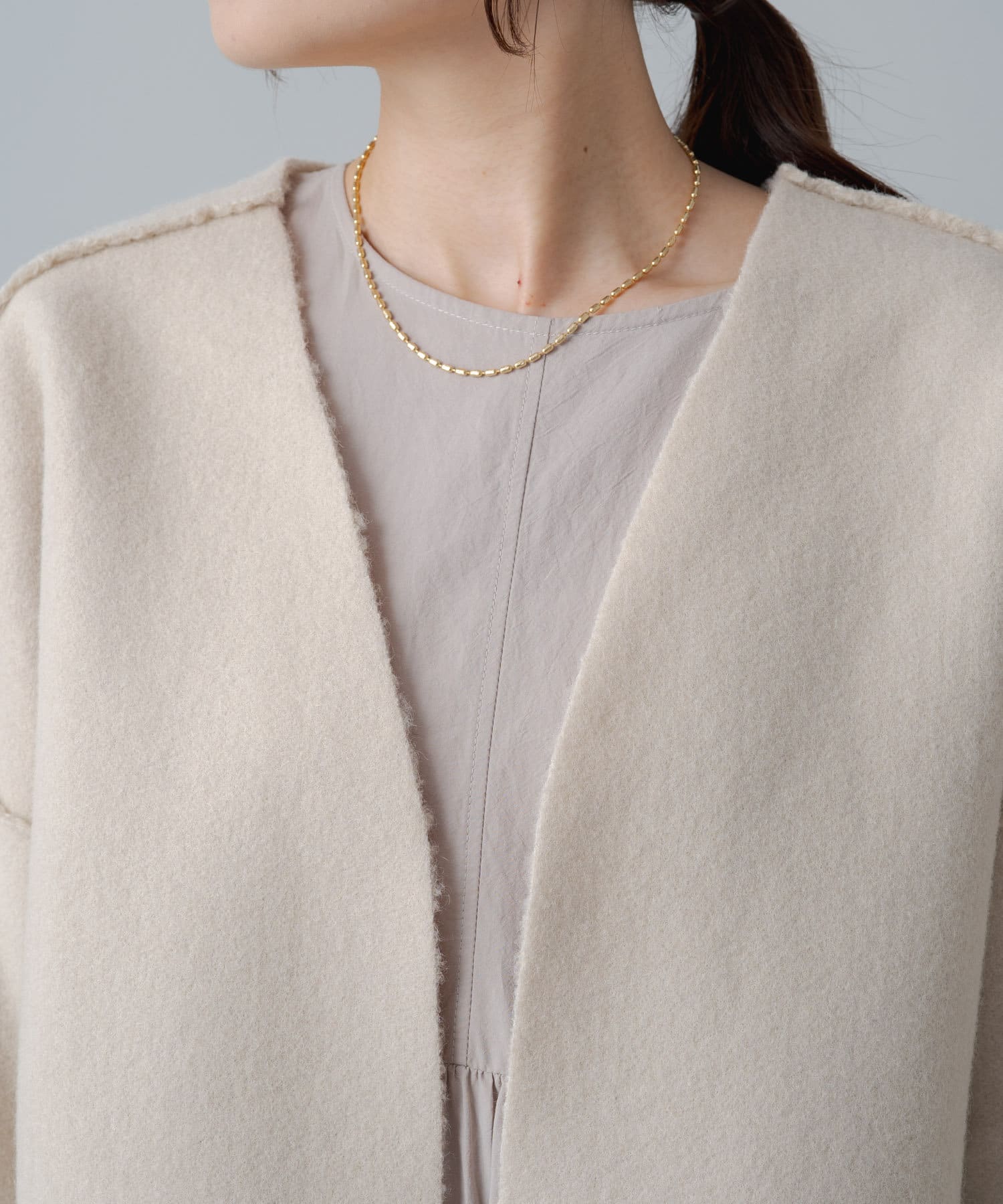 シンプルなノーカラーデザインなので、タートルネックニットやマフラーとの相性も抜群です。