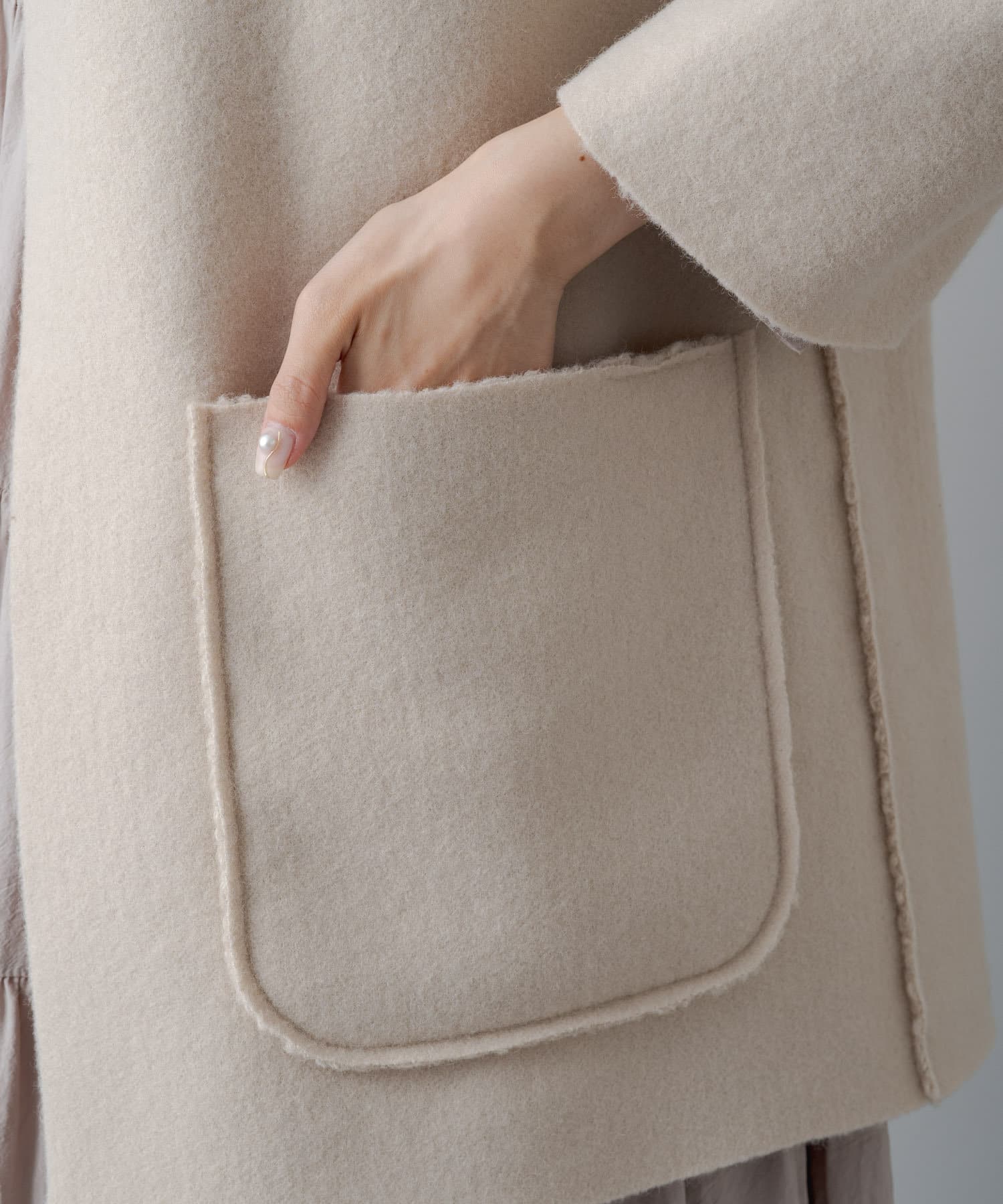くるんとカールした表情豊かなフェイクリングウールと、大きなパッチポケットが印象的なシンプルなデザインの両面をお楽しみ頂けます。