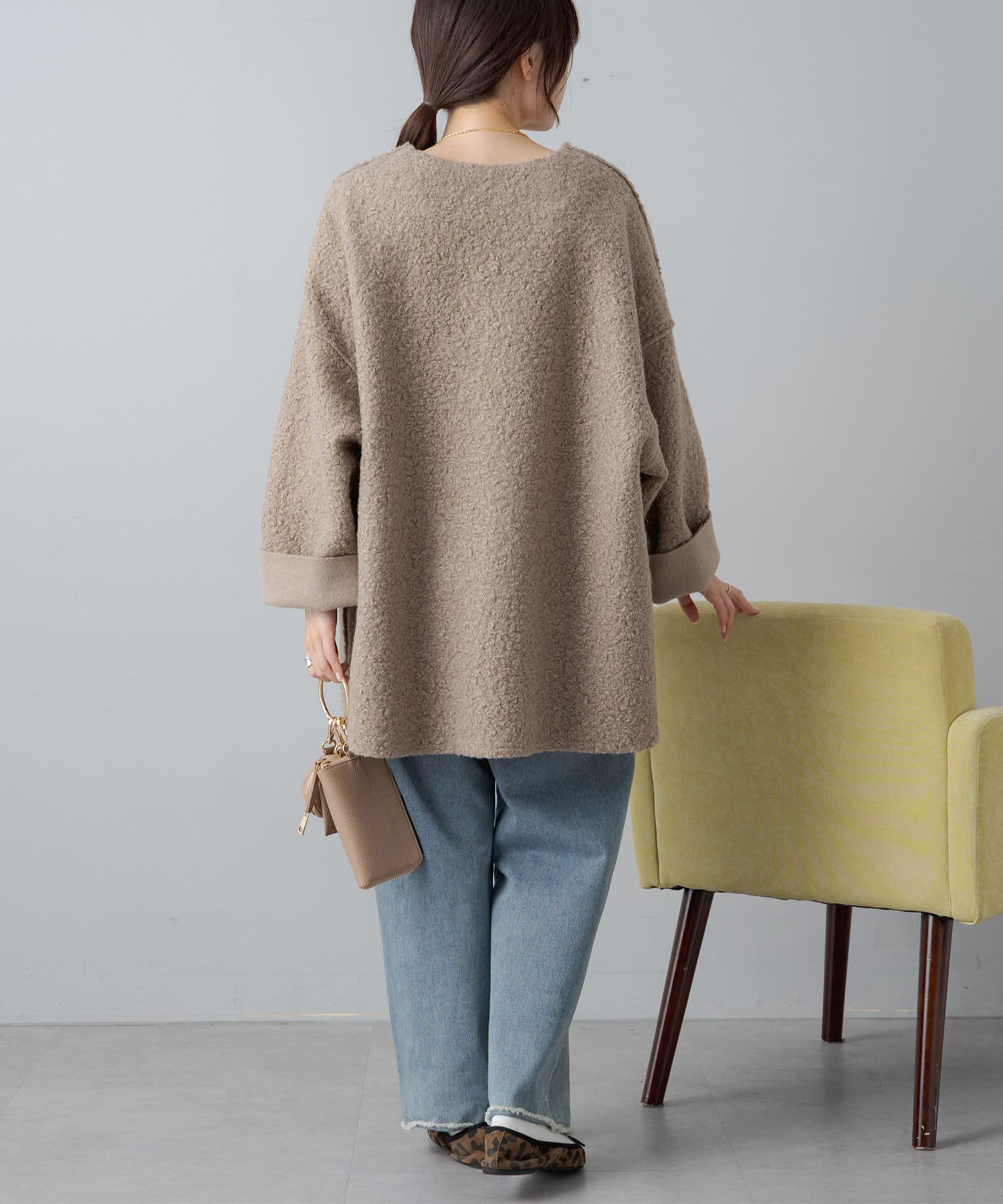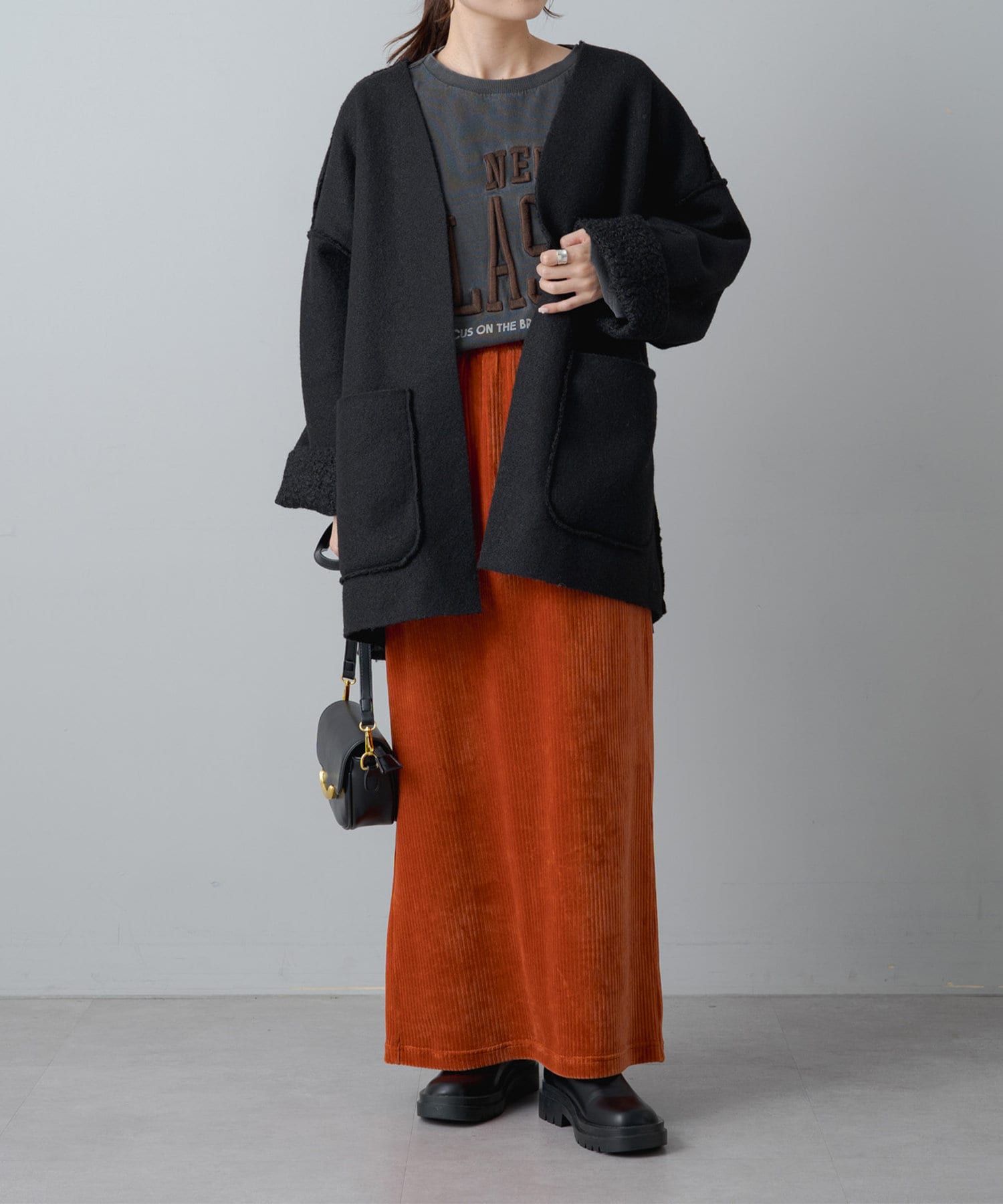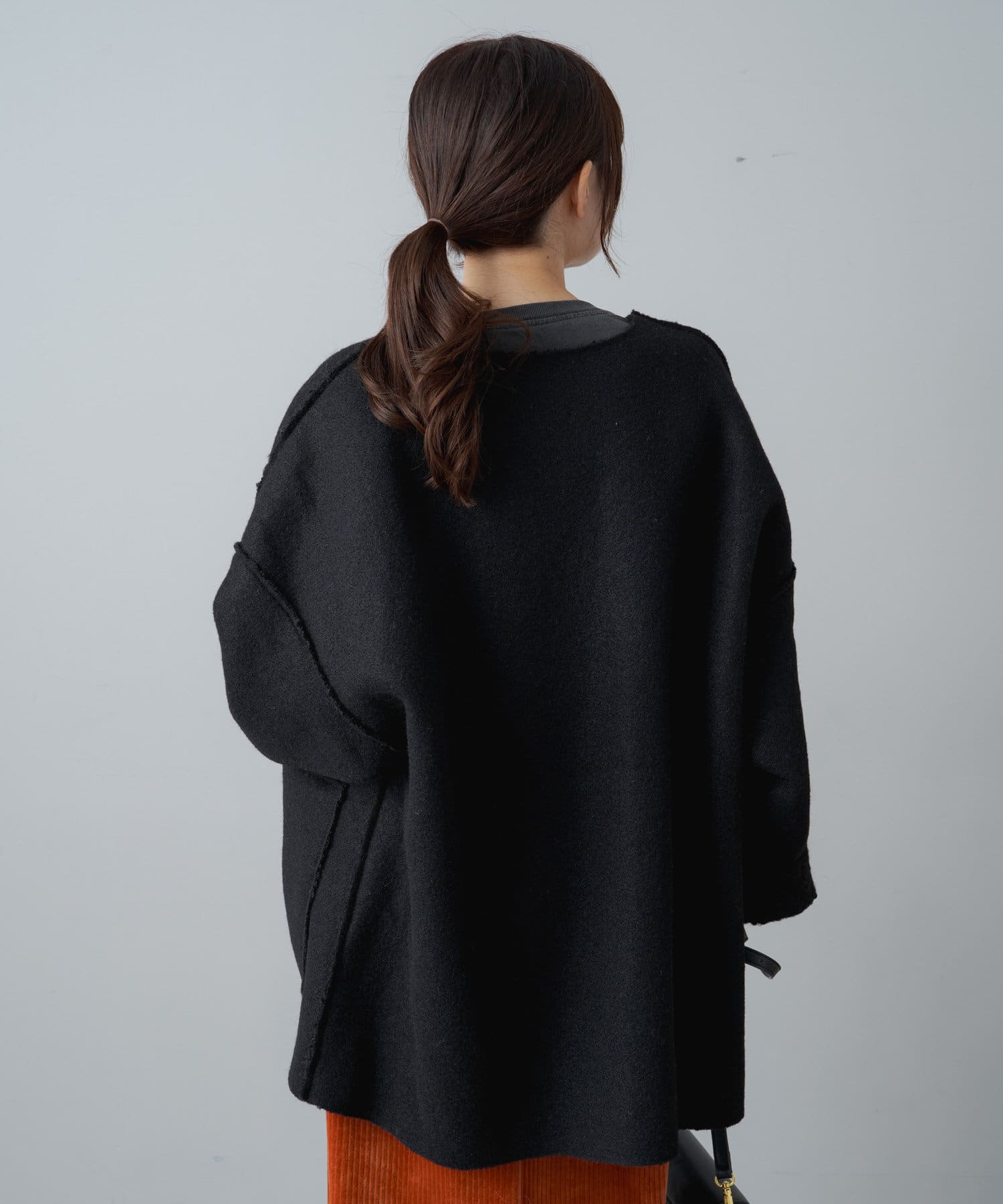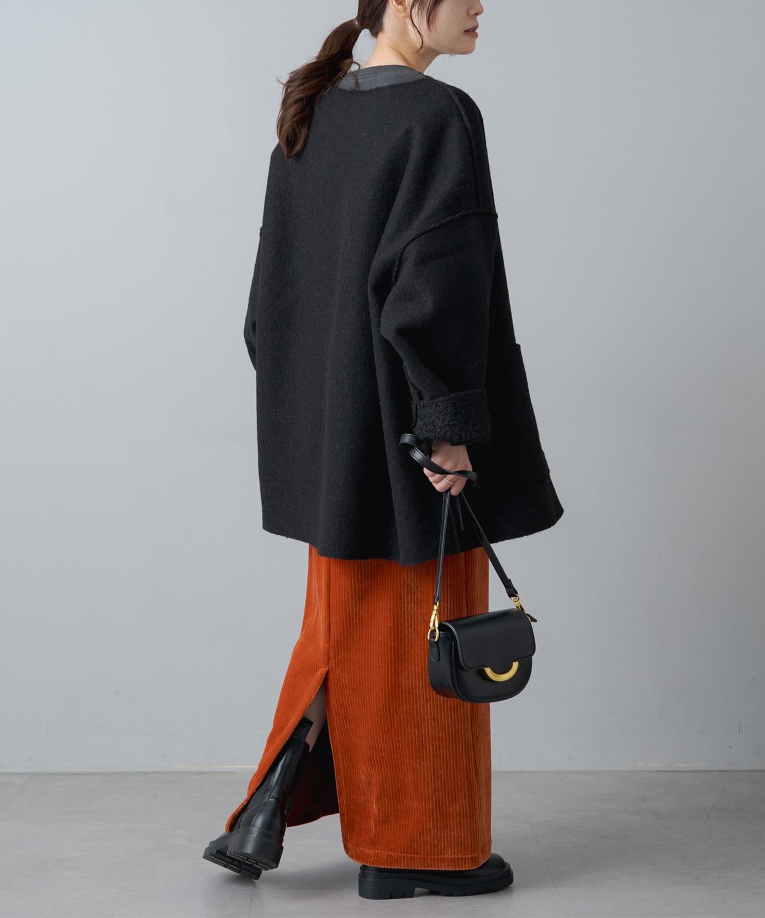 サイズ感:お尻まで隠れるミドル丈。オーバーサイズなので厚手のスウェットやニットも着込めそうです。