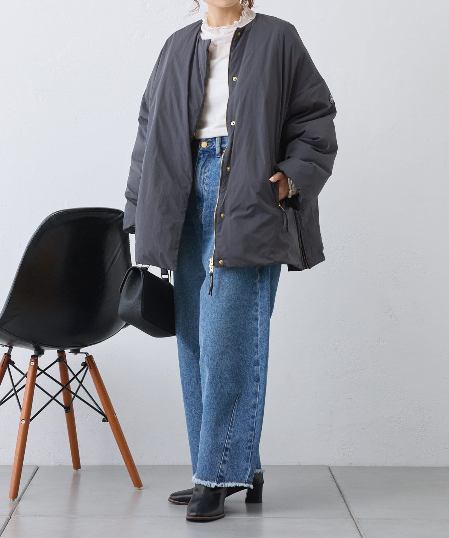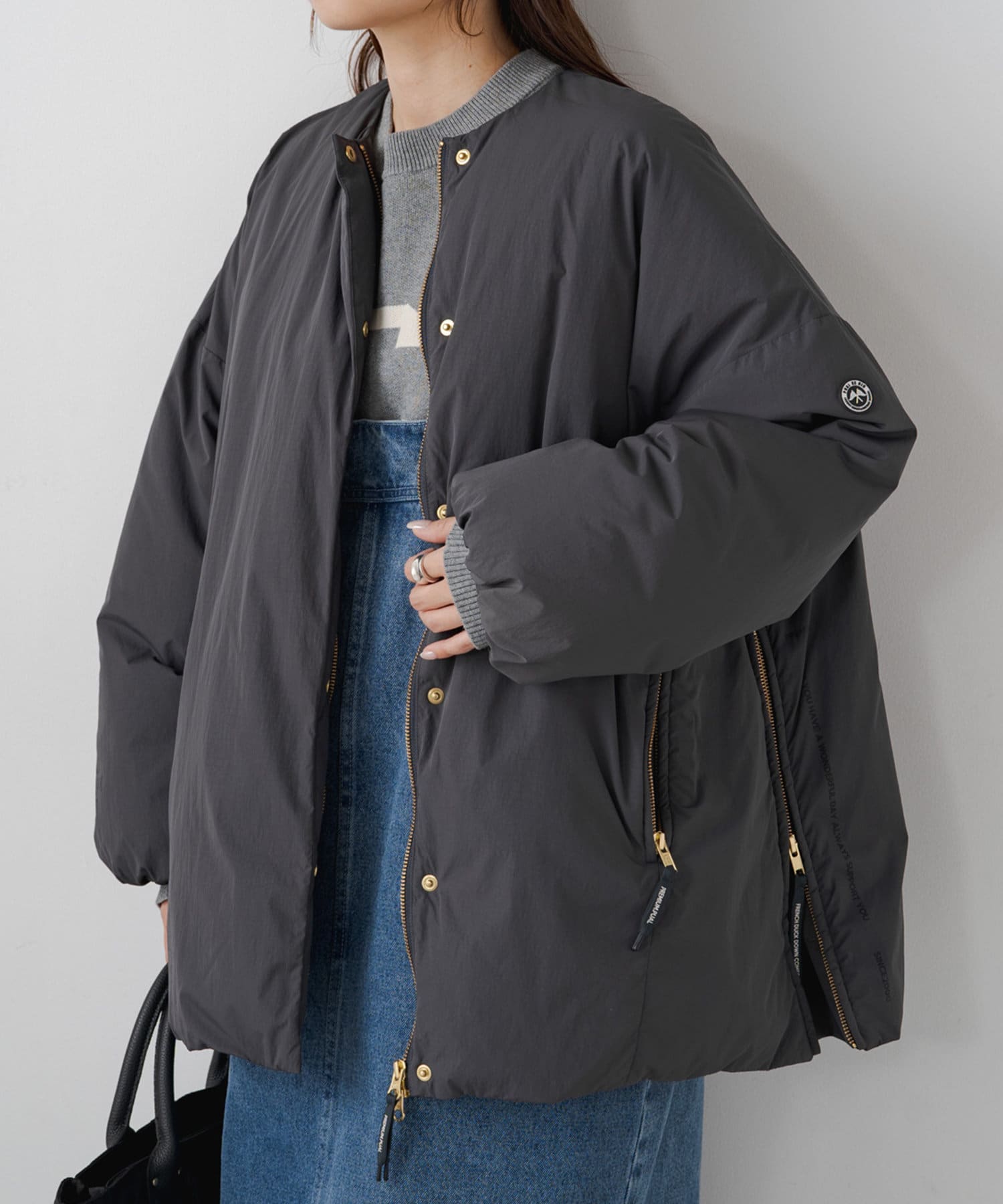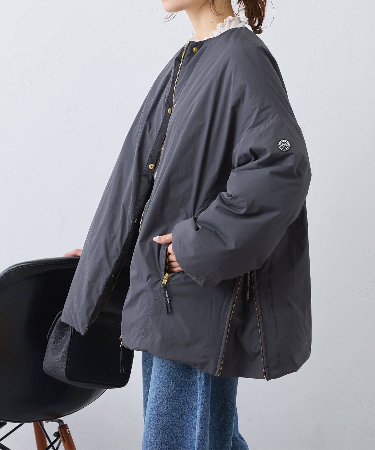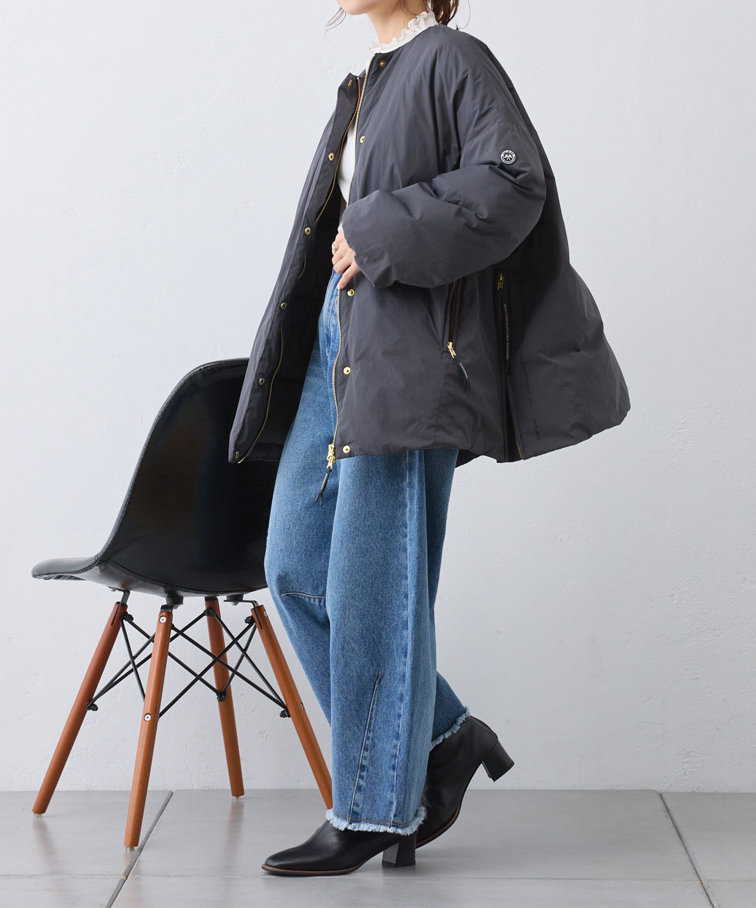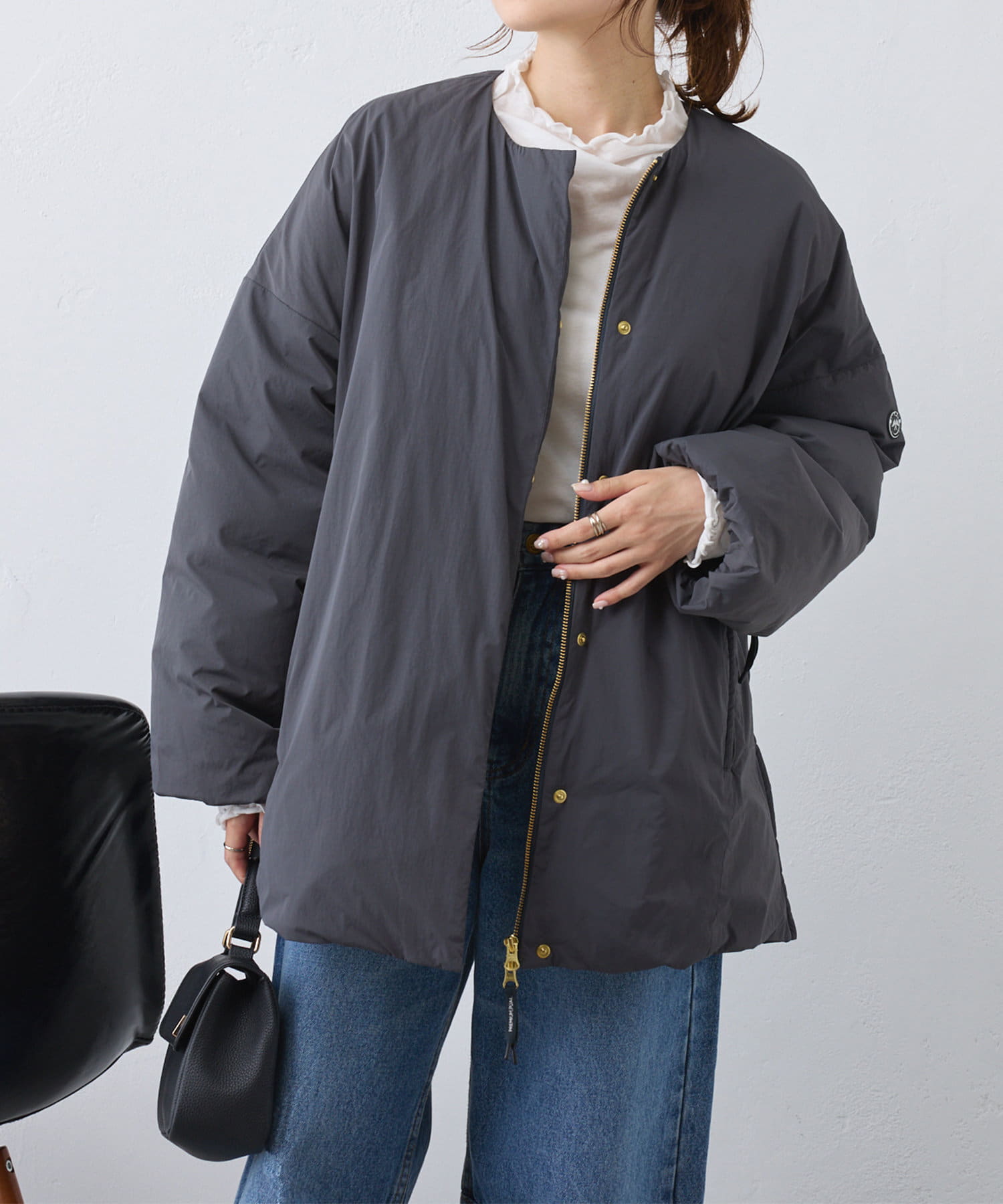 ◇遊び心溢れるディテールにこだわったノーカラーダウンジャケット◇
