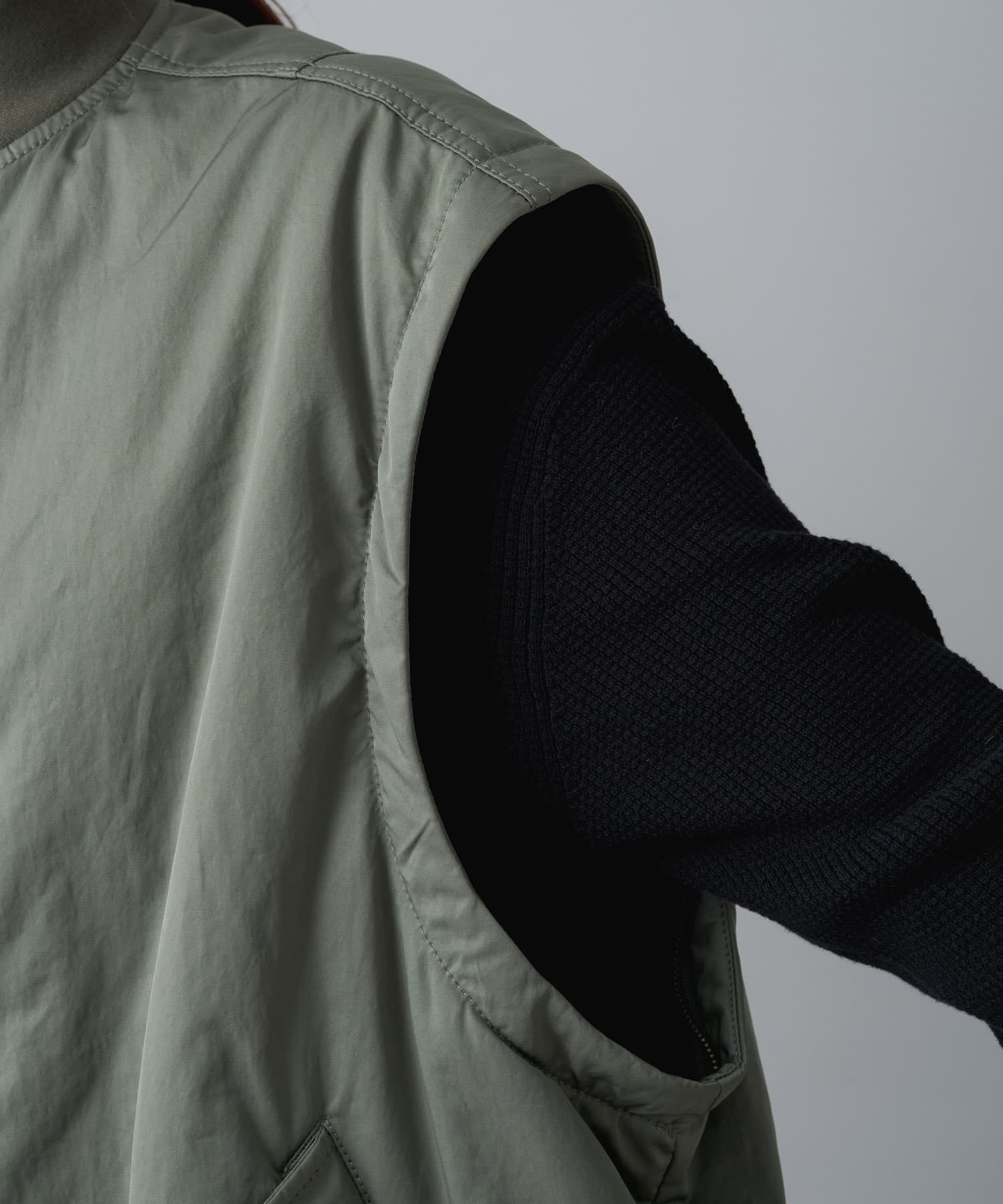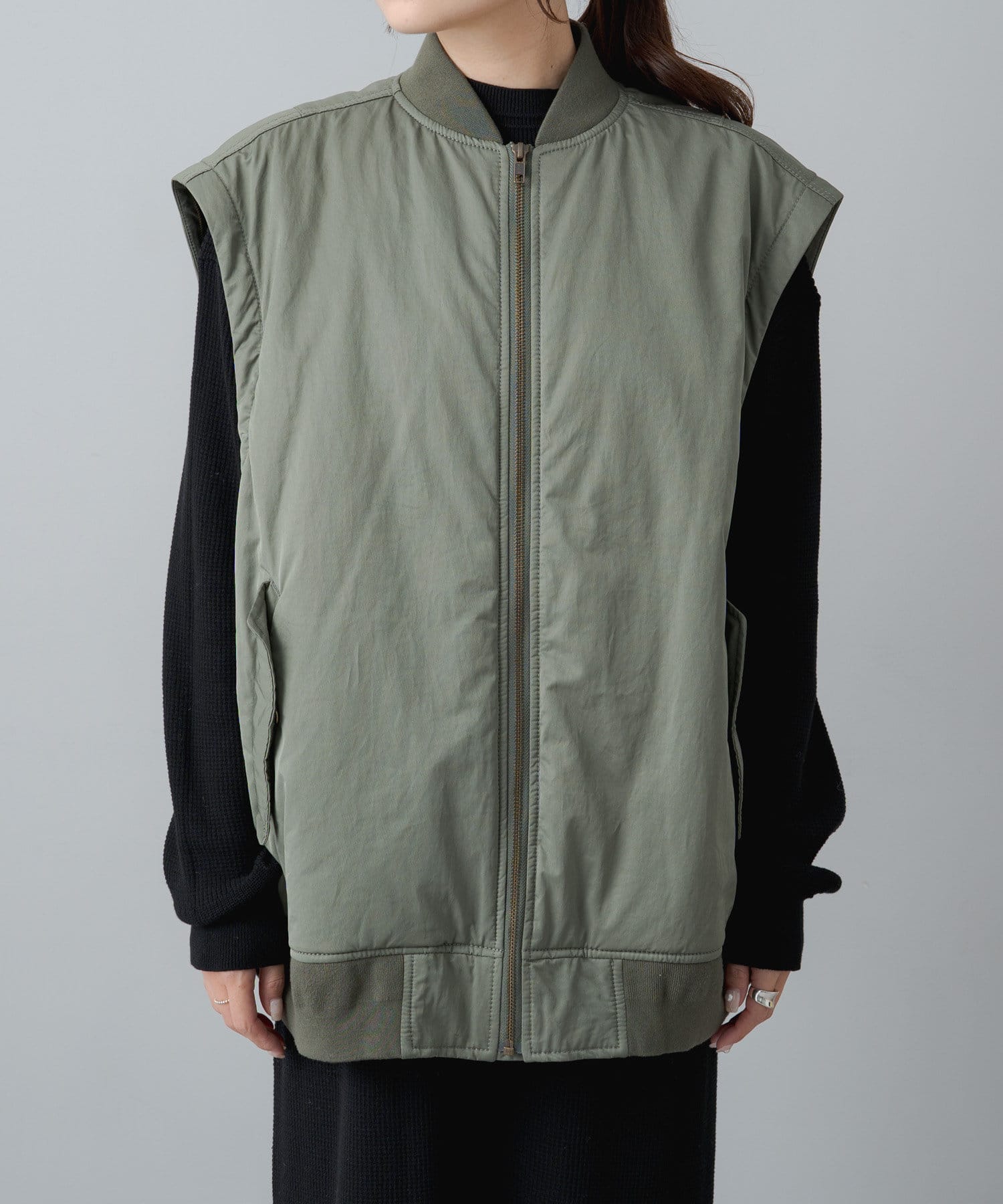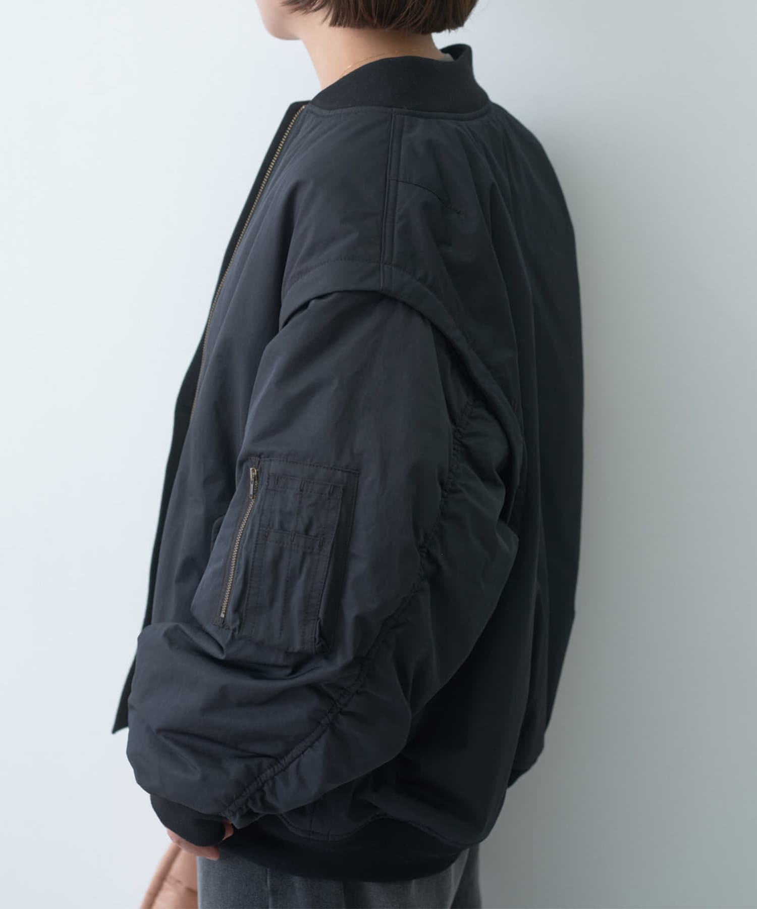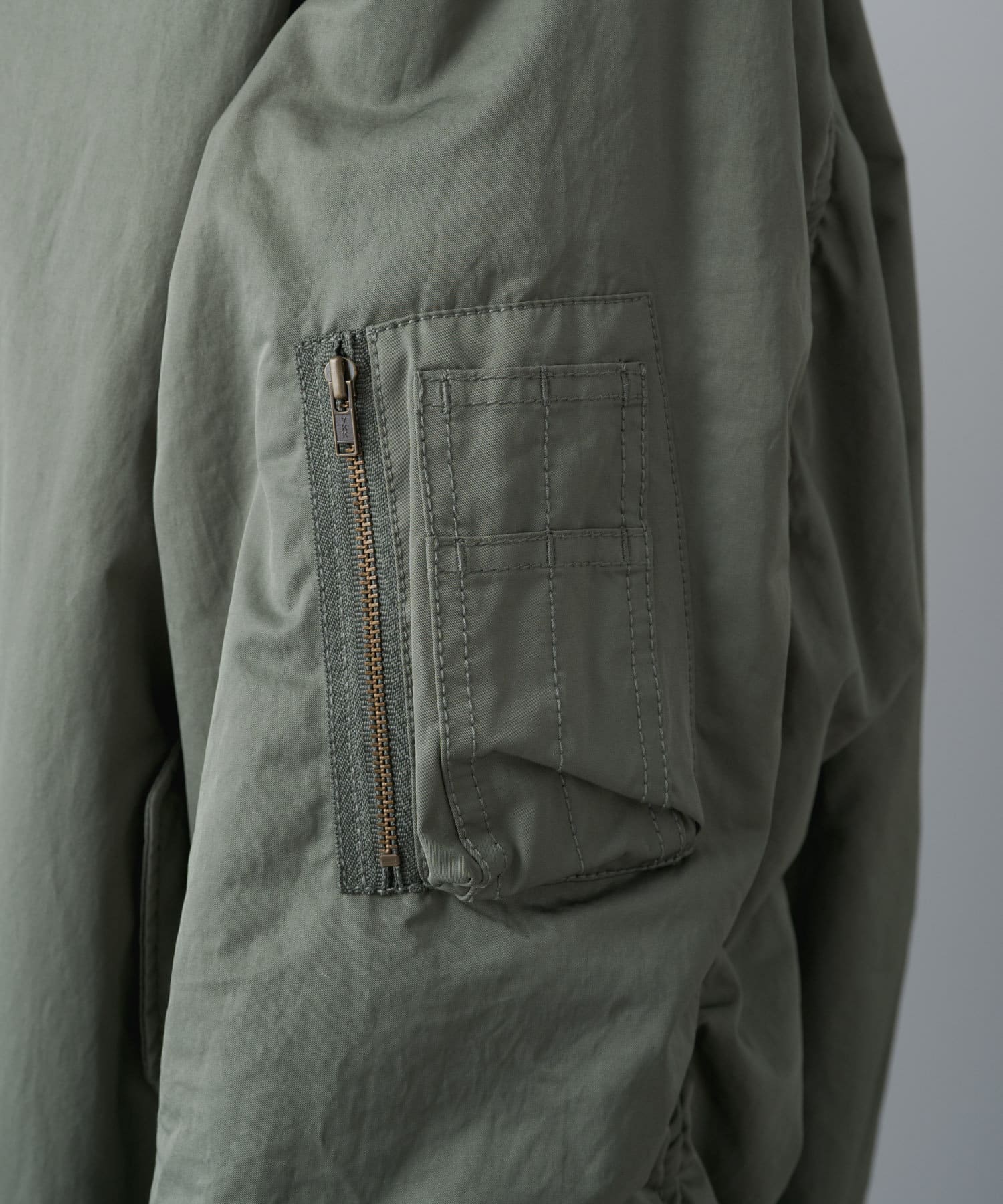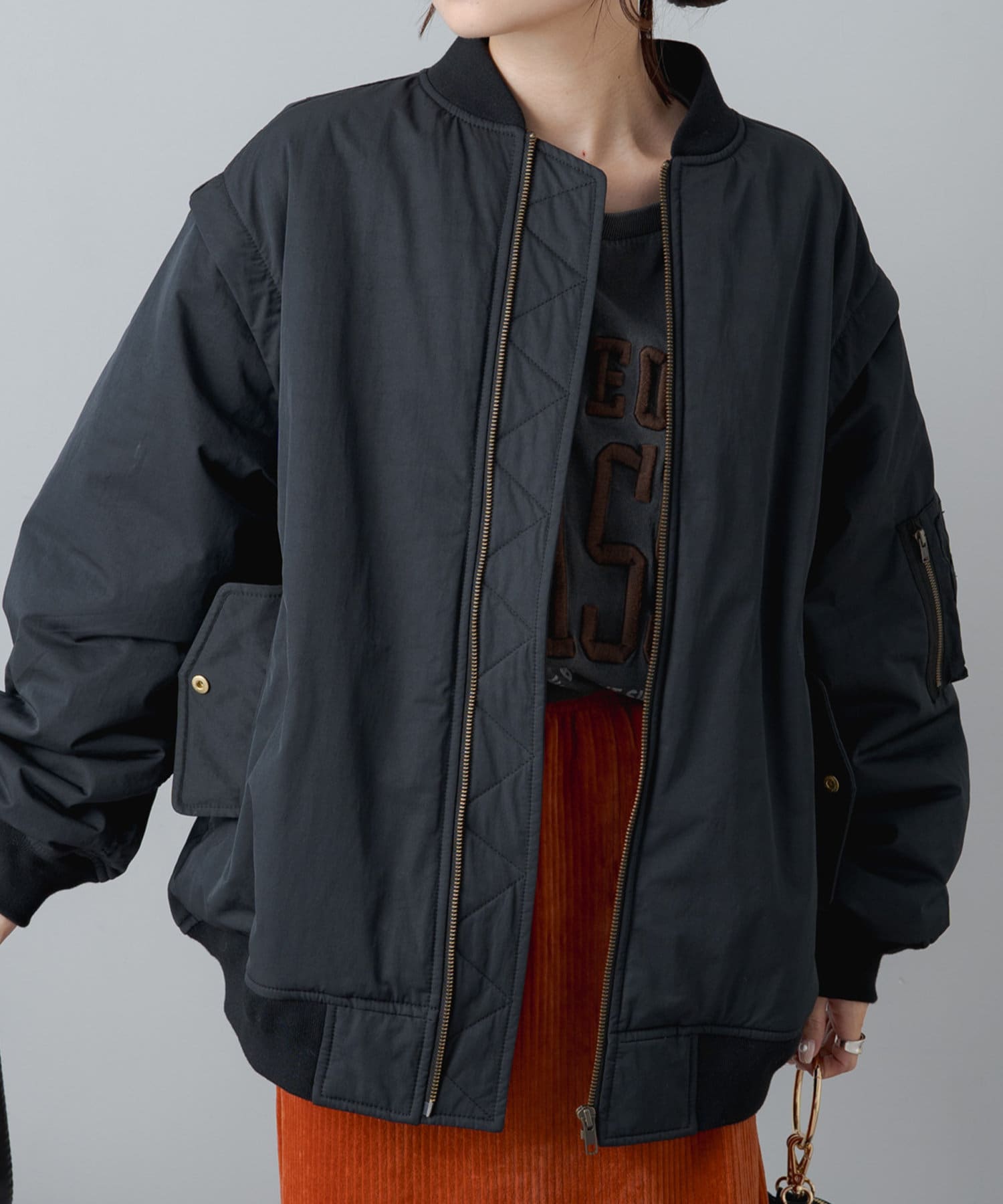 袖と肩のつなぎ目にファスナーを施しベストとしても楽しめる2WAY仕様に仕上げたMA-1ブルゾン。